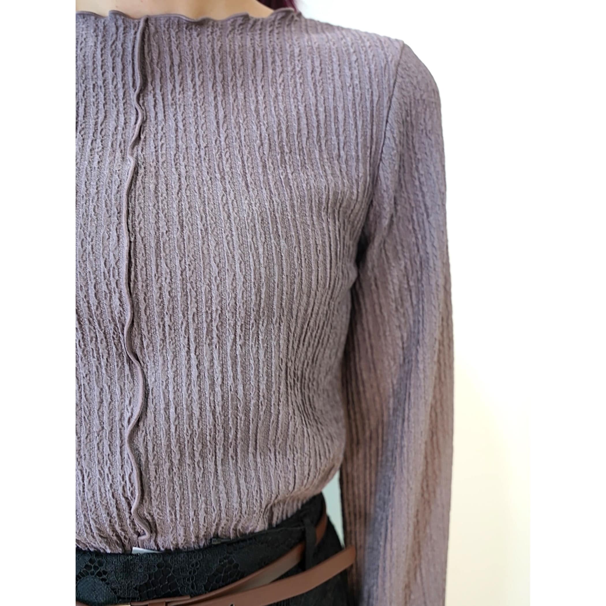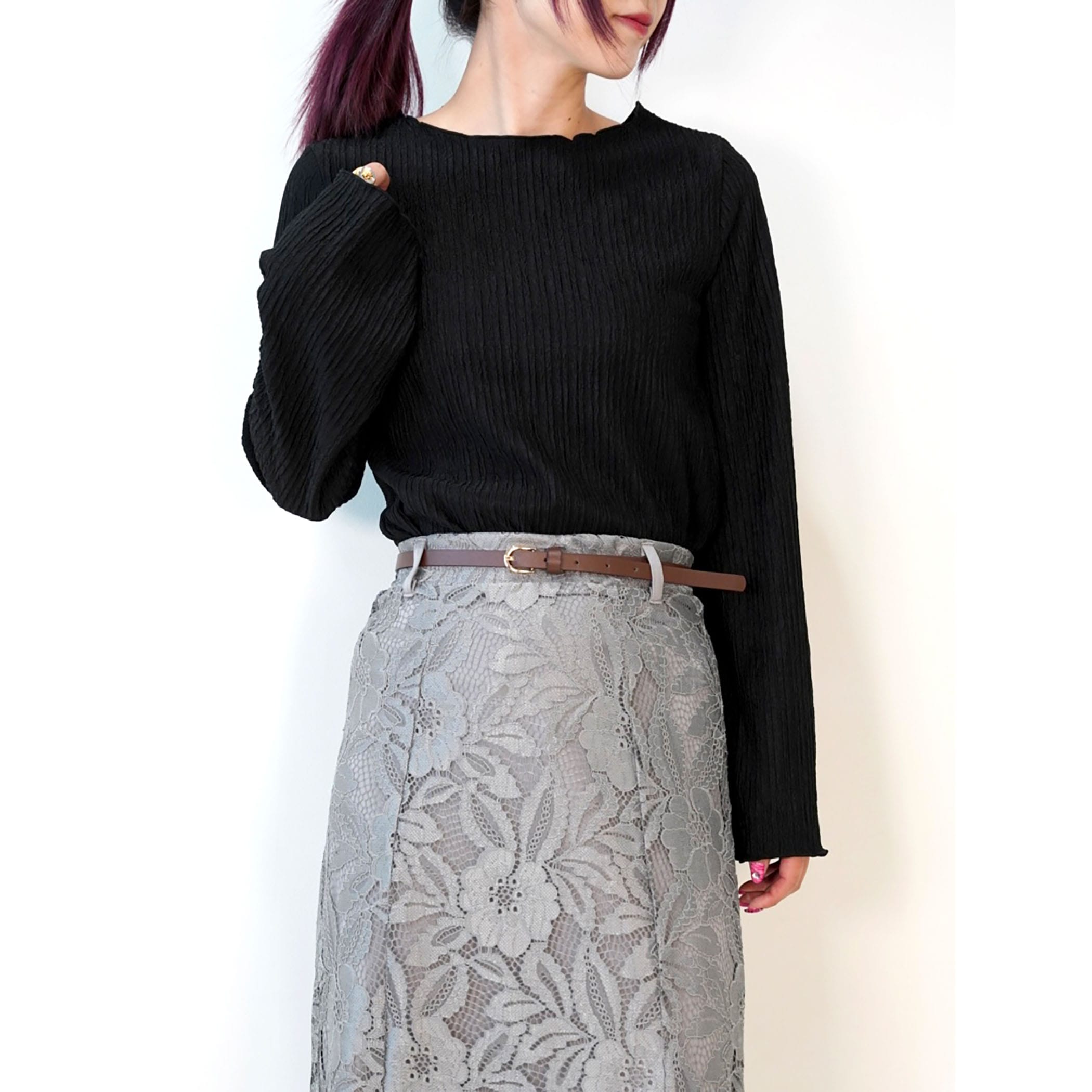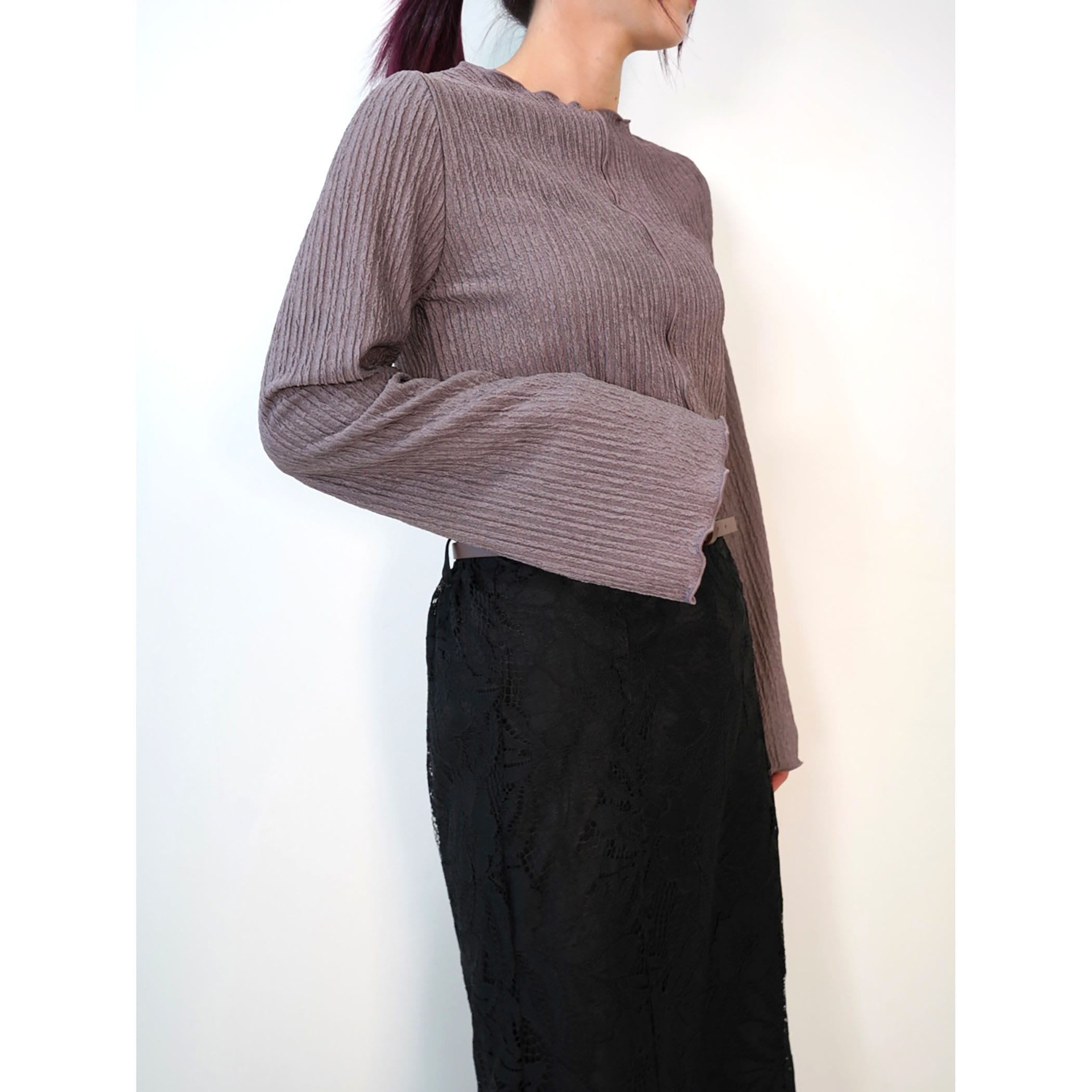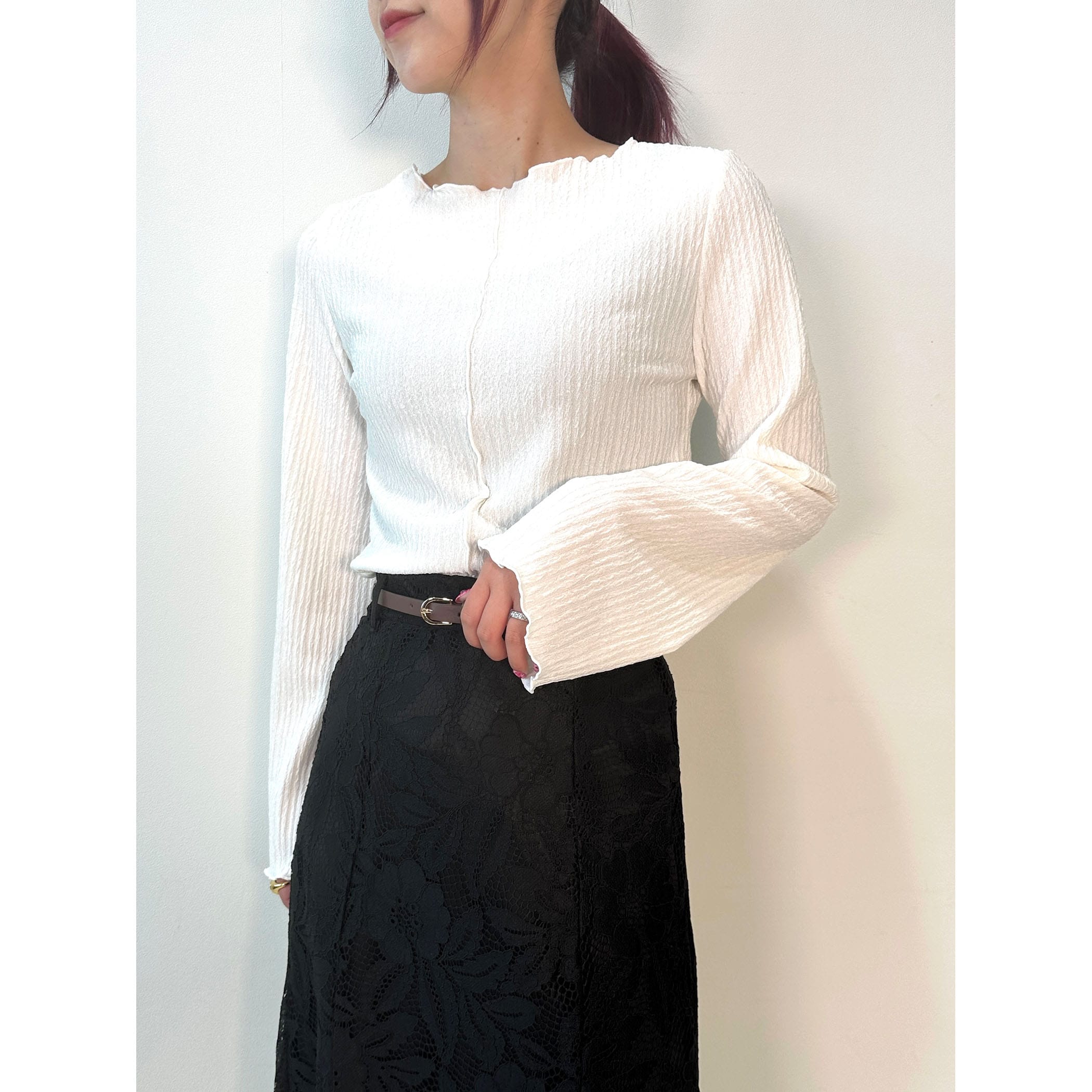 メロー仕様が可愛い、前後2WAYで着用可能なお得感のあるトップス。袖口に向かって広がったベルスリーブがアクセント☆さりげなく柄が入ったおしゃれ感のある素材でこの1着でもコーディネートのポイントに。