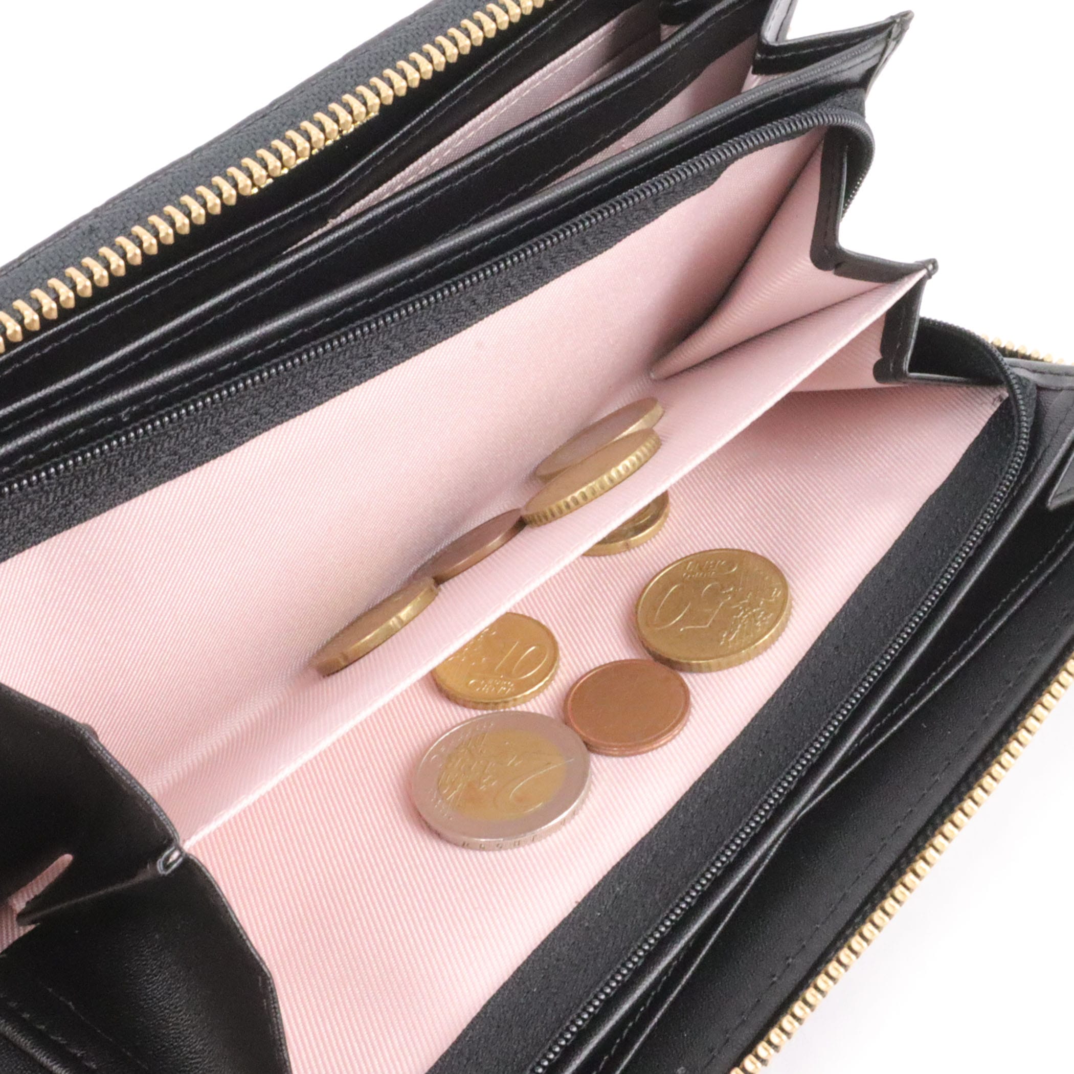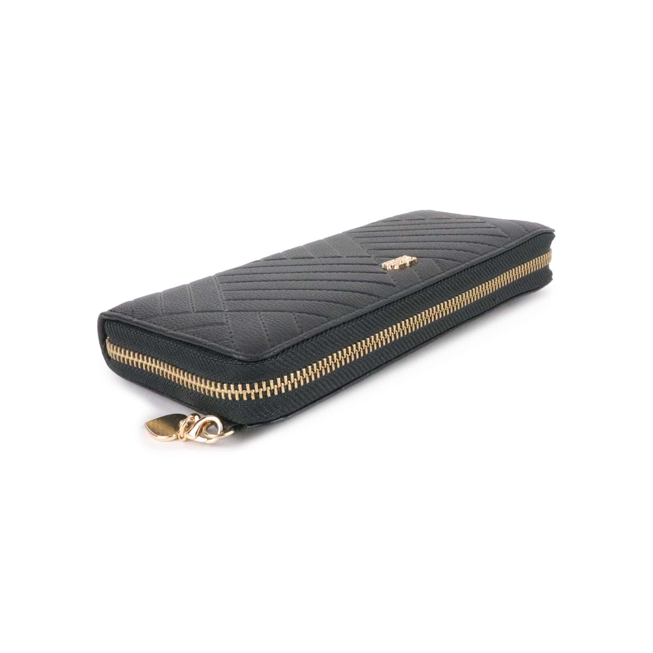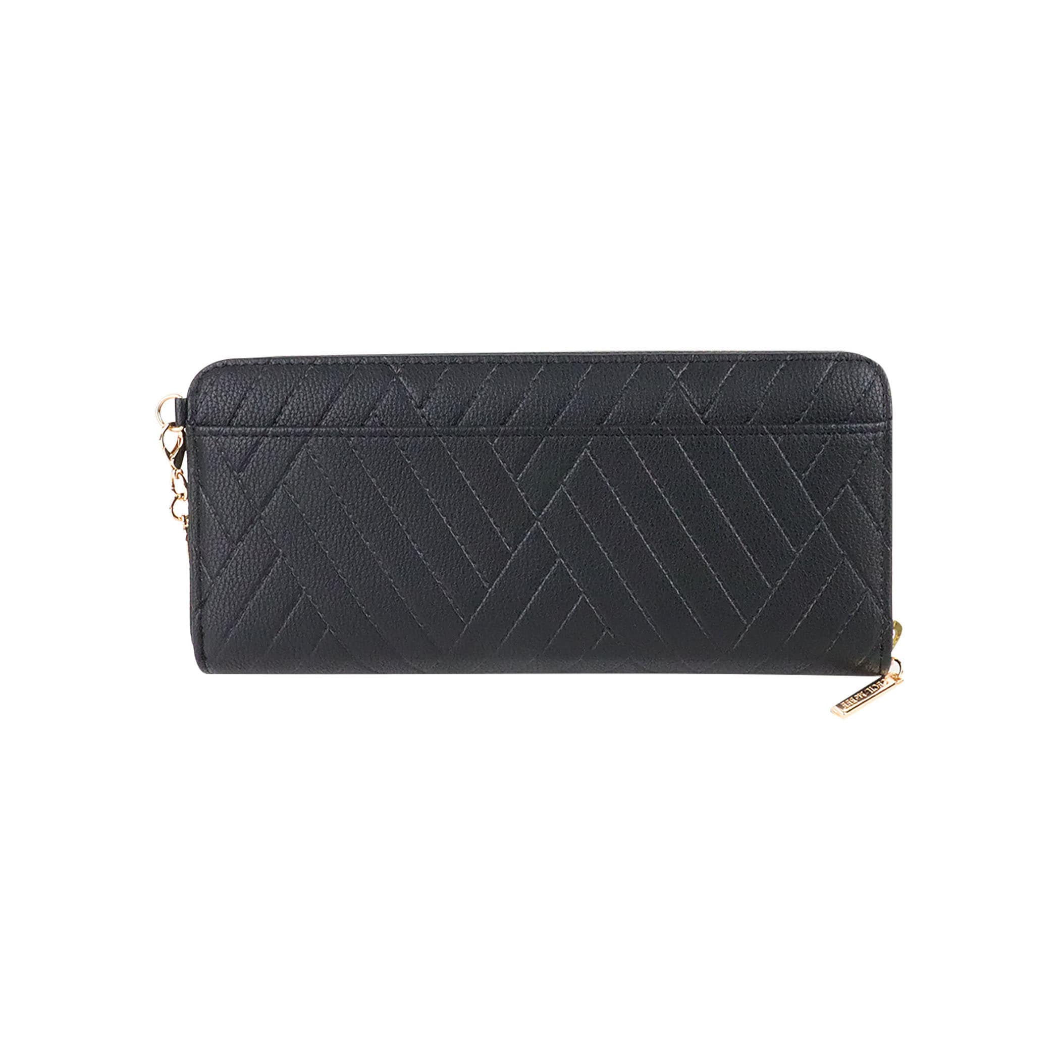 ライン状の型押しが目を惹くデザイン。ゴールドのロゴブローチがアクセントに 外側・内側の配色のコントラストもポイントになっています