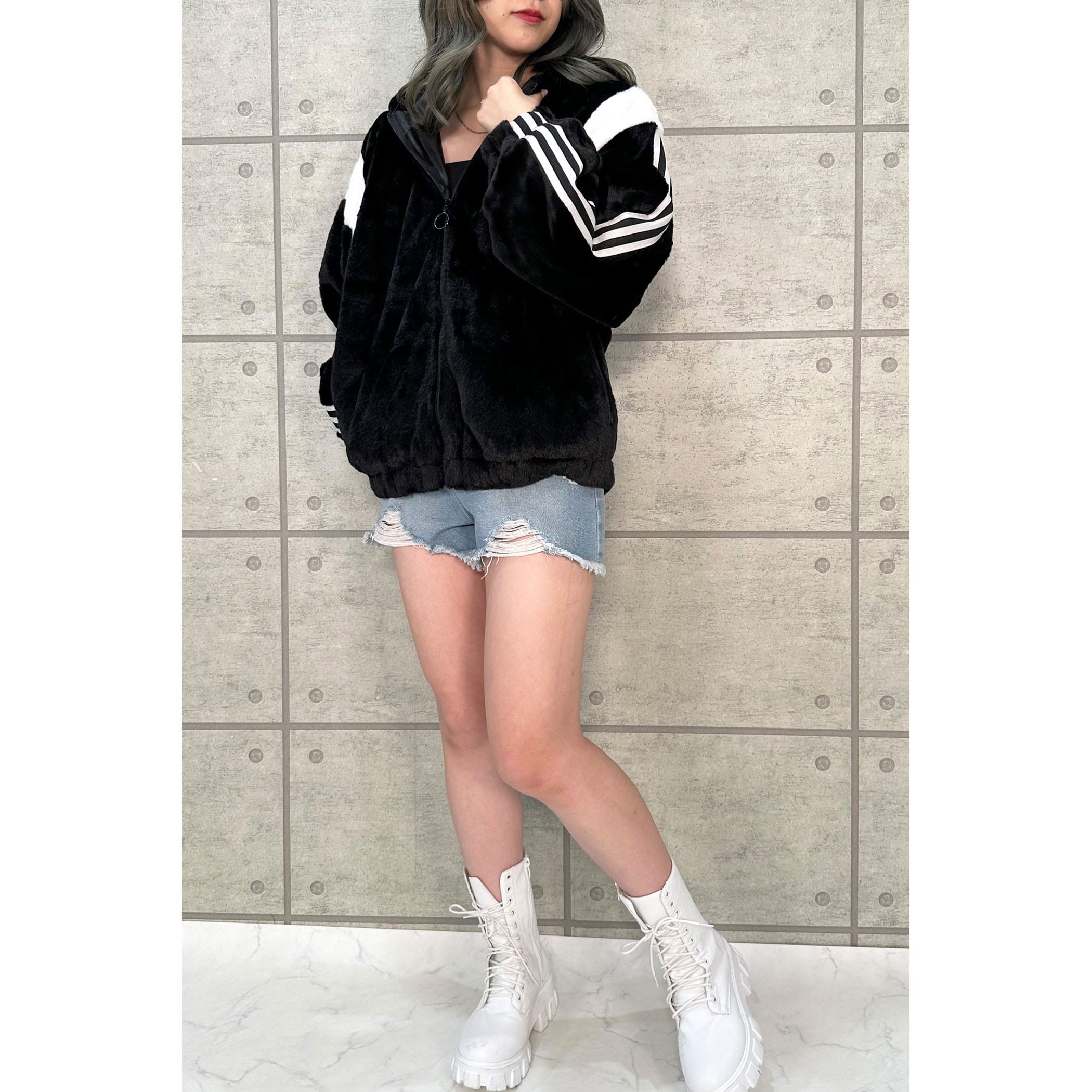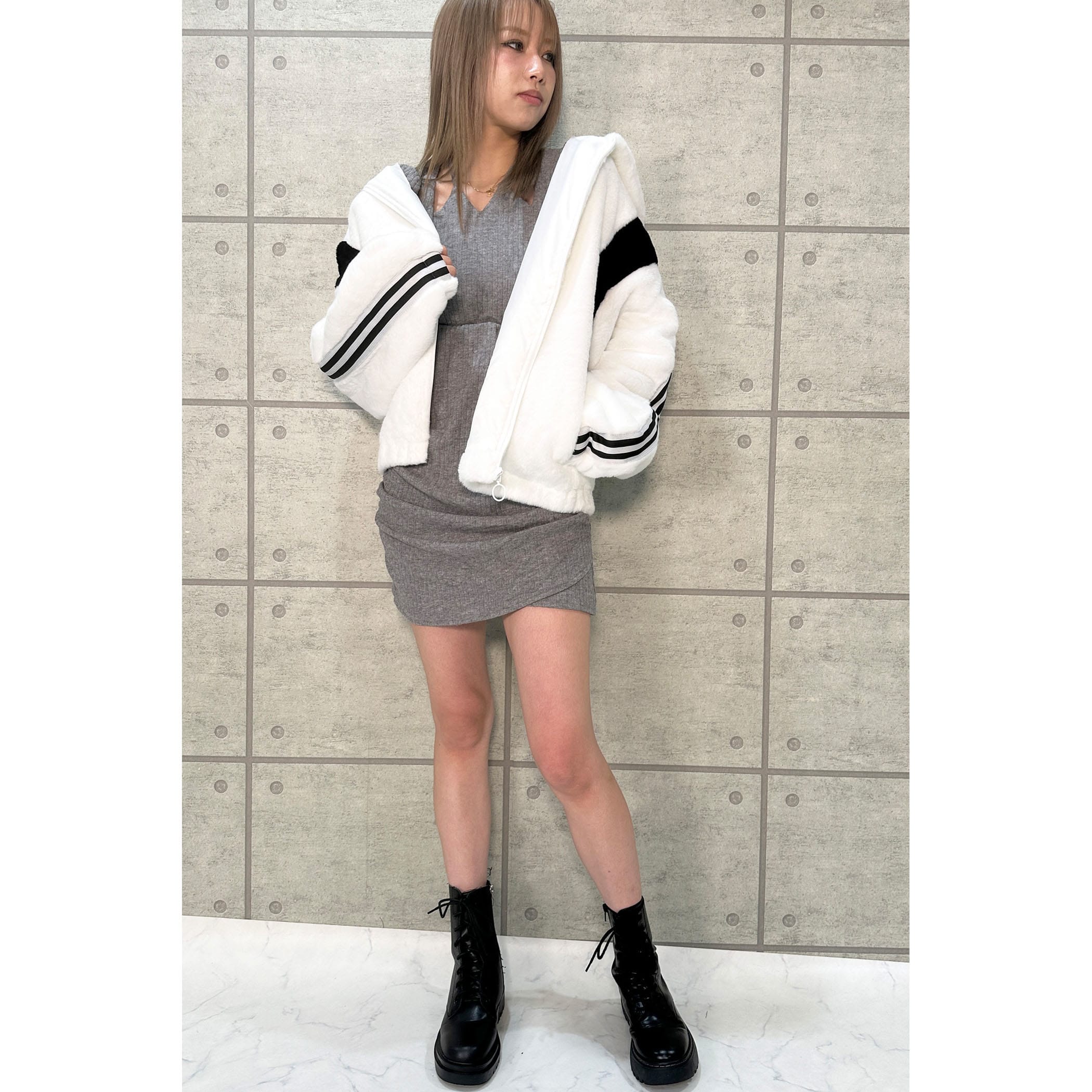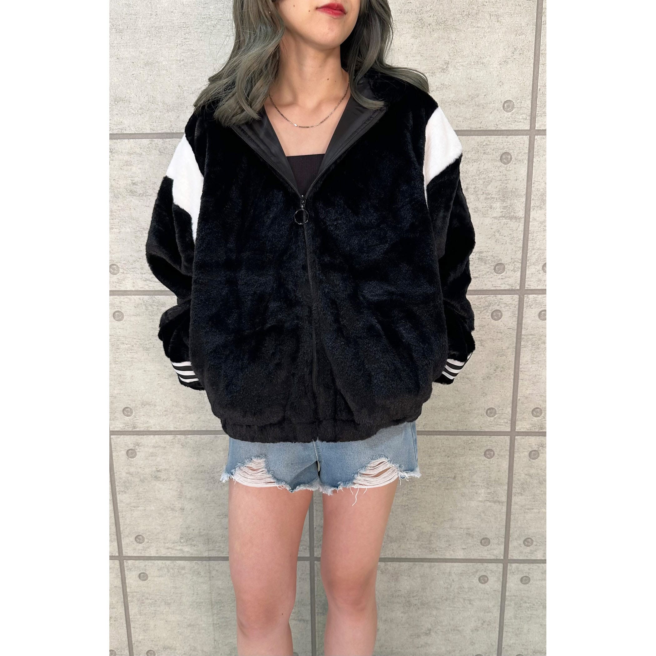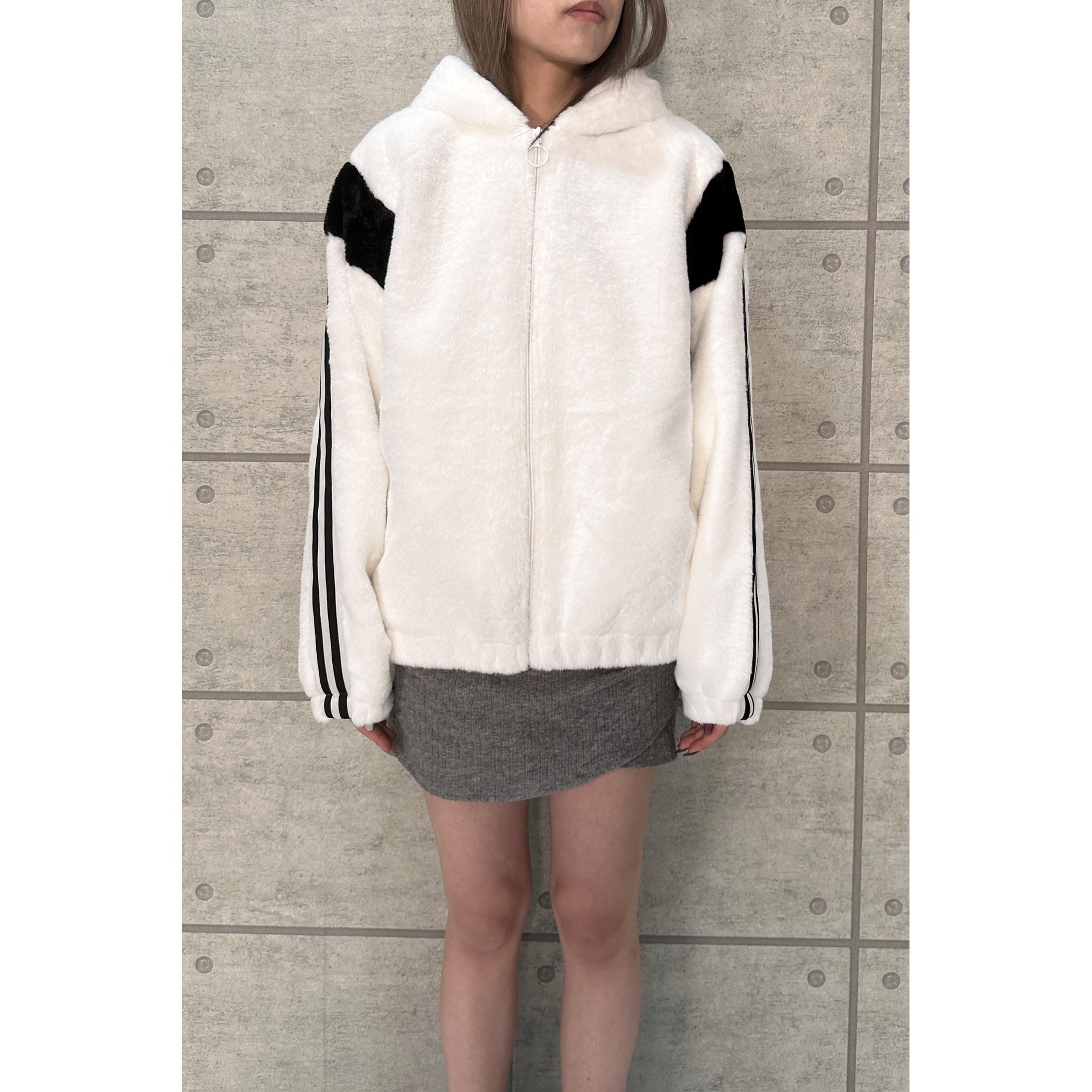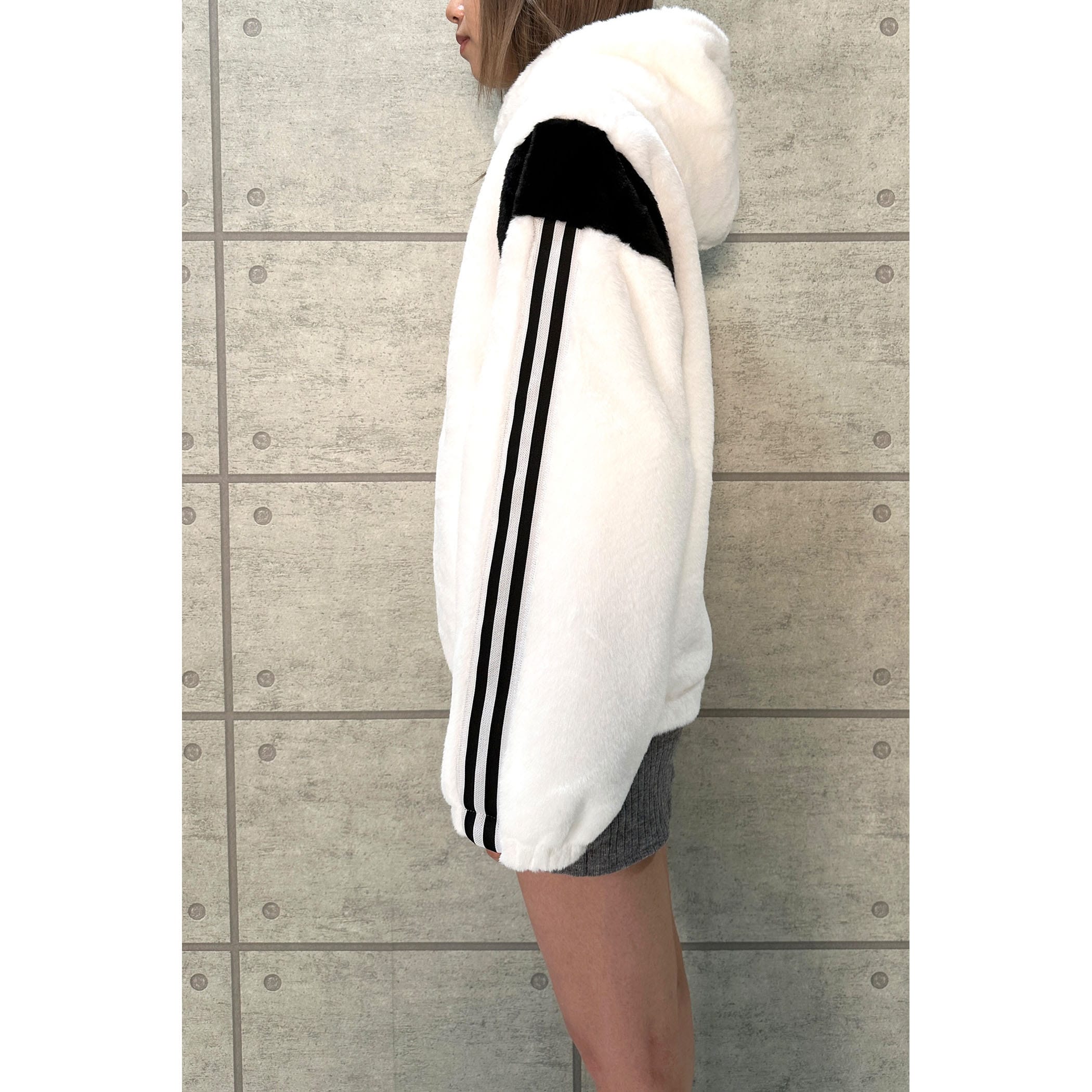 もこもことした柔らかなエコファー素材でシーズンムードが漂う一枚。今季トレンドのトラックデザインがスポ―ティなルックでフェミニンなワンピース合わせのテイストミックスしたスタイルもオススメ。ゆとり感のあるシルエットなのでインナーにも沢山着込んでも着ぶくれしにくい嬉しい一枚です。