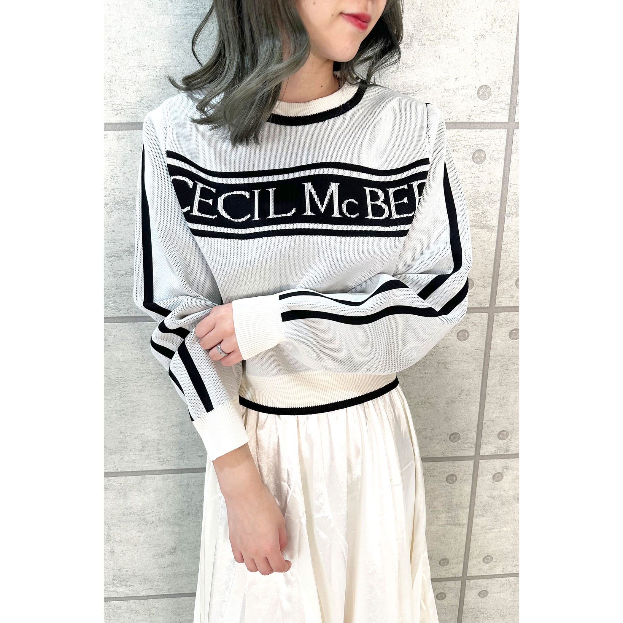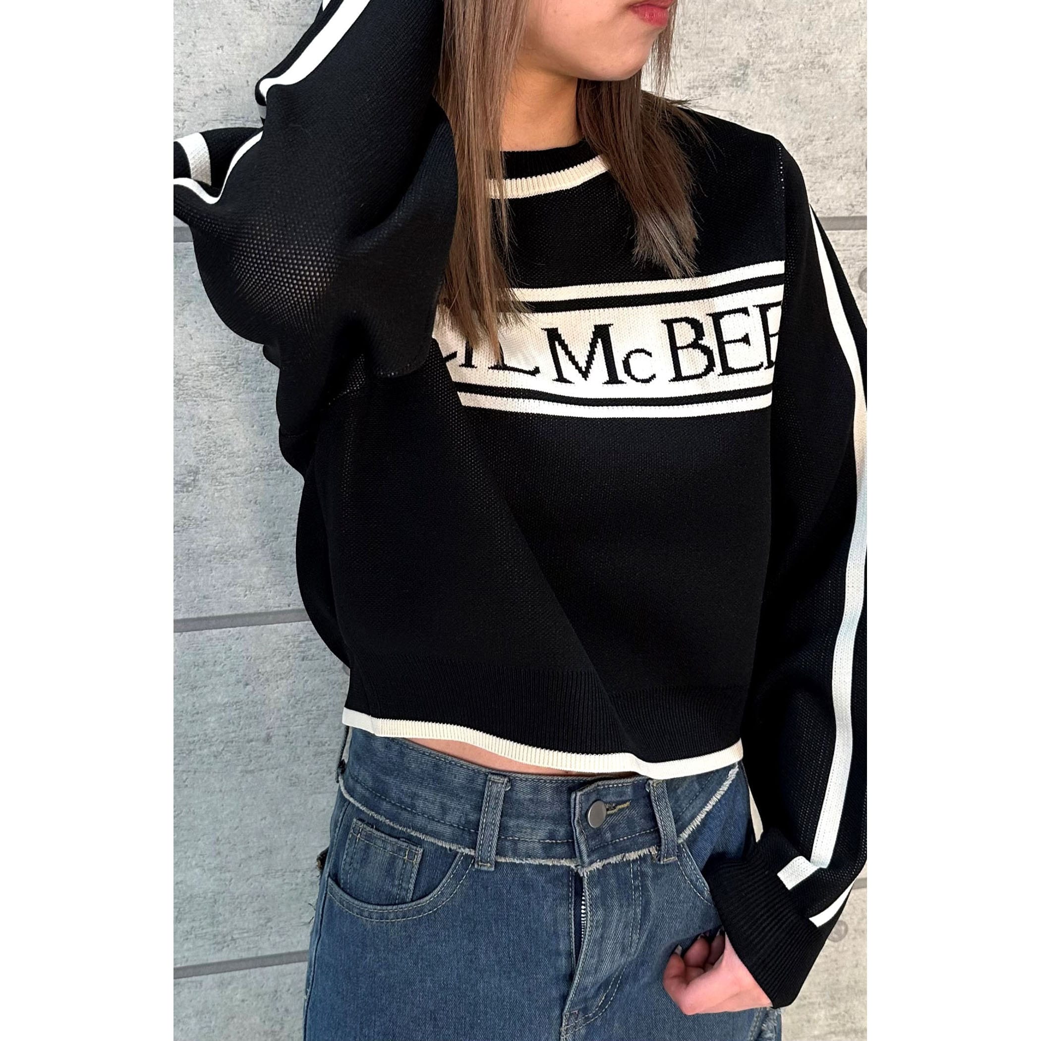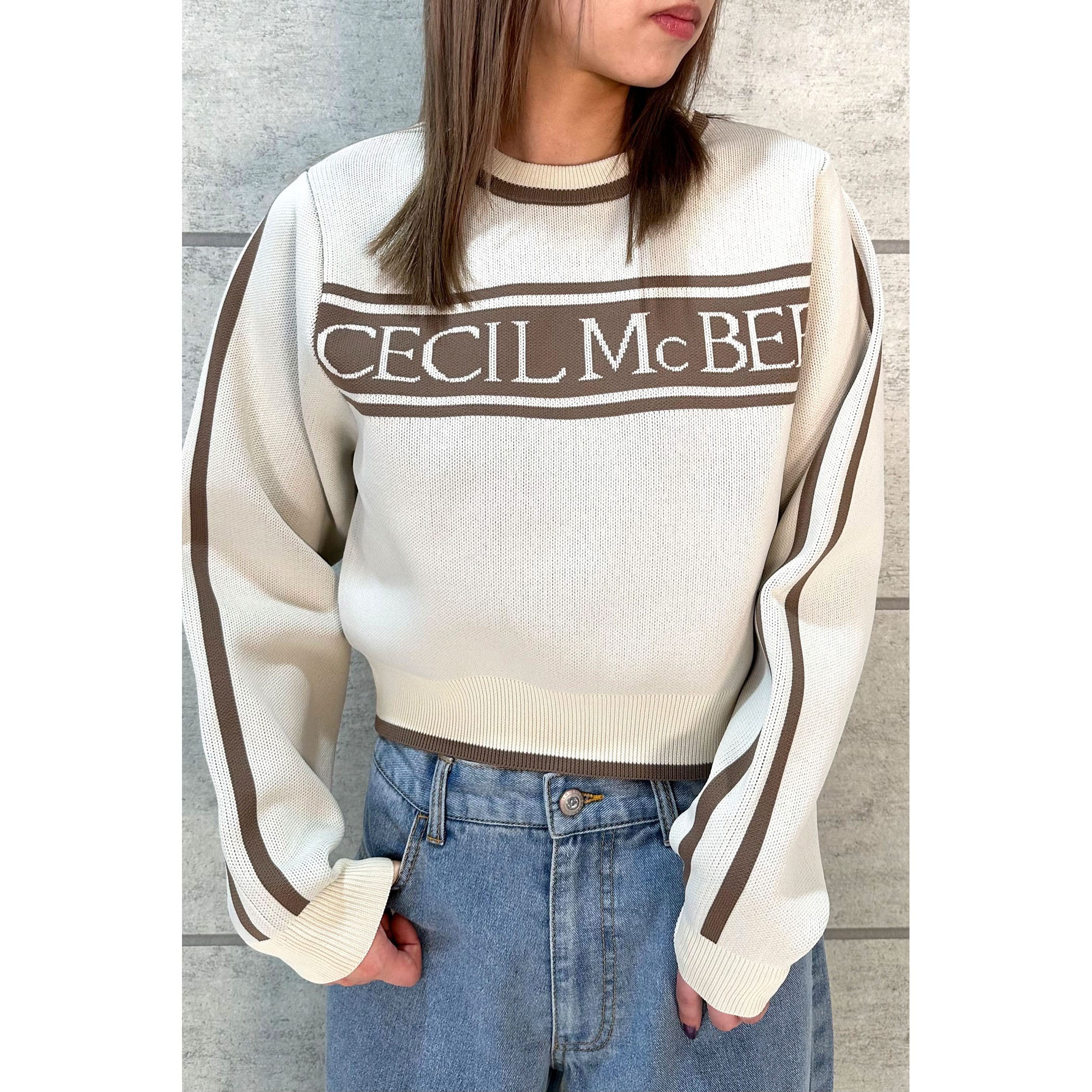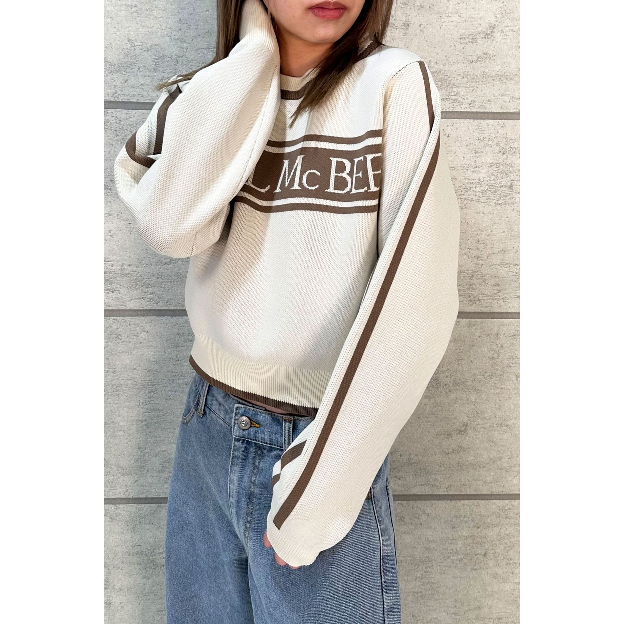 ジャガード編みでとってもオシャレなニット。フロントのロゴ、カラー配色がレトロな雰囲気。ゆったりとしたサイズ感ですが、袖口はリブになっているので手首でしっかり止まります。