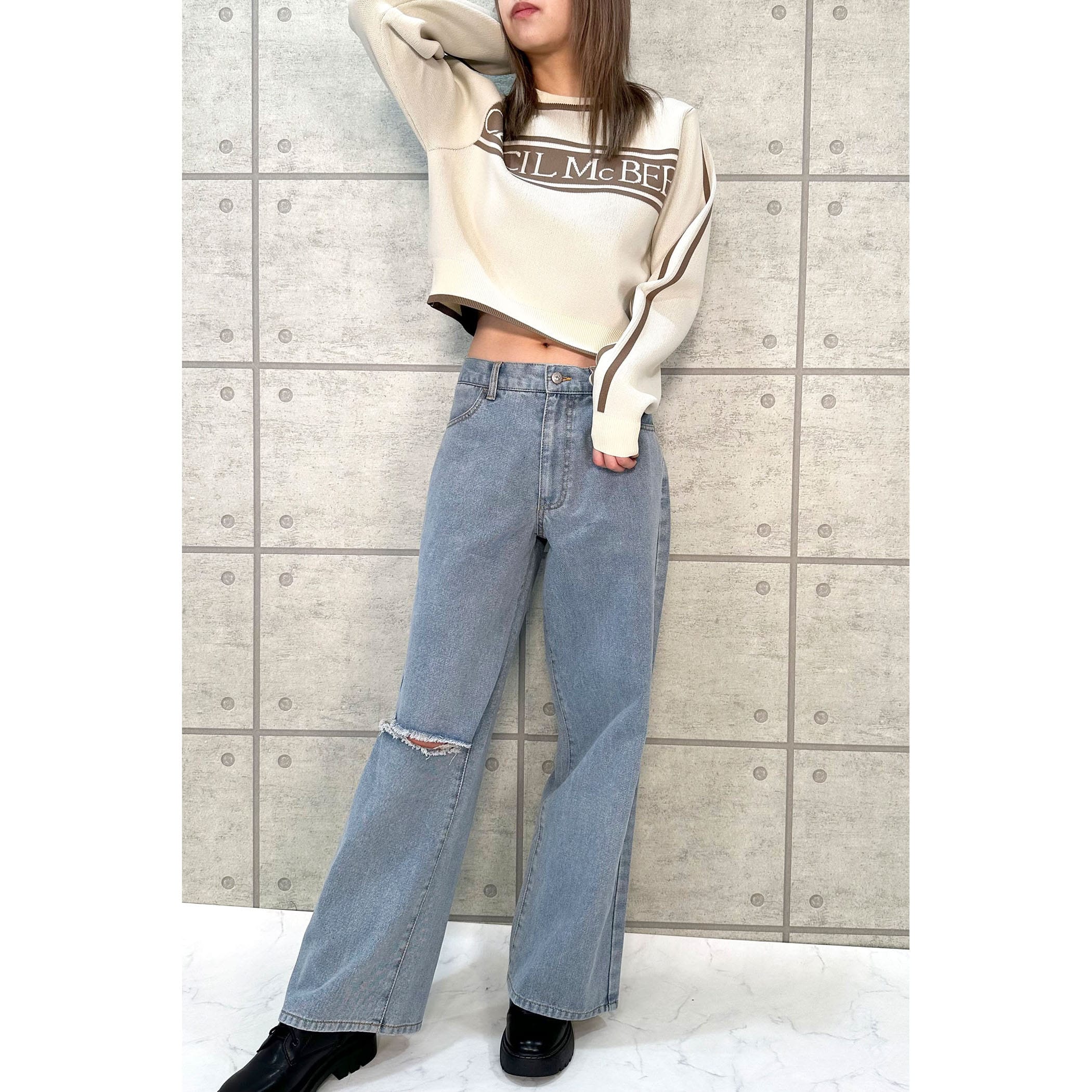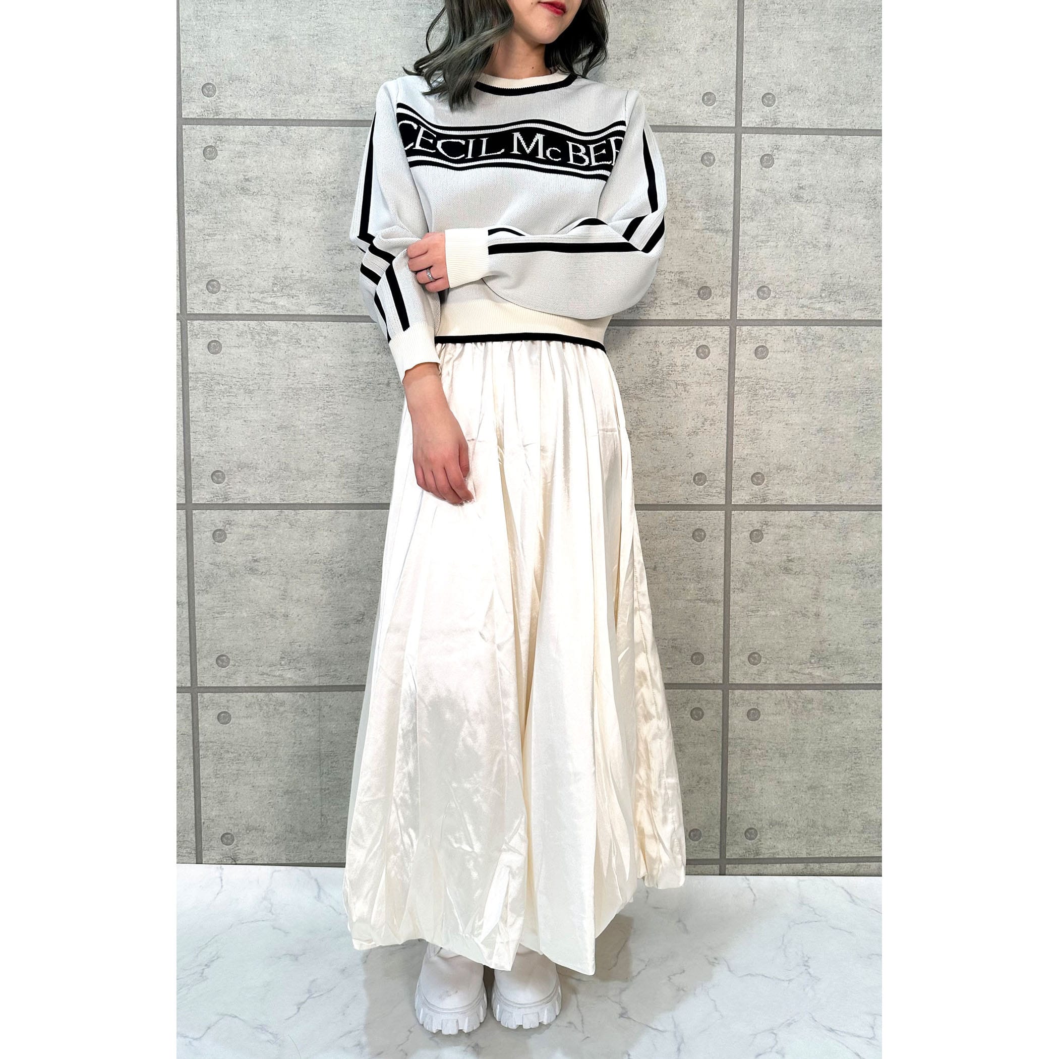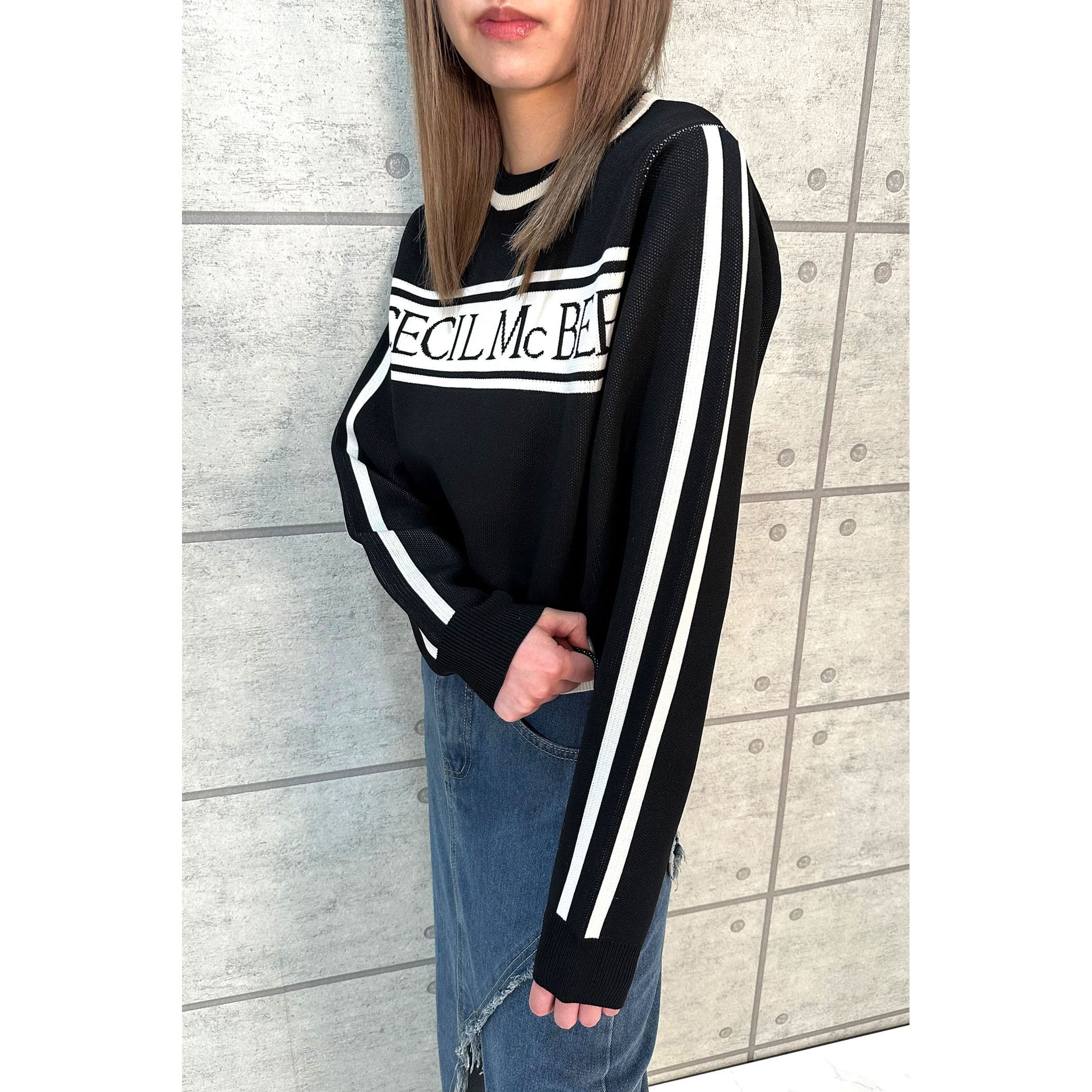 ジャガード編みでとってもオシャレなニット。フロントのロゴ、カラー配色がレトロな雰囲気。ゆったりとしたサイズ感ですが、袖口はリブになっているので手首でしっかり止まります。