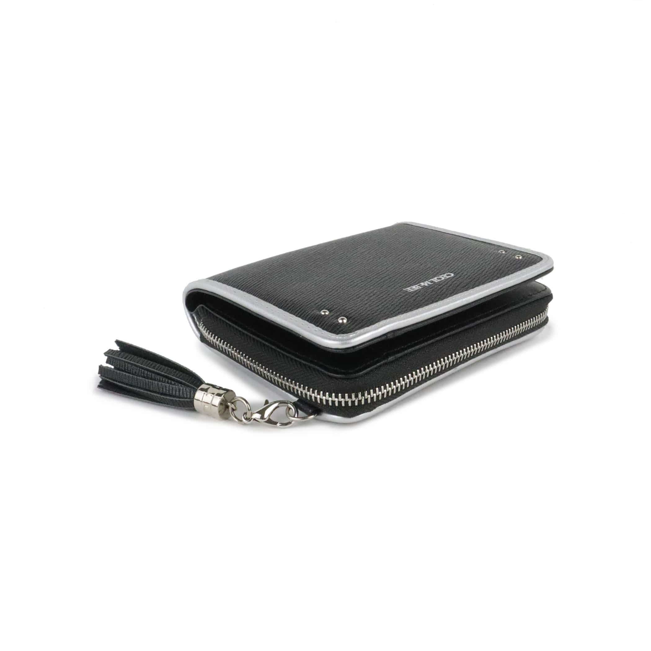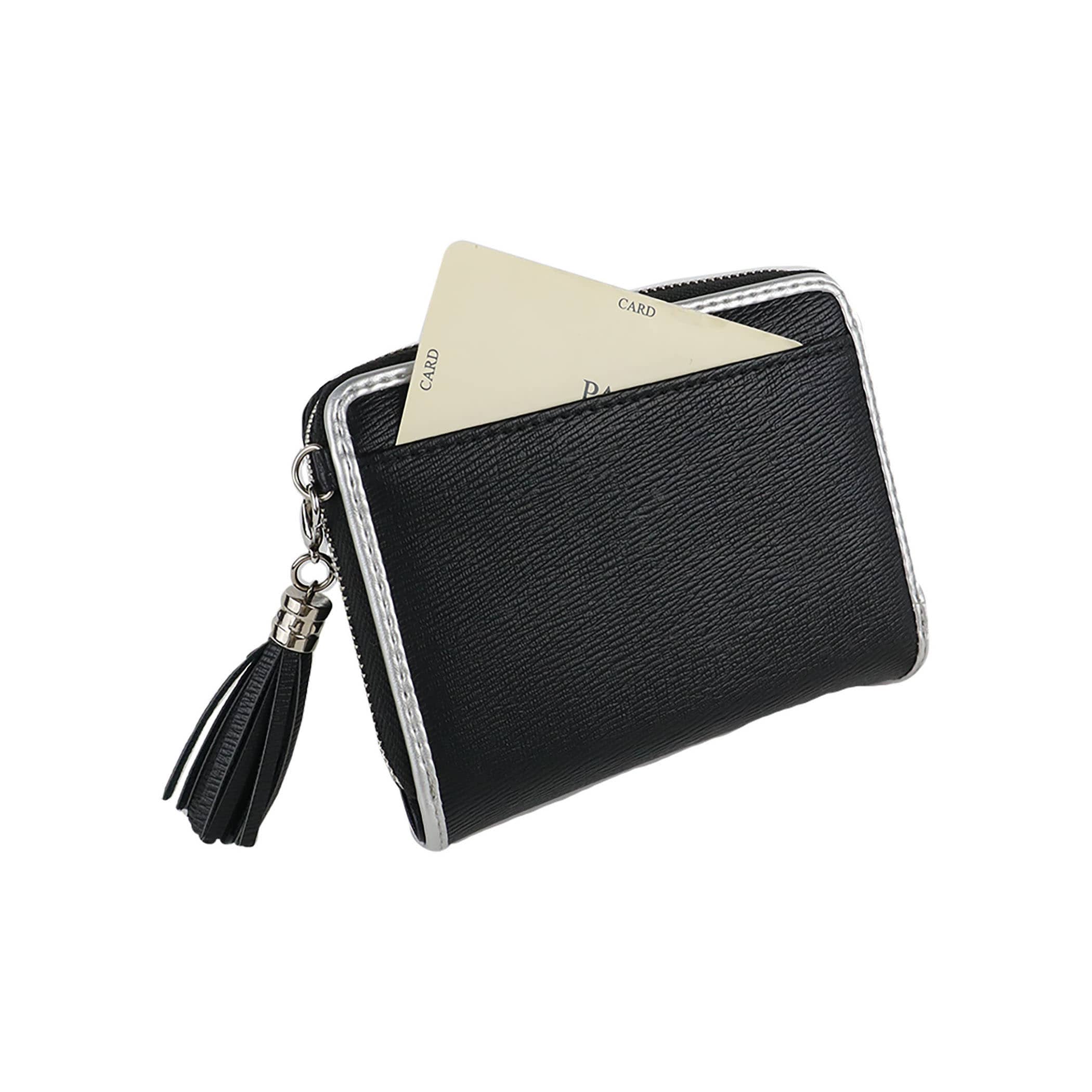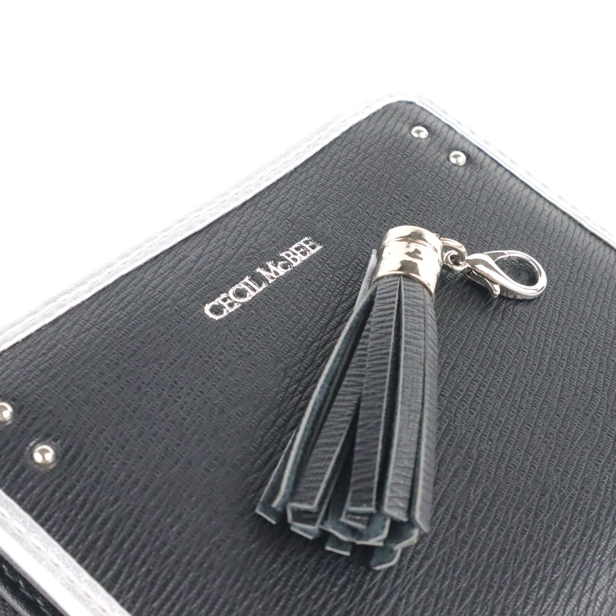 ソフトな手触りのモミシボ合皮を使用したシリーズ。シルバーカラーのパイピングがクールさを演出。付属のタッセルチャームは取り外し可能でその日の気分により使用出来ます