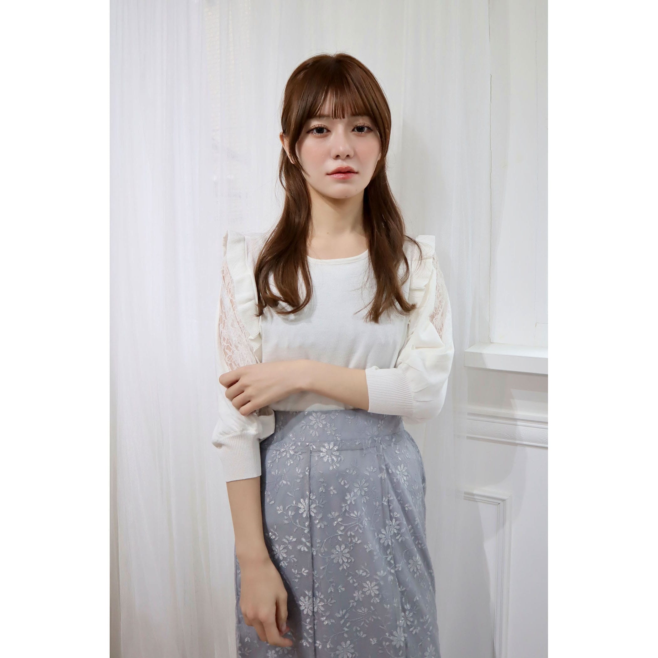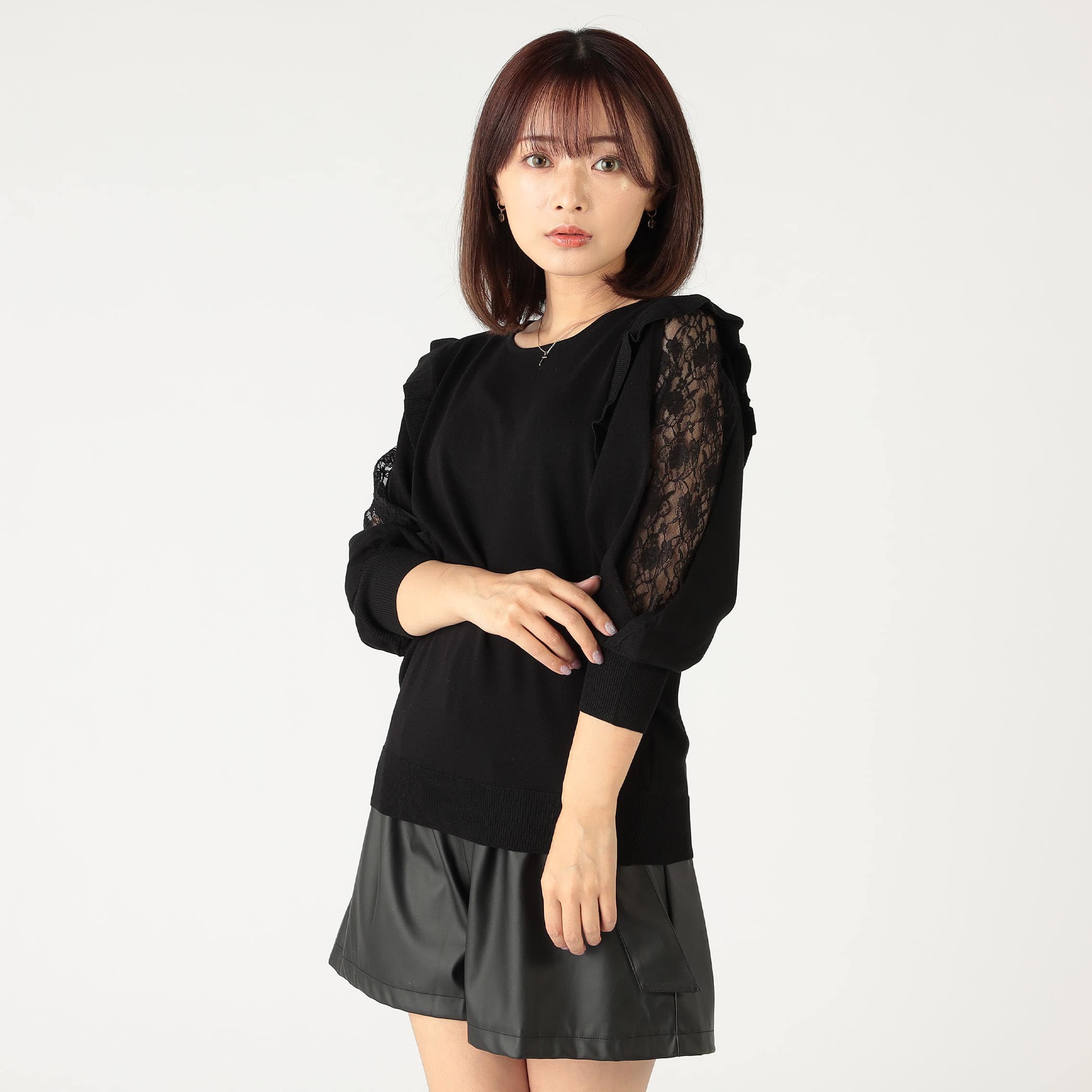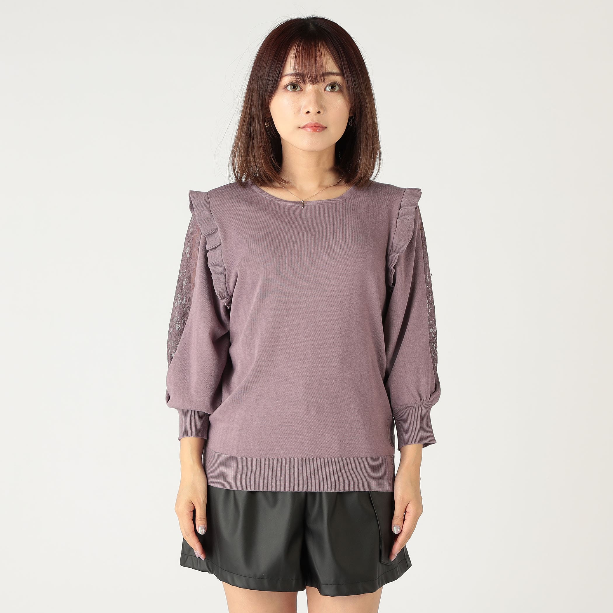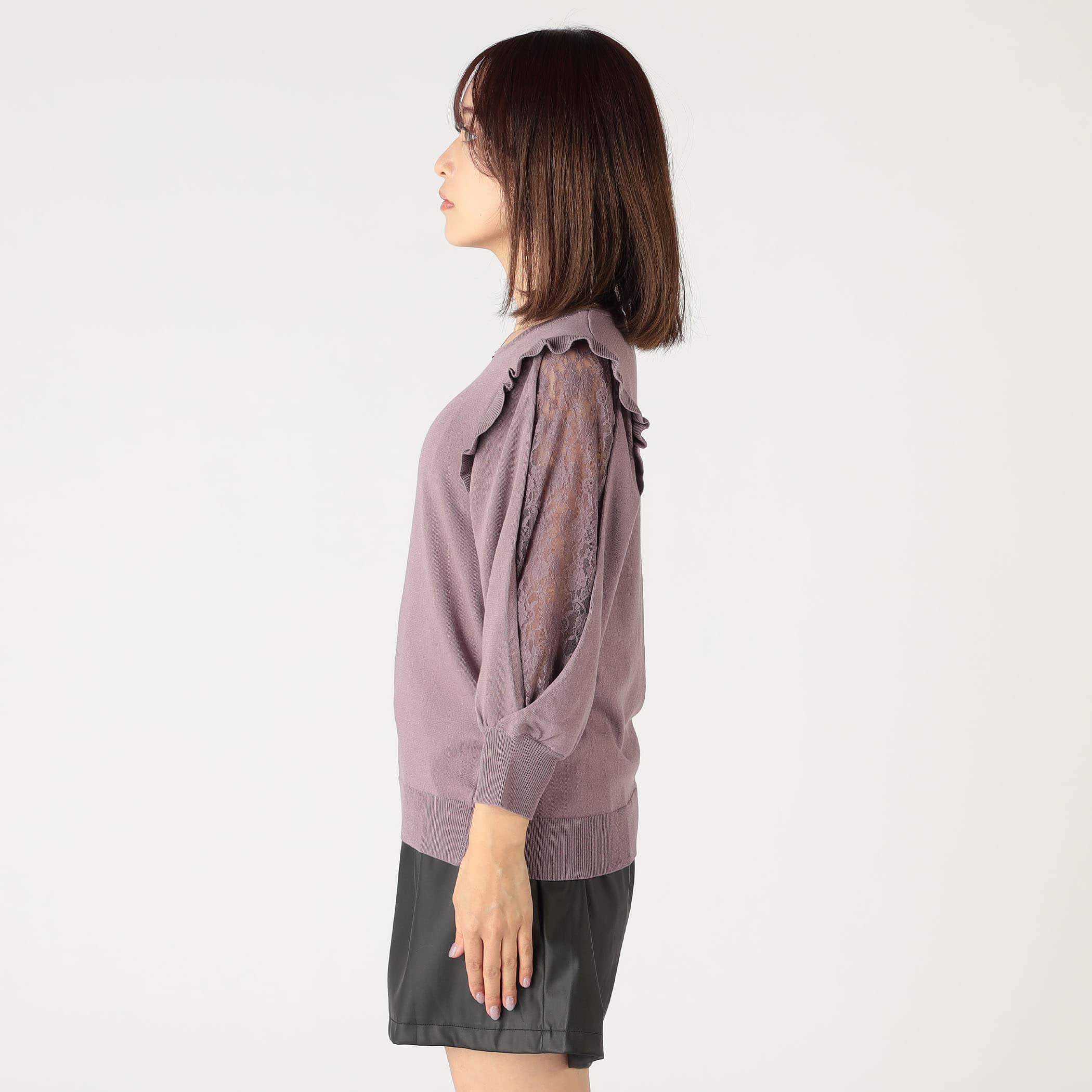 麻タッチレーヨン 肩フリル袖レースプルオーバー