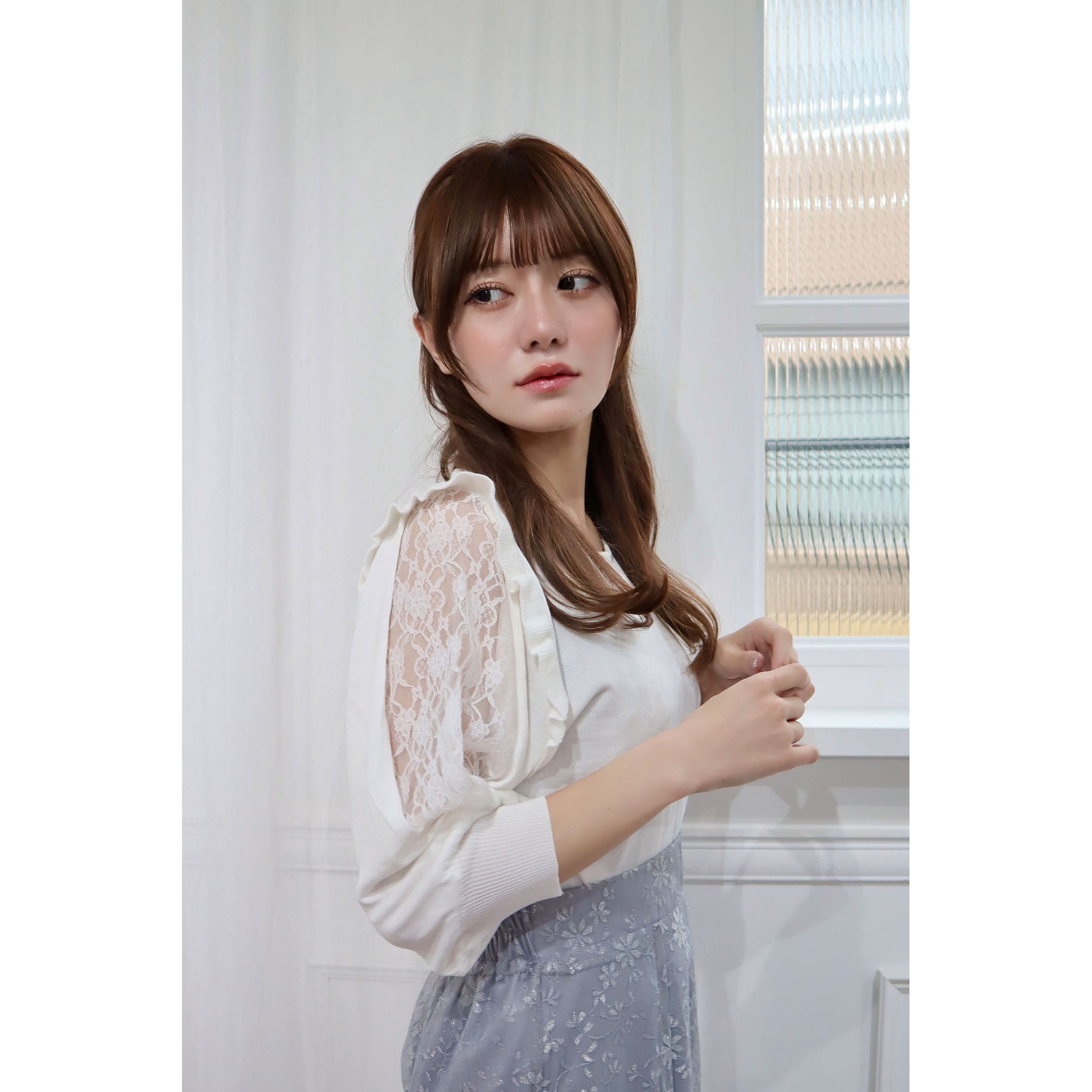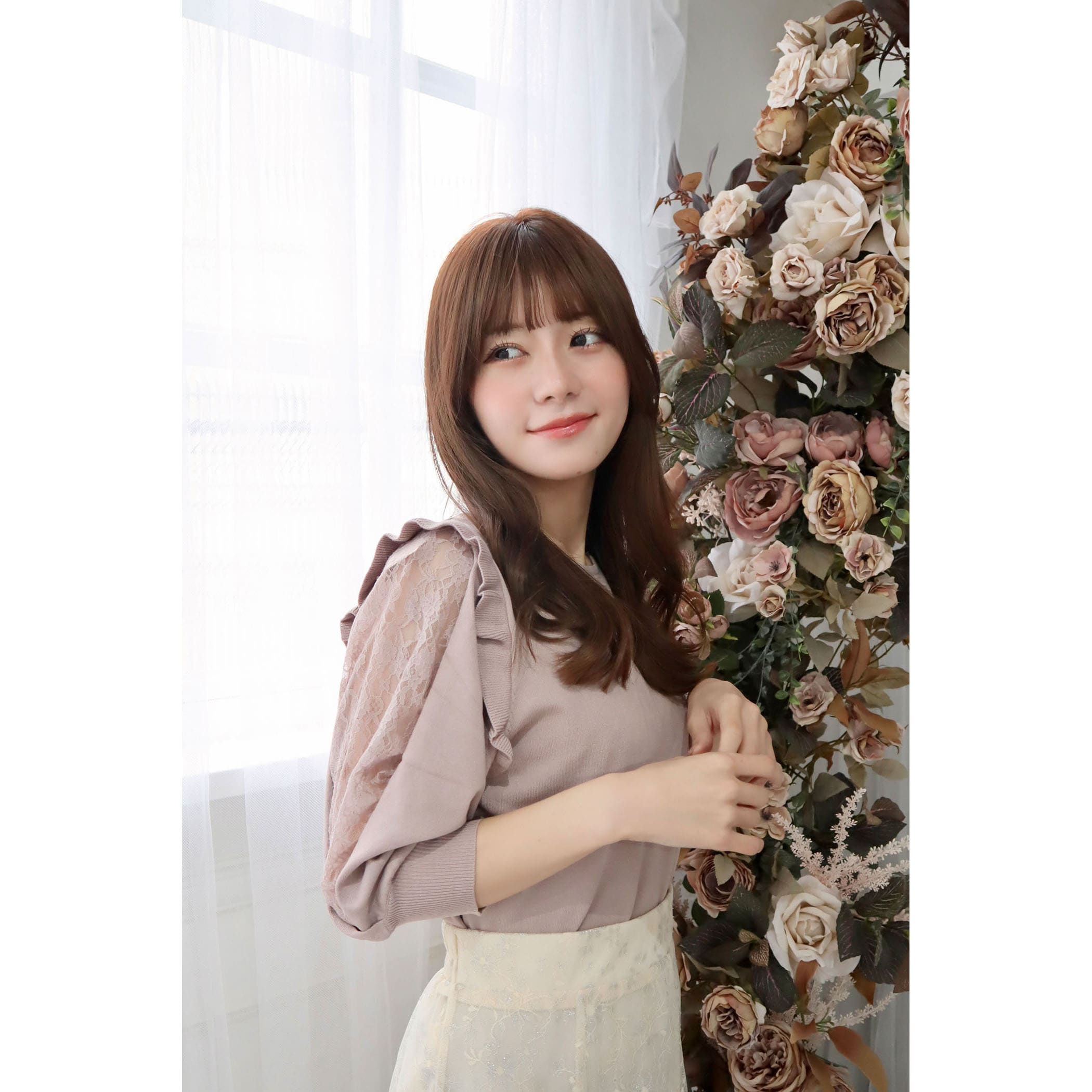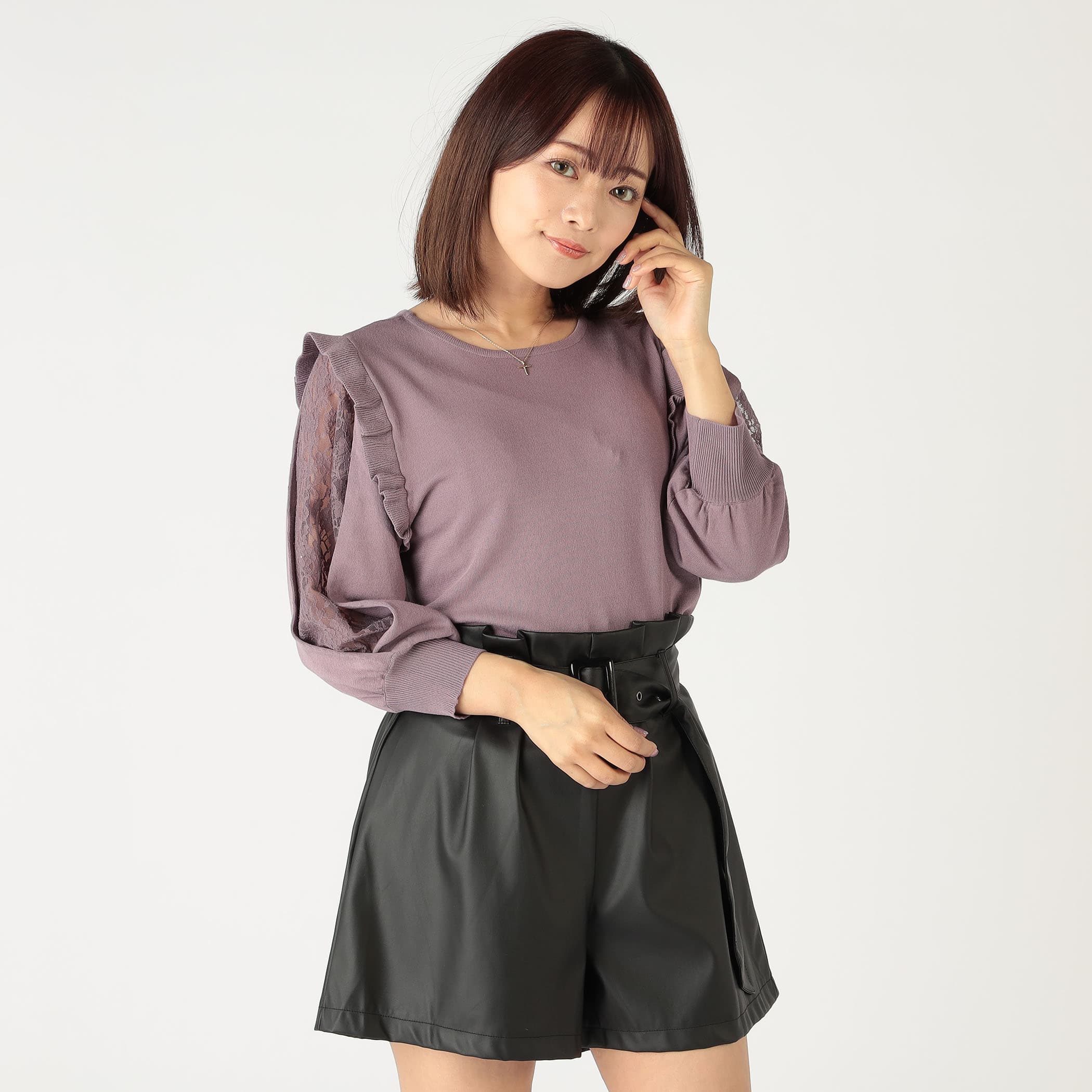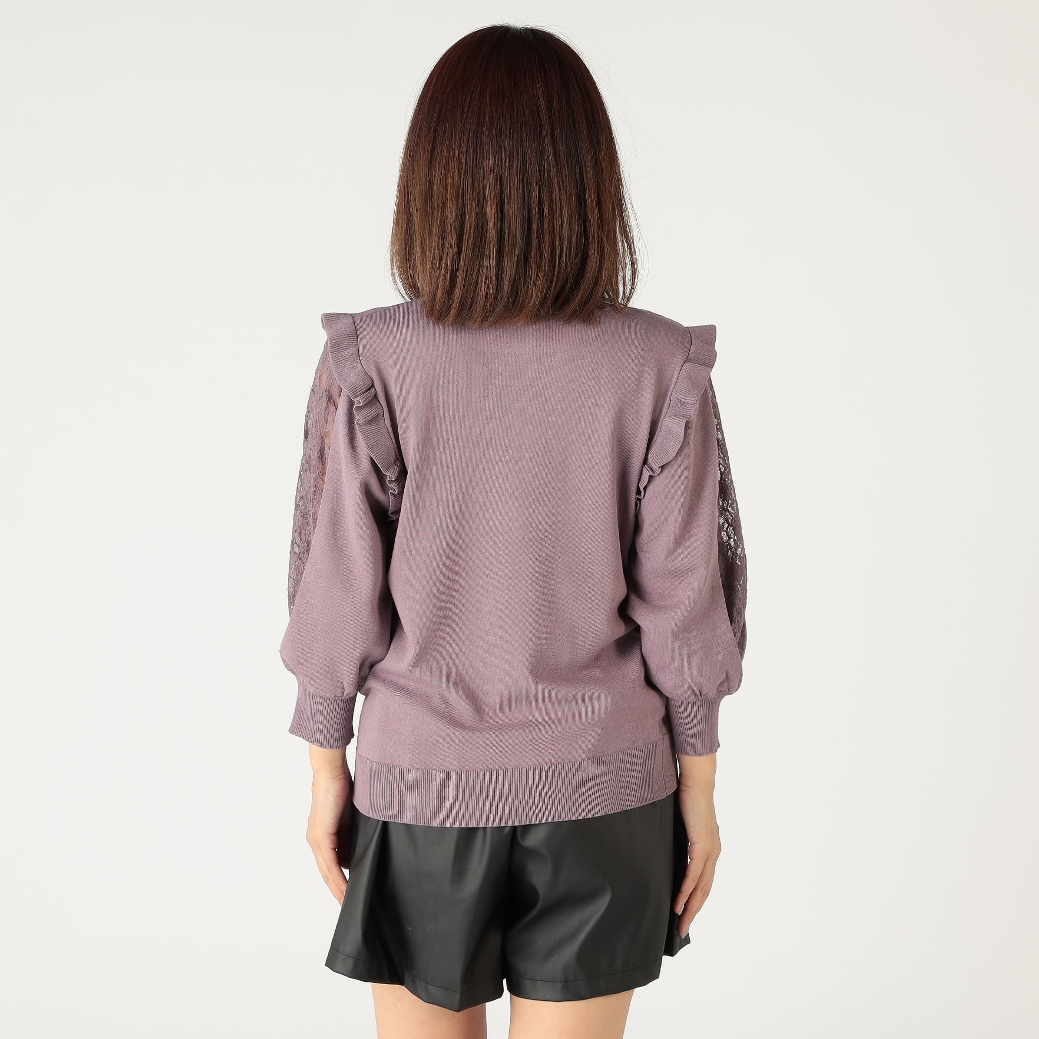 麻タッチレーヨン 肩フリル袖レースプルオーバー