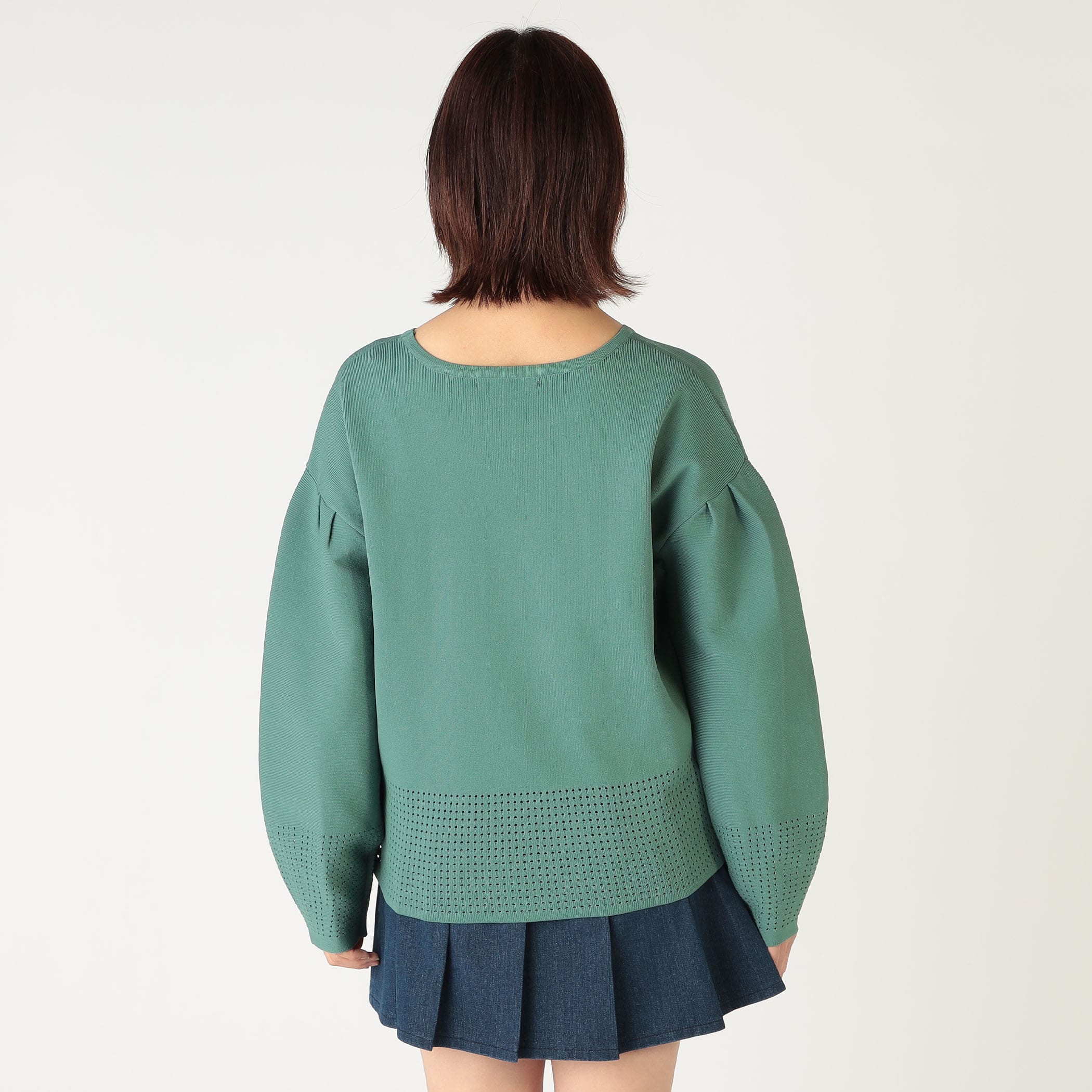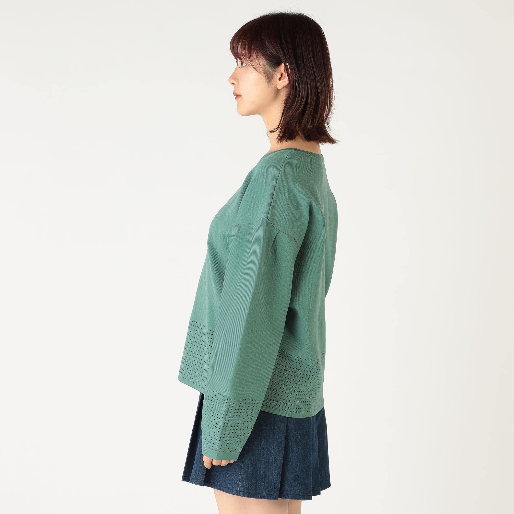 袖と裾のパンチングがポイントのプルオーバー。身体のラインを拾いにくく体型カバーにもオススメ◎パンツはもちろん、スカートにも合わせやすい着丈で、コーデの幅も広がる一枚です。