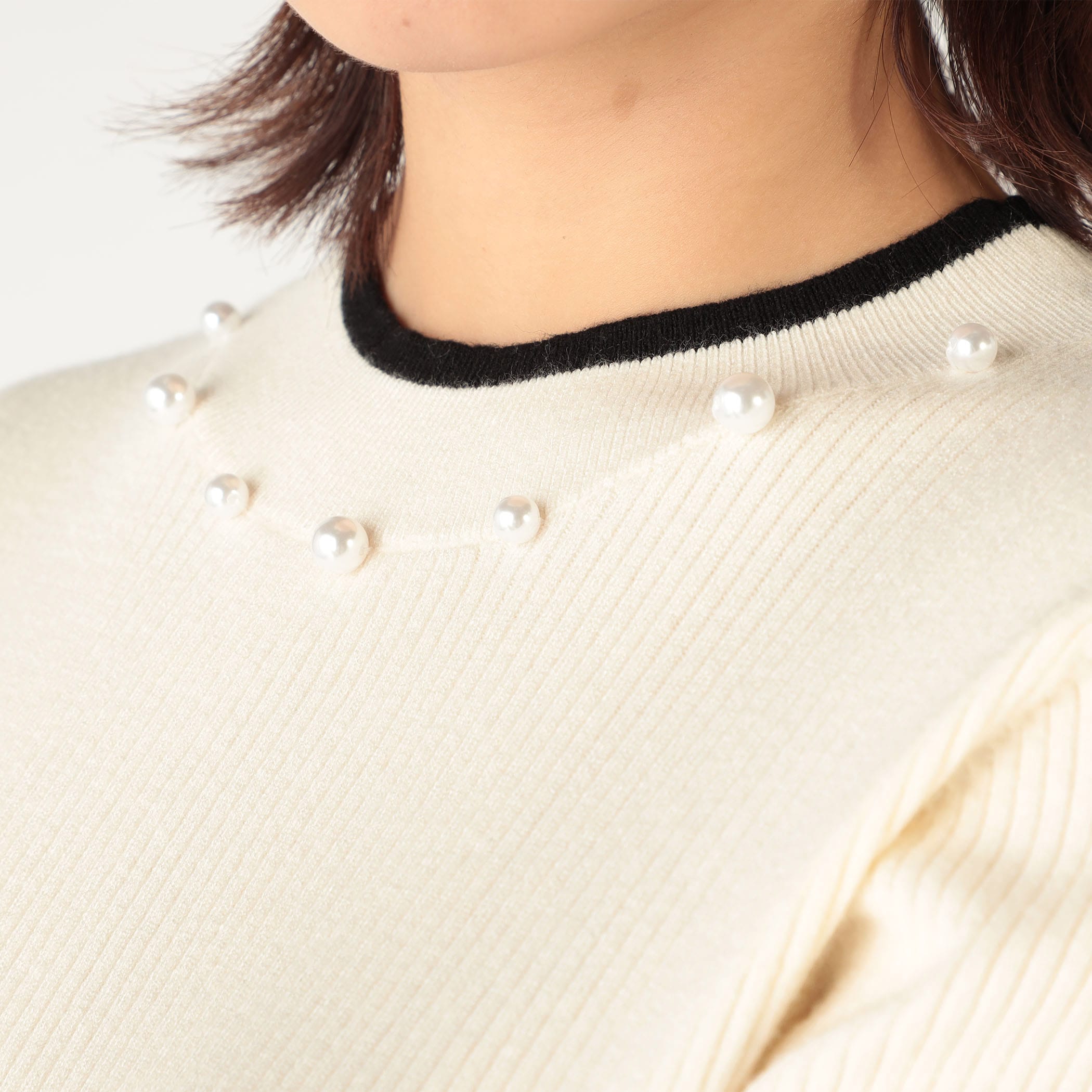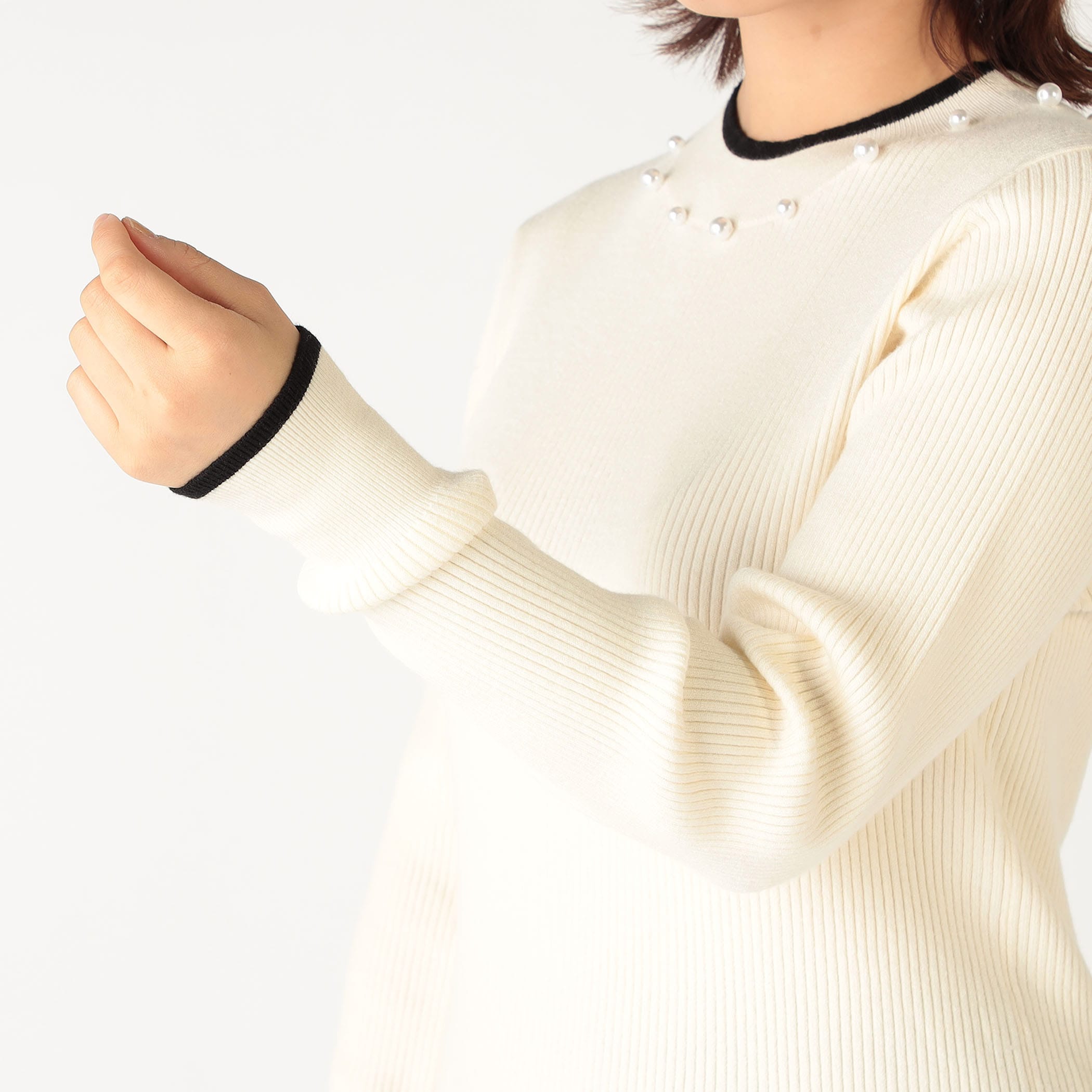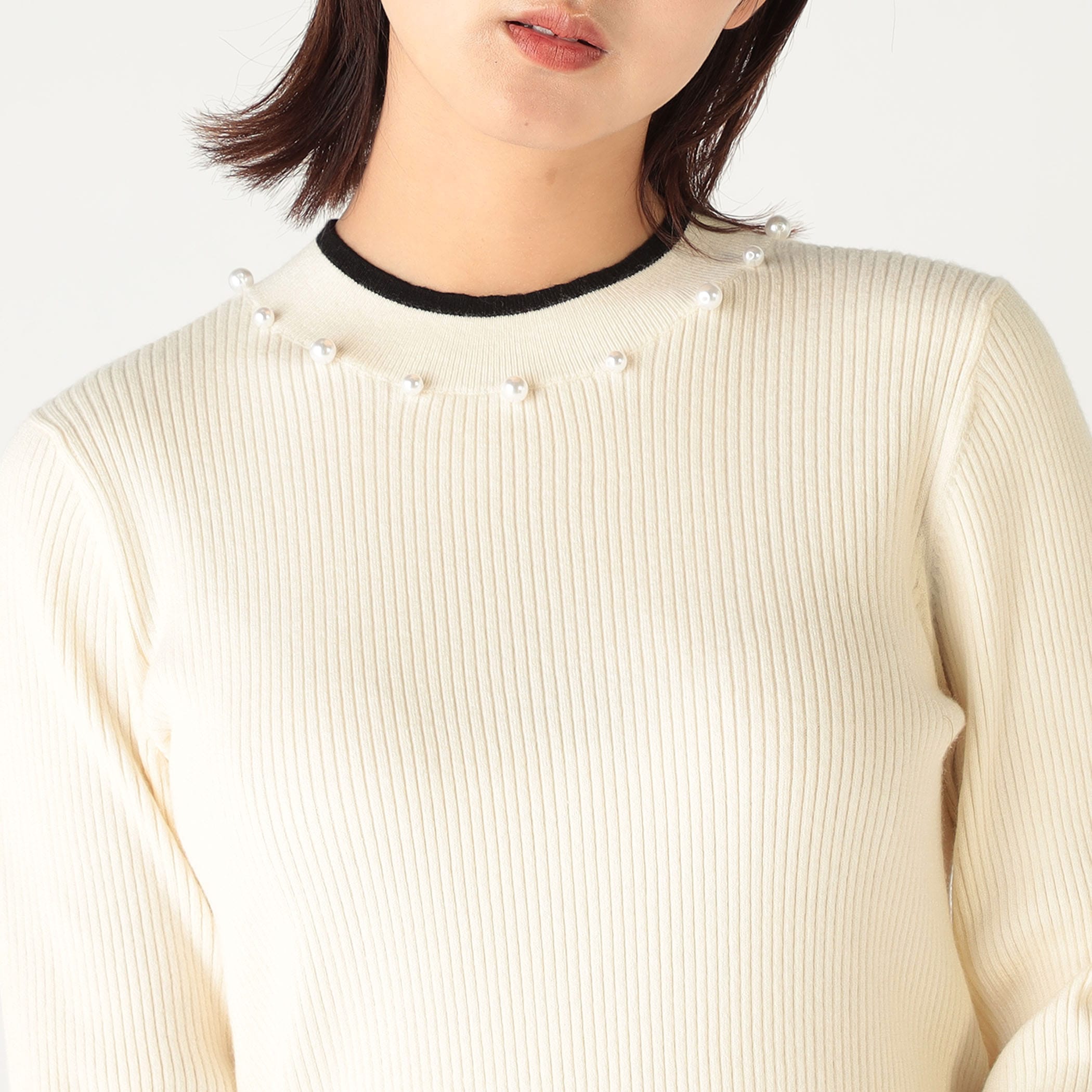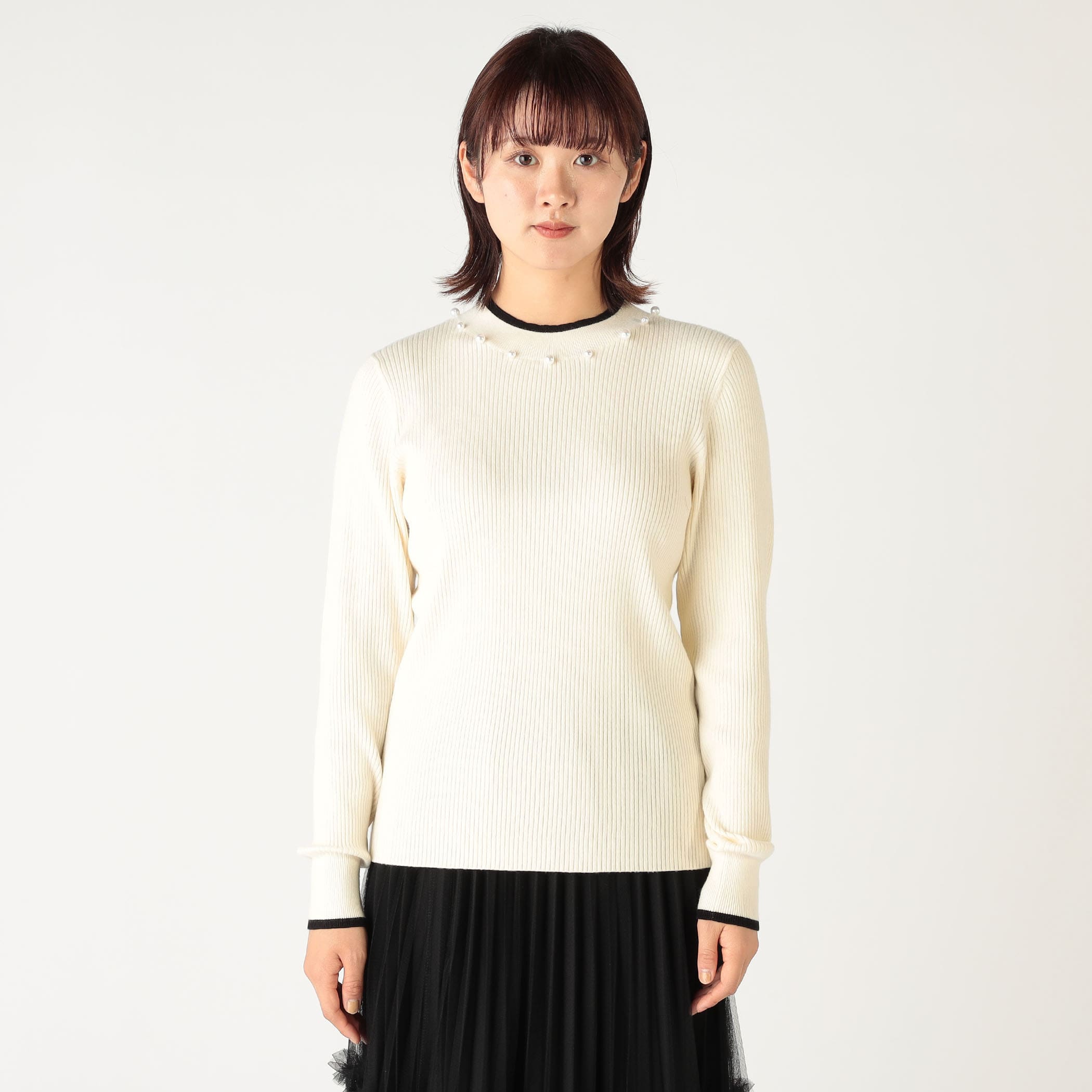 今季トレンドのパールデザインが可愛らしいデザインのプルオーバー。1枚でスタイルが決まるきれいめニット。襟ぐりに施された小ぶりなバールビジューが女性らしく高みえさせてくれます。フェミニン派は、マーメイドやフレアスカートに、カジュアル派はデニムパンツと合わせてカジュアルダウンさせたスタイルングがおすすめ◎パールがついているので、アクセサリーを付けなくても着映えする1枚です。