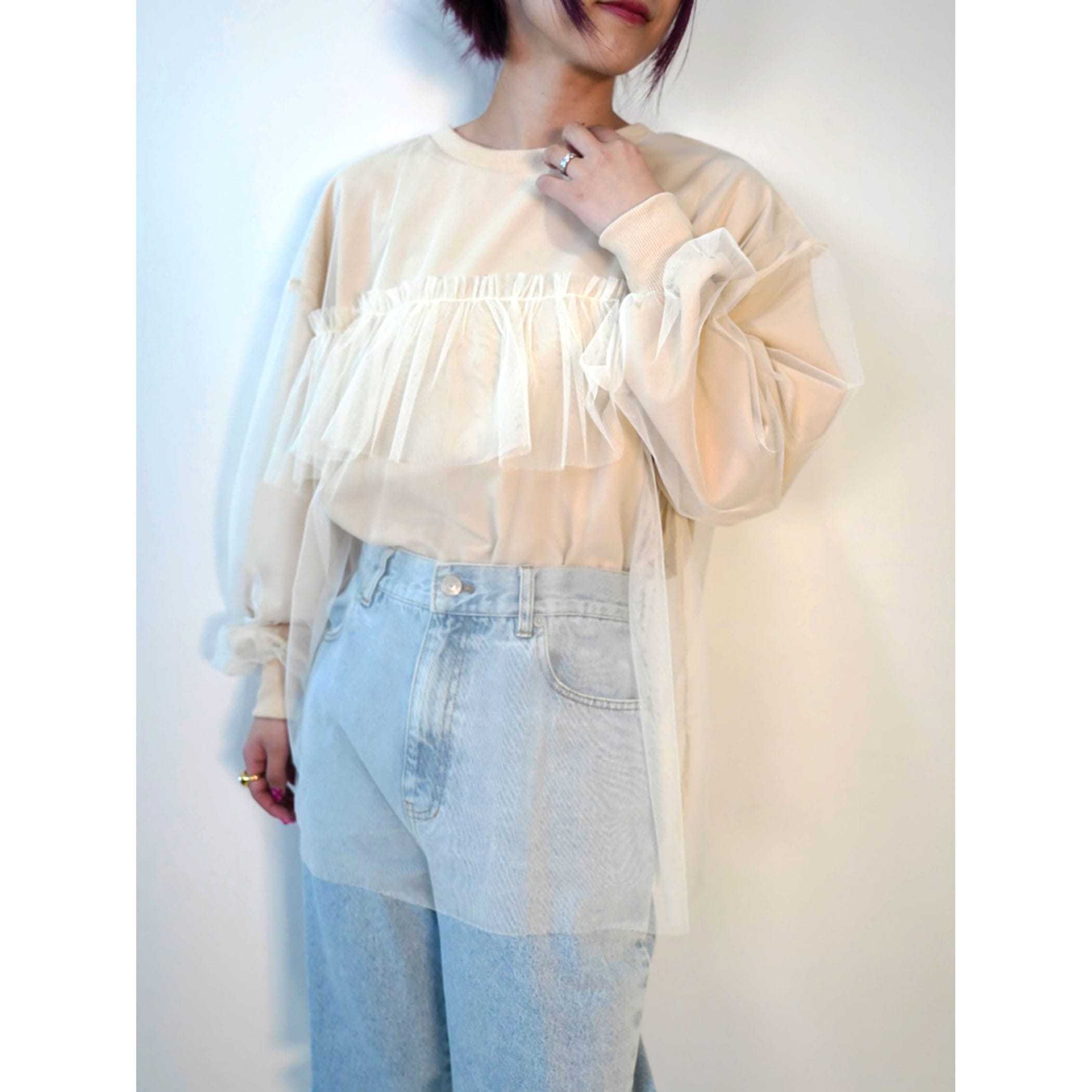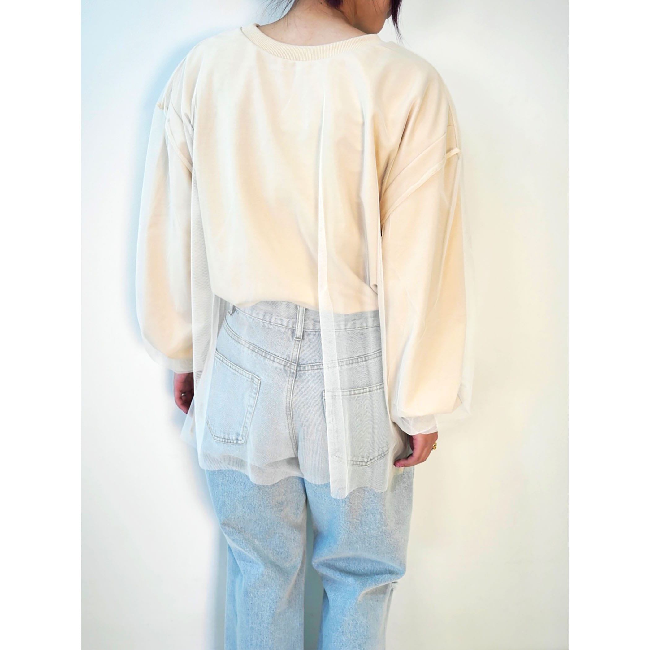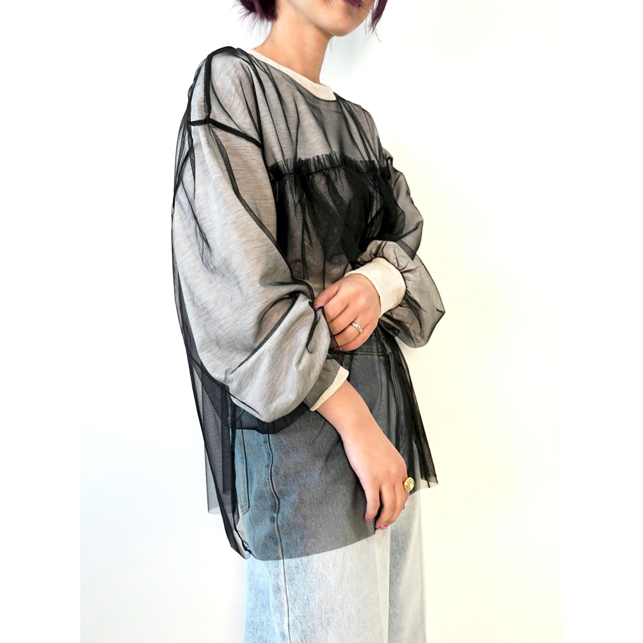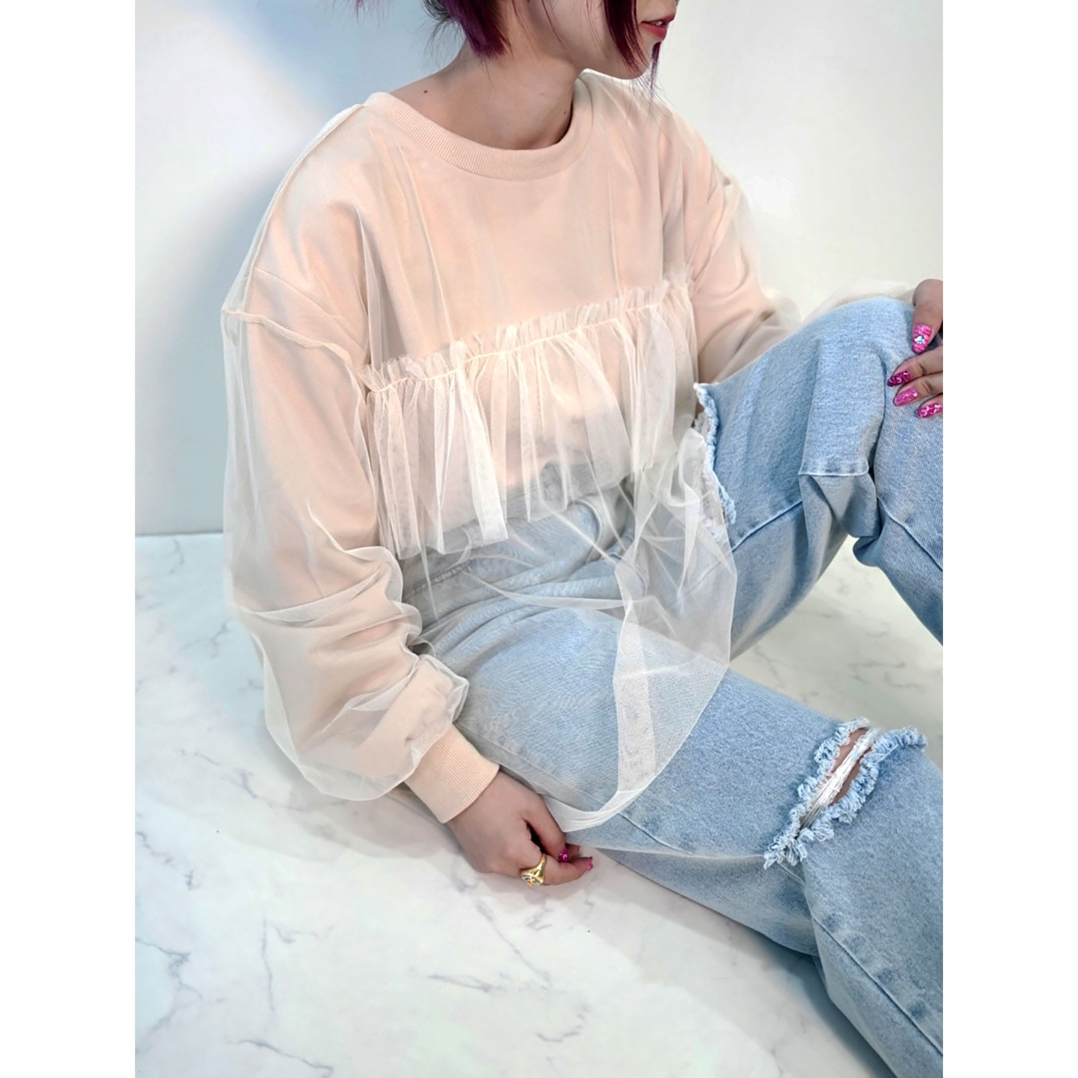 今期トレンドのチュールをレイヤードさせた一枚で存在感のあるプルオーバー。一枚で着映えするデザインなので、シンプルなボトム合わせがオススメです!スカートと合わせてフェミニンに、デニムと合わせてカジュアルなスタイリングも楽しんでいただけます☆