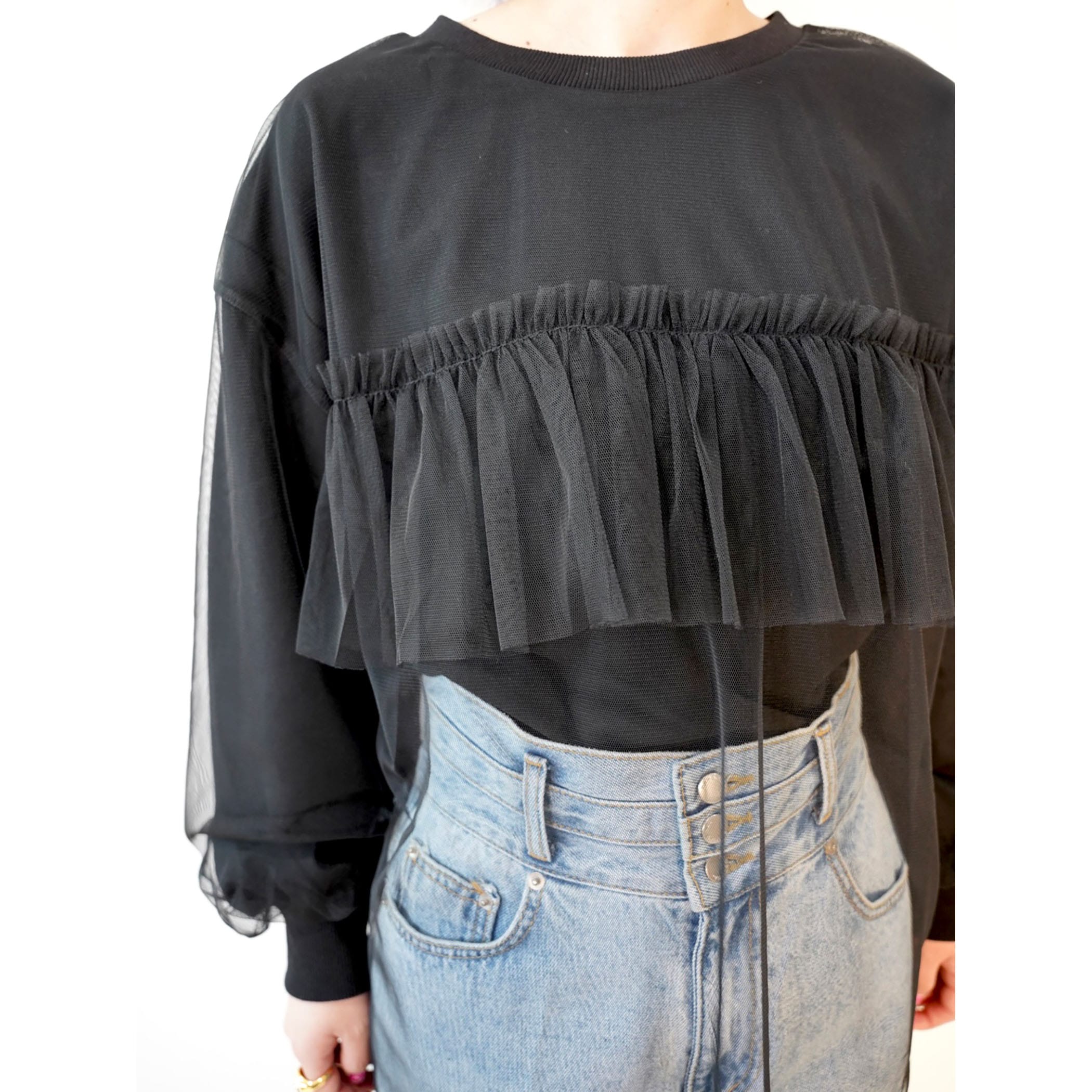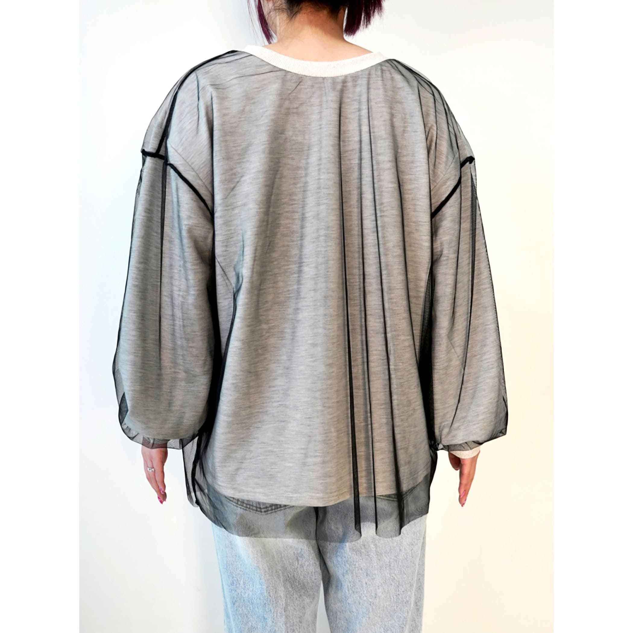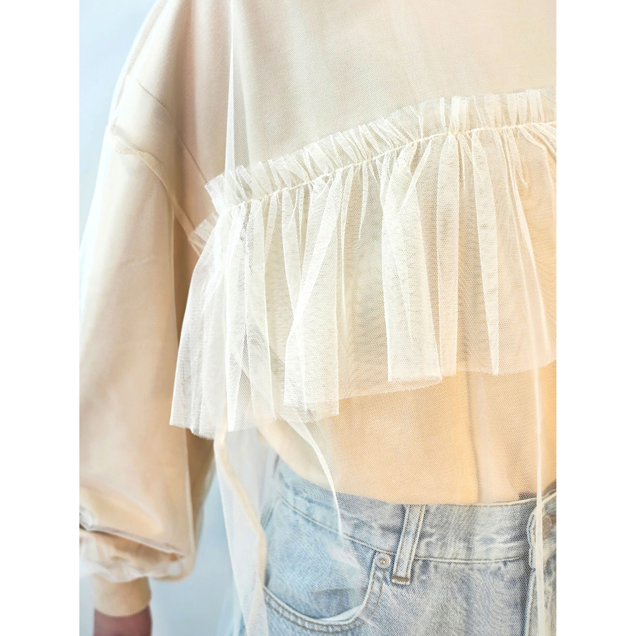 今期トレンドのチュールをレイヤードさせた一枚で存在感のあるプルオーバー。一枚で着映えするデザインなので、シンプルなボトム合わせがオススメです!スカートと合わせてフェミニンに、デニムと合わせてカジュアルなスタイリングも楽しんでいただけます☆