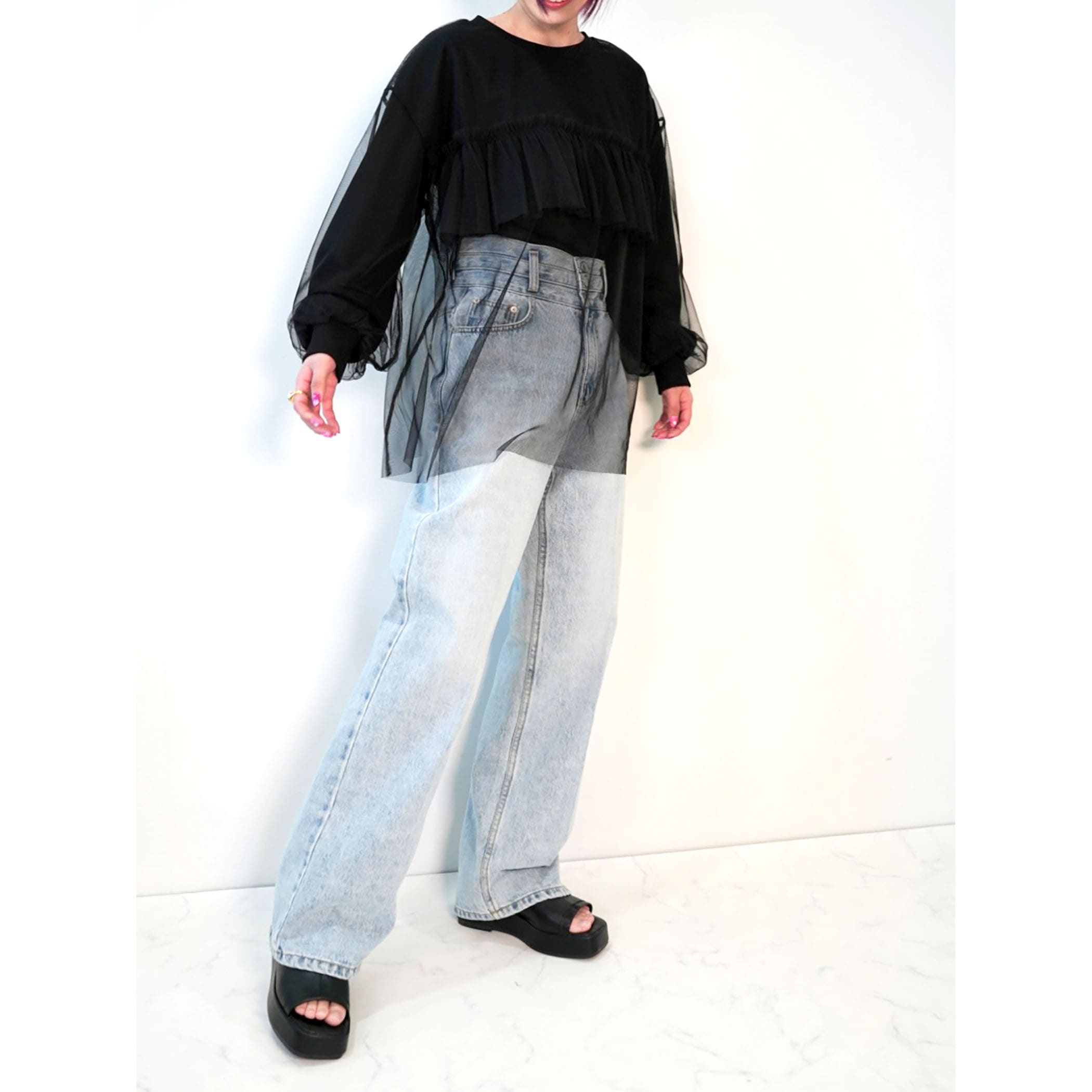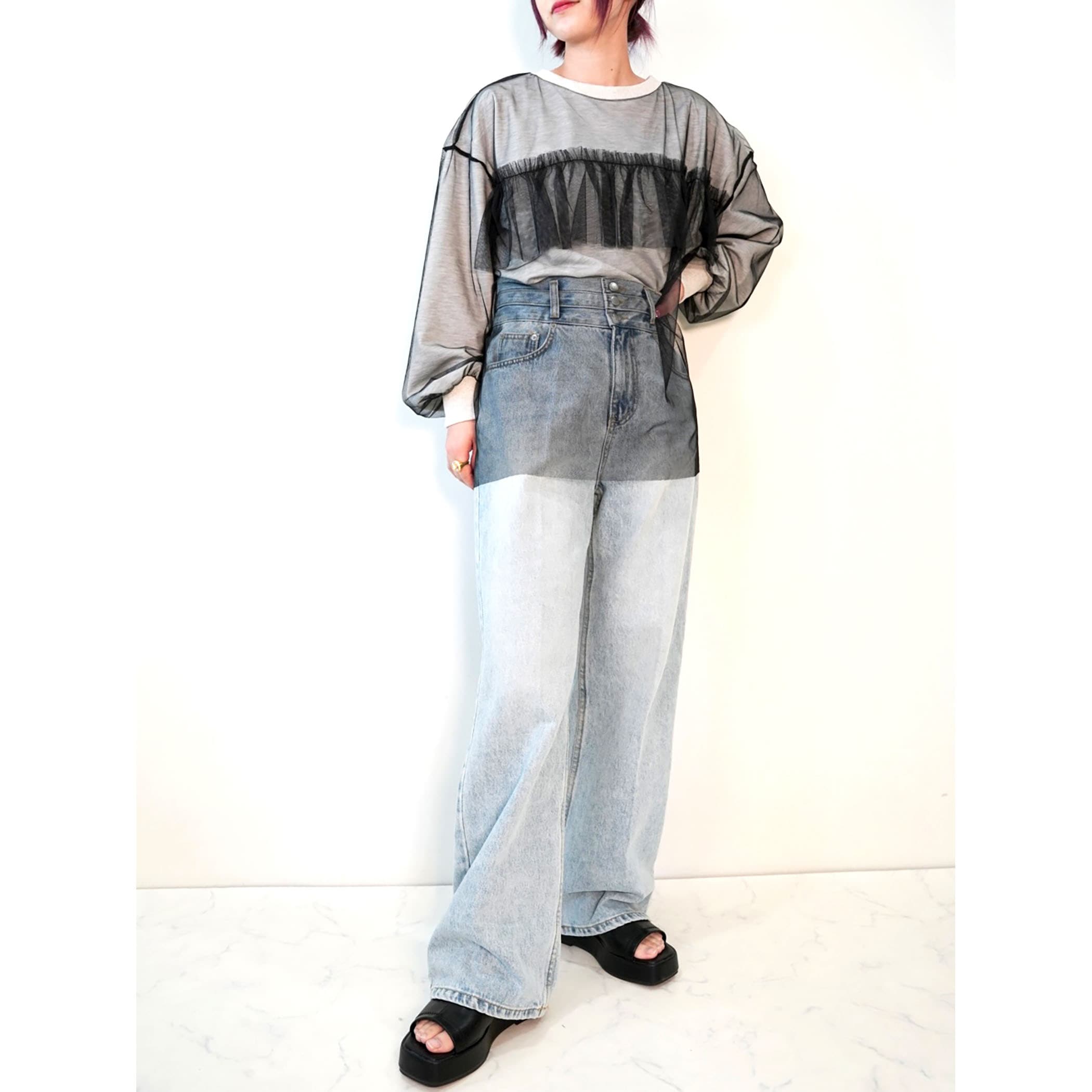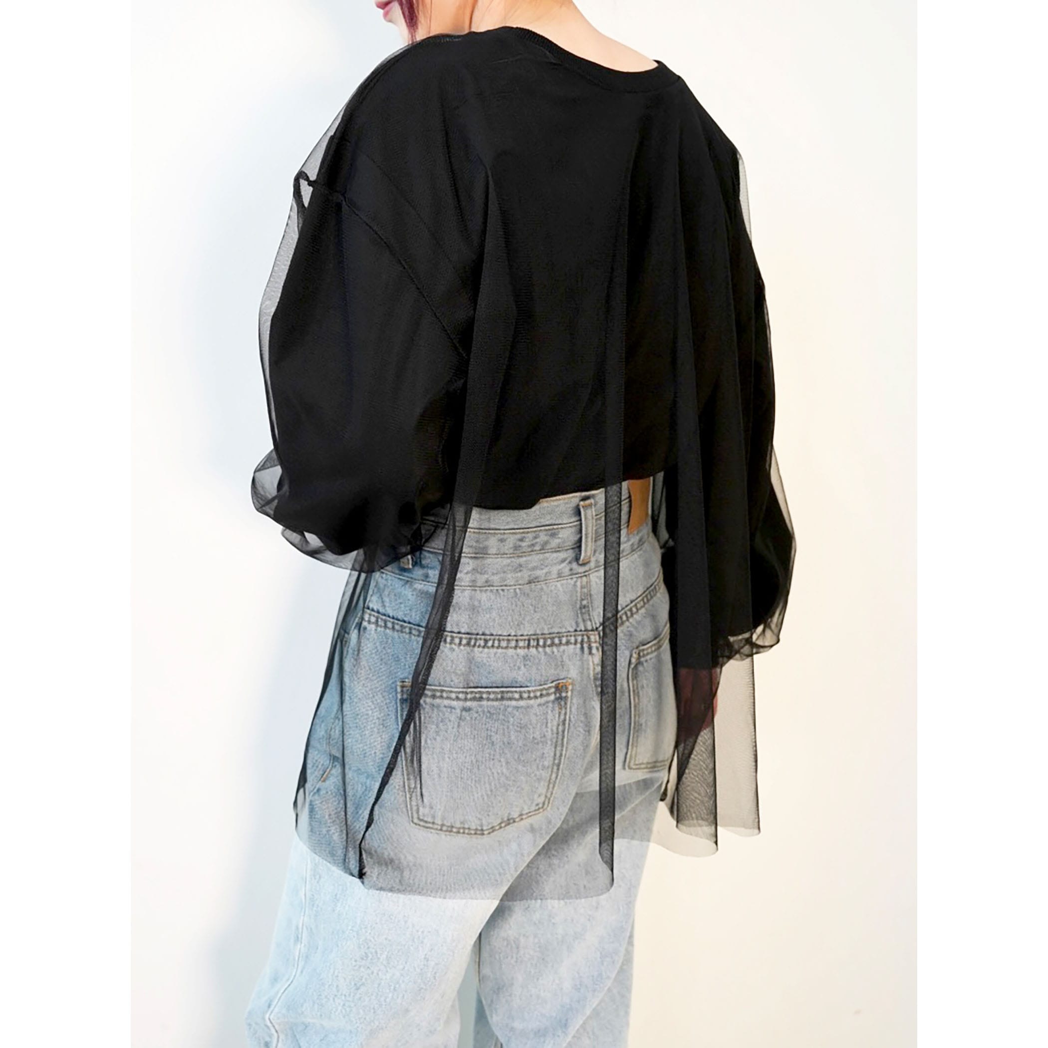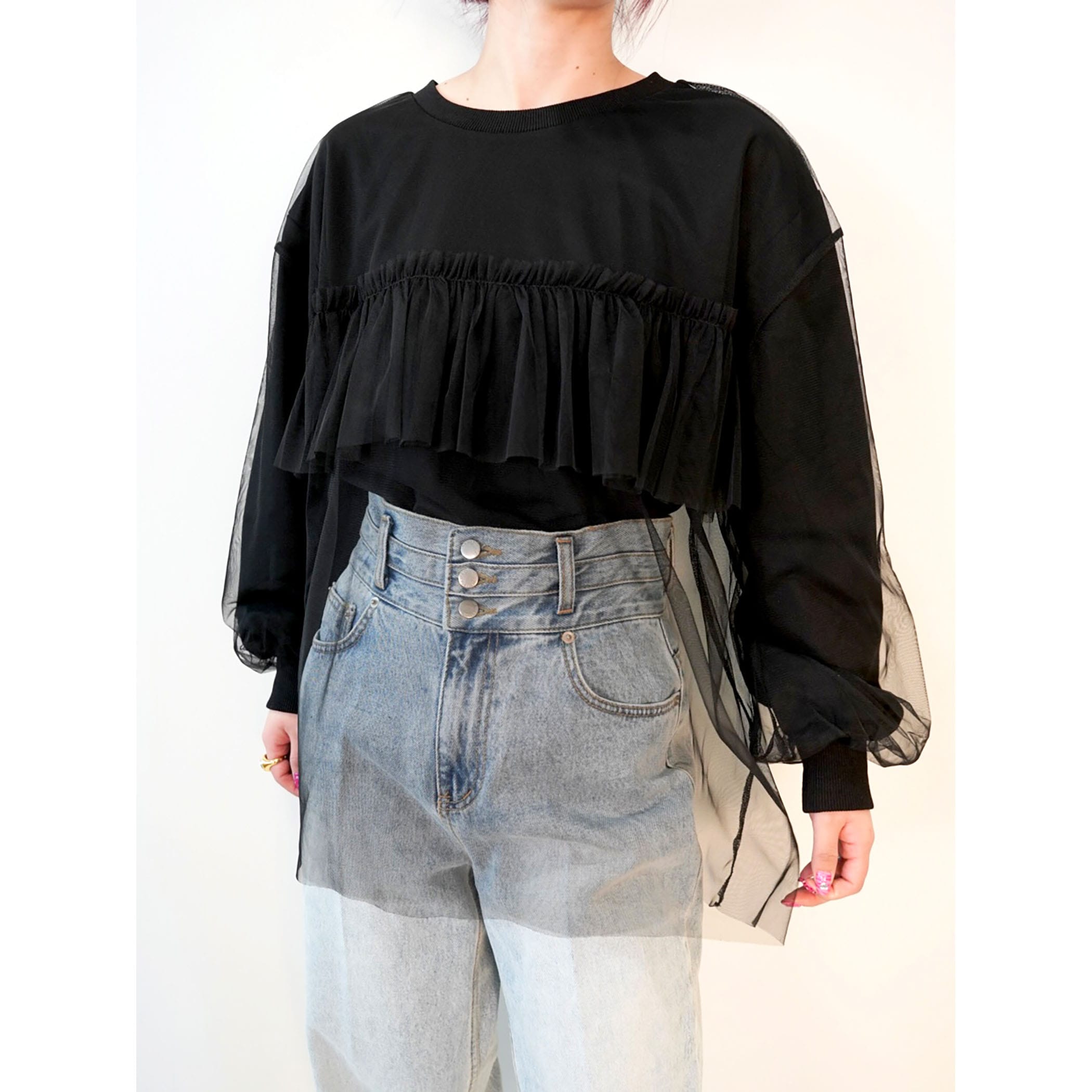 今期トレンドのチュールをレイヤードさせた一枚で存在感のあるプルオーバー。一枚で着映えするデザインなので、シンプルなボトム合わせがオススメです!スカートと合わせてフェミニンに、デニムと合わせてカジュアルなスタイリングも楽しんでいただけます☆