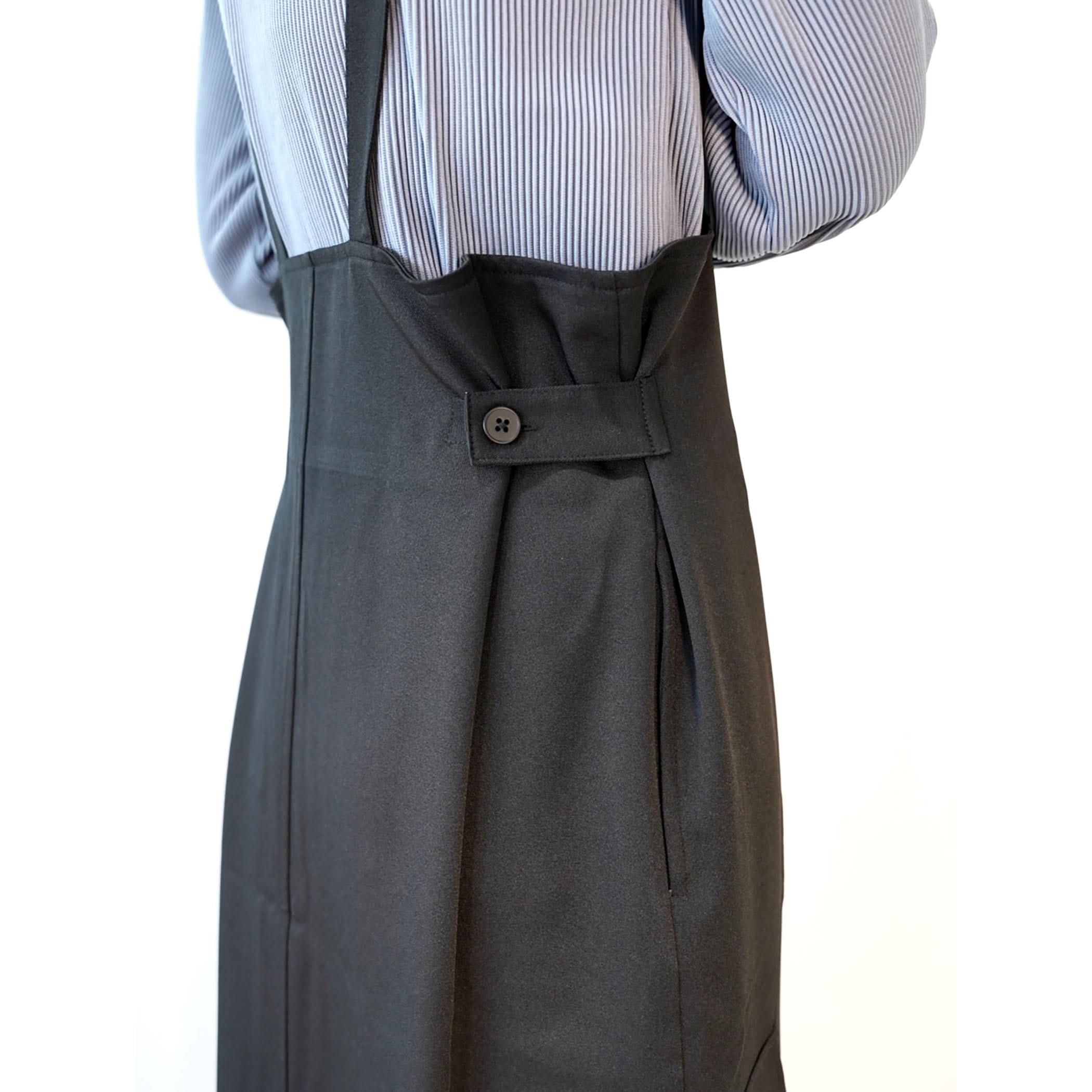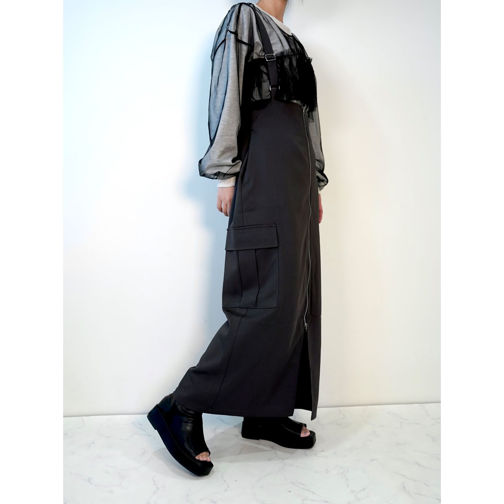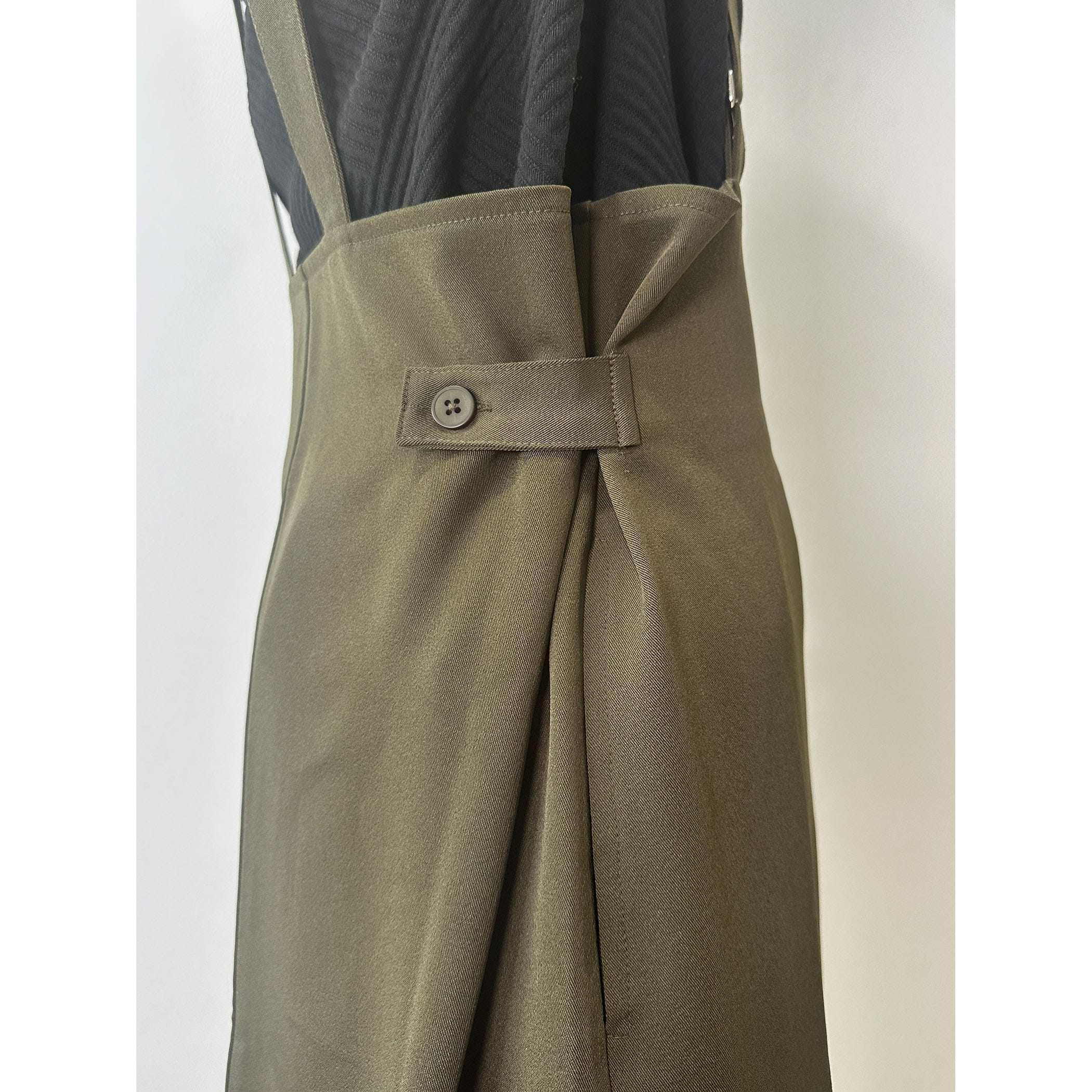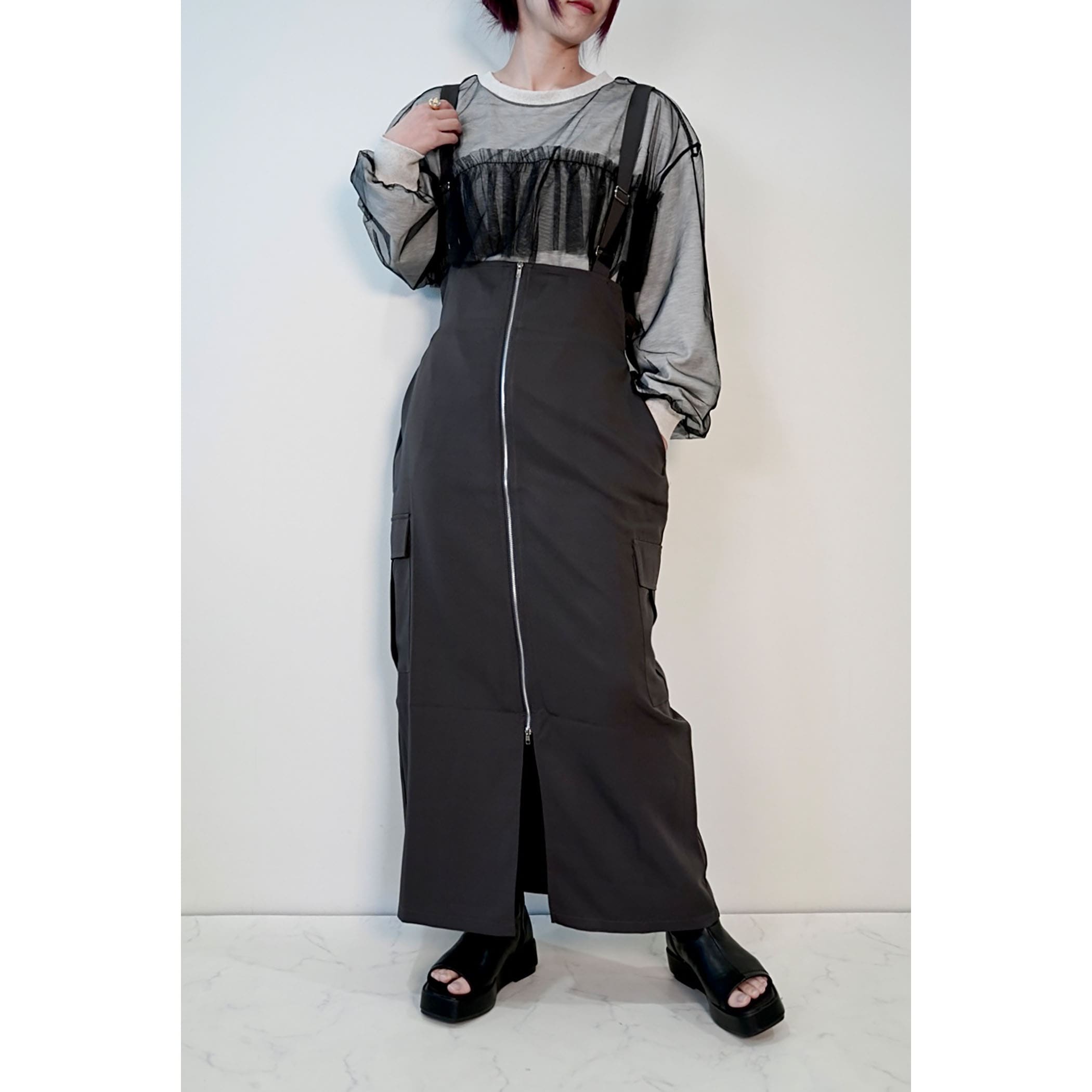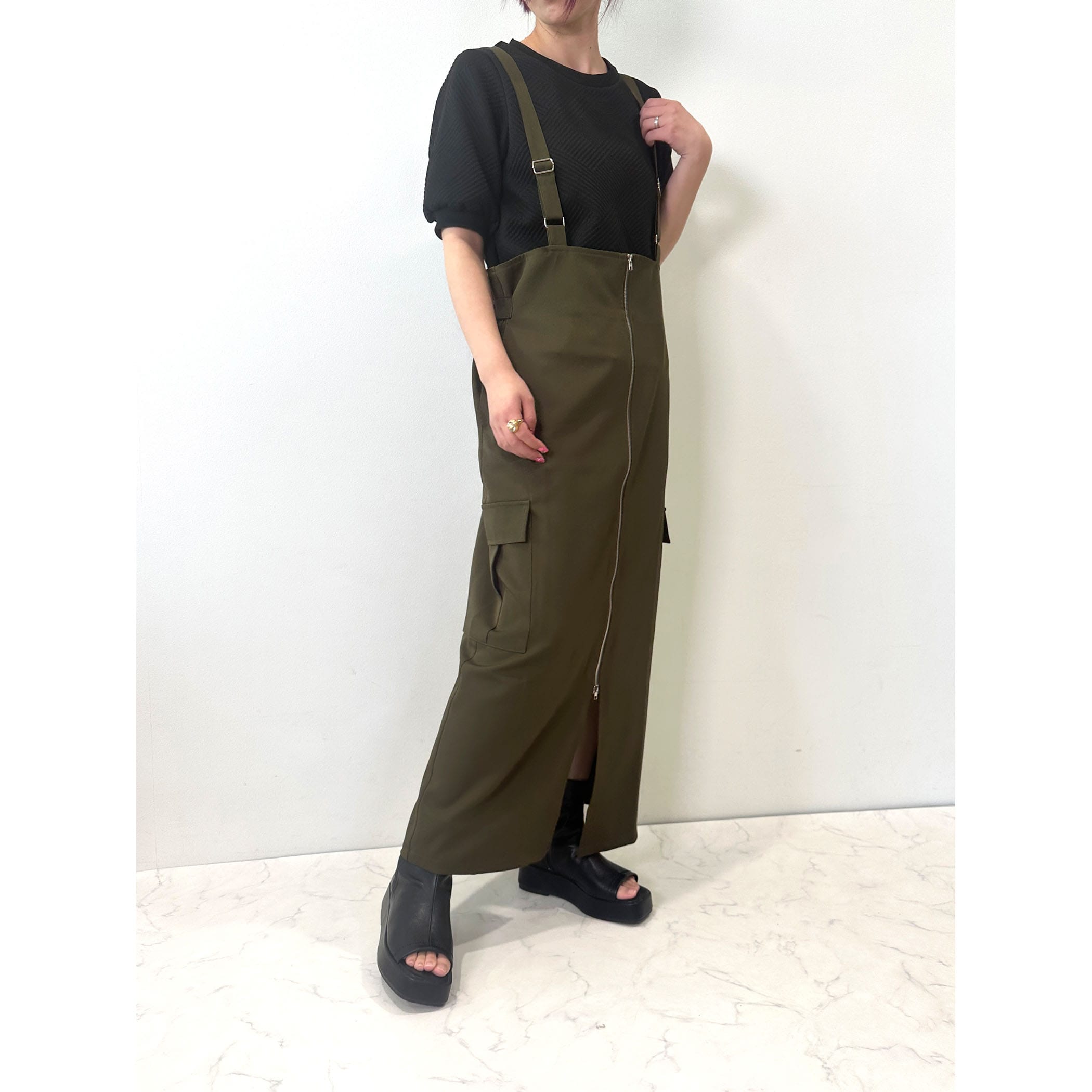 フロントジップとベルトショルダーがアクセントになった、ジャンスカワンピース。すとんと落ちるIラインのストレートシルエットでタイトそうに見えて、ゆったりめのデザインなので、体型を拾いにくくリラクシングな雰囲気で着ていただけます。春先からロンtやハイネックのカットソーなどレイヤードして着ていただくことができます。夏はタンクトップやキャミソールと合わせて、1枚あると楽にこなれ感のあるコーデが完成するおすすめの1着です。