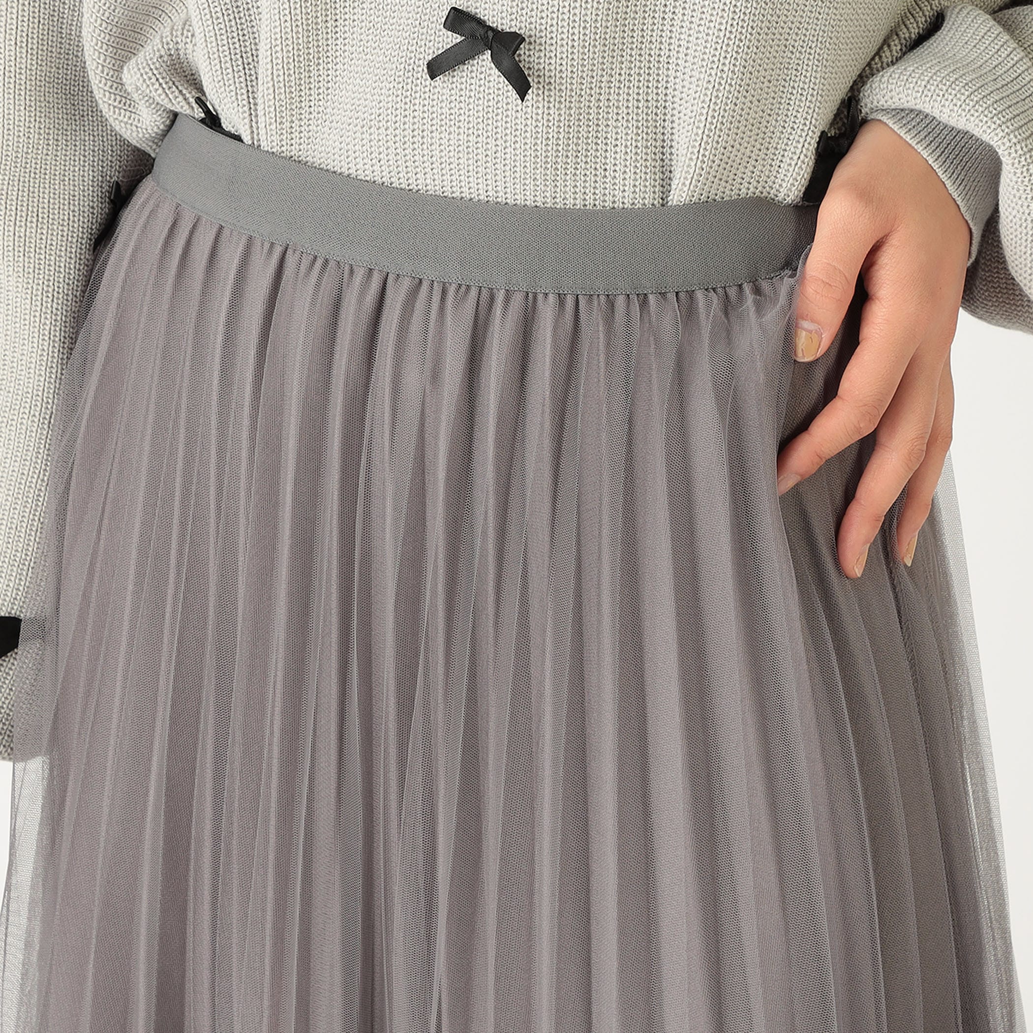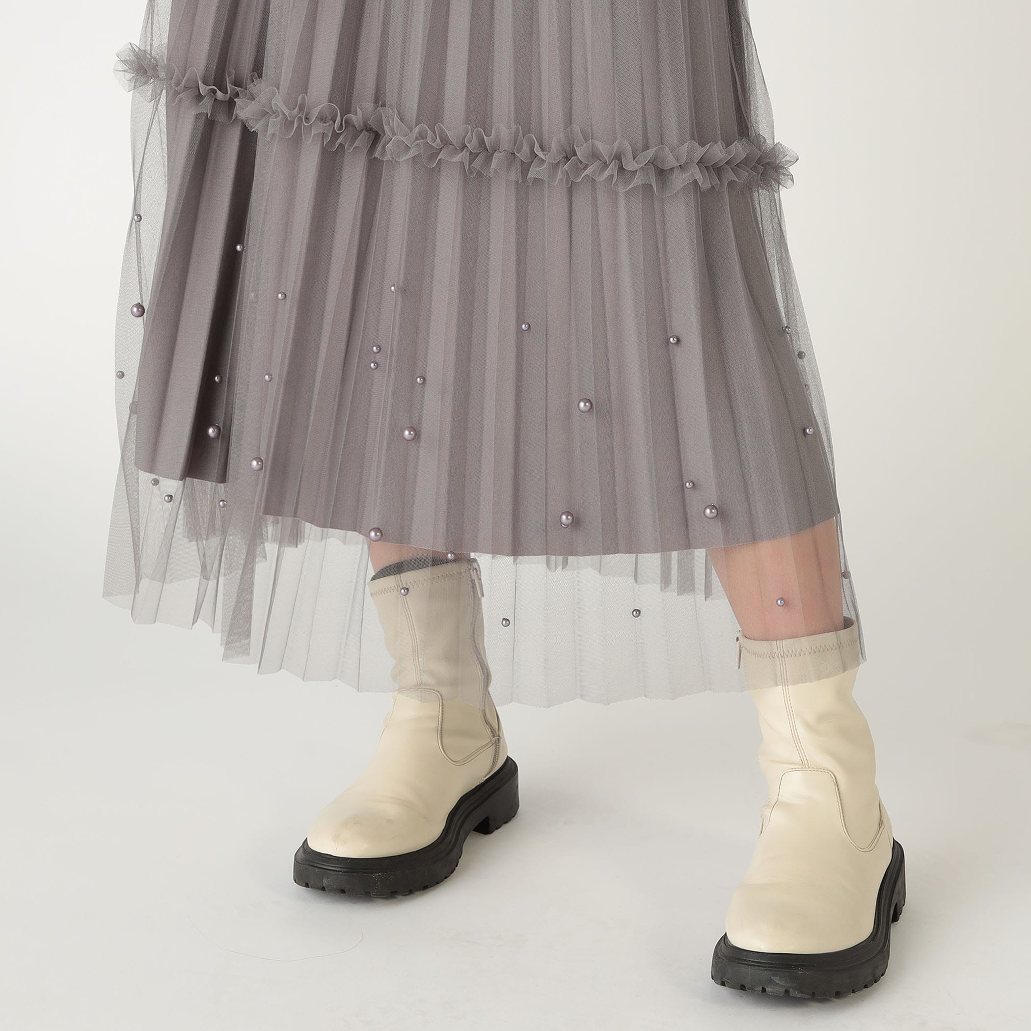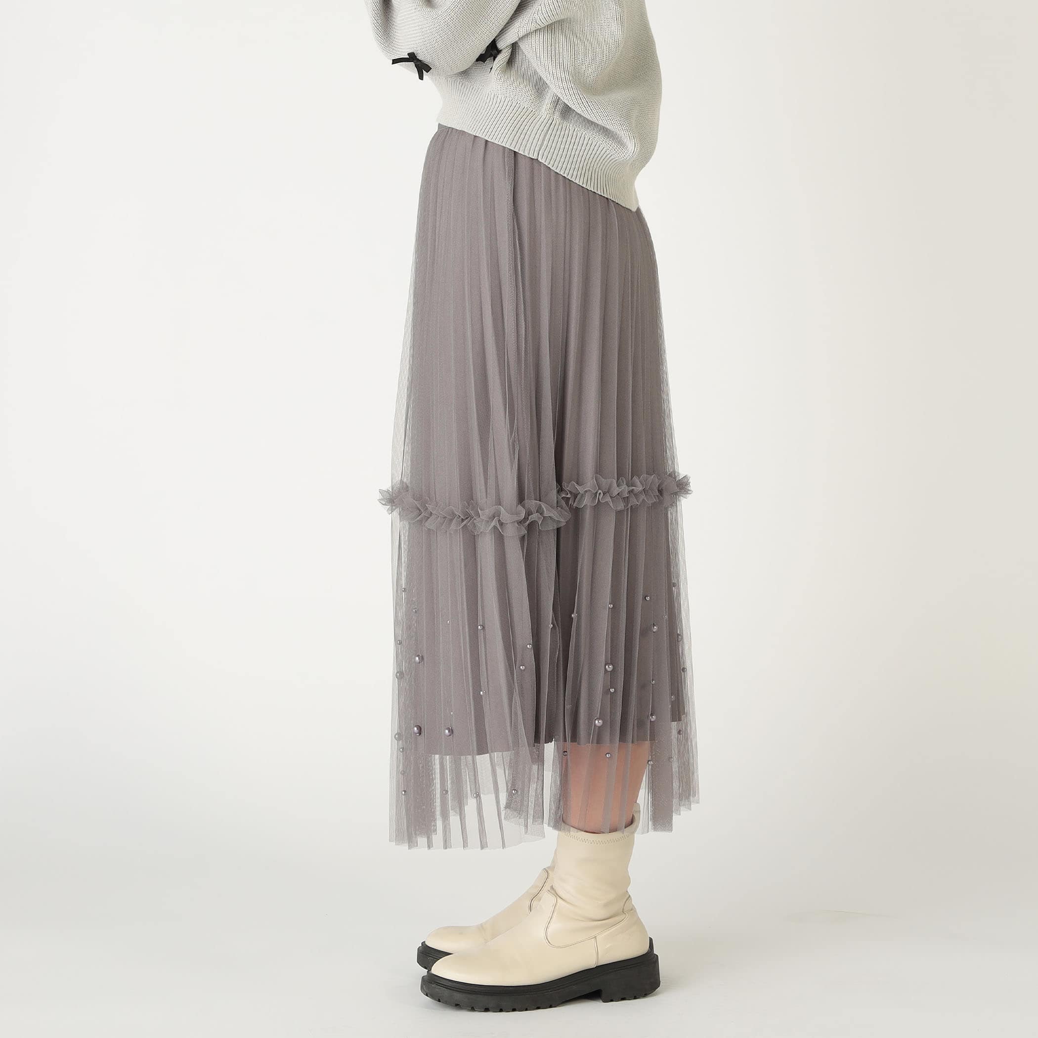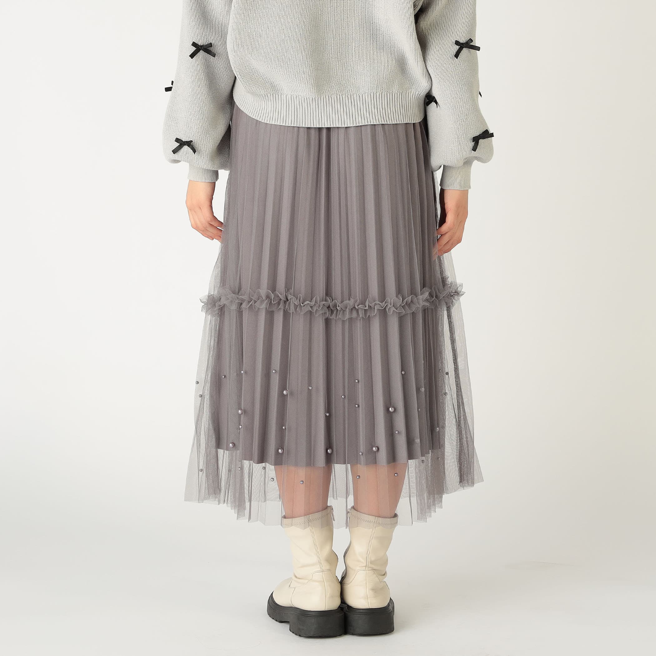 シアーな透け感でエアリーに着映えるチュール生地に上品なパールをたっぷりあしらった、華やかデザイン。程よくふんわりとしたシルエットなのでコンパクトなトップスと相性抜群です。ウエスト後ろがゴム仕様なのでストレスフリーな着心地です。合わせやすくコーデしやすいのに可愛く映える1着です。