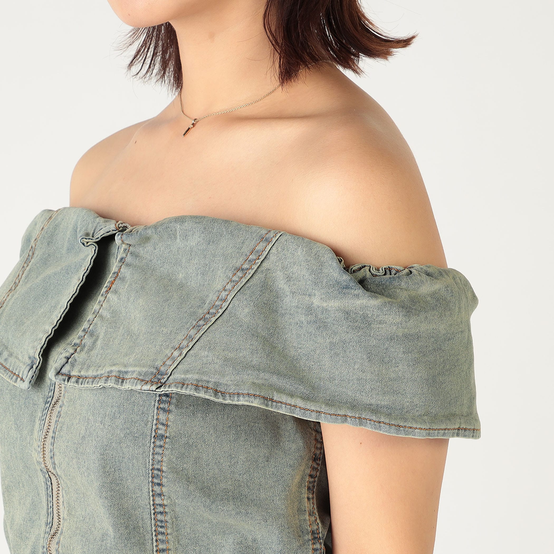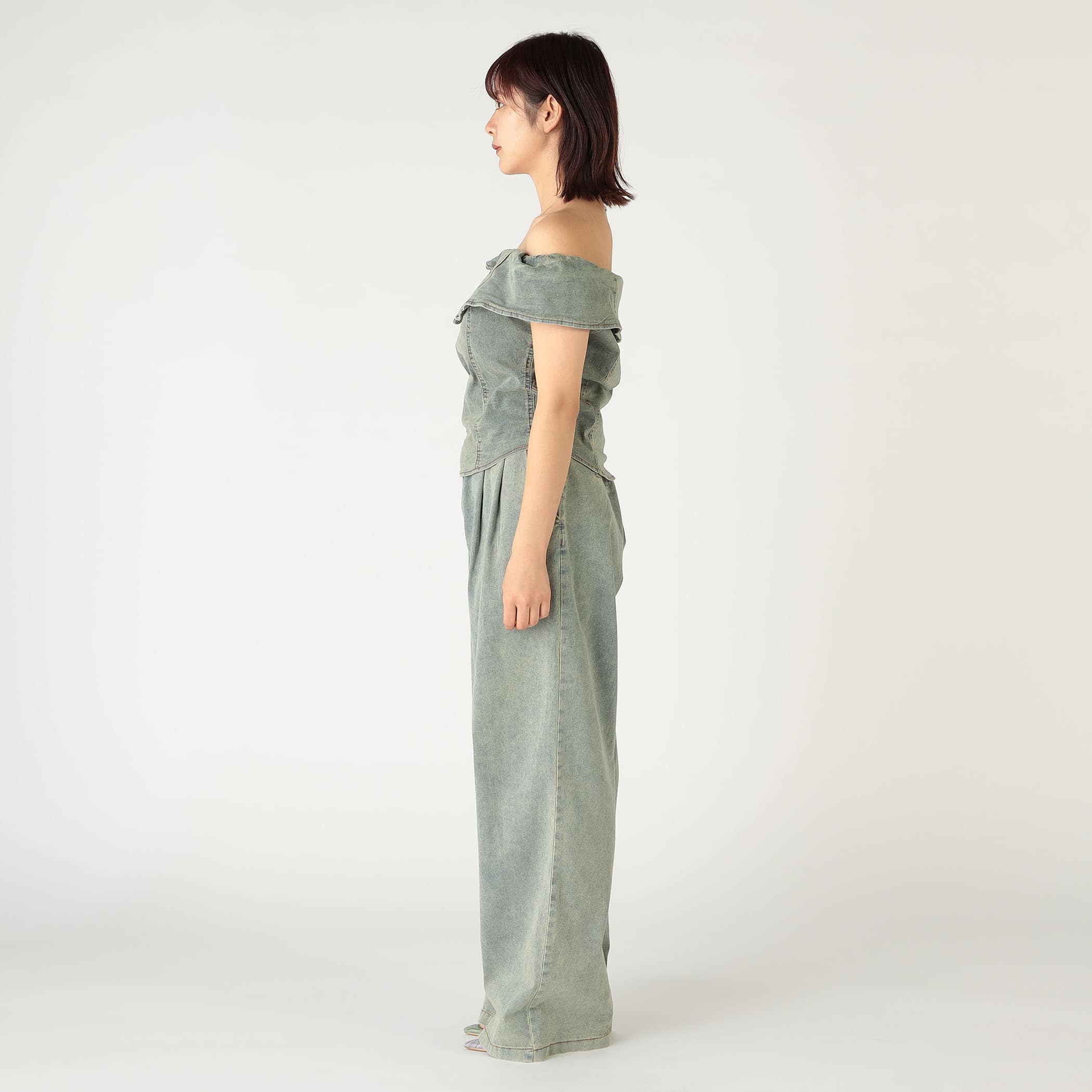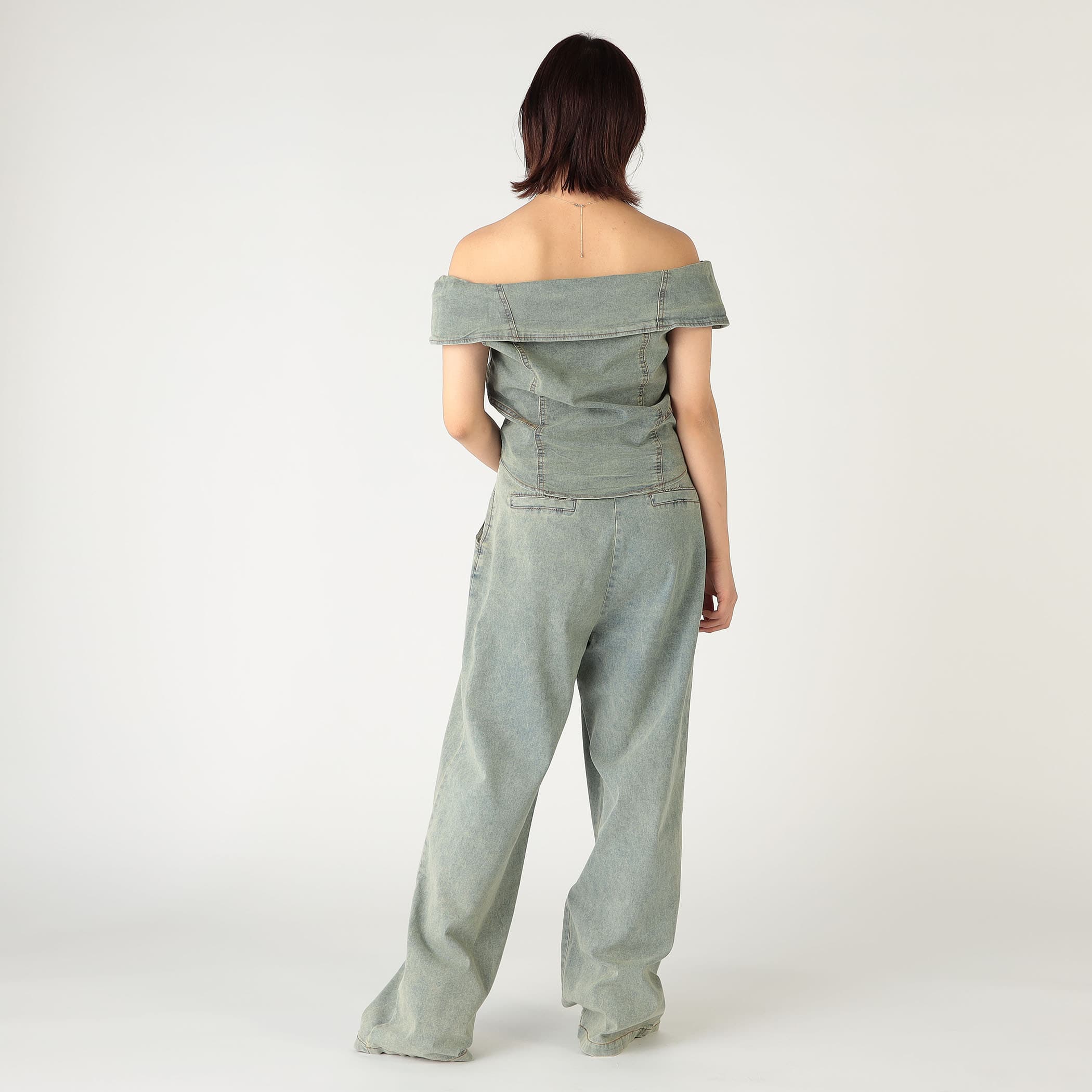 トレンド感漂うセットアップ。デニム素材のトップスとパンツのセットアップで、オフショルダーデザインが女性らしい雰囲気に。ストレッチが効いているので履き心地も抜群です。別々でも着用できるので、幅広いスタイリングが楽しめます。