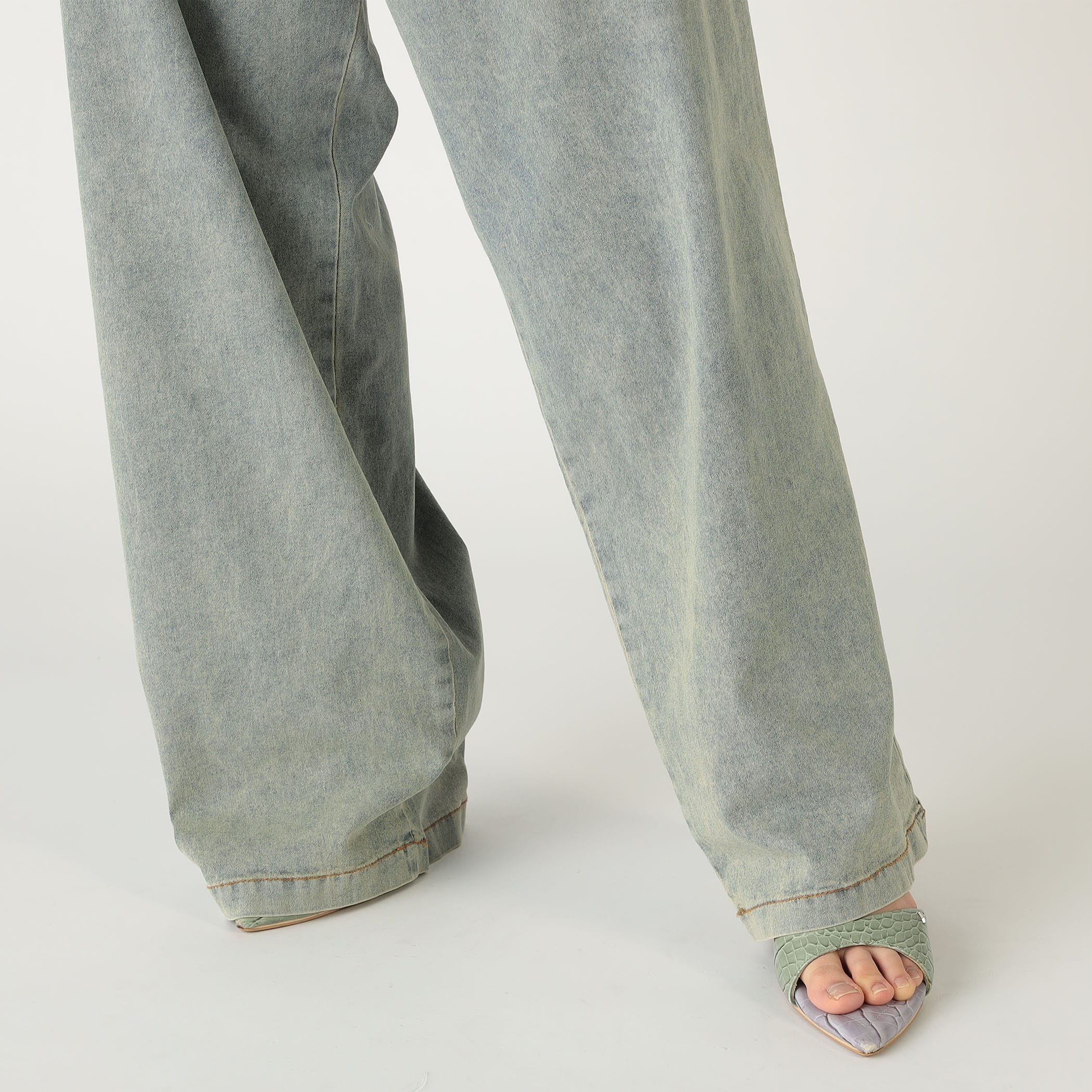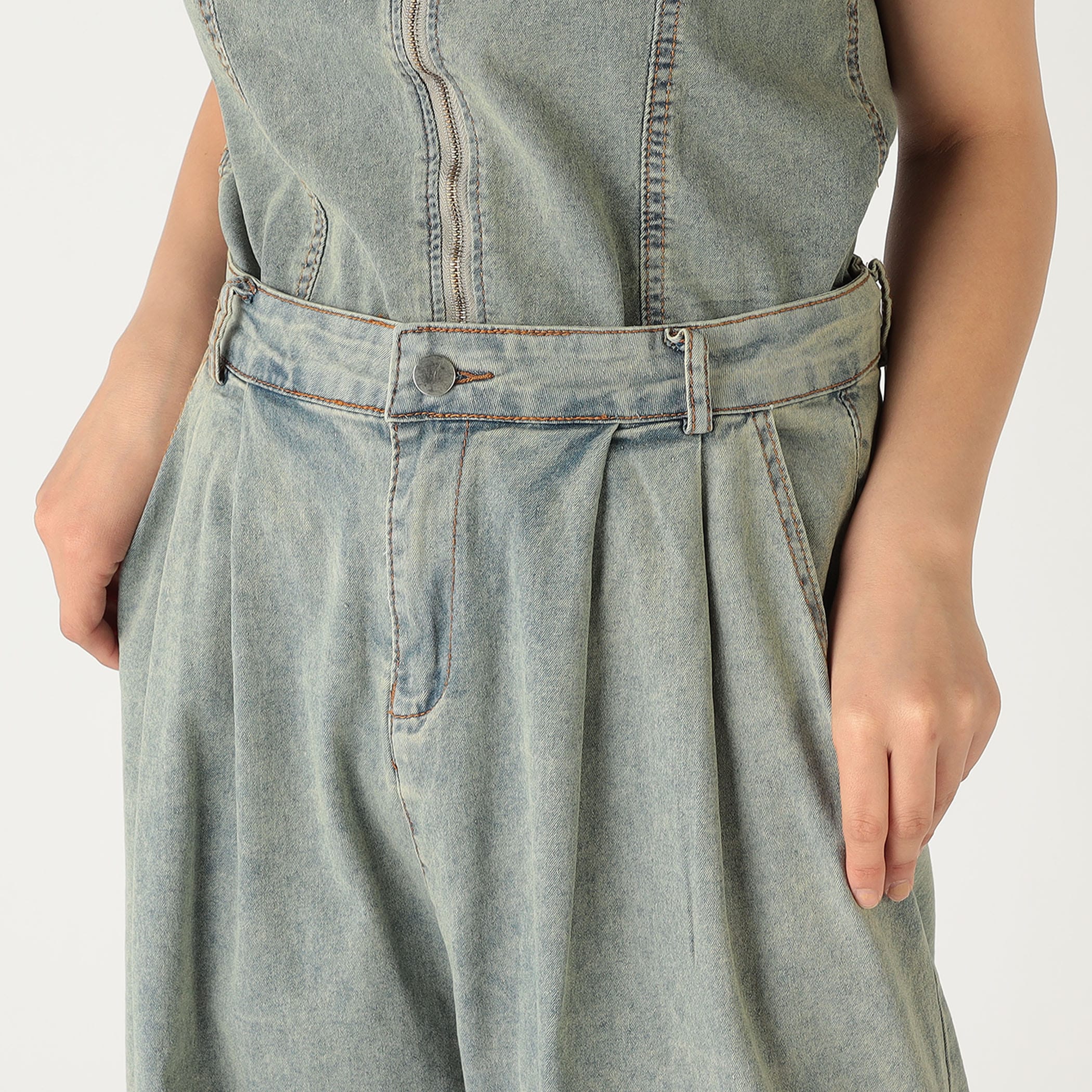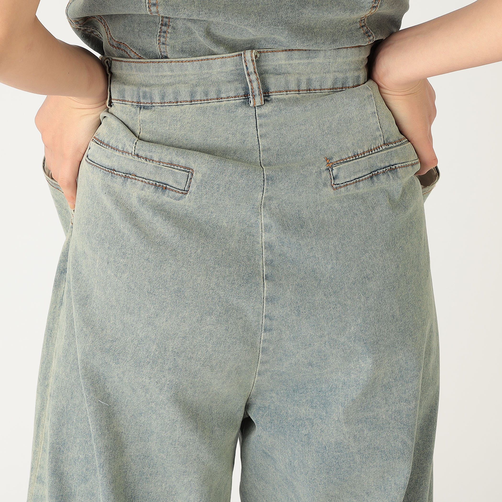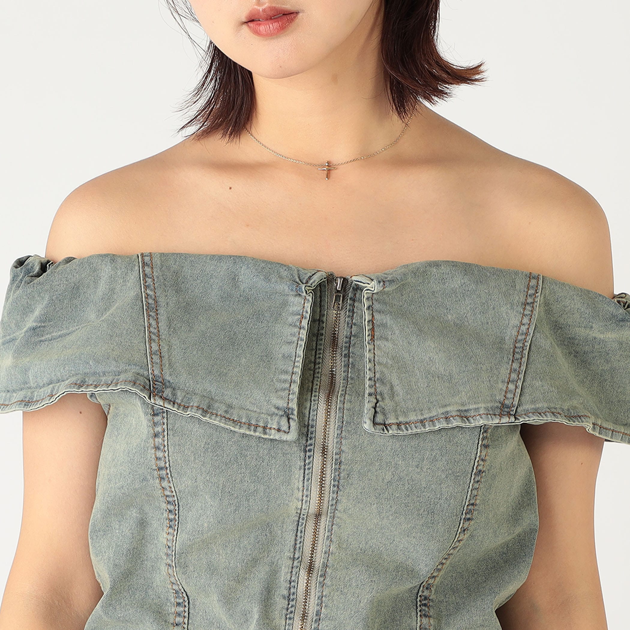 トレンド感漂うセットアップ。デニム素材のトップスとパンツのセットアップで、オフショルダーデザインが女性らしい雰囲気に。ストレッチが効いているので履き心地も抜群です。別々でも着用できるので、幅広いスタイリングが楽しめます。