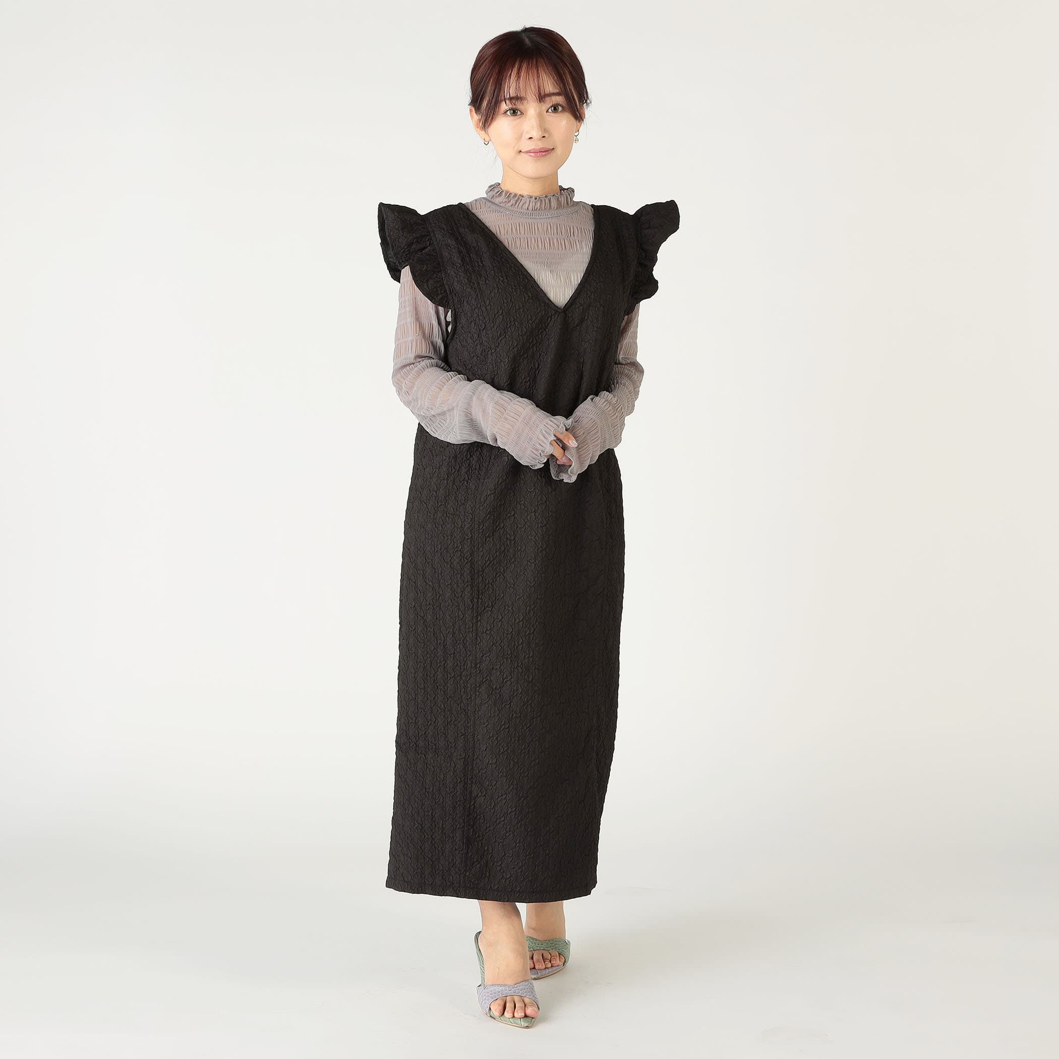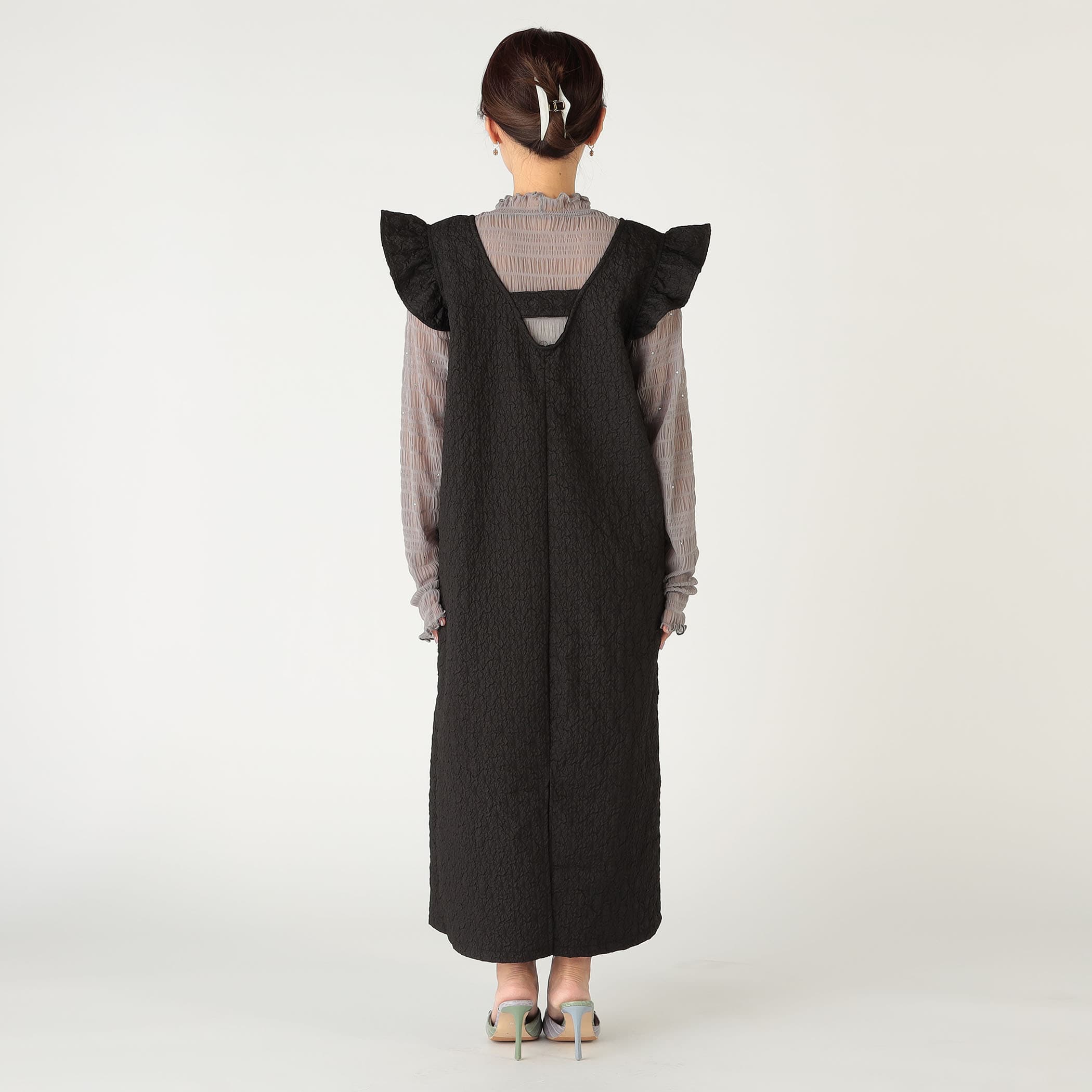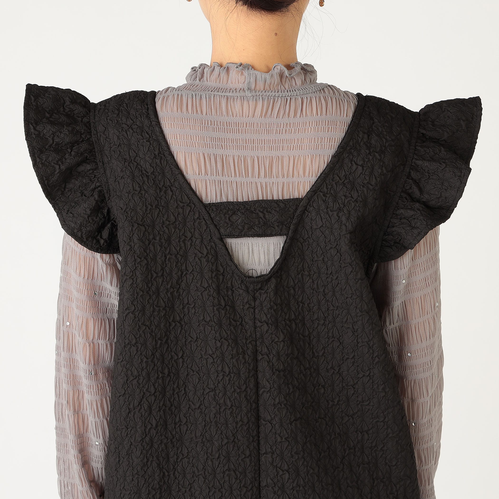 凹凸感のあるエンボス加工が可愛いジャンパースカート。前後のV開きデザインと肩のさりげないフリルが甘くなり過ぎずコーディネートのアクセントに◎後裾にスリットが入っており動きやすいデザインになっています。