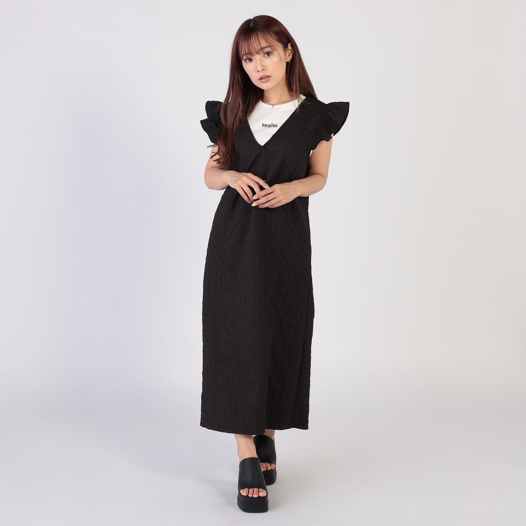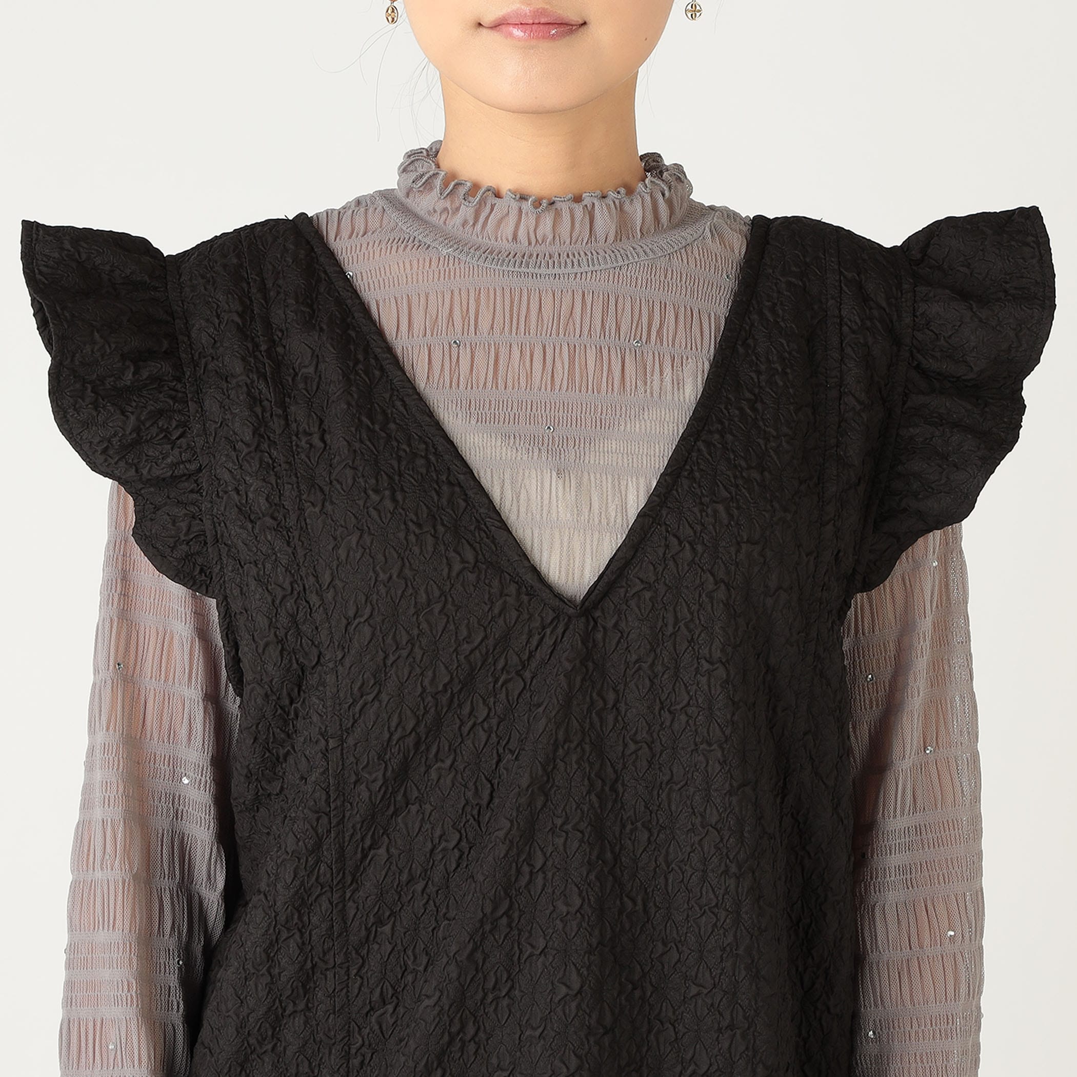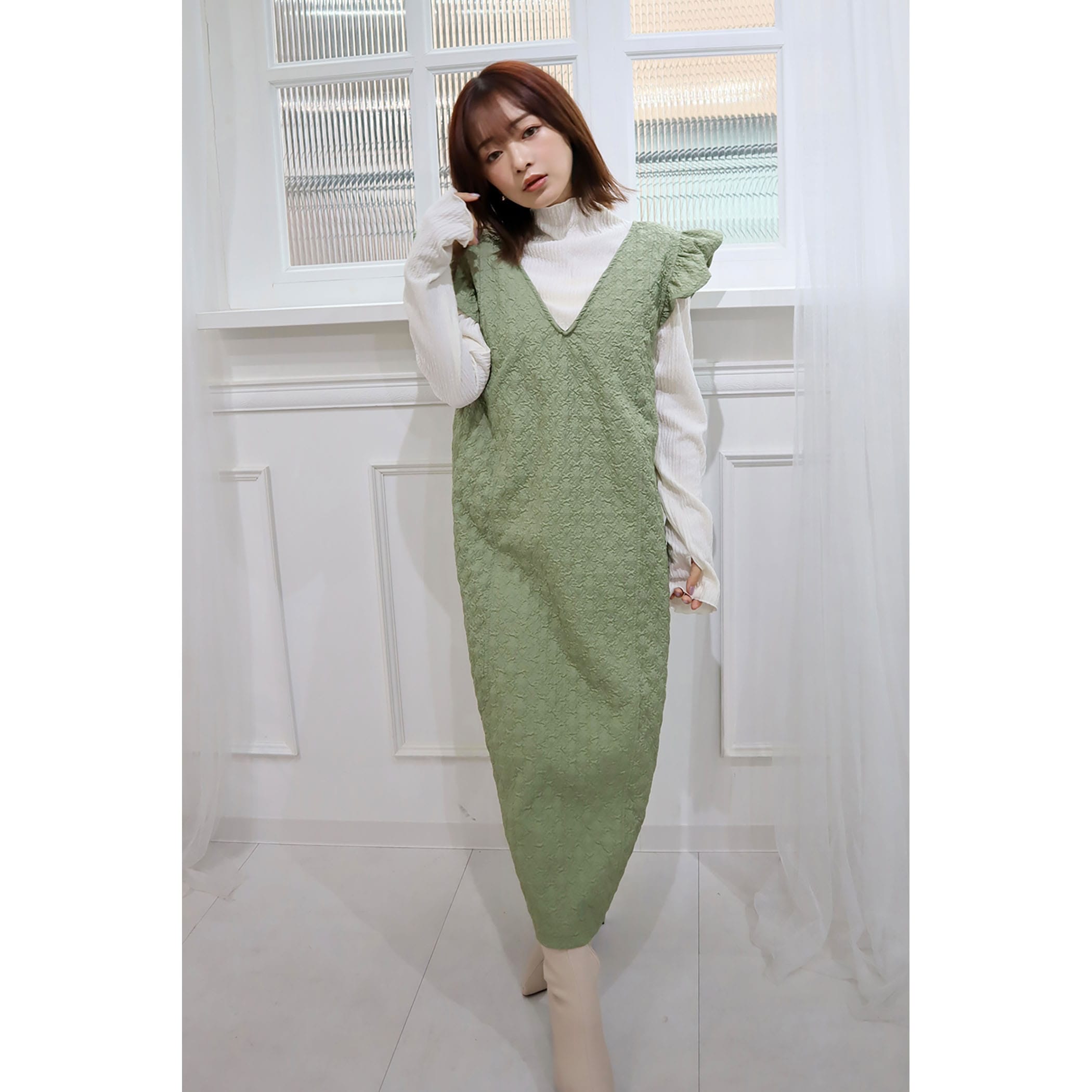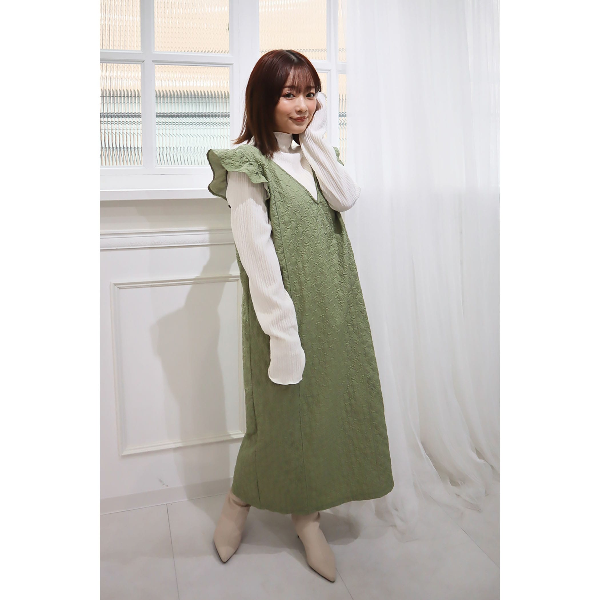凹凸感のあるエンボス加工が可愛いジャンパースカート。前後のV開きデザインと肩のさりげないフリルが甘くなり過ぎずコーディネートのアクセントに◎後裾にスリットが入っており動きやすいデザインになっています。
