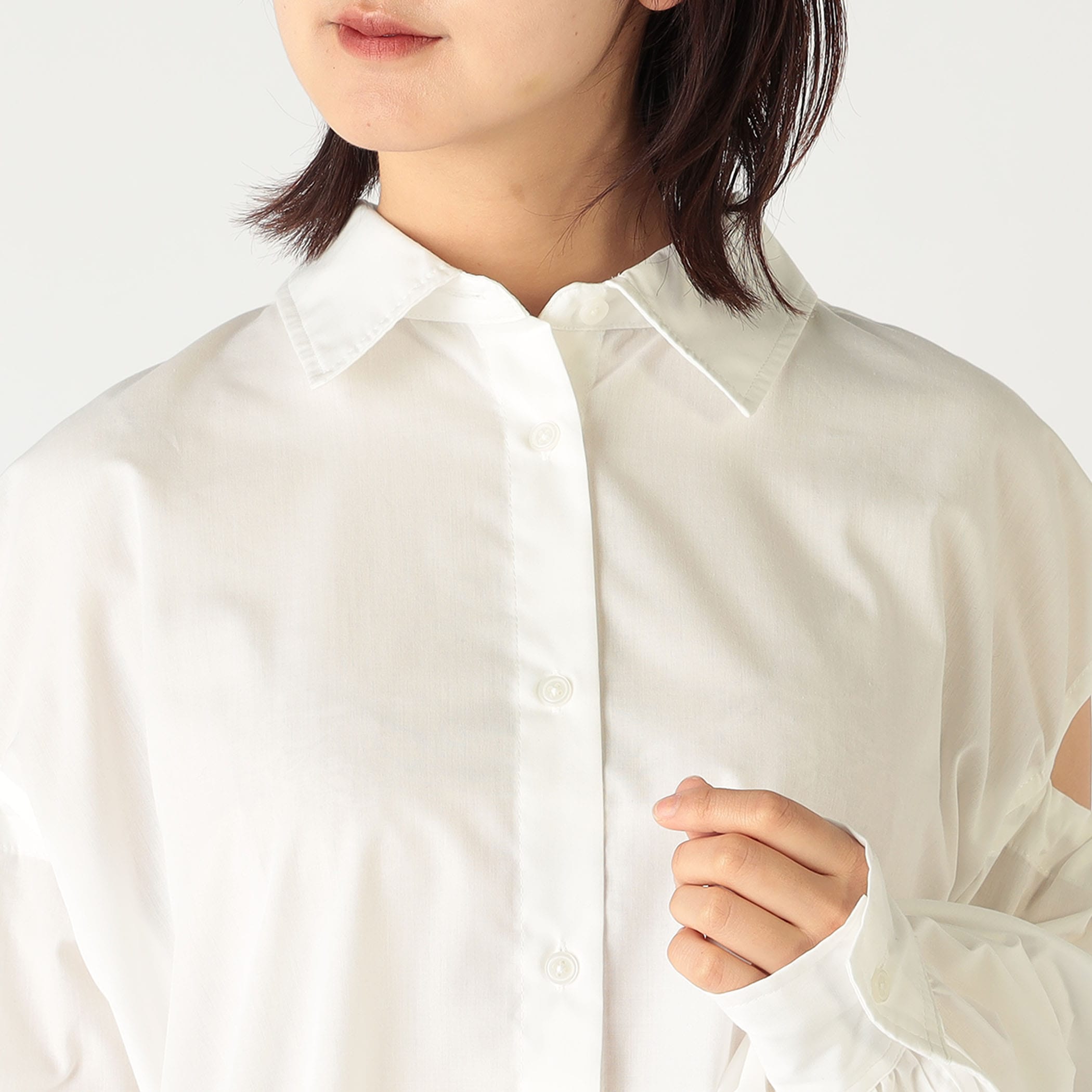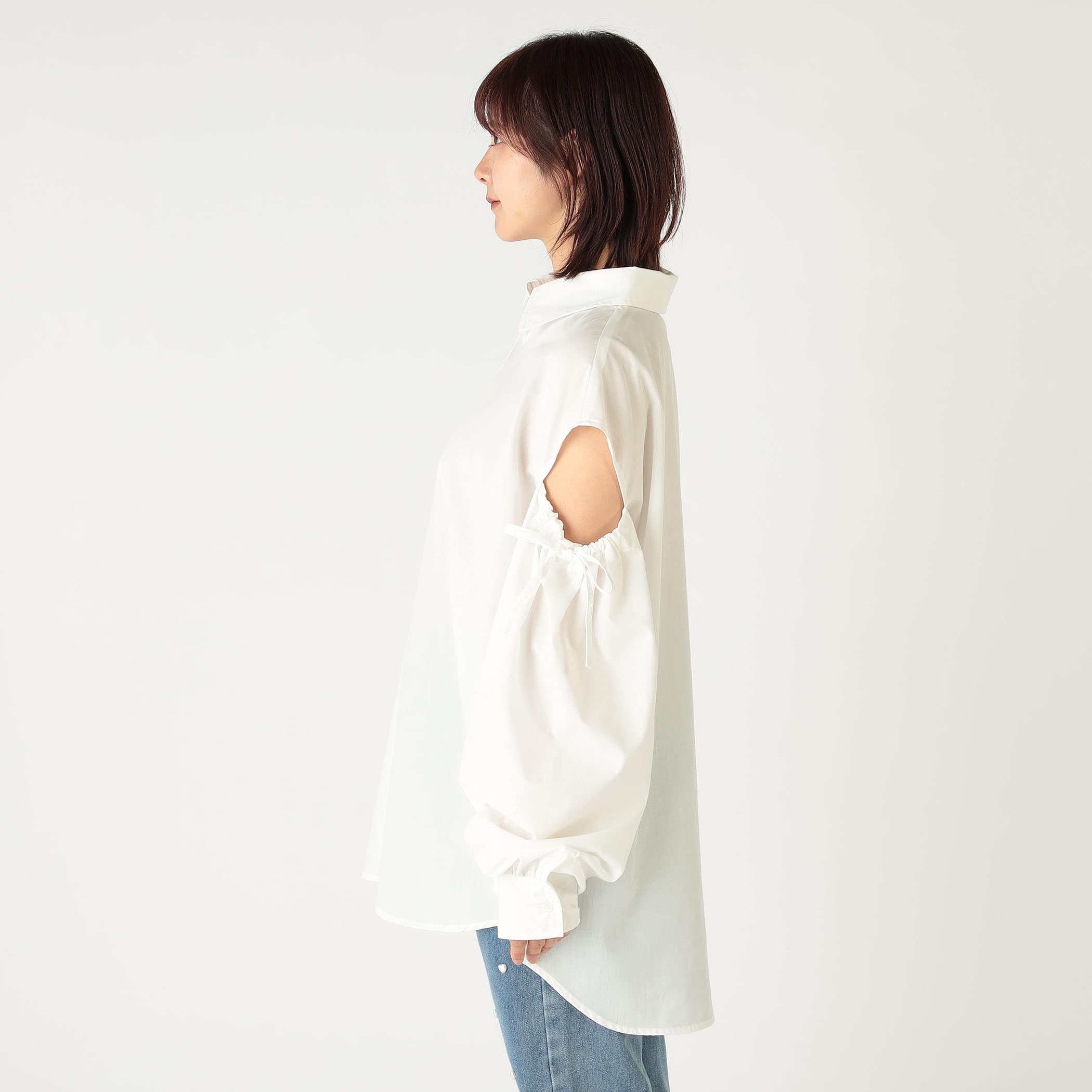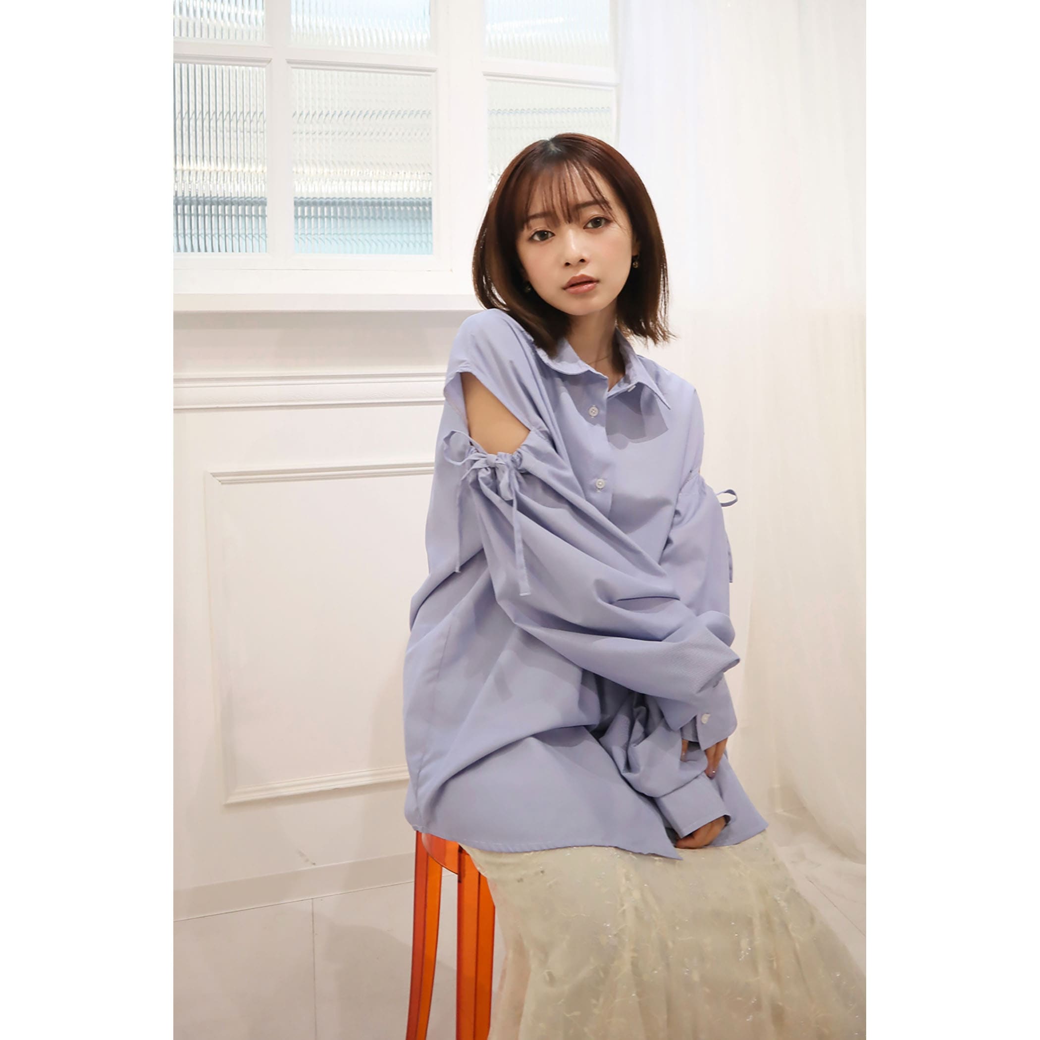 袖開きデザインが今っぽい、ゆるシルエットシャツ。袖開き部分はドロストで調節出来ます。合わせるボトムによって可愛くもクールにもなれる1着☆