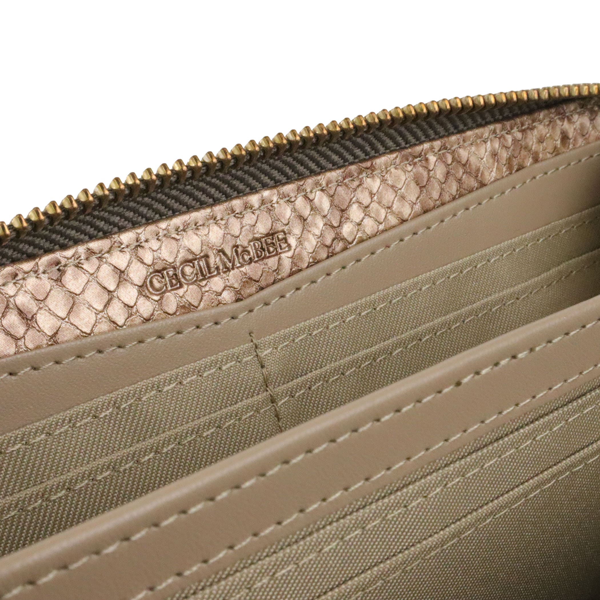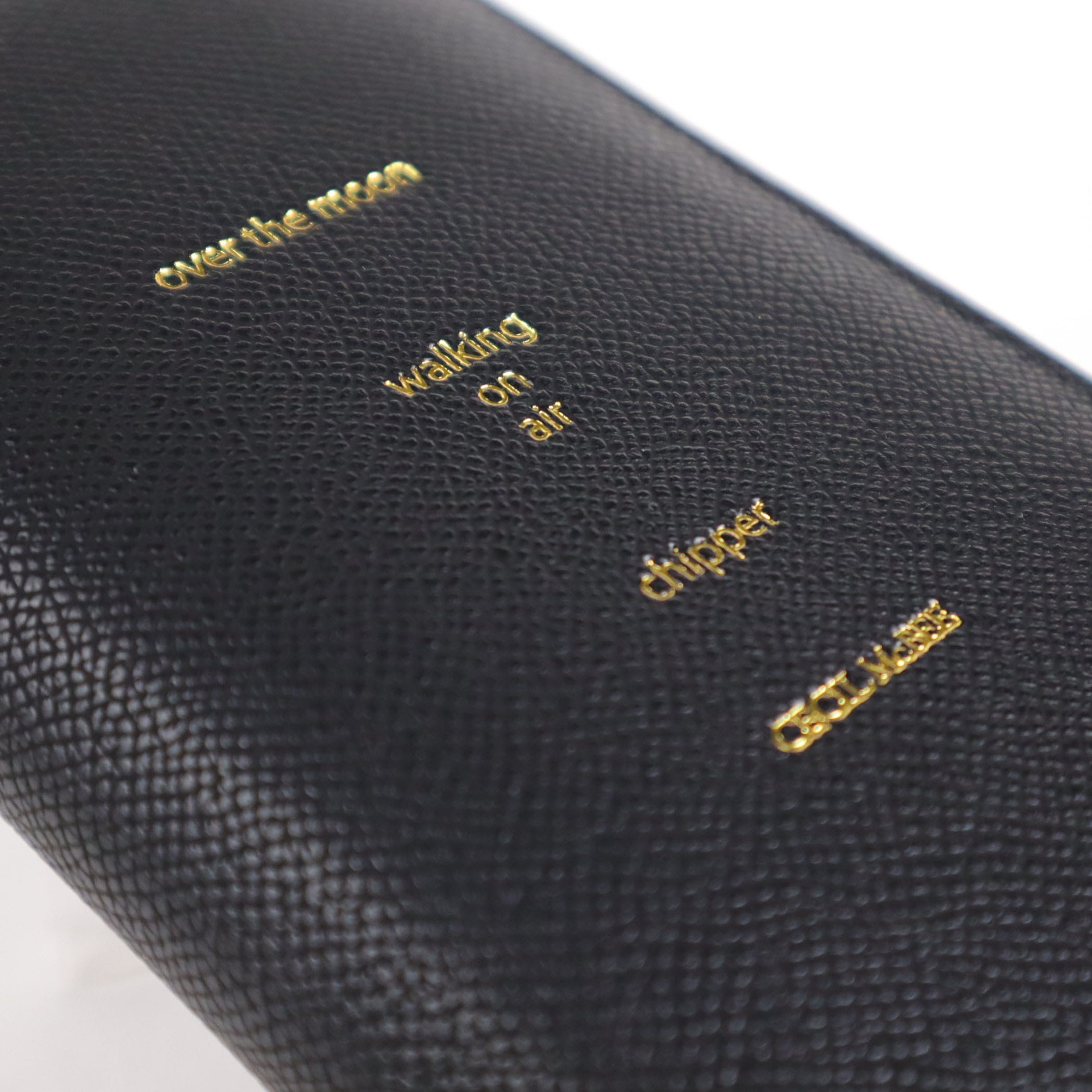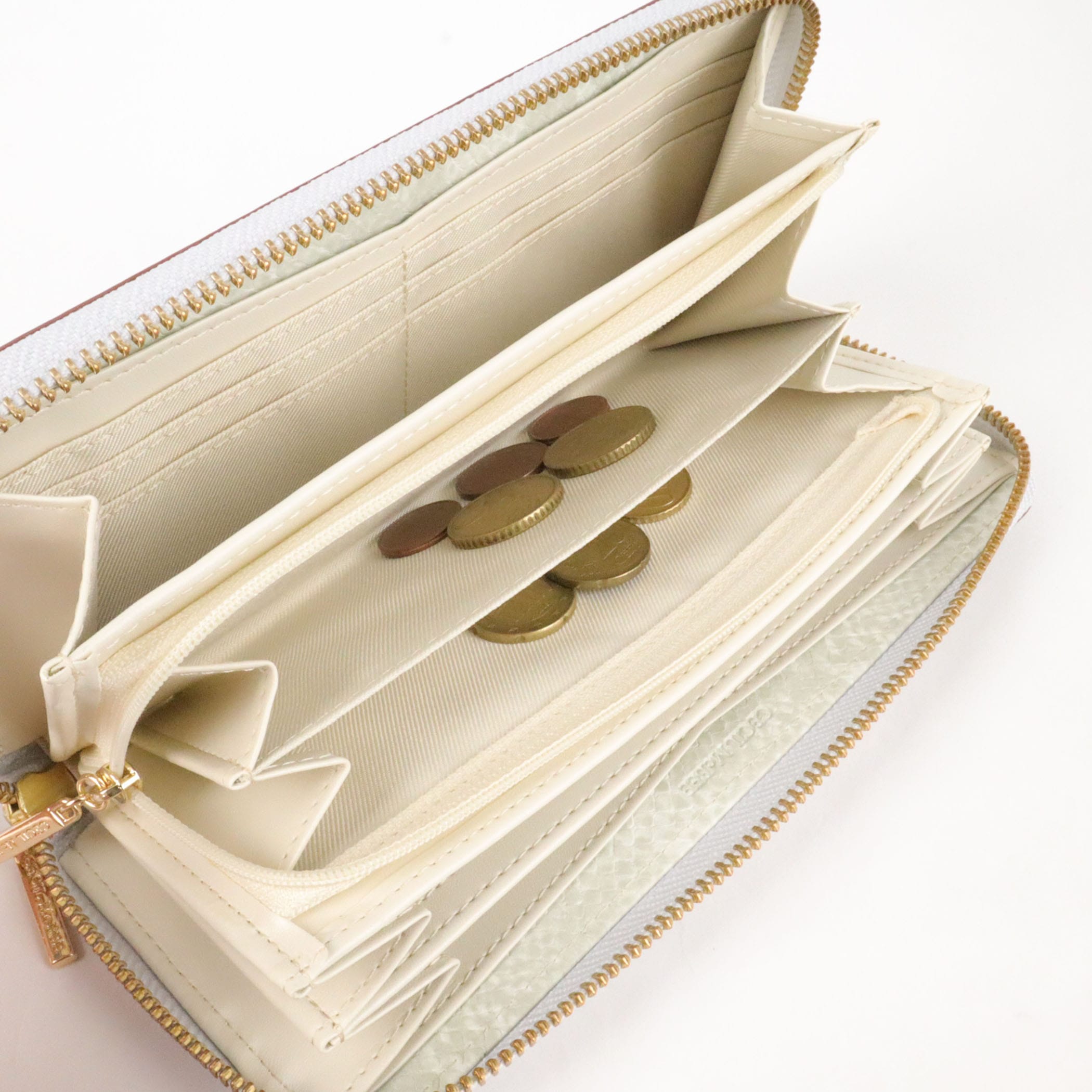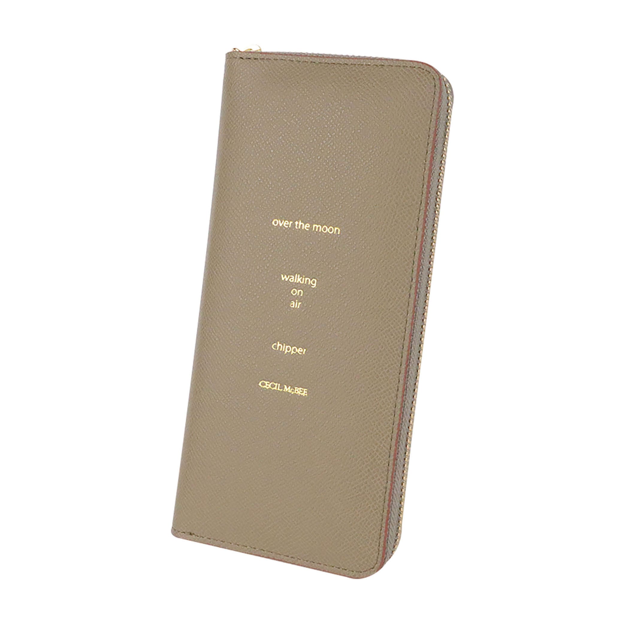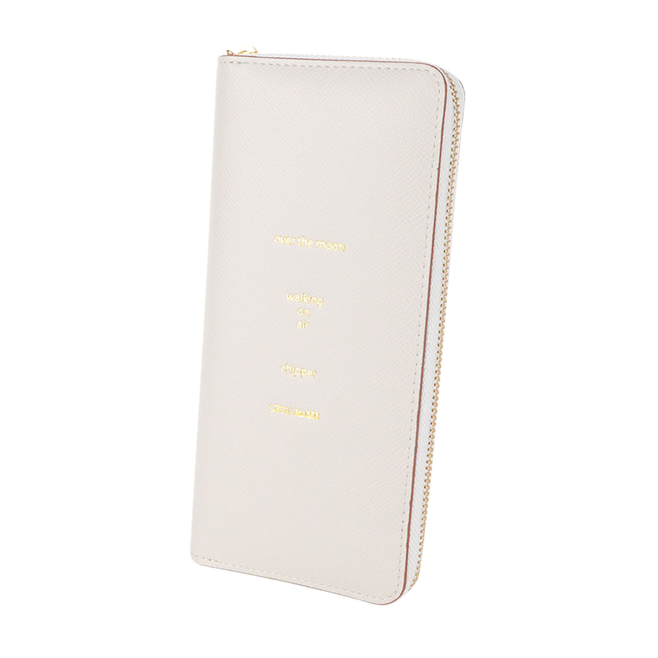 内造りの一部にスネーク合皮がアクセントになっているシリーズ。”気分が上がる”という意味の英単語を規則的に配置し、あえて縦型デザインにしアンティーク感のある日記帳をイメージした財布です。