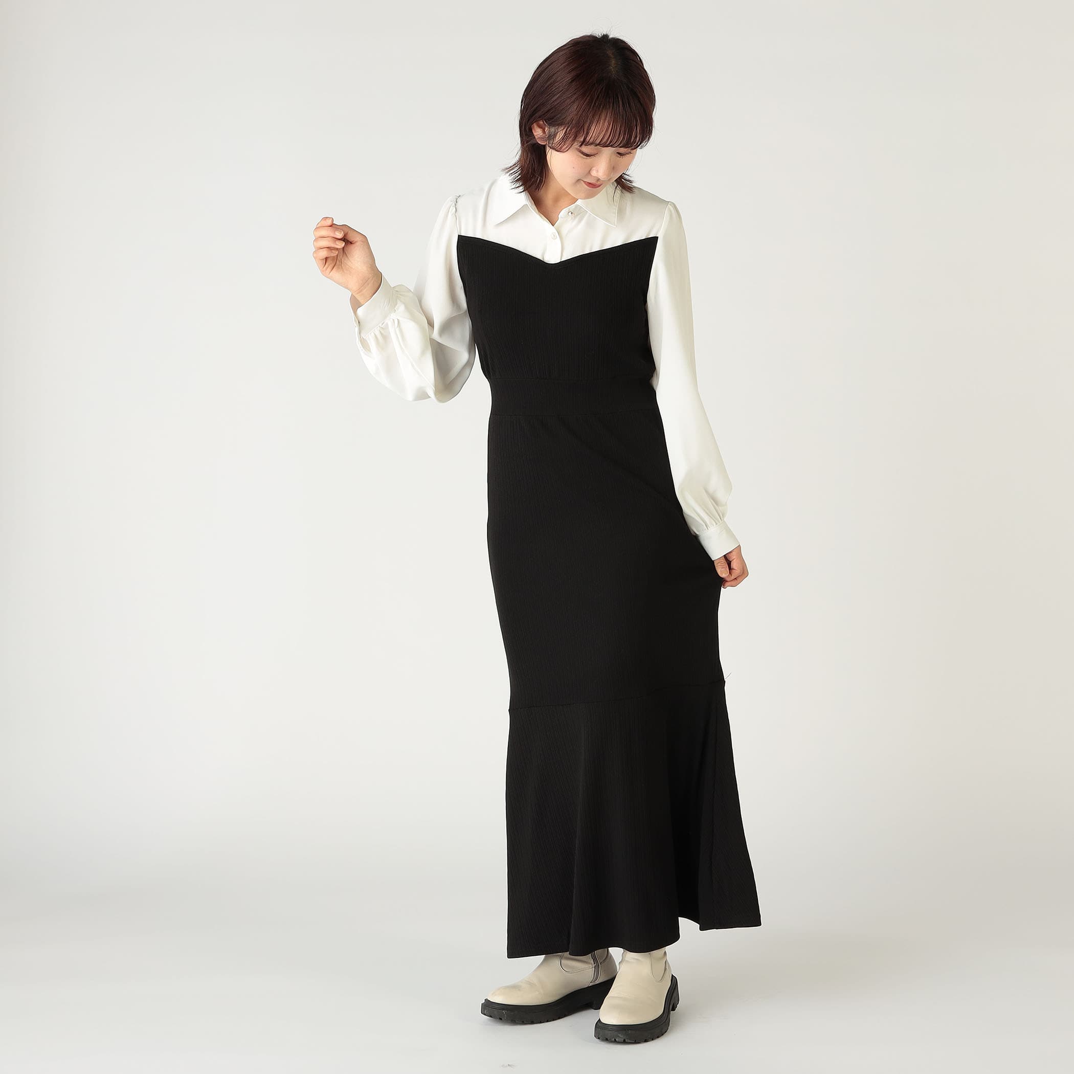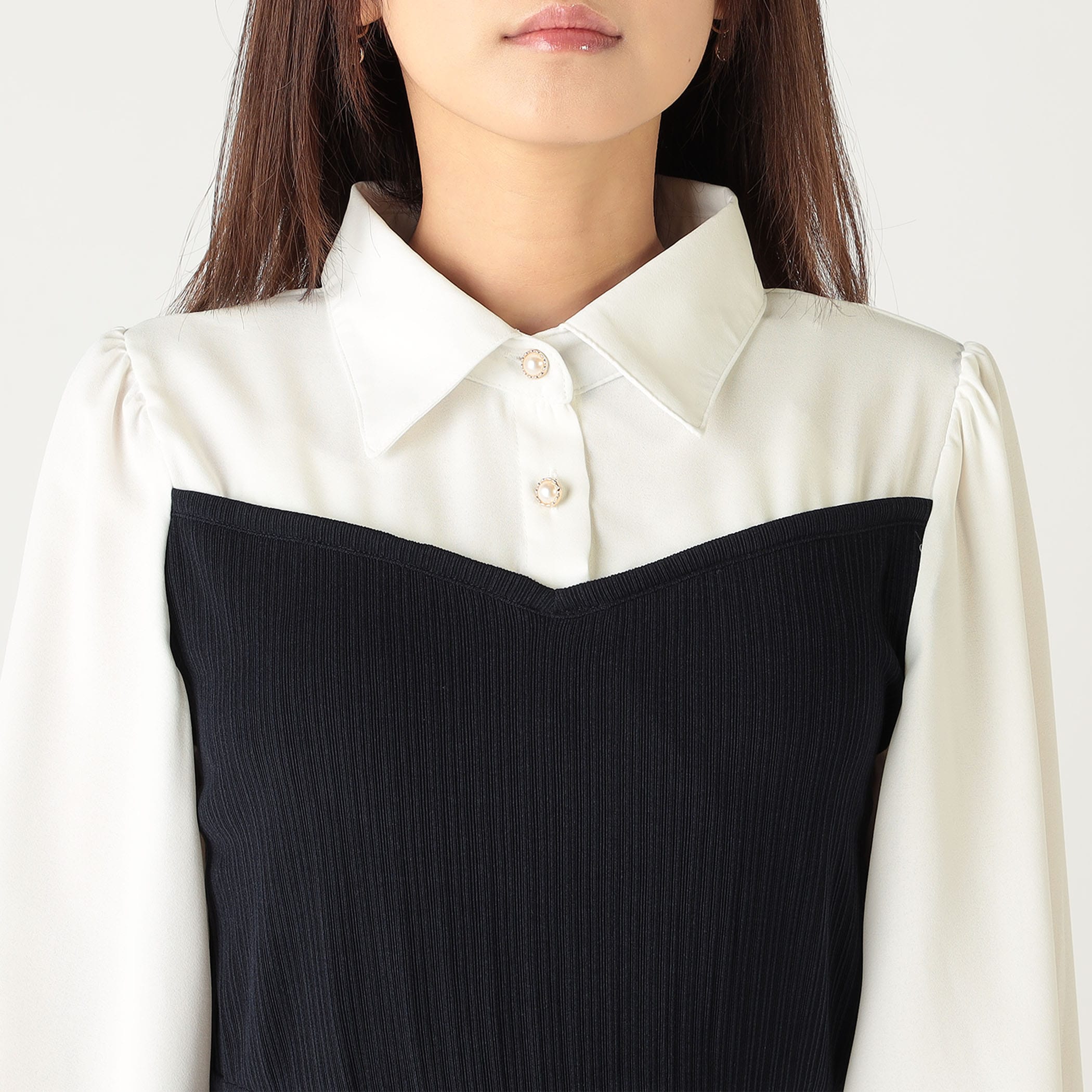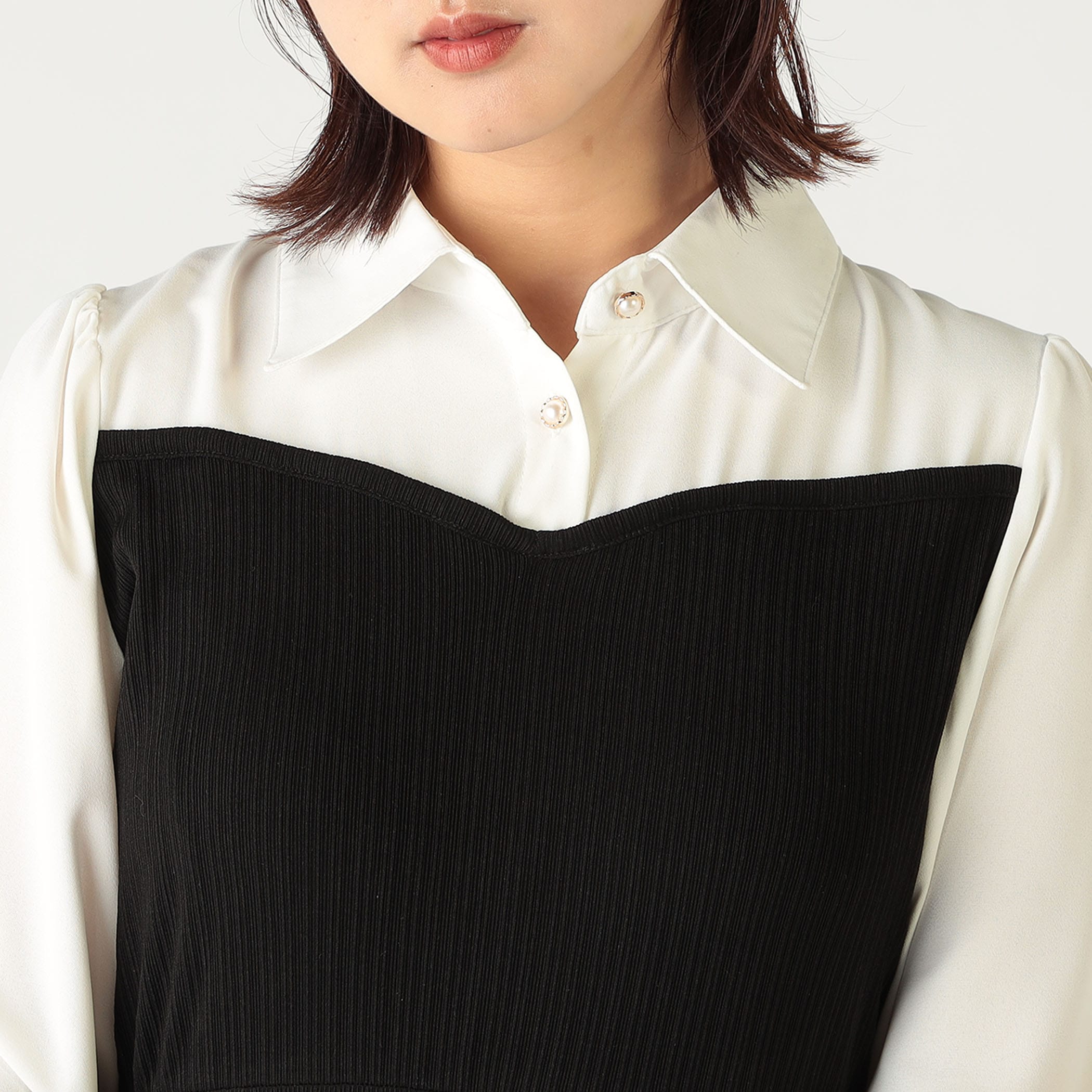 レイヤードスタイルが1枚で決まるブラウスドッキングワンピースワンピースとブラウスをレイヤードしているようなデザイン。高めのウエスト切り替えでスタイルアップ効果も◎程よいフレア感が女性らしさを引き立てくれる一着です。