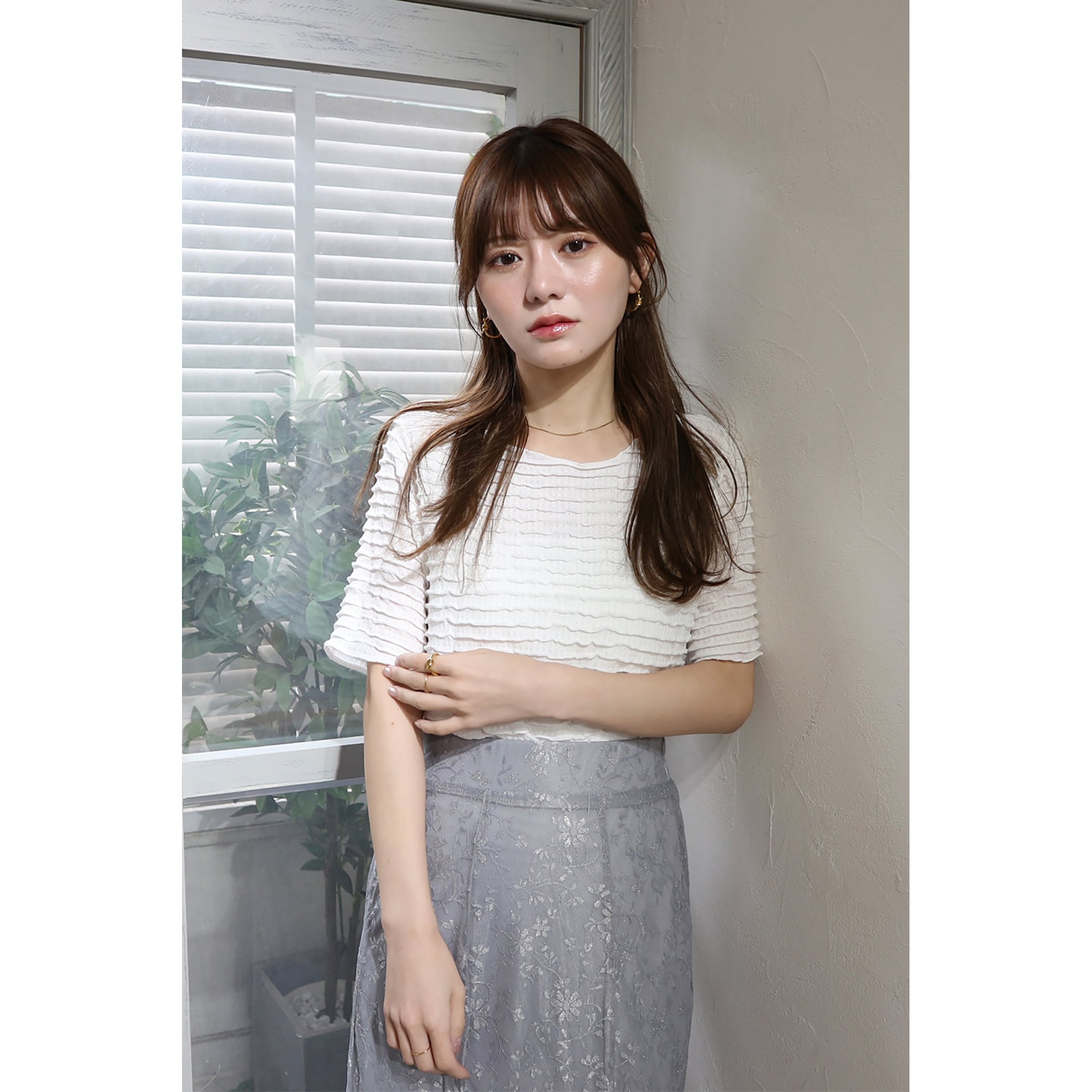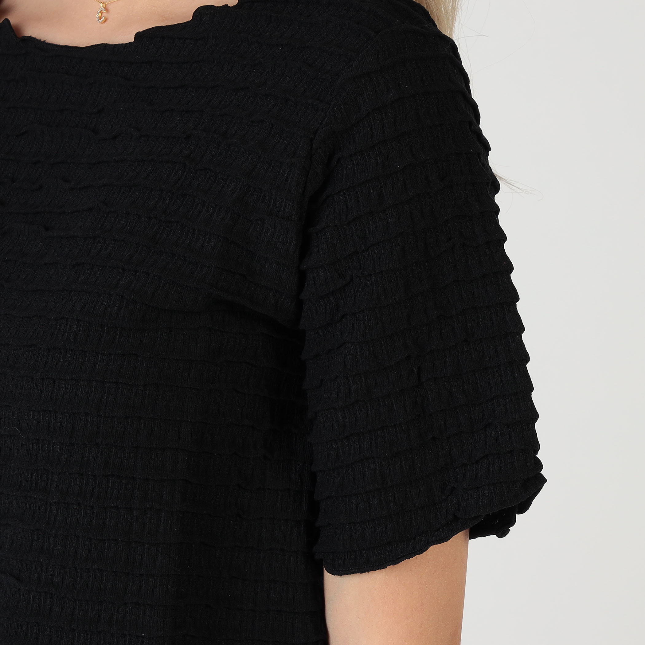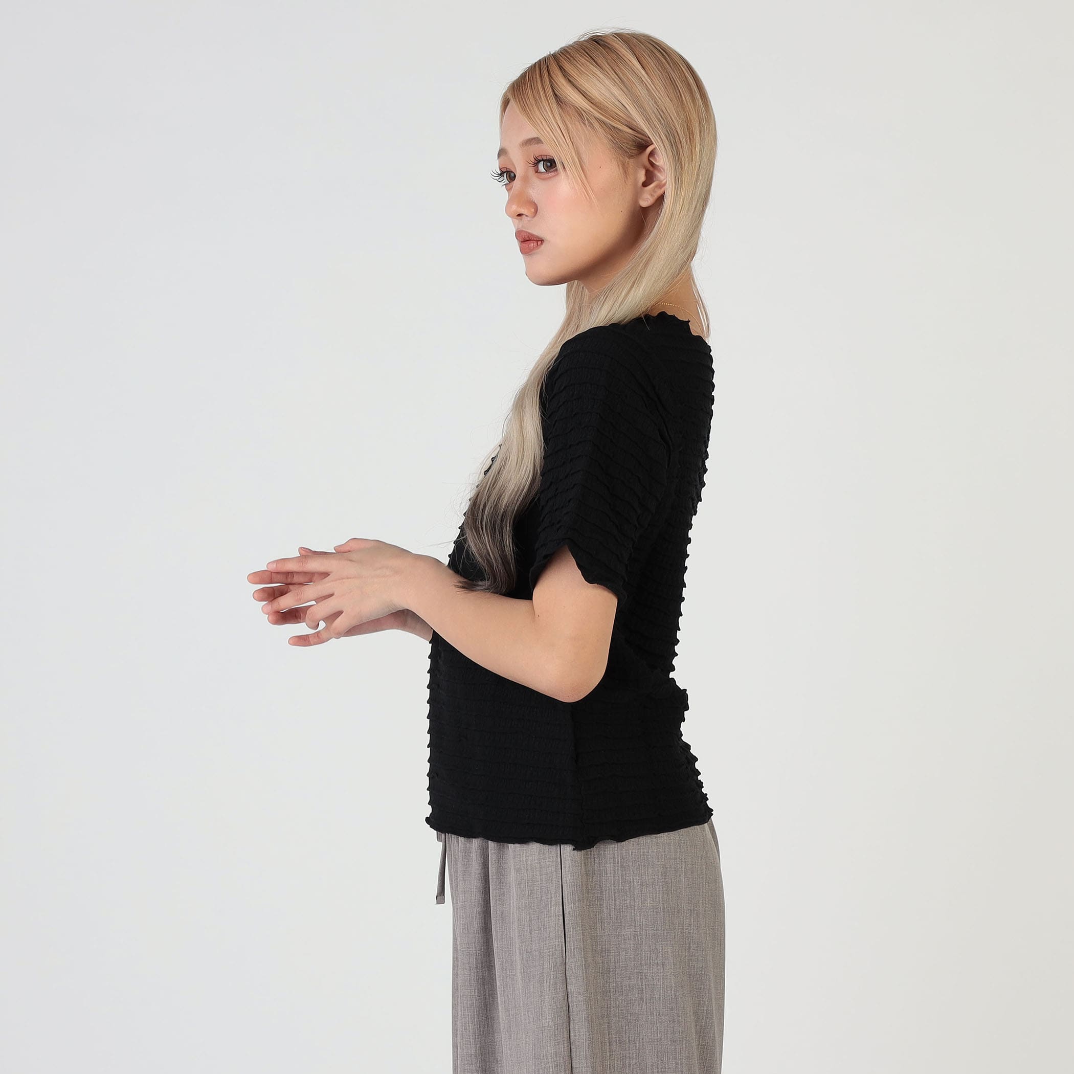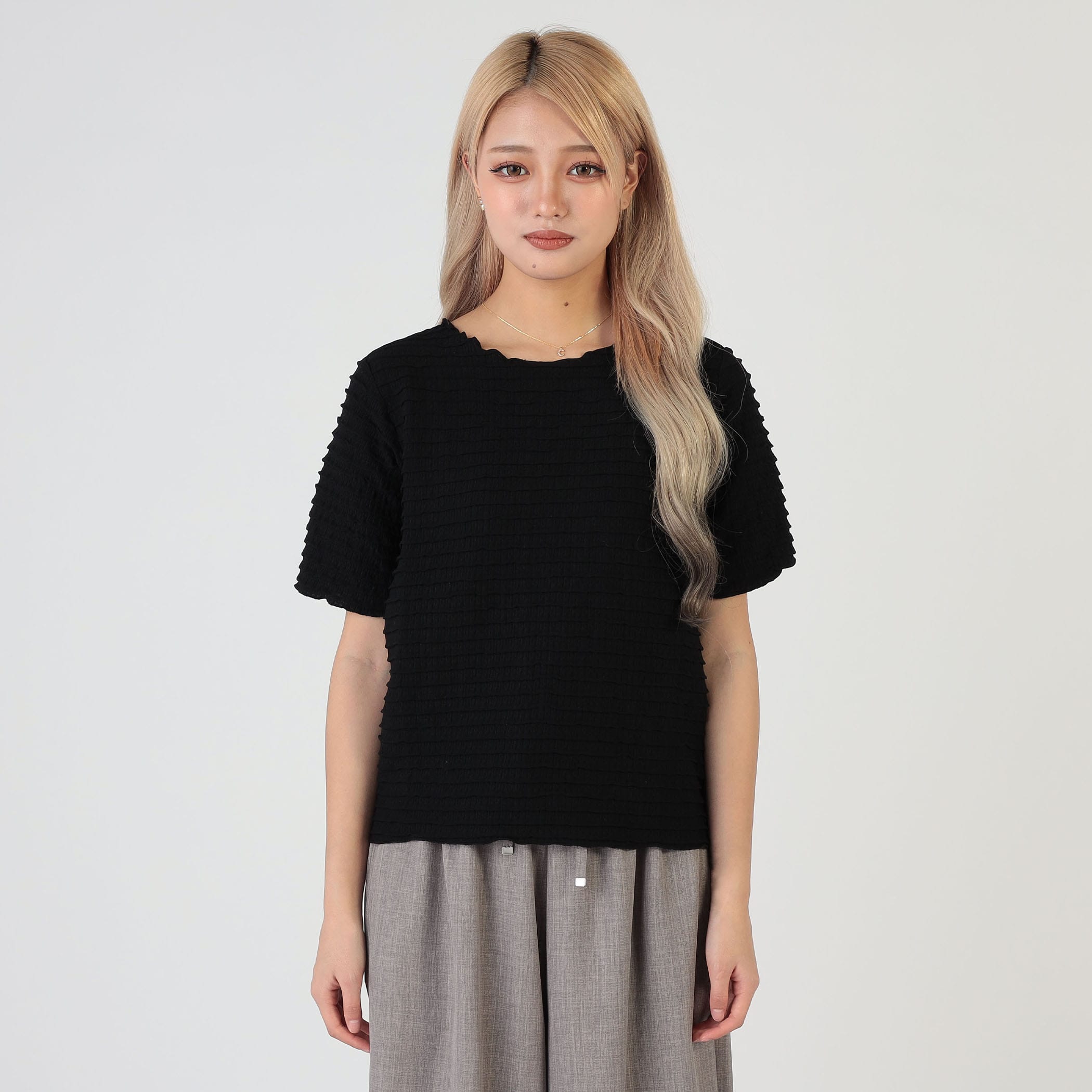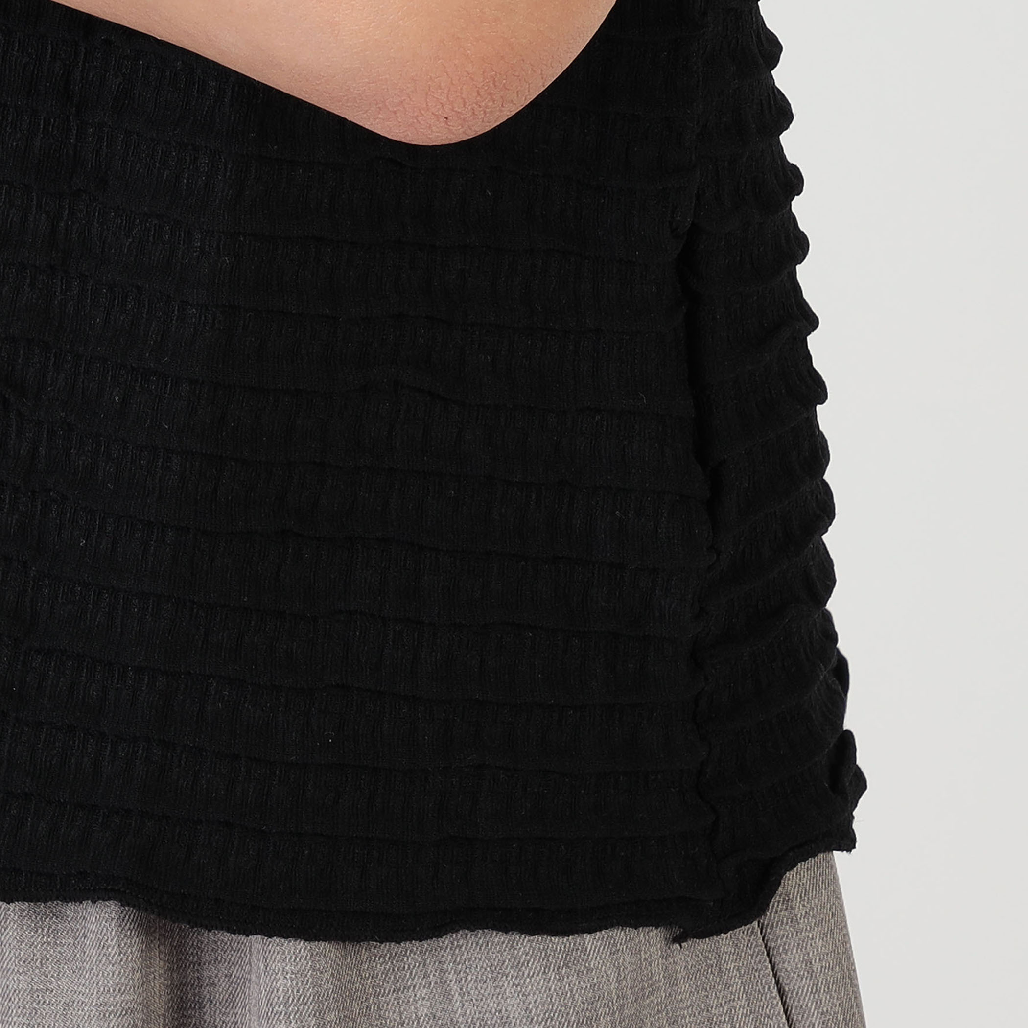 表面感のあるミニフリル素材がアクセント!クルーネックなのですっきりした印象◎一枚での着用はもちろん、インナーとしてキャミワンピースやビスチェ合わせもおすすめです。伸縮性があり、着心地の良い素材です。