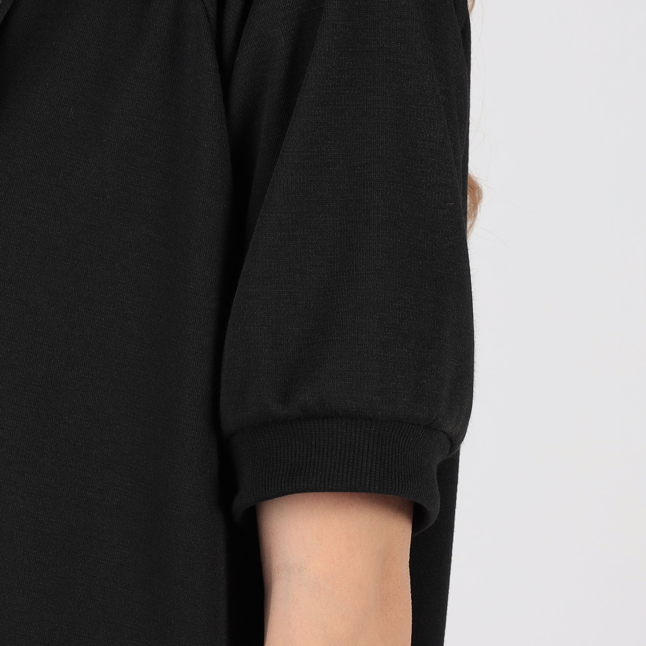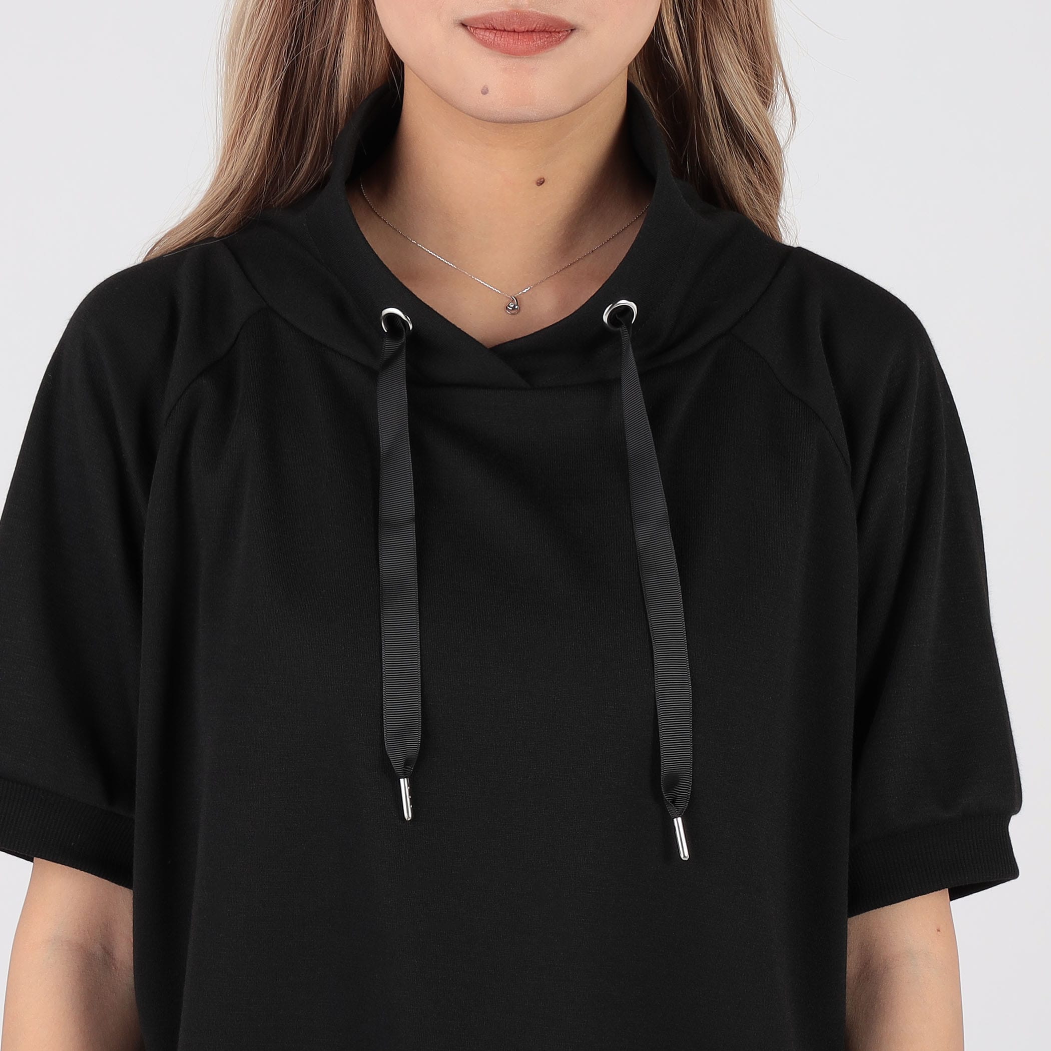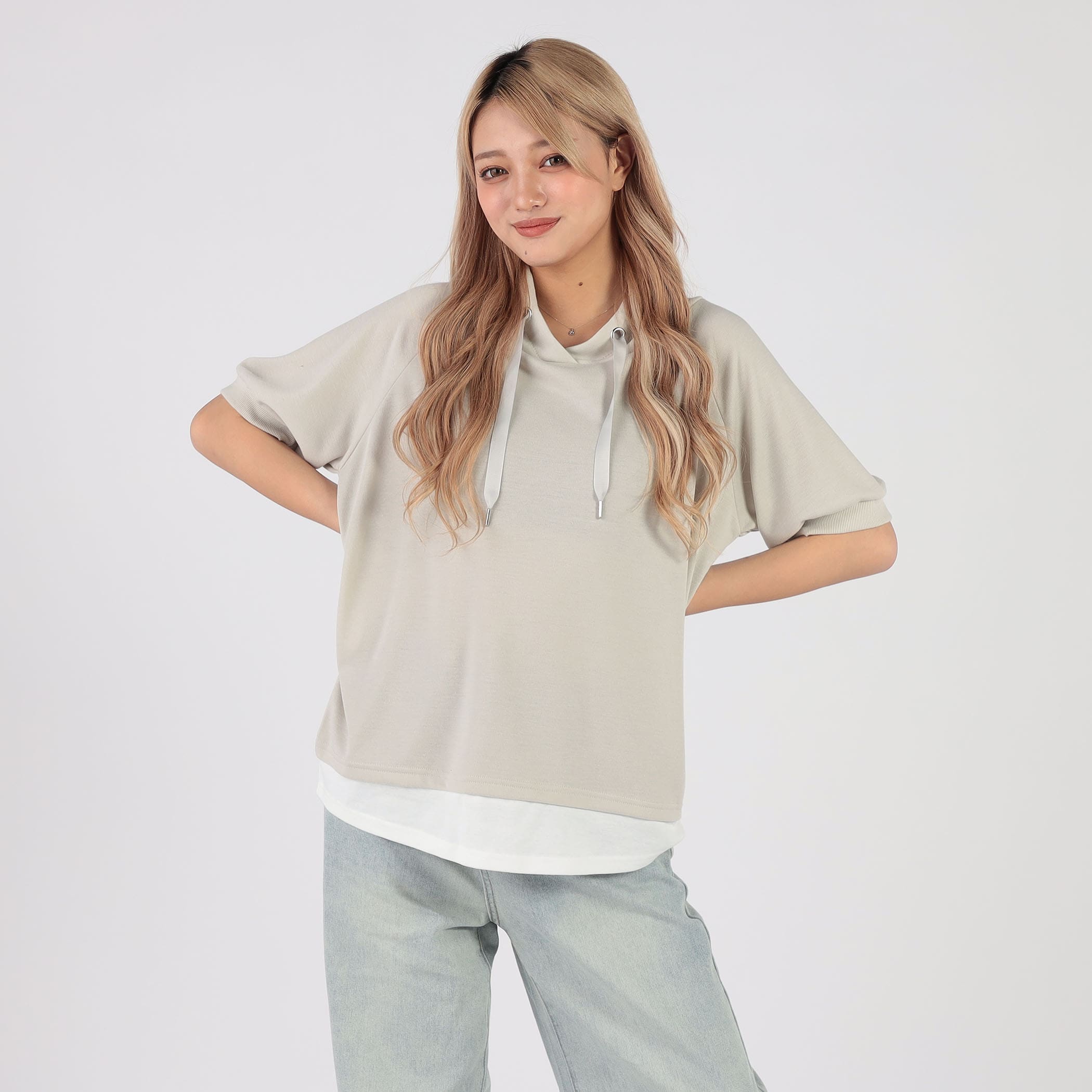 フードっぽいスタンドカラーが可愛い半袖プルオーバー。裾がフェイクレイヤードデザインになっていて、この1着でおしゃれ感あるコーデの完成☆お尻の隠れる丈感なので、パンツスタイルにも、スカートコーデにもあう1着。
