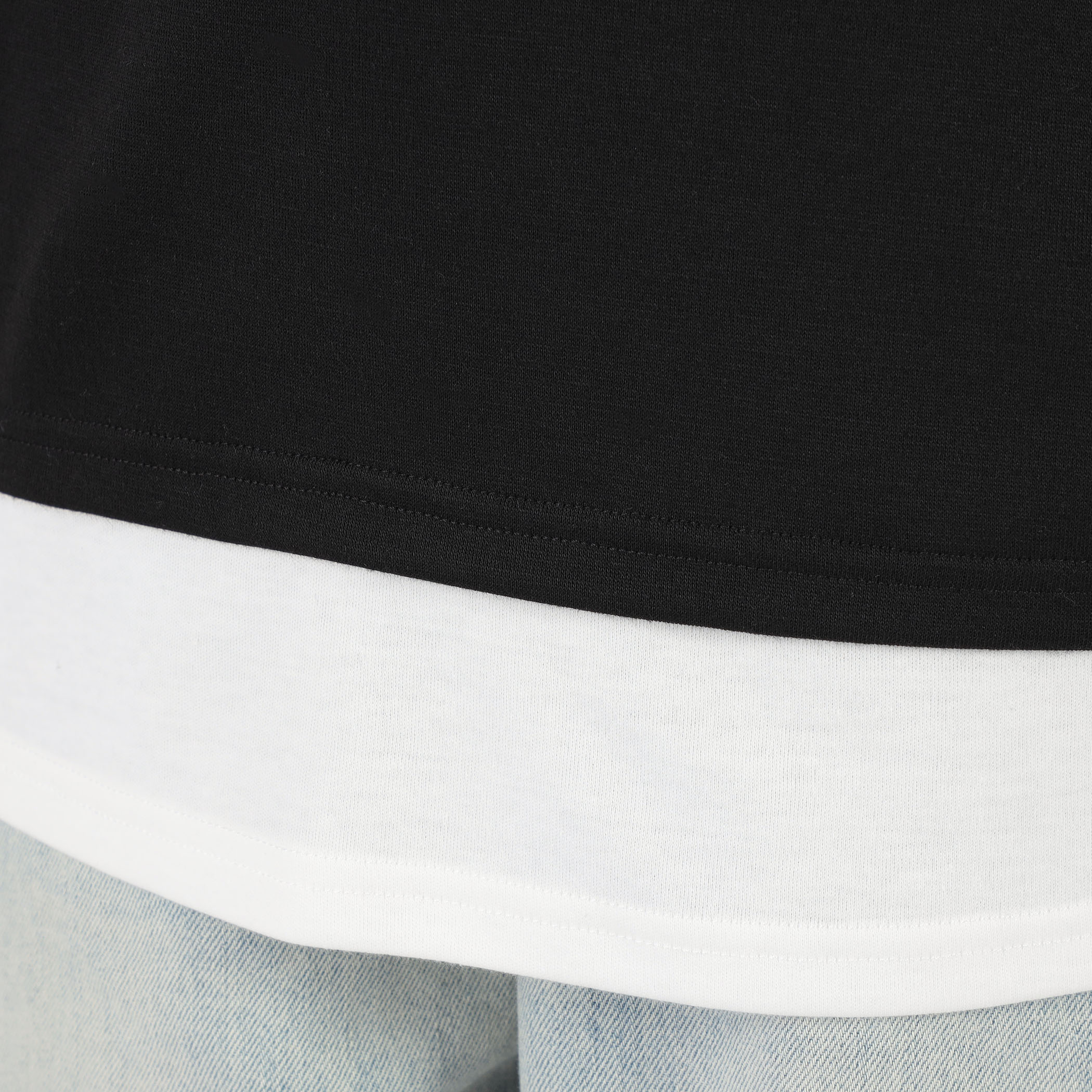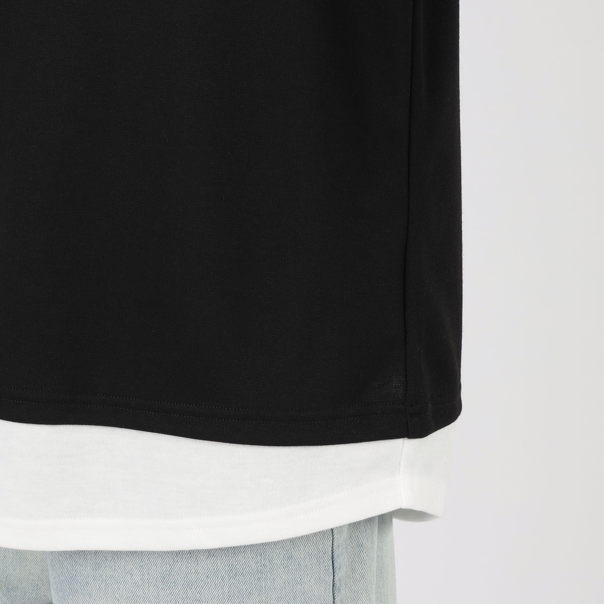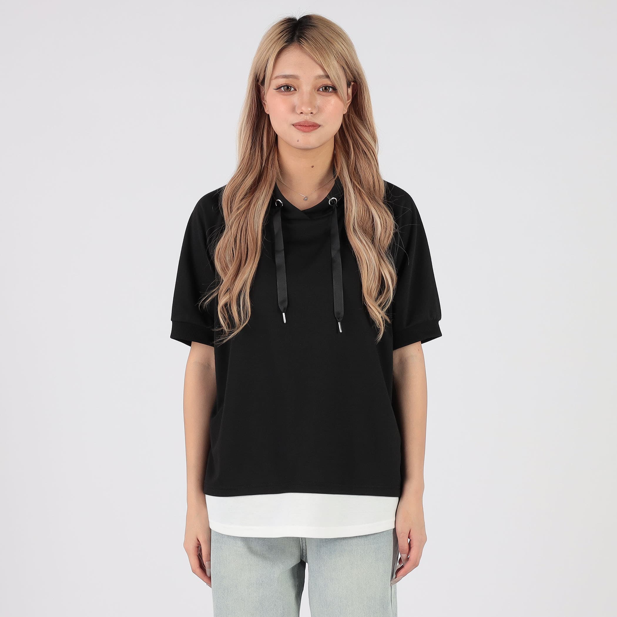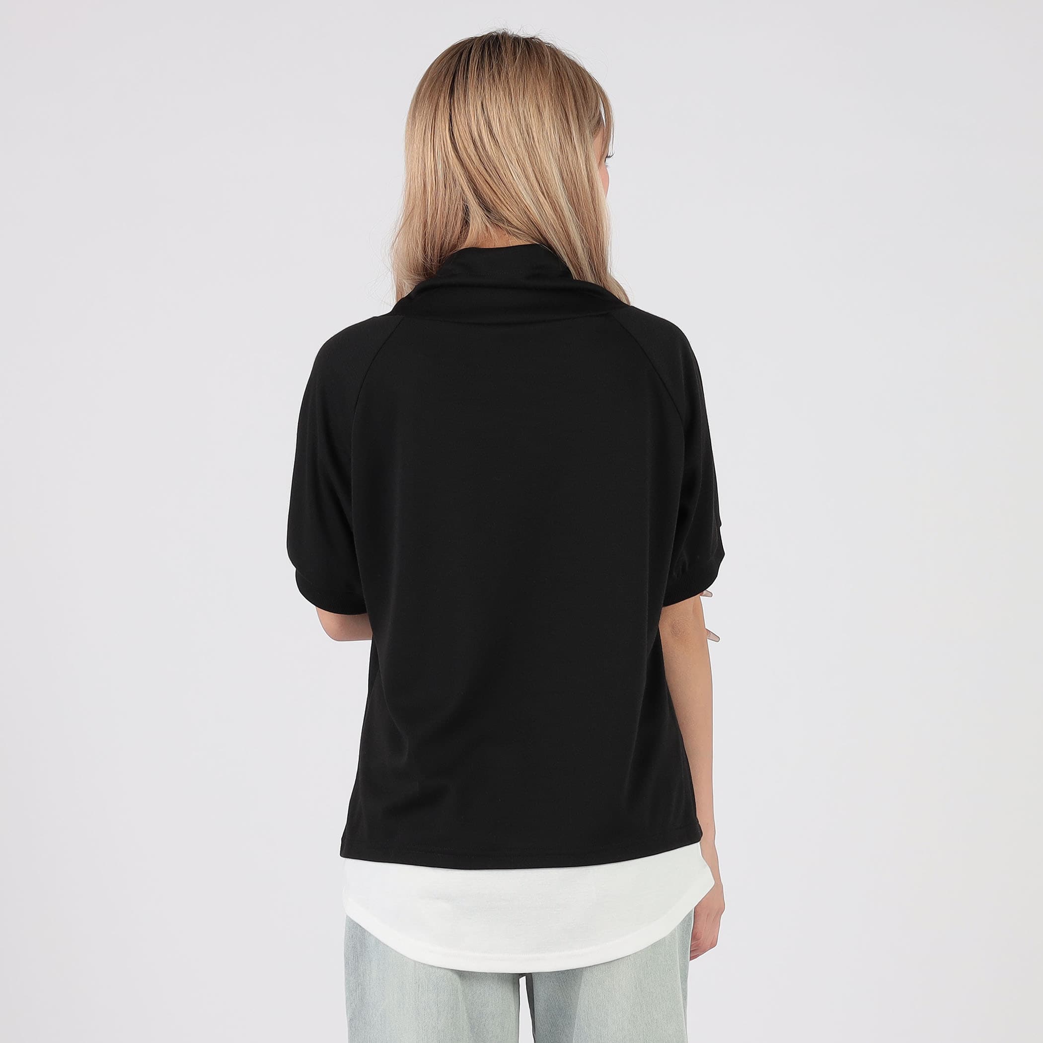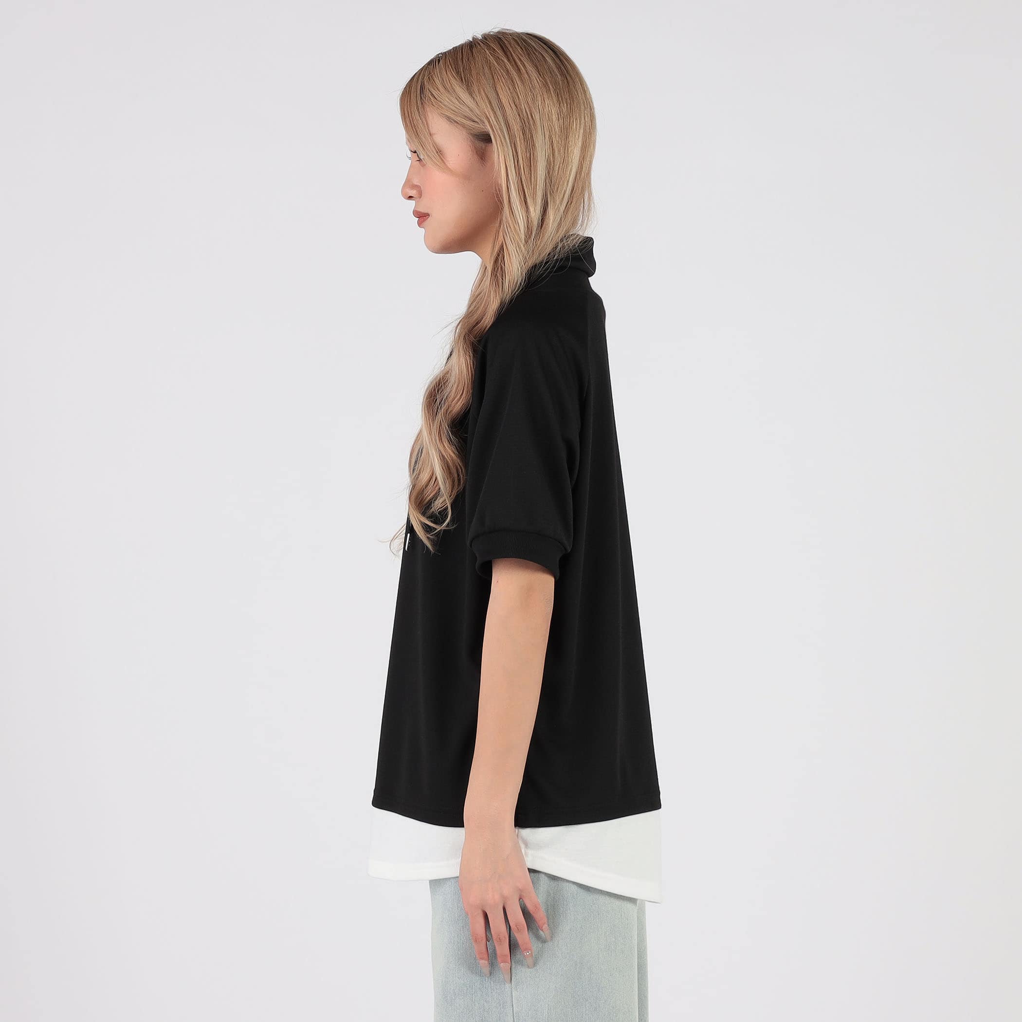 フェイクレイヤードスタンドカラー半袖プルオーバー