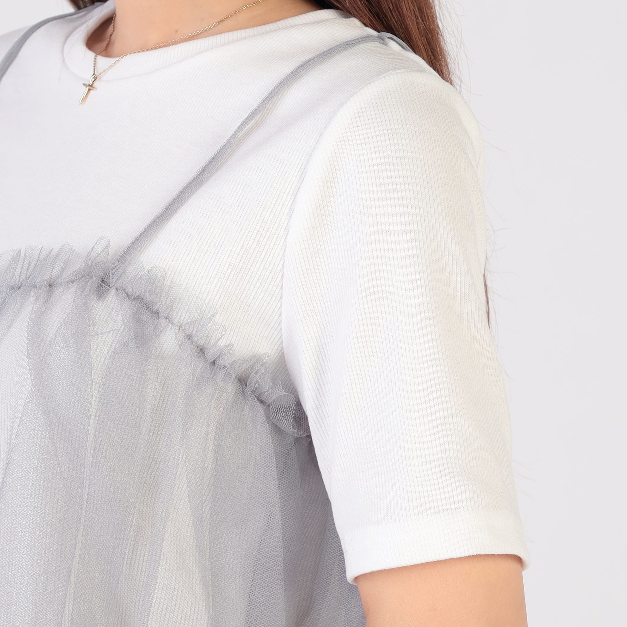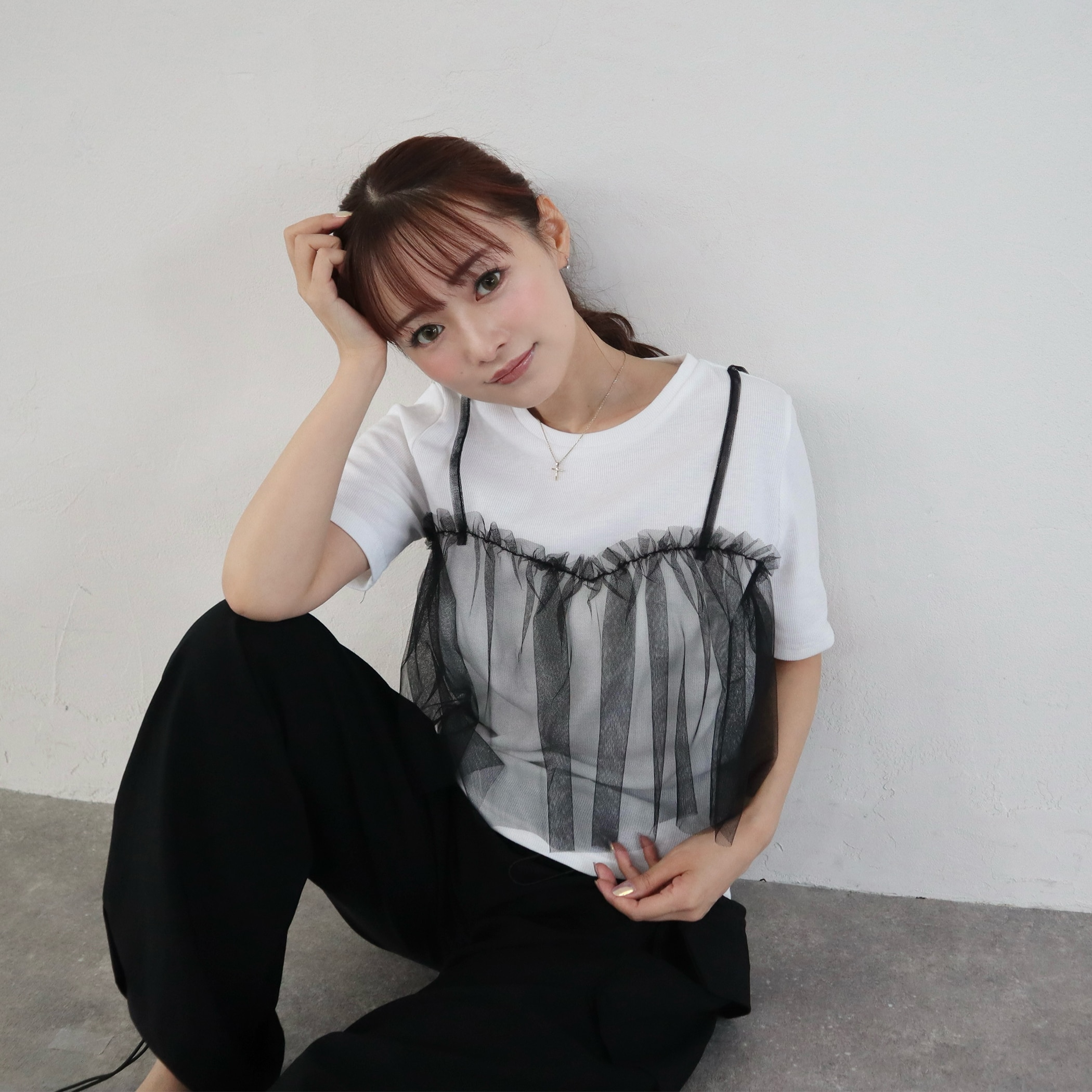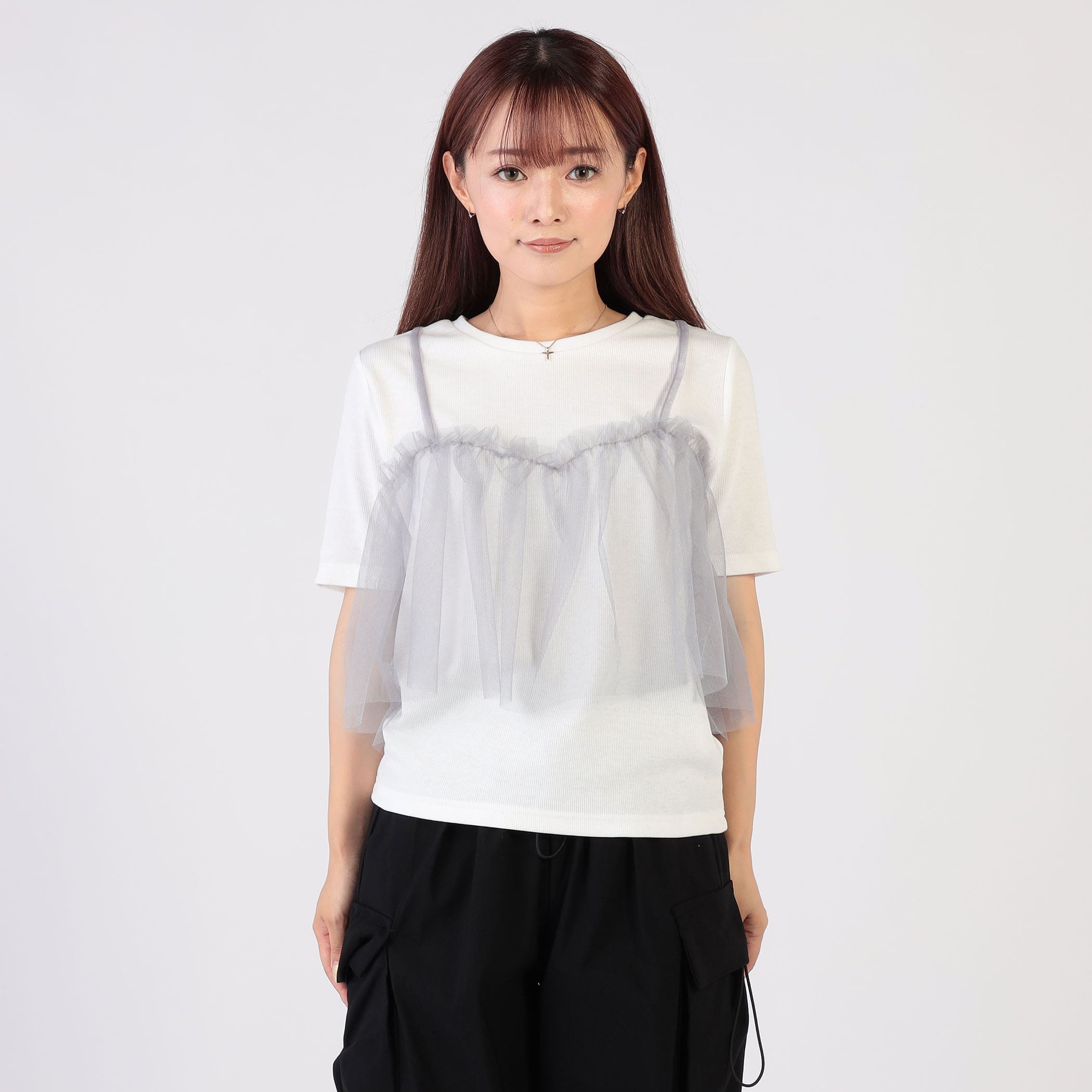 トレンドのチュールビスチェをドッキングさせた半袖プルオーバー。伸縮性のあるリブ素材をインナーに使用しているので着心地も良く一枚でお洒落上級者に見えるコーディネートに取り入れやすいアイテムです。
