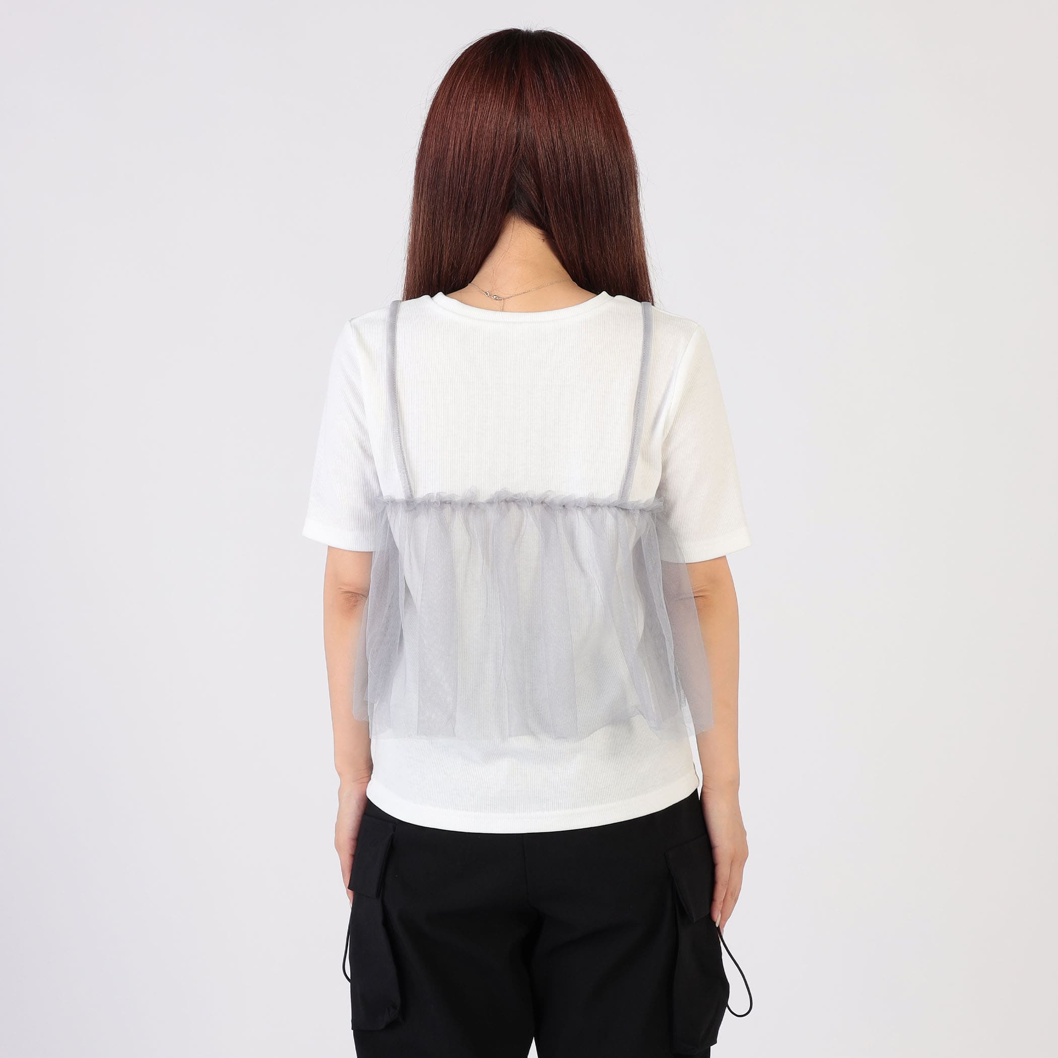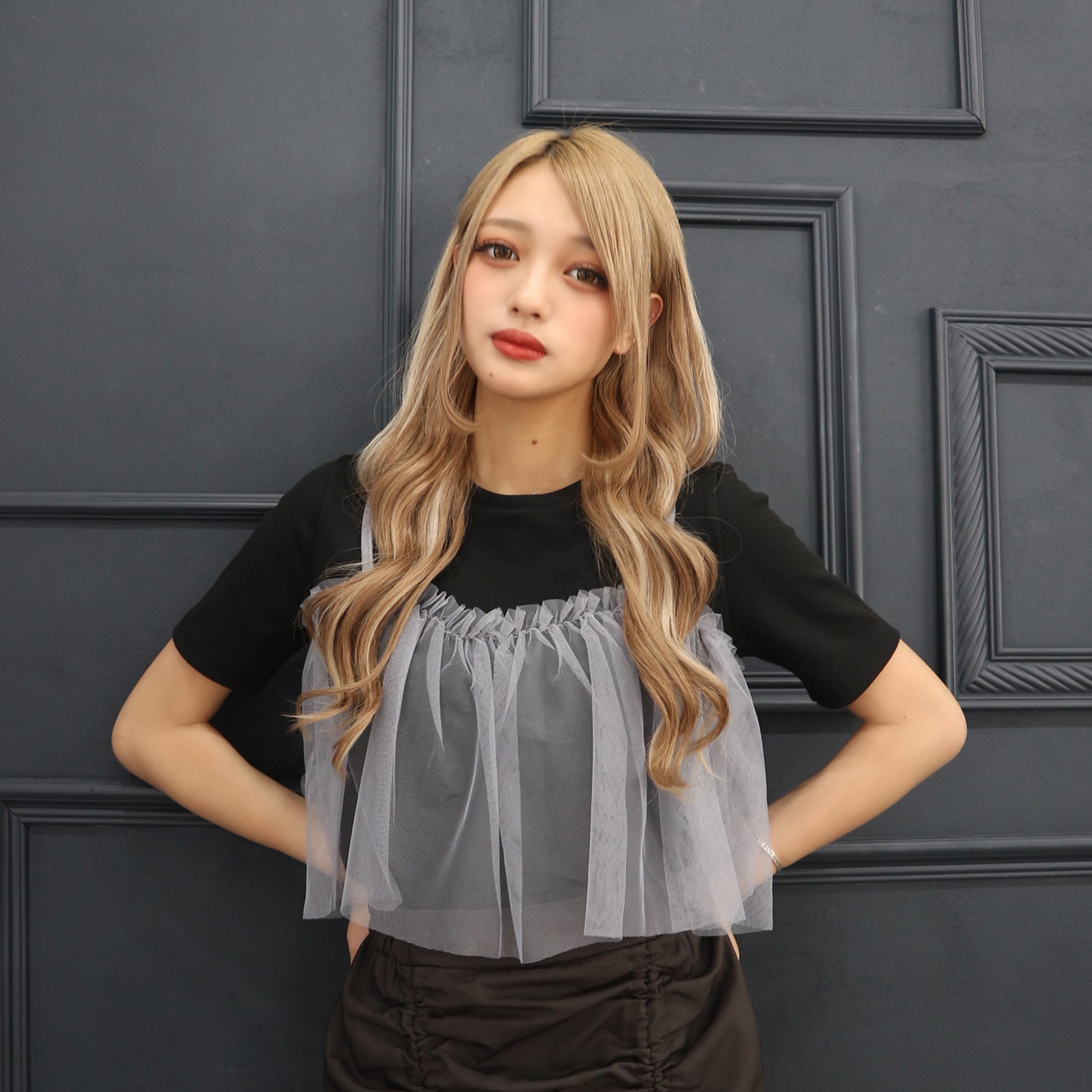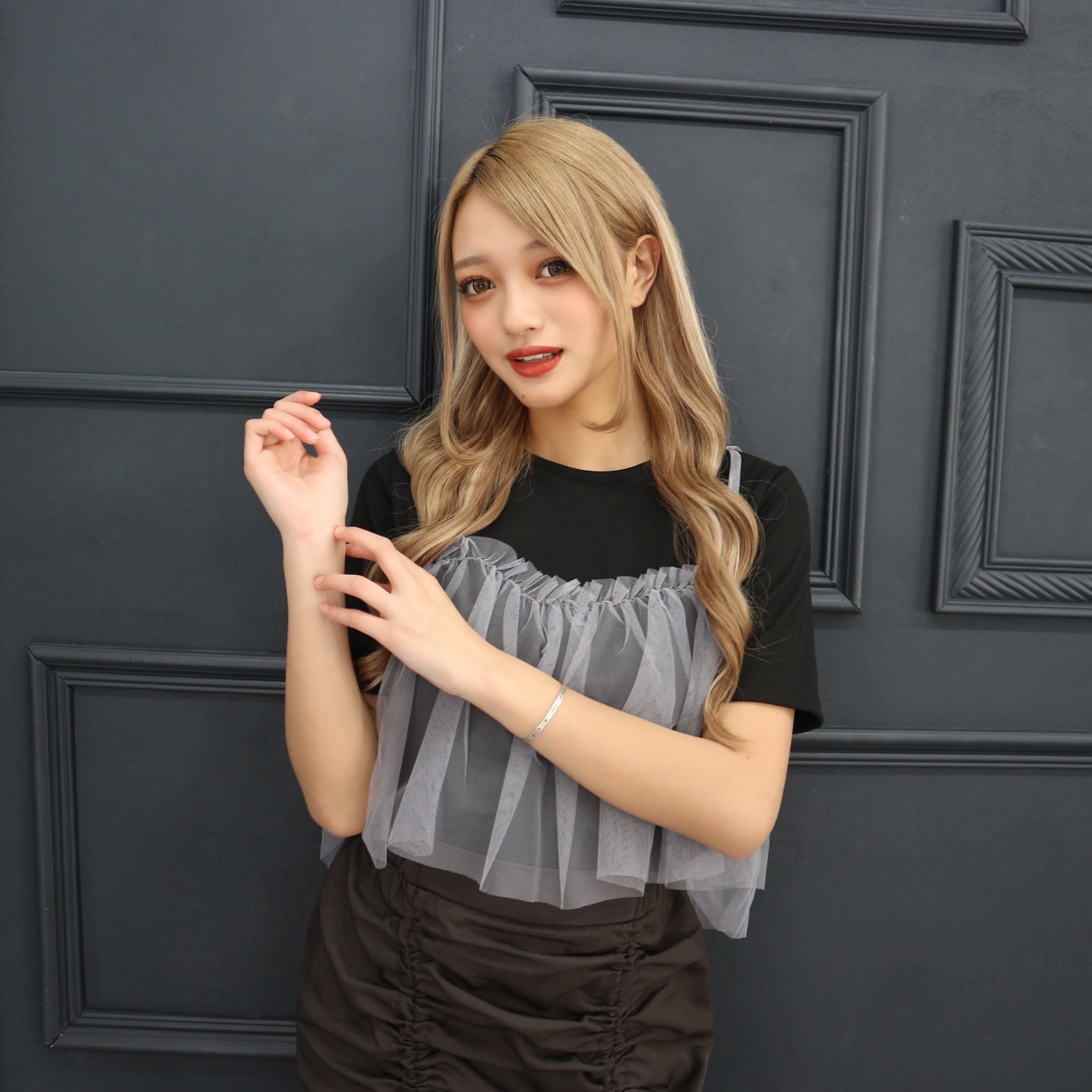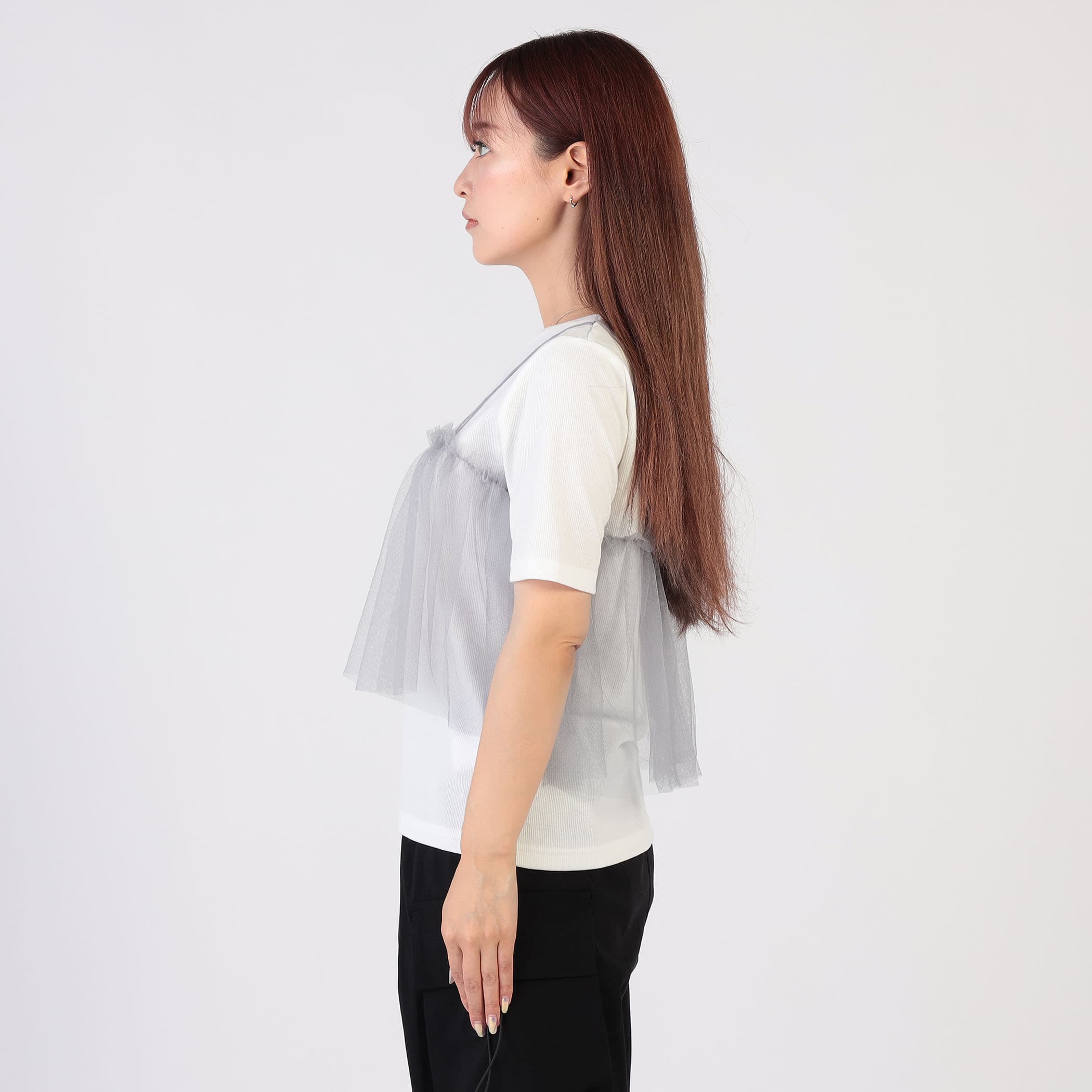 トレンドのチュールビスチェをドッキングさせた半袖プルオーバー。伸縮性のあるリブ素材をインナーに使用しているので着心地も良く一枚でお洒落上級者に見えるコーディネートに取り入れやすいアイテムです。