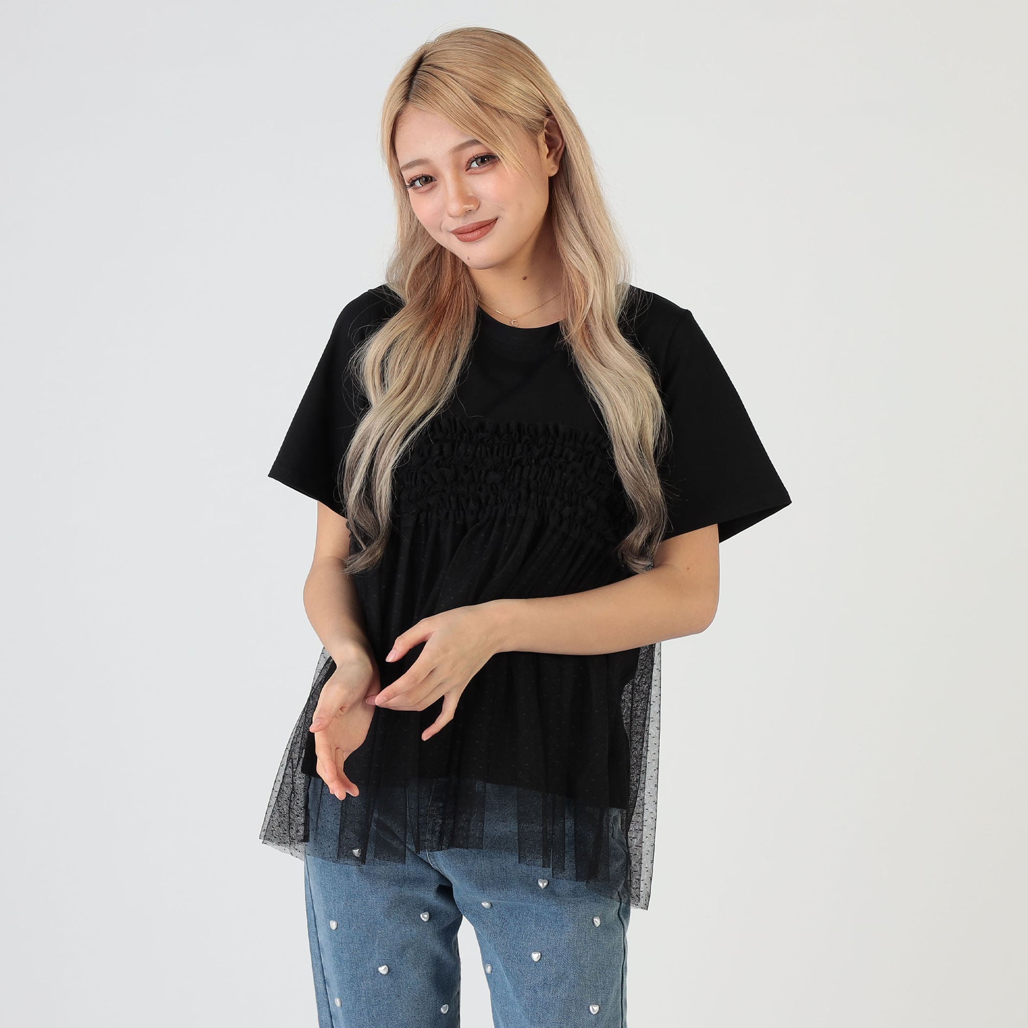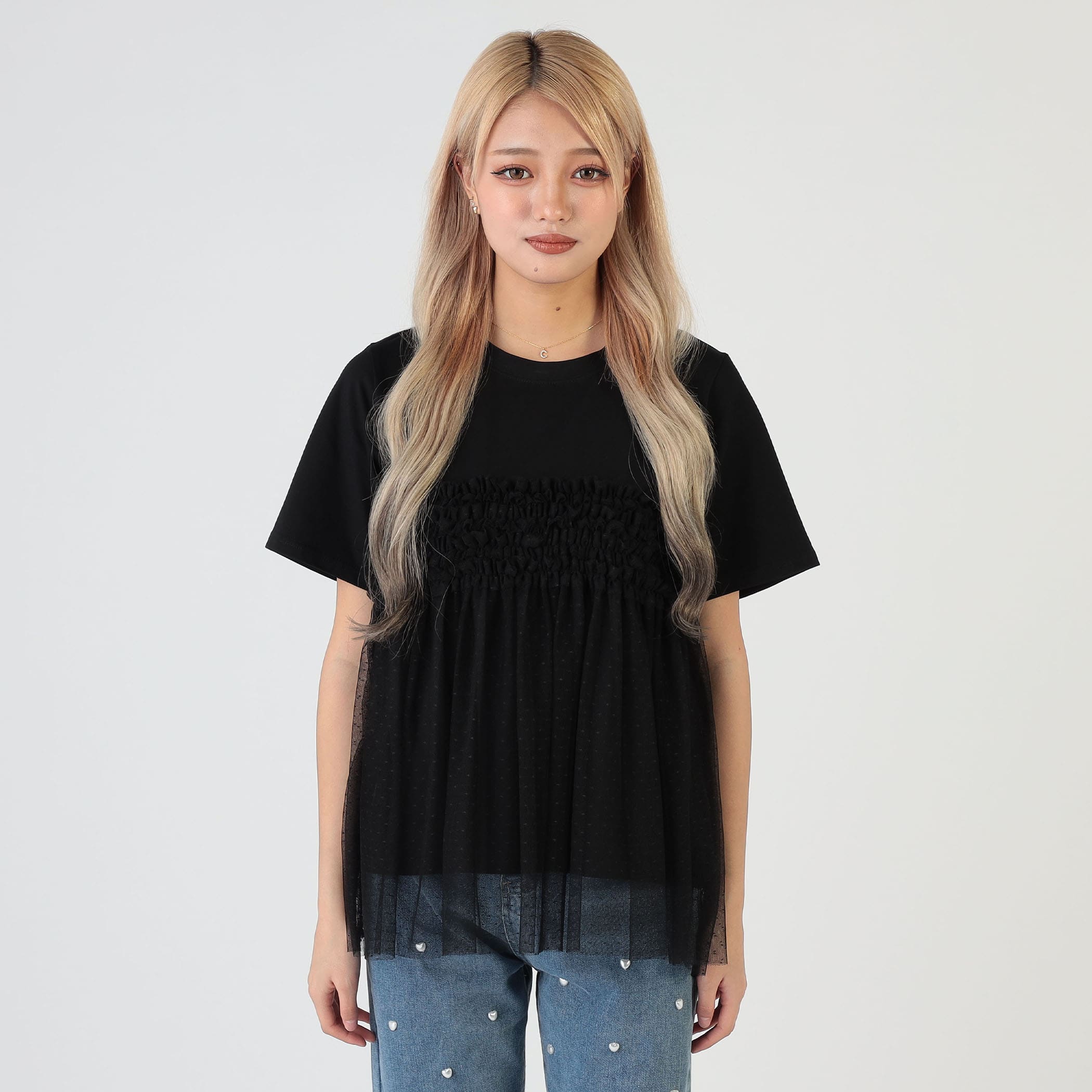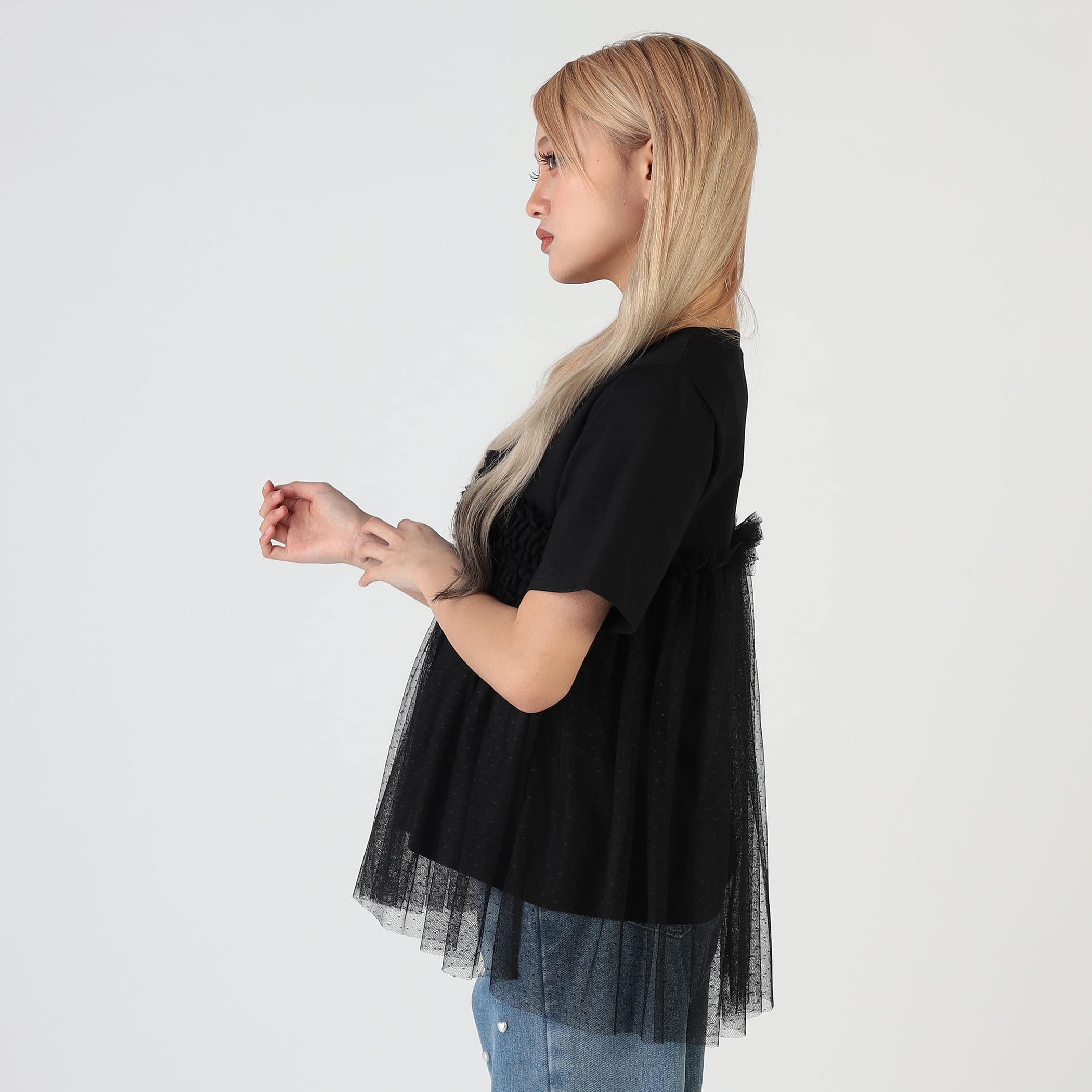 シンプルなTシャツにチュールフリルが映える1枚。これ1つで旬顔なトレンドスタイリングが完成します。透け感のあるチュール素材で、ティアードデザインが身頃に施され、大人フェミニンな雰囲気を演出します。シンプルに使いやすいクルーネックと、ベーシックな半袖が、普段のコーデに取り入れやすいポイントです。ボトムには、リラックス感のあるワイドパンツや、ショートパンツの他、ペンシルスカート、ナロースカートなどを合わせるとバランスよく着こなせます。春夏のファッションに華やかさと、エレガンスをプラスし、普段のスタイリングをアップデートしてくれる1着です。