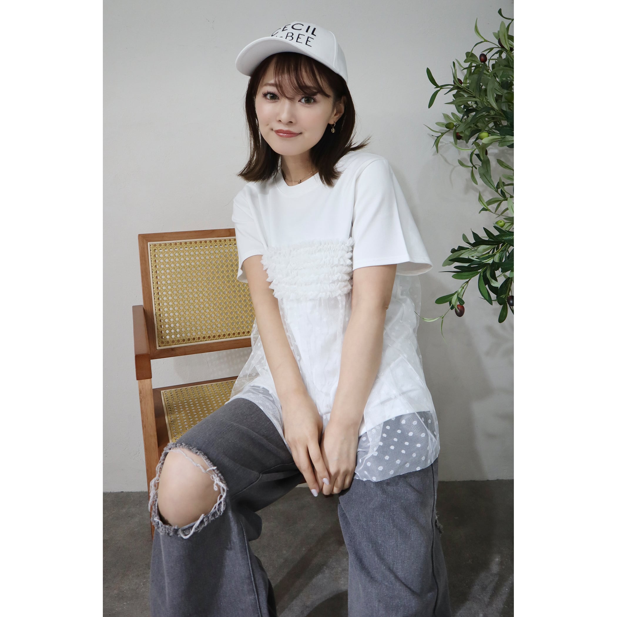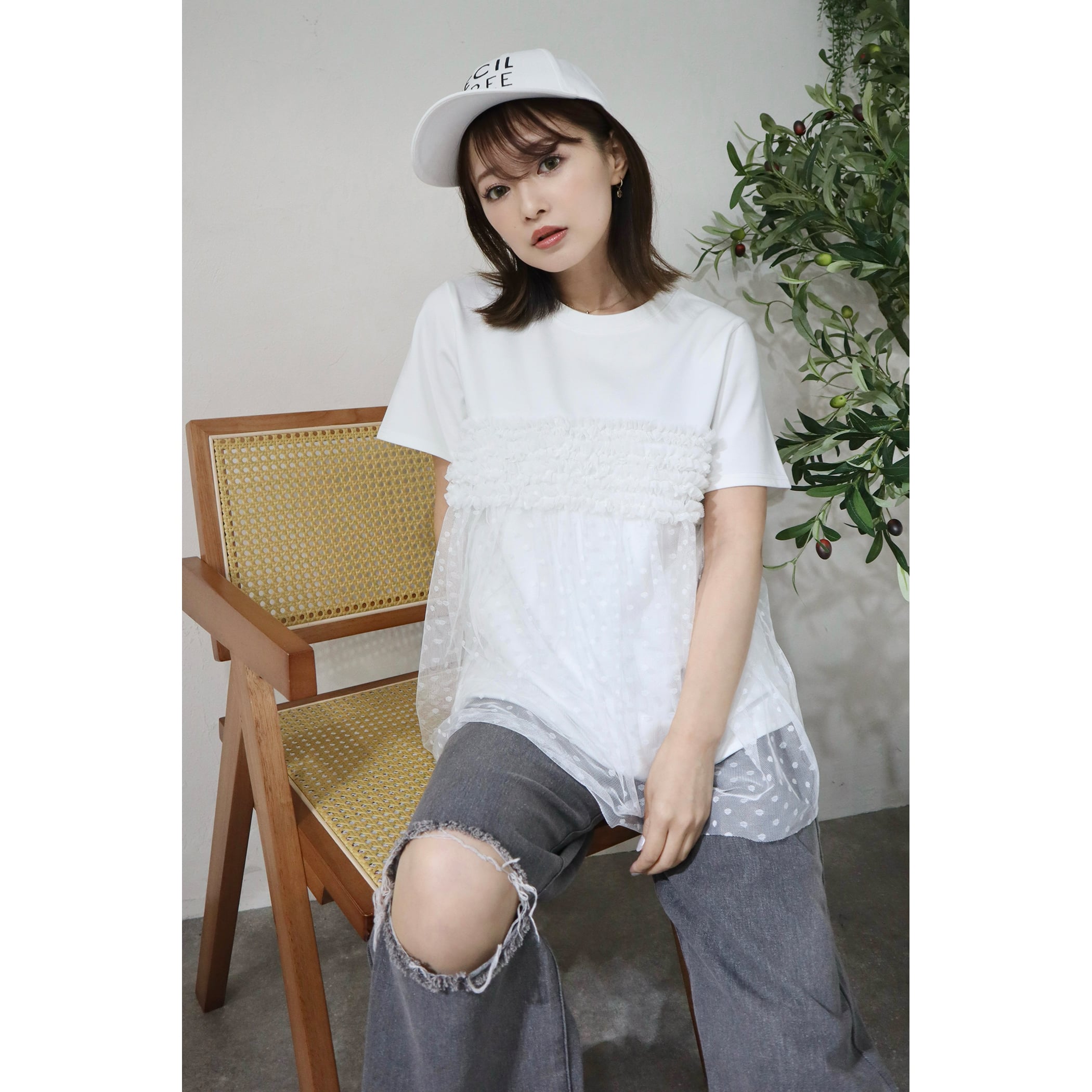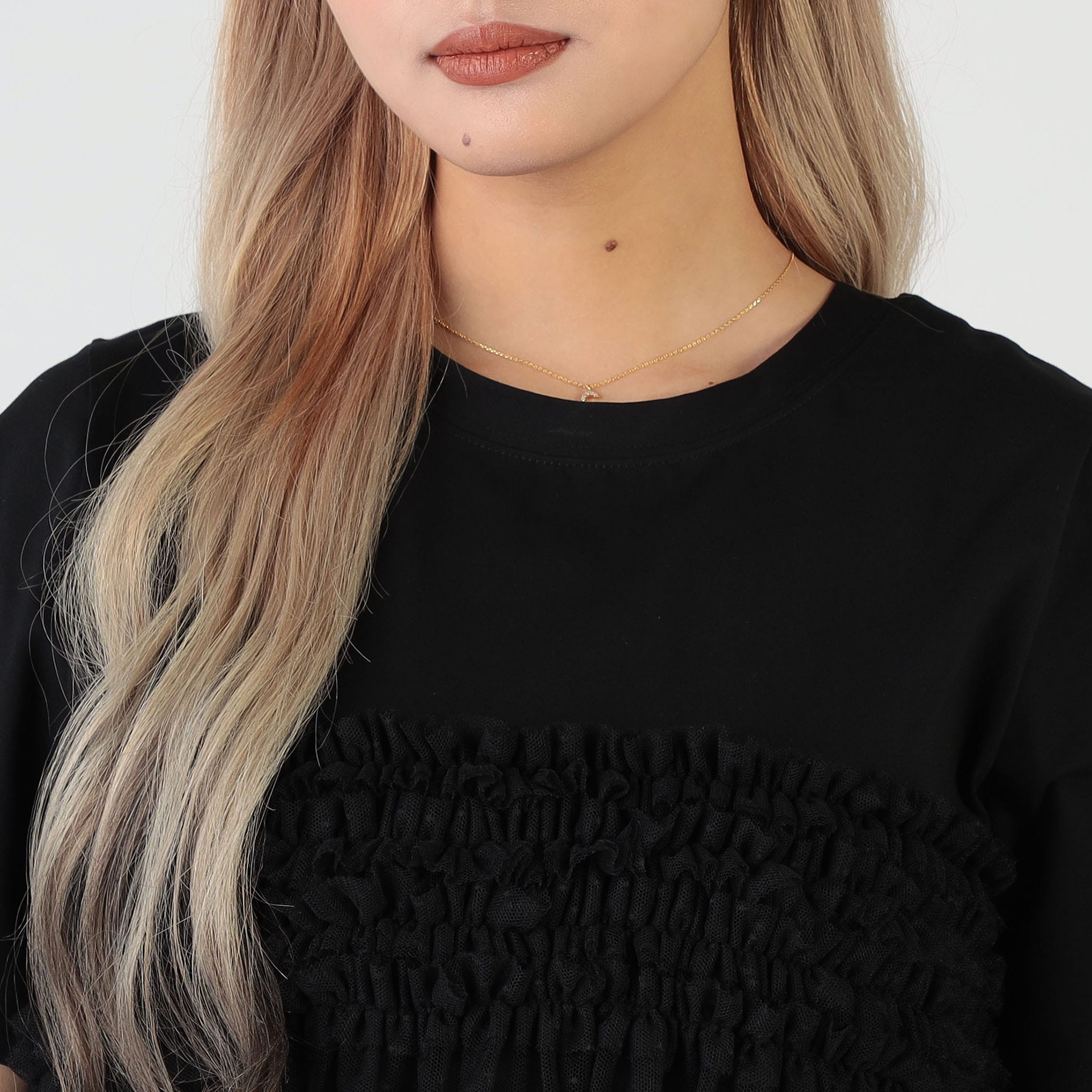 シンプルなTシャツにチュールフリルが映える1枚。これ1つで旬顔なトレンドスタイリングが完成します。透け感のあるチュール素材で、ティアードデザインが身頃に施され、大人フェミニンな雰囲気を演出します。シンプルに使いやすいクルーネックと、ベーシックな半袖が、普段のコーデに取り入れやすいポイントです。ボトムには、リラックス感のあるワイドパンツや、ショートパンツの他、ペンシルスカート、ナロースカートなどを合わせるとバランスよく着こなせます。春夏のファッションに華やかさと、エレガンスをプラスし、普段のスタイリングをアップデートしてくれる1着です。