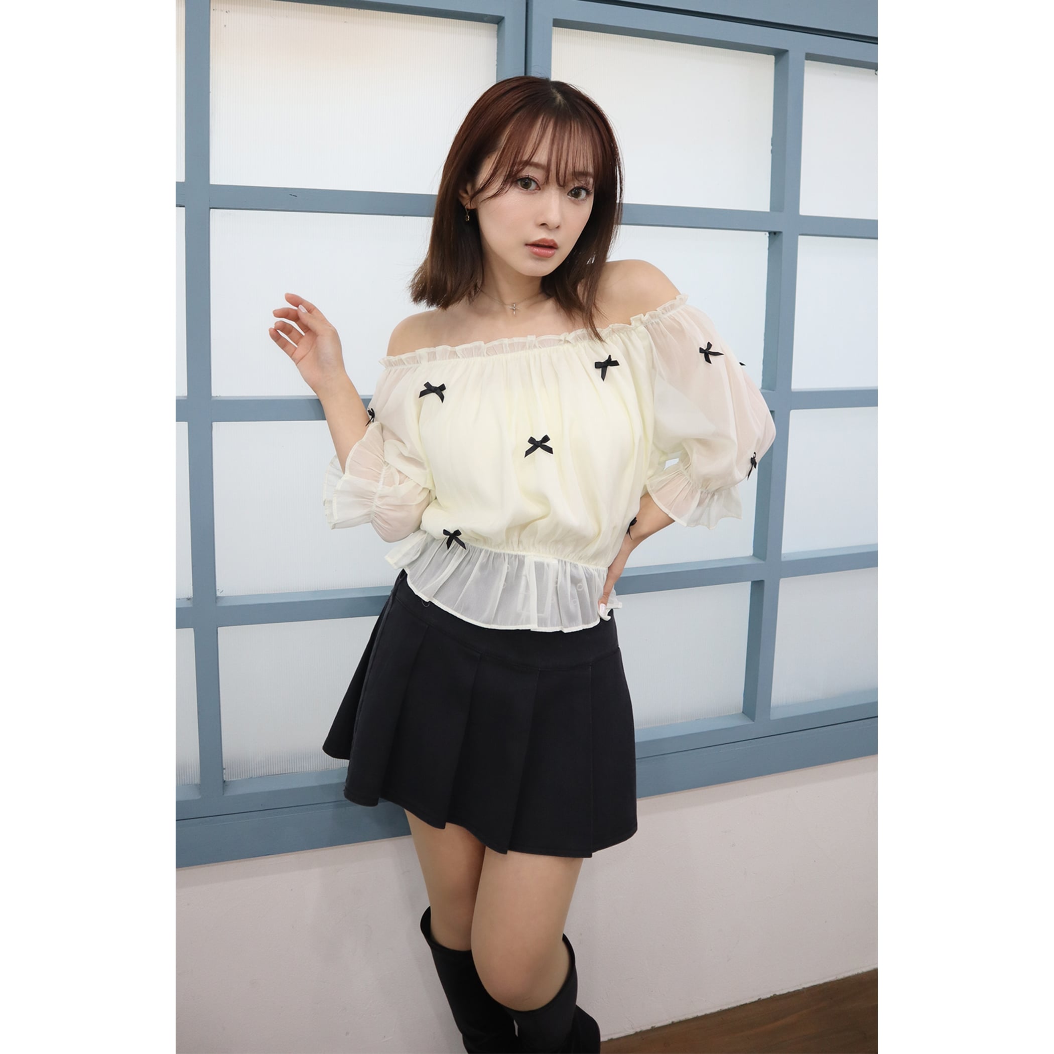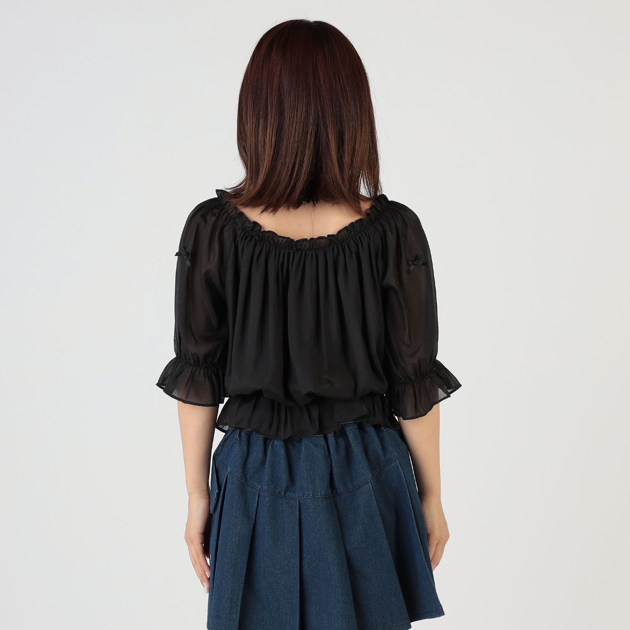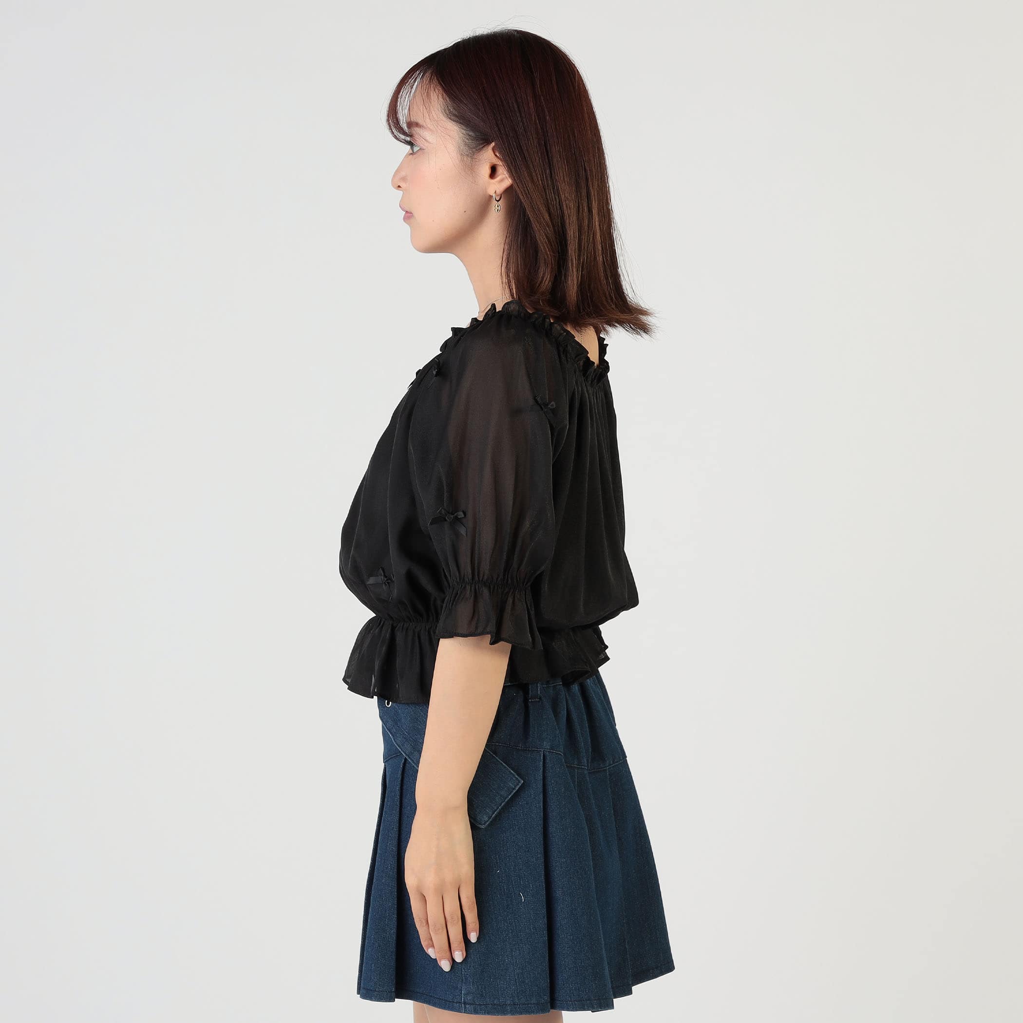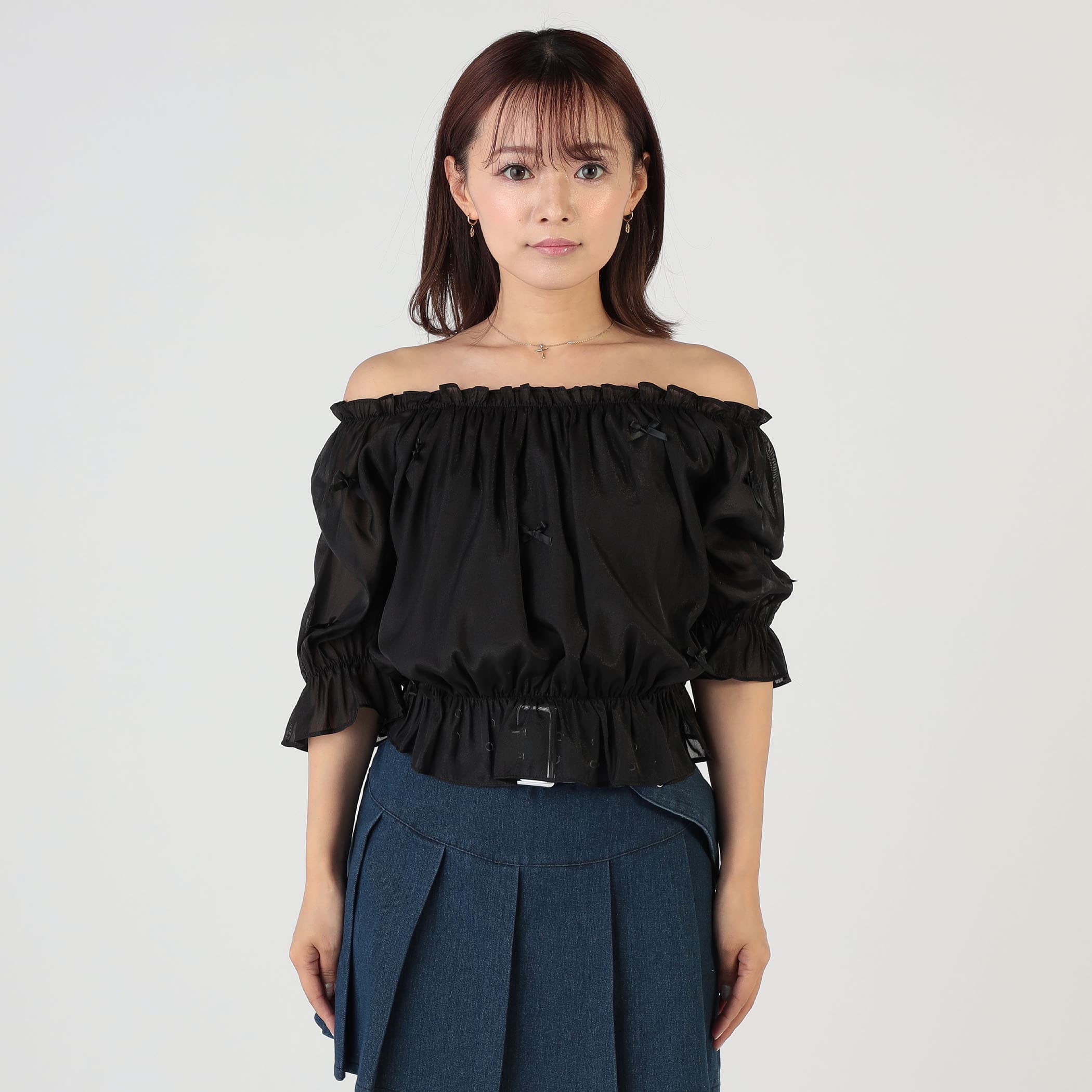 トレンドのリボンがコーデの主役に◎リボンモチーフが付いたスモック。オフショルにもできる2WAY仕様。シックなミニリボンを散りばめた、大人可愛いデザインが魅力の1枚。すっきりと見えるクロップド丈でボトムを選ばず、着回し力も◎アクセサリーいらずで華やかな印象に仕上がる女性らしいアイテムです。