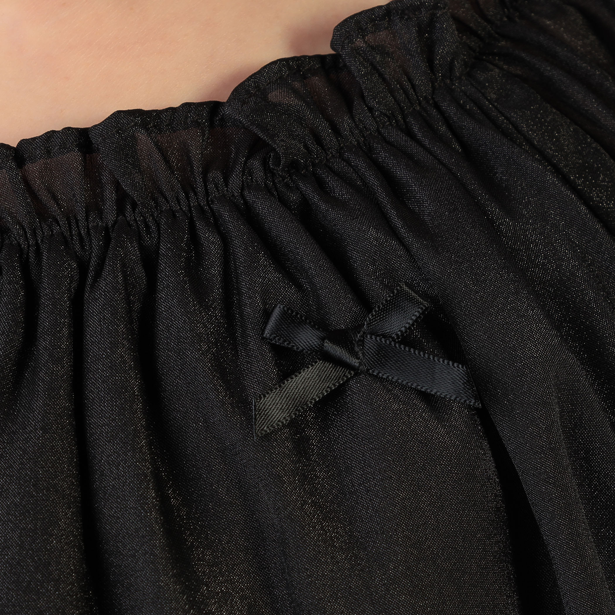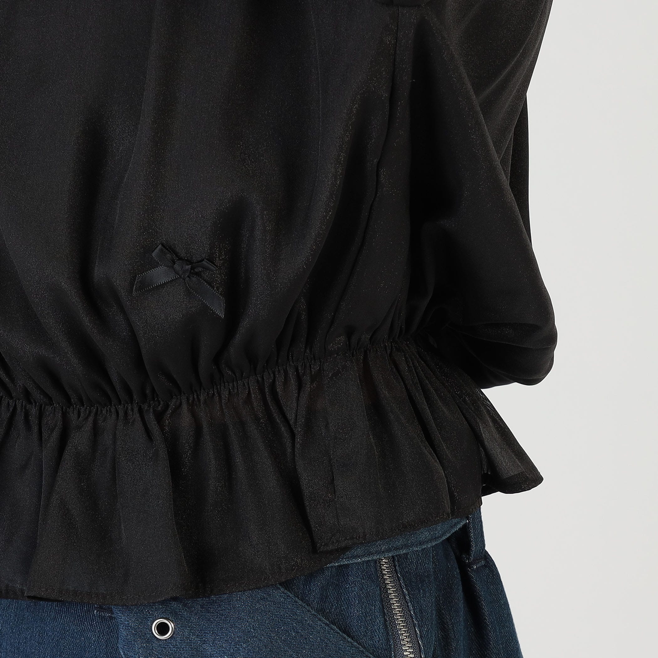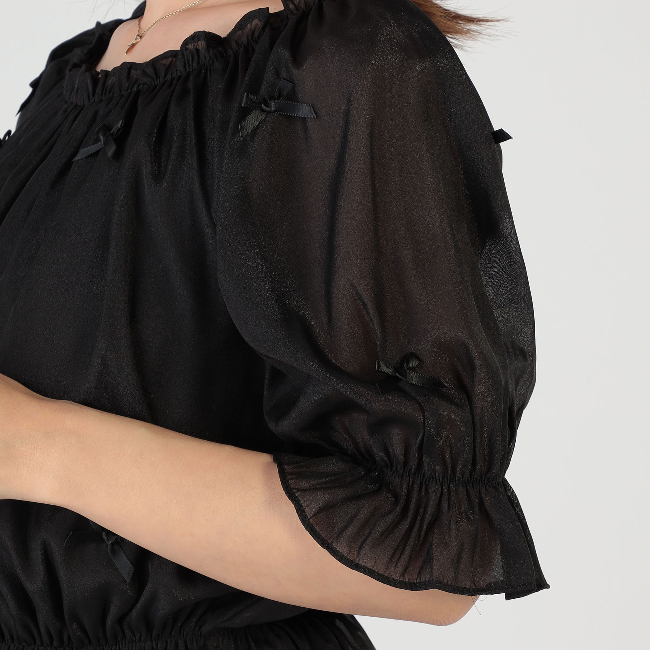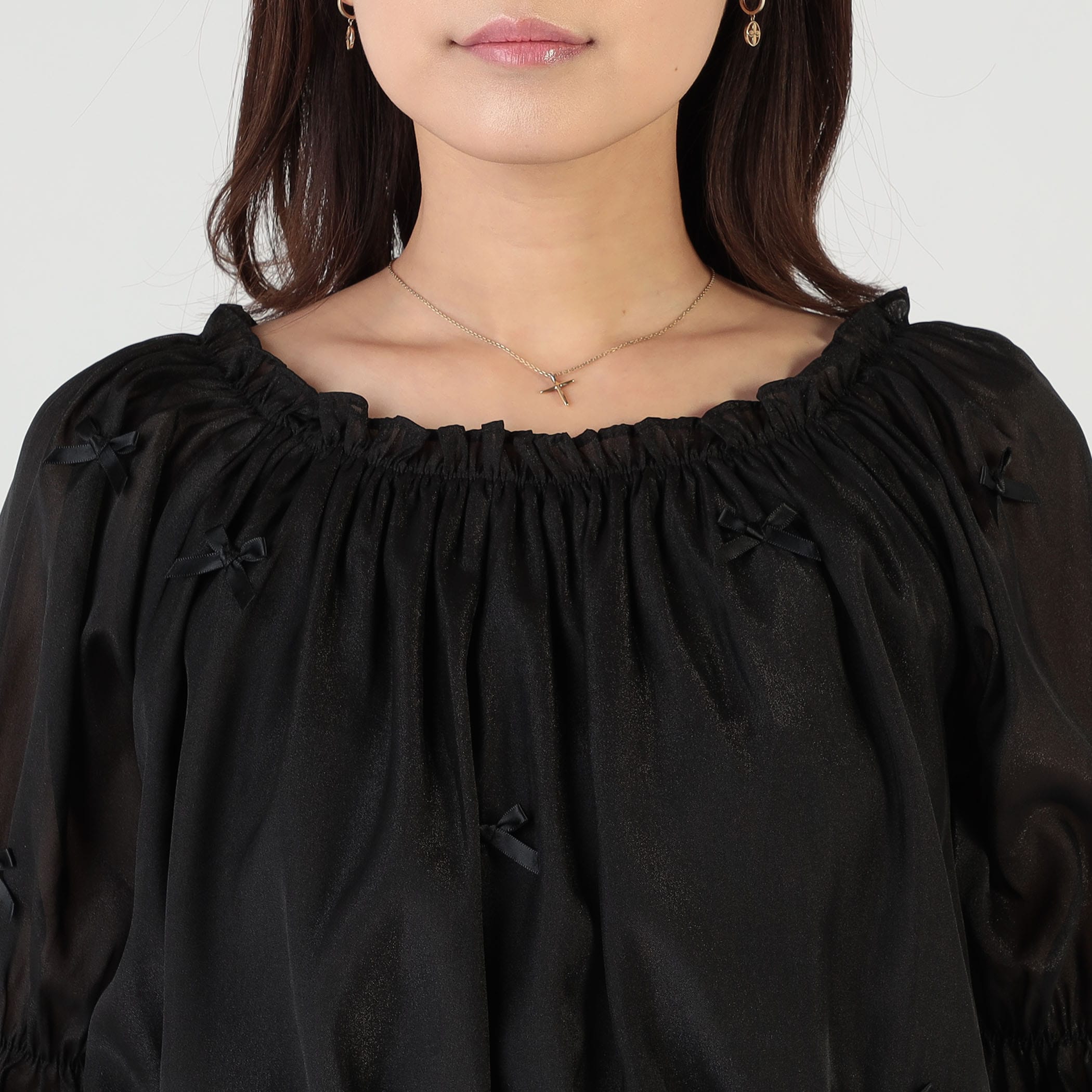 トレンドのリボンがコーデの主役に◎リボンモチーフが付いたスモック。オフショルにもできる2WAY仕様。シックなミニリボンを散りばめた、大人可愛いデザインが魅力の1枚。すっきりと見えるクロップド丈でボトムを選ばず、着回し力も◎アクセサリーいらずで華やかな印象に仕上がる女性らしいアイテムです。