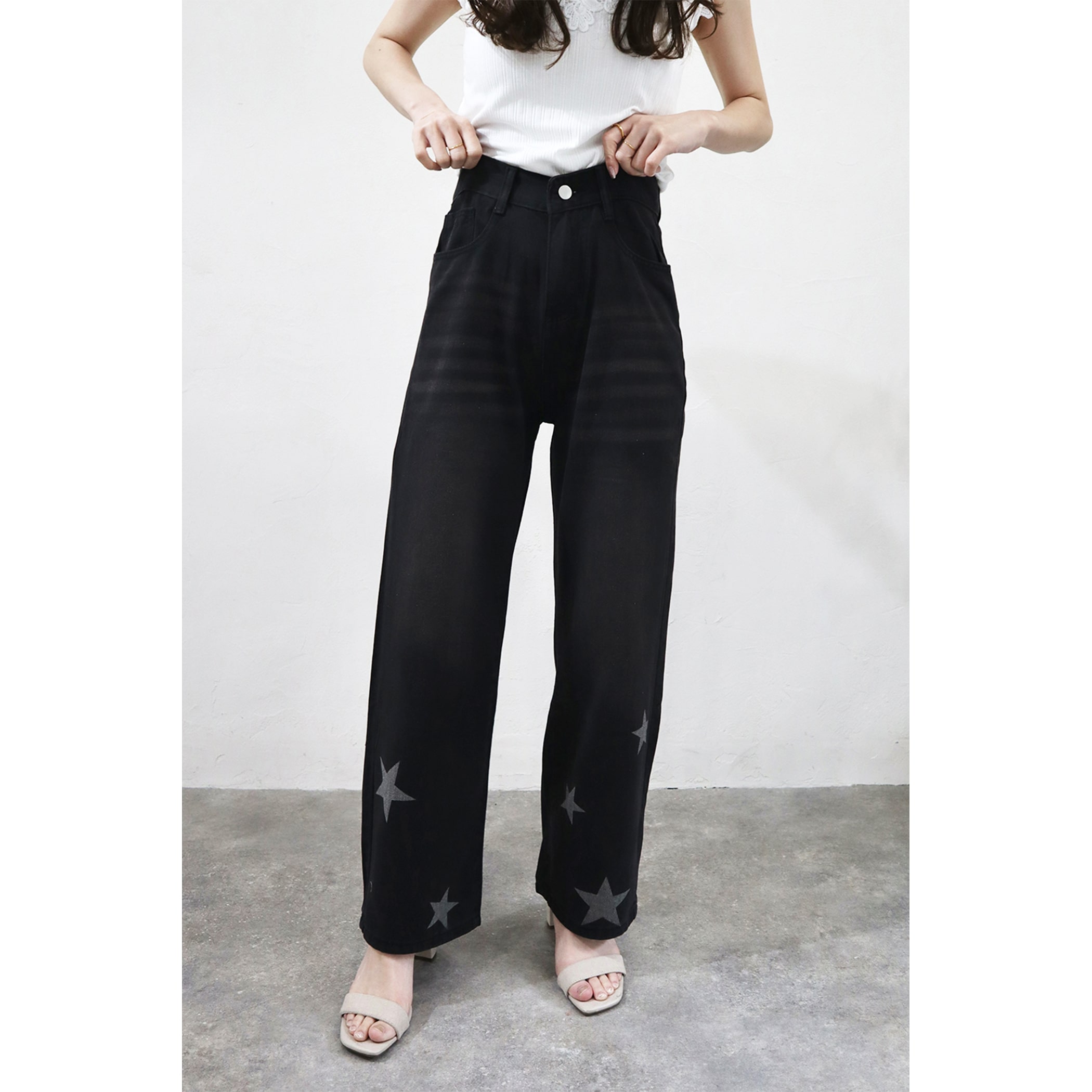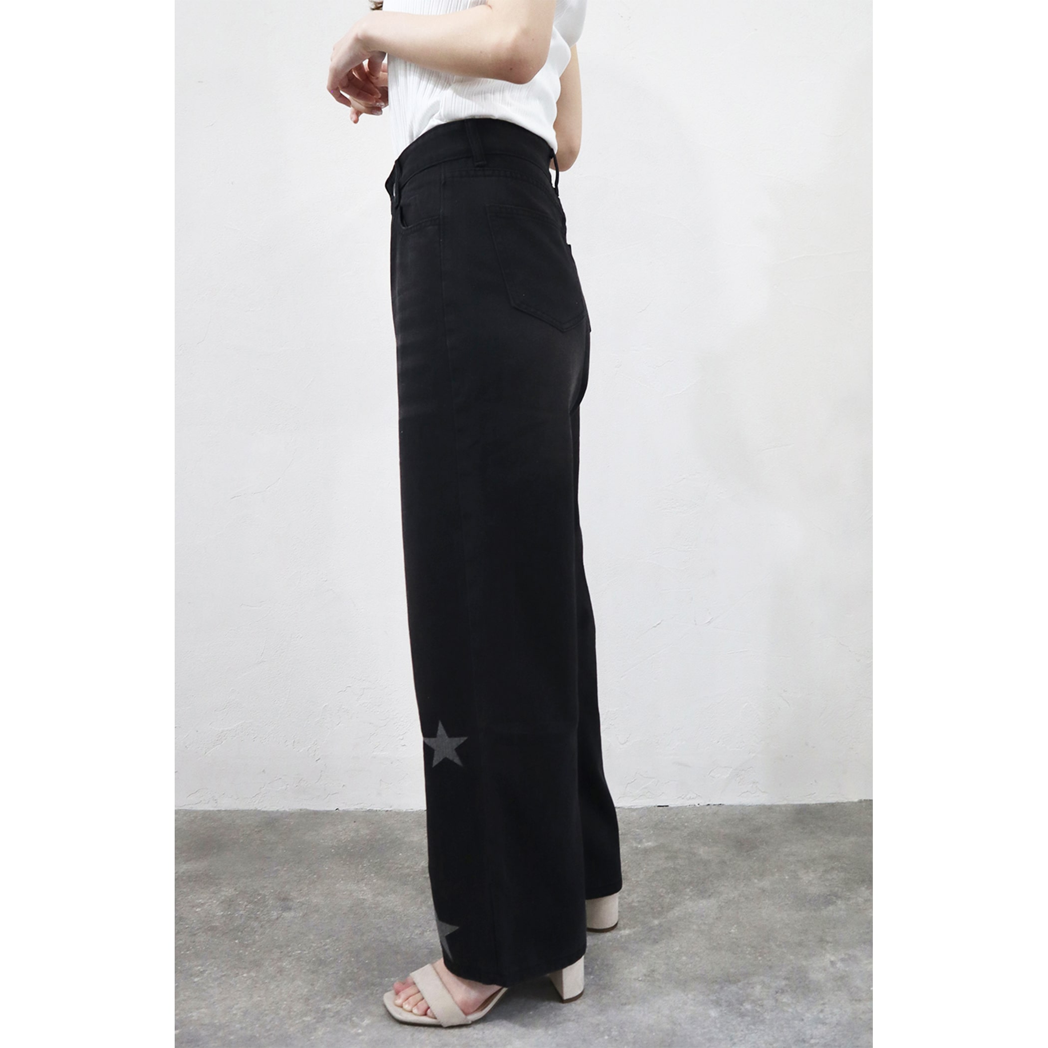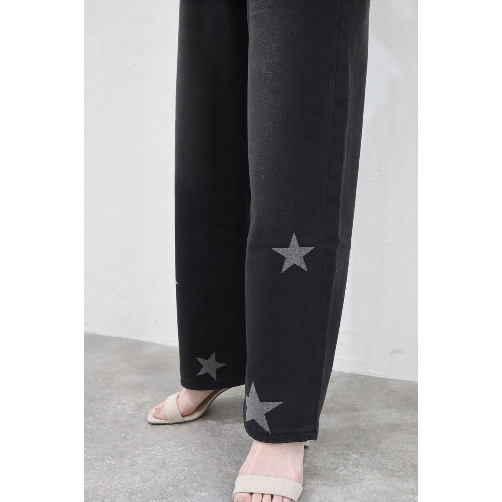 星柄プリントが目を惹くボトムス。ユーズド感ただようこなれたパンツに仕上がりました。ラフにTシャツ合わせでも大人っぽくコーディネートができます。旬のワイドストレートシルエットは脚の形を拾わずまっすぐキレイに見せてくれます。シンプルなデニムパンツ以外にもコーデを楽しみたい方におススメの1本です。