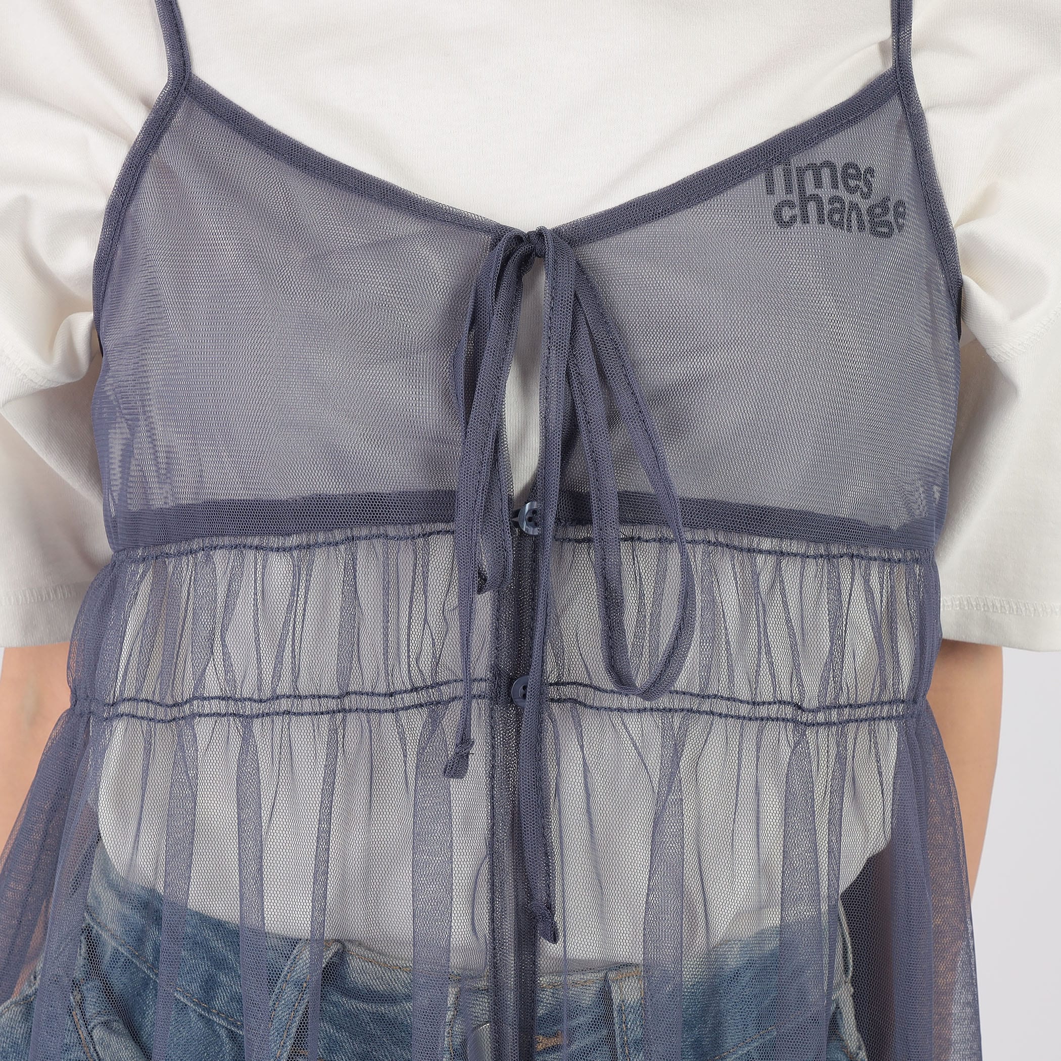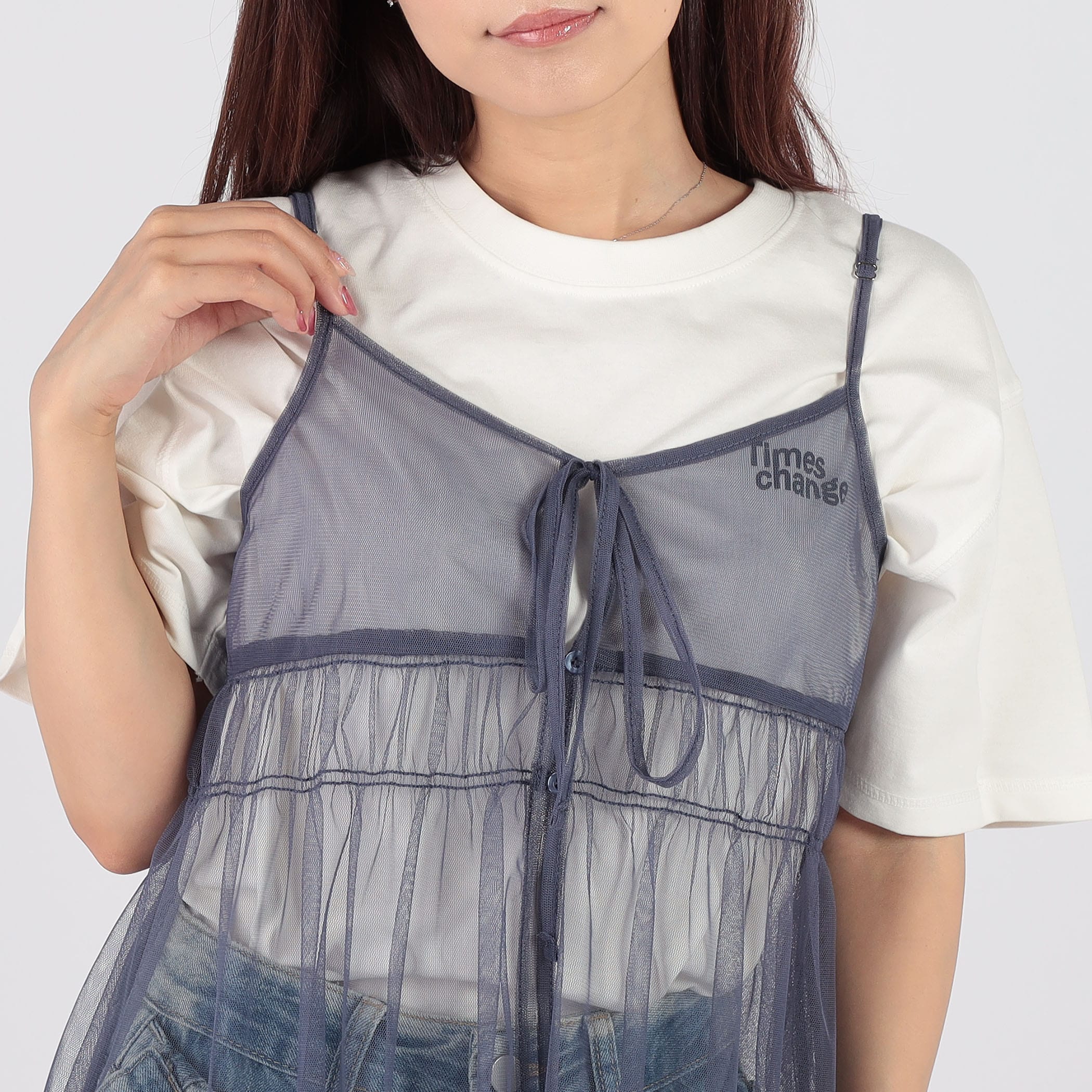 透け感のあるシアーレイヤードコーデが今っぽくきまる、チュールシャーリングキャミソールワンピース。ロゴやデザインのあるスウェットやTシャツにワイドパンツやフレアデニムを合わせてワンピを1枚羽織るだけでカジュアルで今年らしいレイヤードスタイルに。キャミソールやタンクトップにレイヤードしてヘルシーな肌見せスタイルやミニスカートやミディスカートをワンピースの中に仕込んで足元の透け感を楽しんでいただくこともできます◎