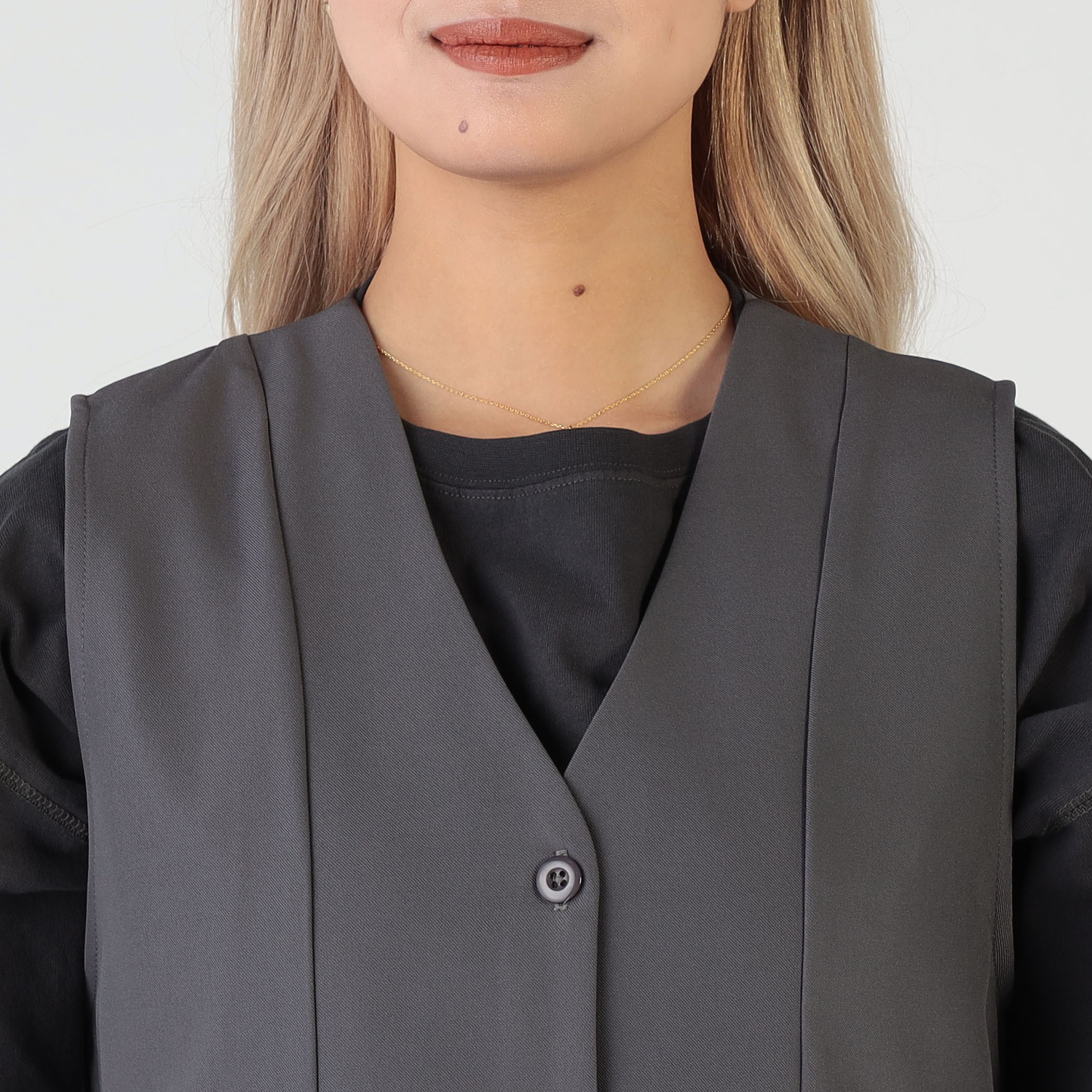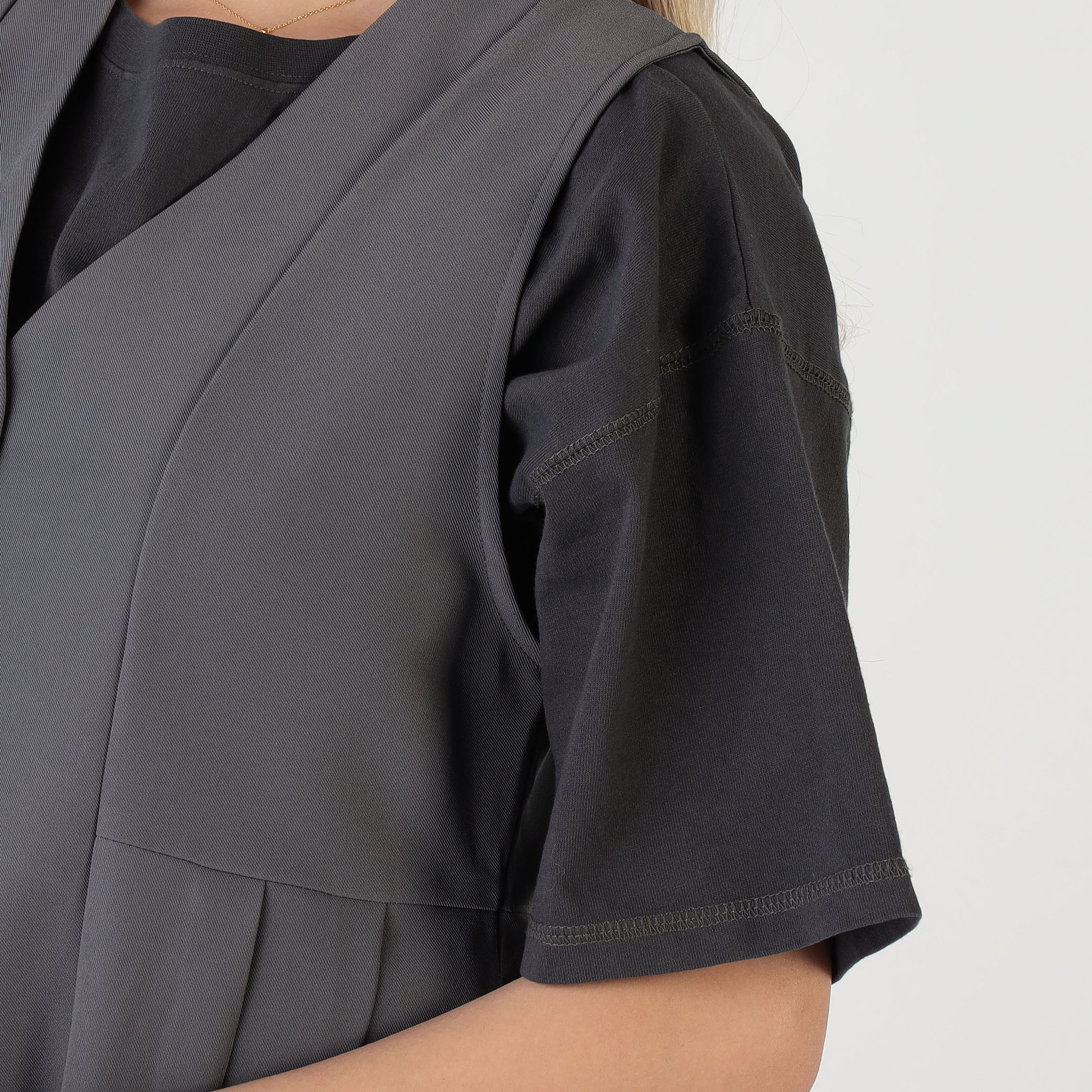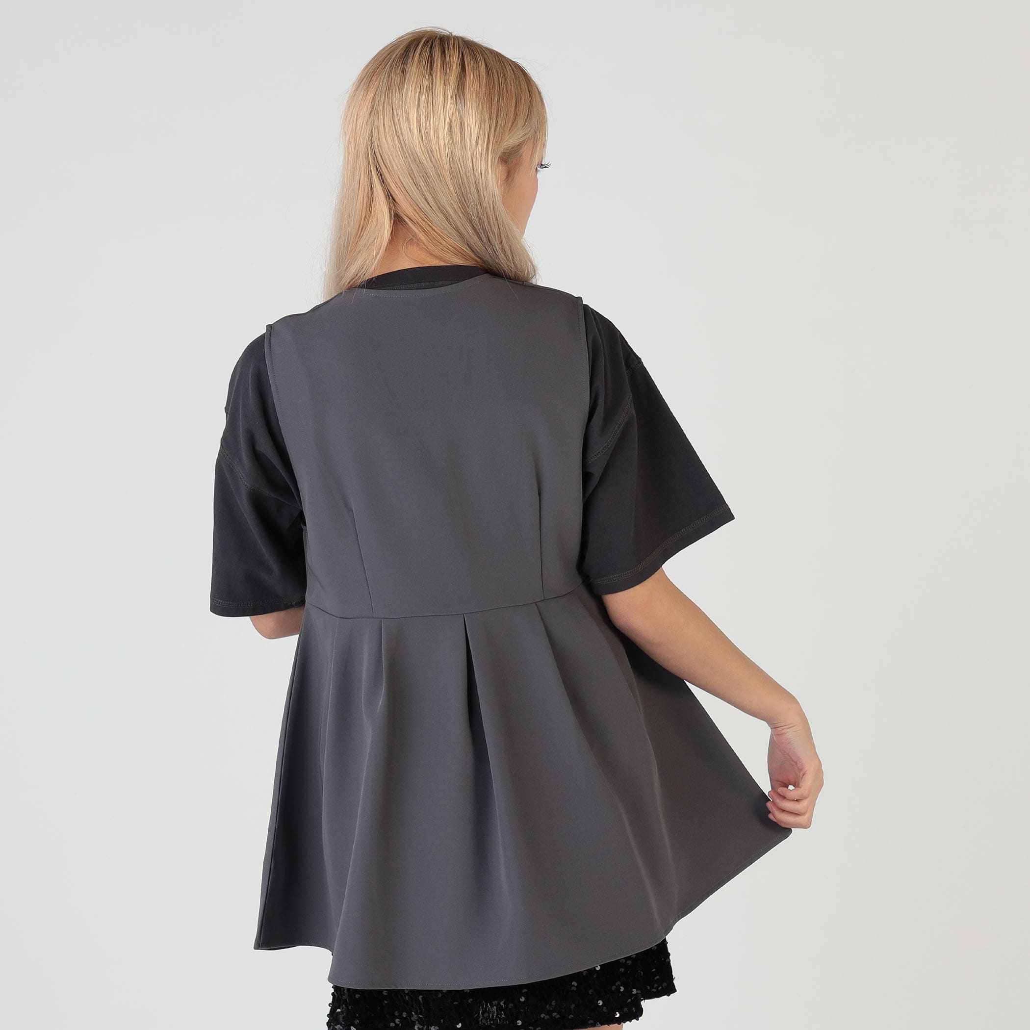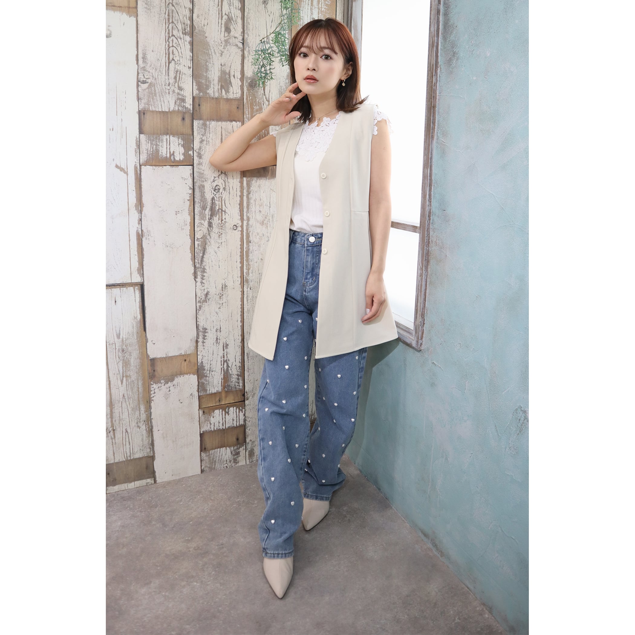オンオフ問わず幅広いシーンで活躍してくれるアイテム。ペプラム仕様のふわっとしたデザインが大人フェミニンな印象に。デニムからスラックスまであらゆるボトムスと相性が抜群なので、1枚持っていると重宝します。インナーとボトムスをワントーンに合わせて、ジレをプラスすればメリハリのあるお出かけ大人スタイルに。インナーは、Tシャツやシアートップスから、タンクやキャミで肌魅せしたスタイリングもオススメ◎前ボタンを全て開けてラフに羽織っていただく、ジレスタイリングもワンランク上の着こなしが叶います!