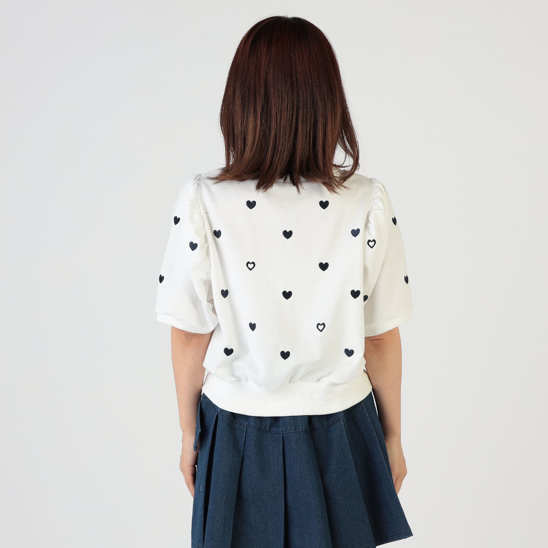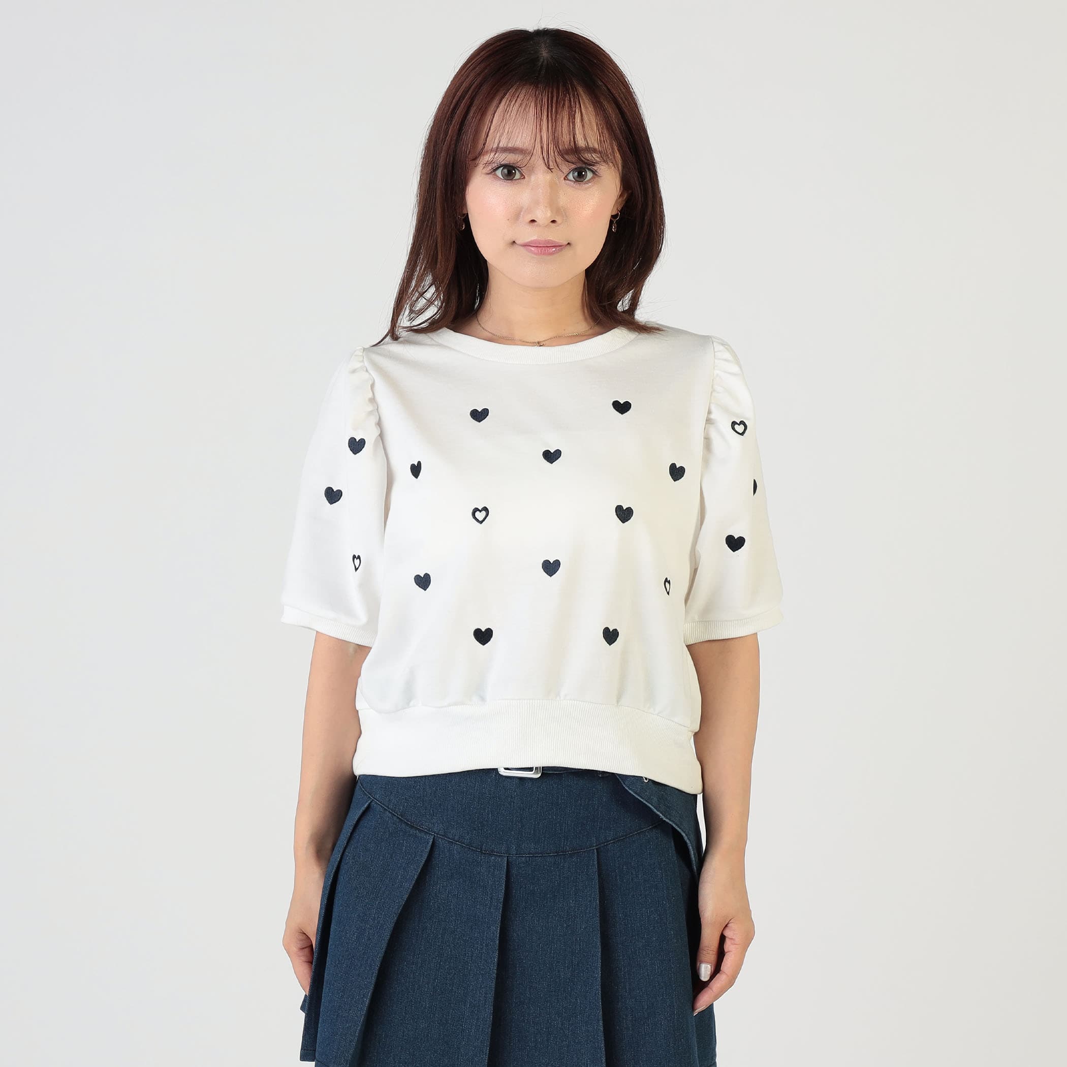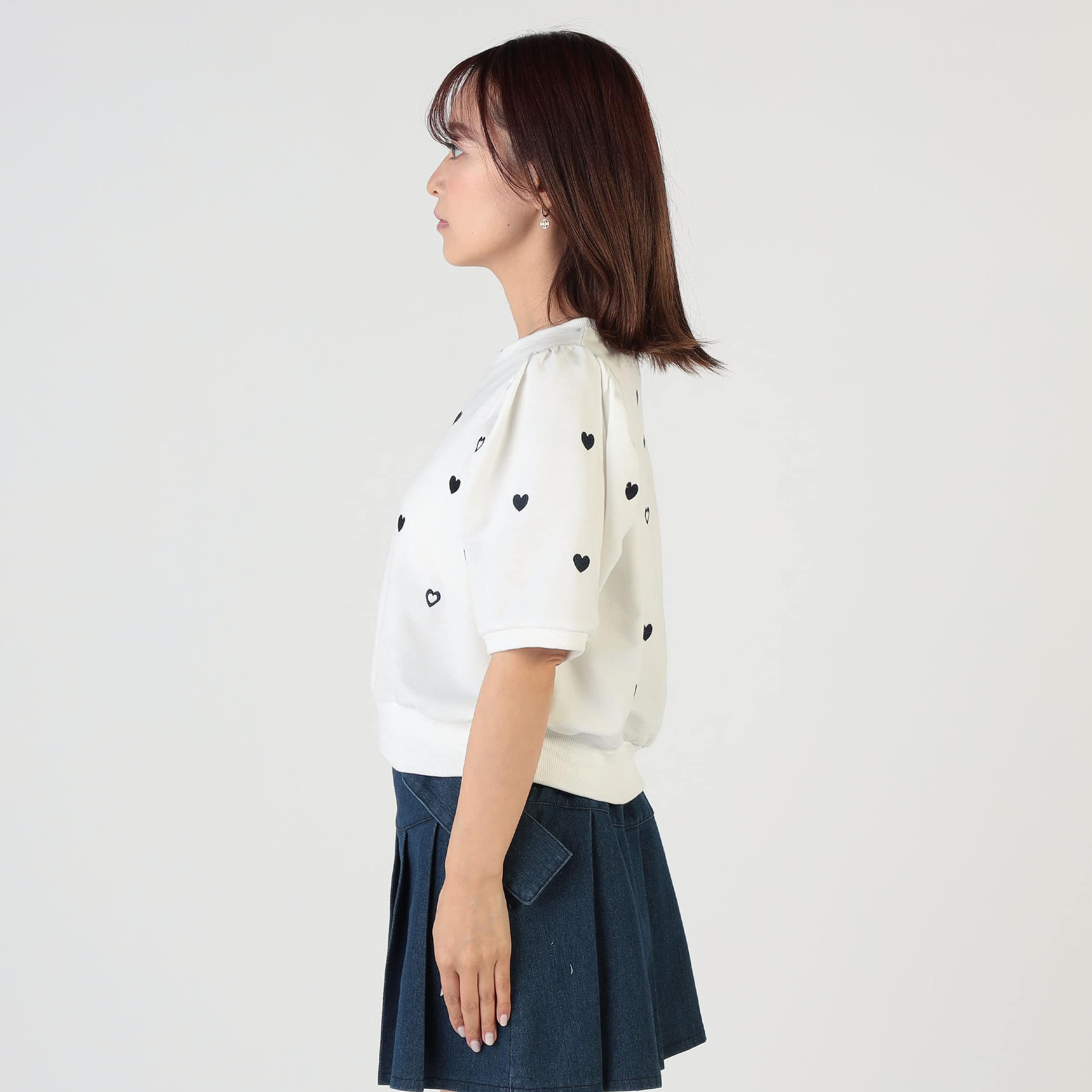 T/Cミニ裏毛 ハート総柄刺繍半袖トップス