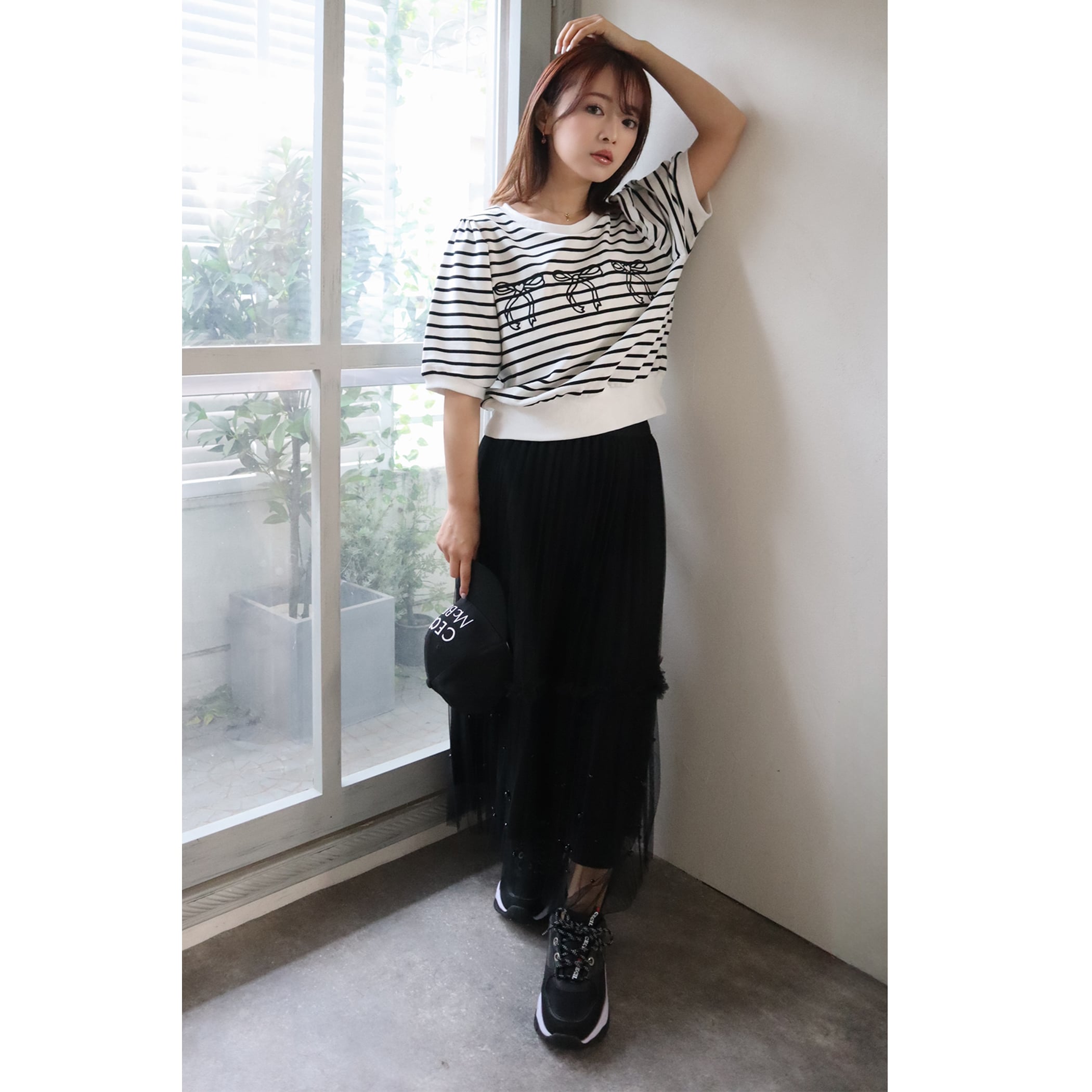 可愛いリボン刺繍が3つ並んだ半袖スウェットトップス。コーデに取り入れるだけで華やかなスタイルが完成します。メイン使いはもちろんサロペやキャミワンピのインナーとしてもおすすめ◎甘すぎないカラー配色で大人可愛く着こなせる一着です。なめらかな表面感がカジュアルすぎず女性らしい印象に。インでもアウトでもバランスのとりやすい丈感で着こなしの幅も広がります。