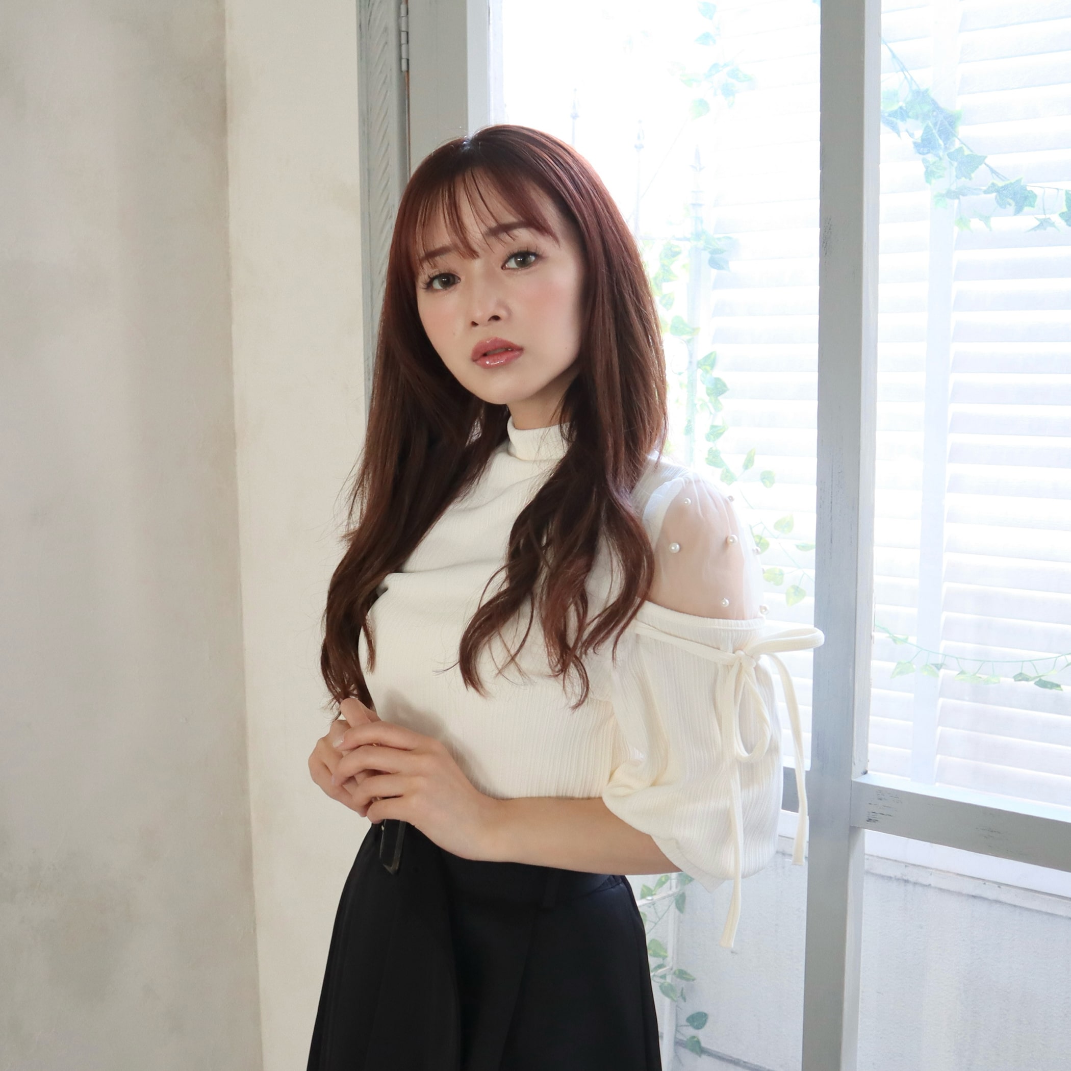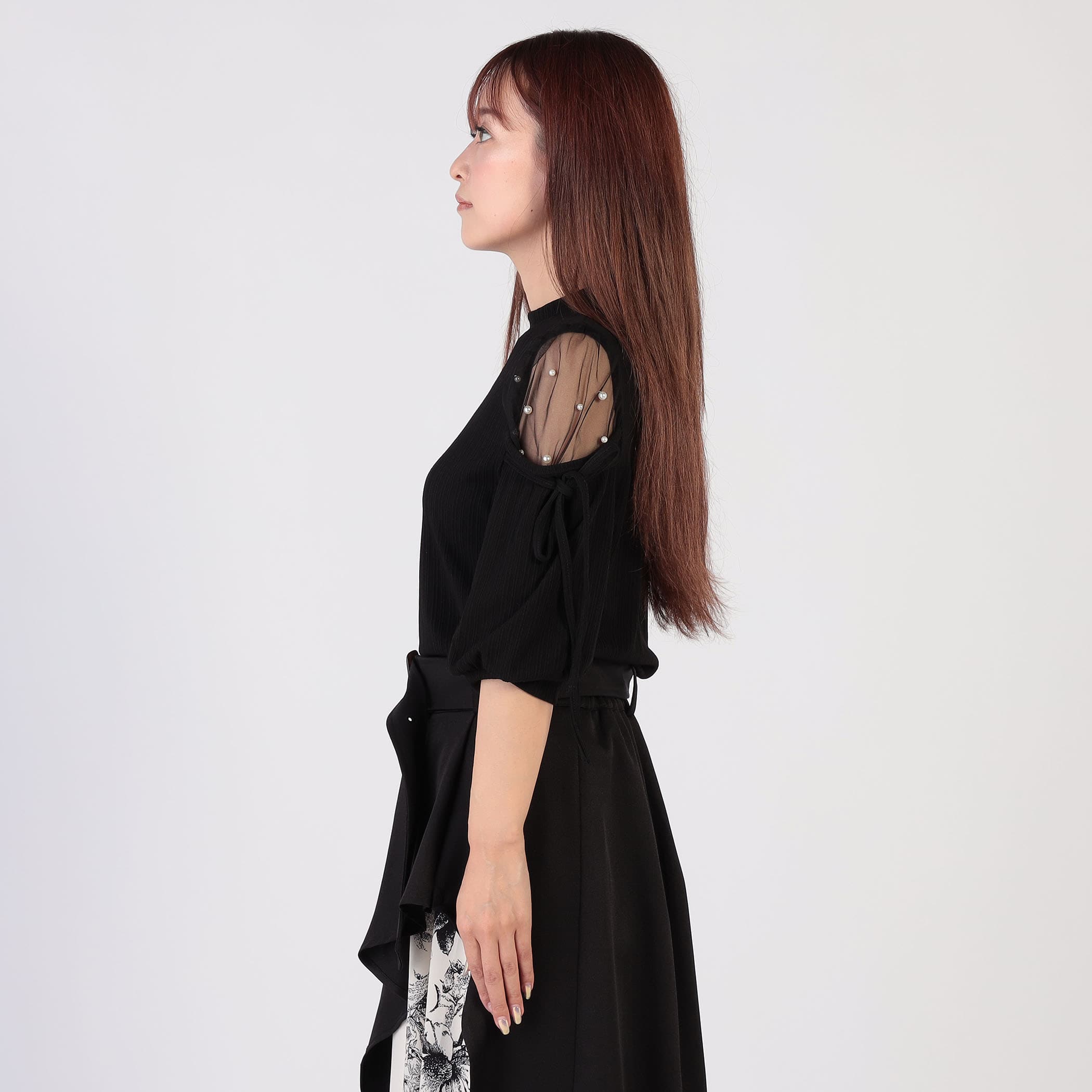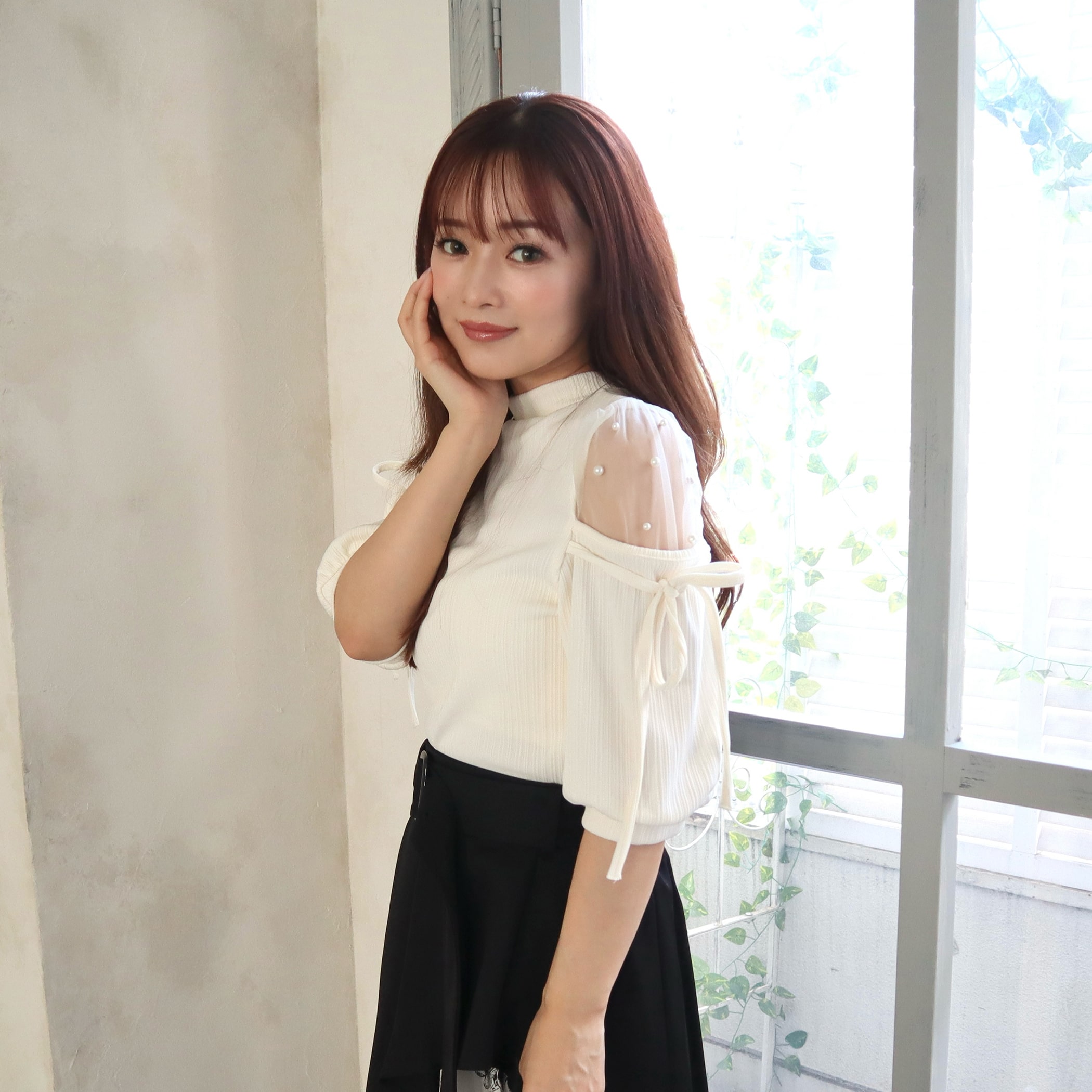 シアーパールで切り替えられたショルダー部分が抜け感を演出するプルオーバー。スリーブにはリボンを施し、フェミニンな印象をプラスします。凹凸感のあるテレコ生地が肌触りの良い着心地◎ボトムスにタックインしたメリハリのあるコーディネートがおすすめです。