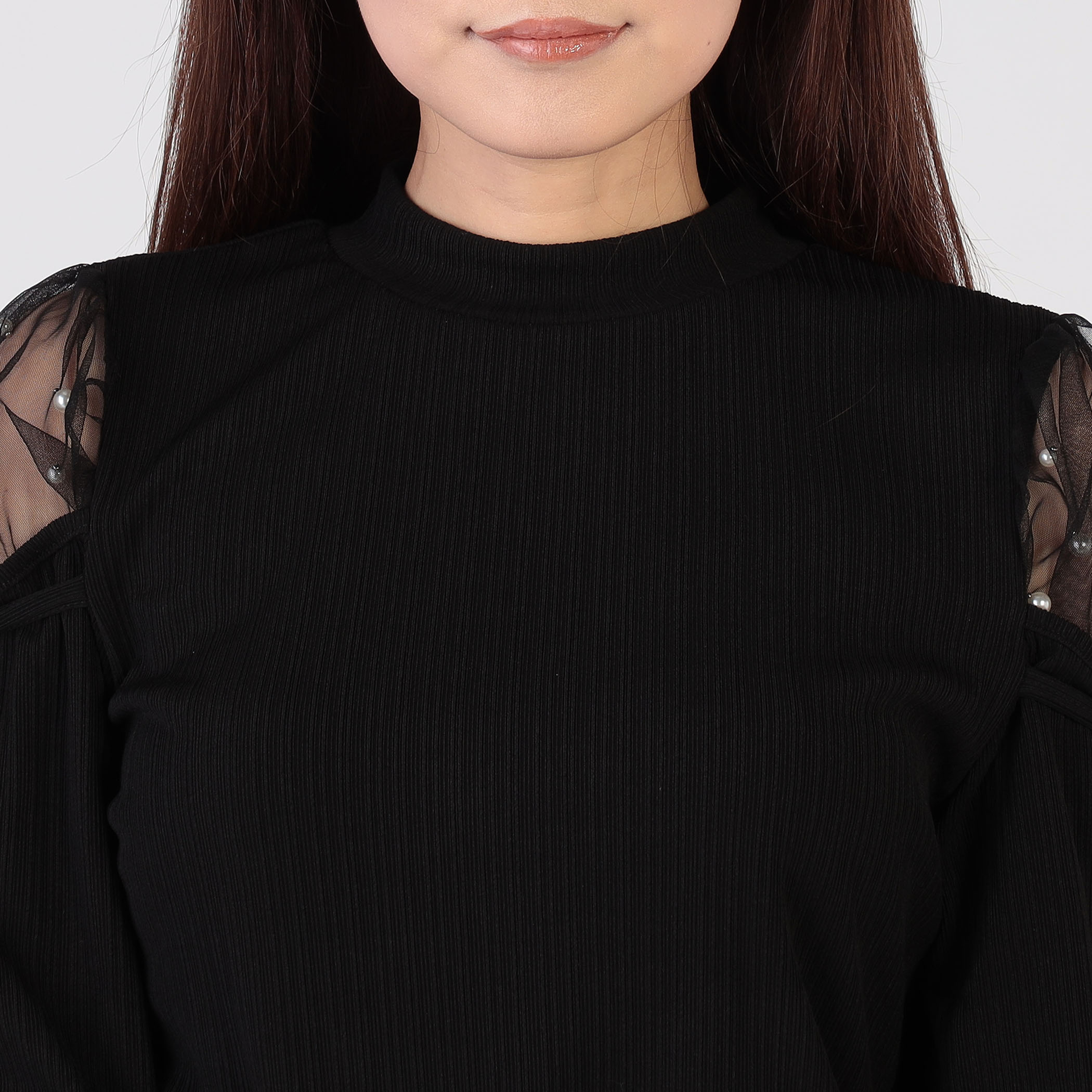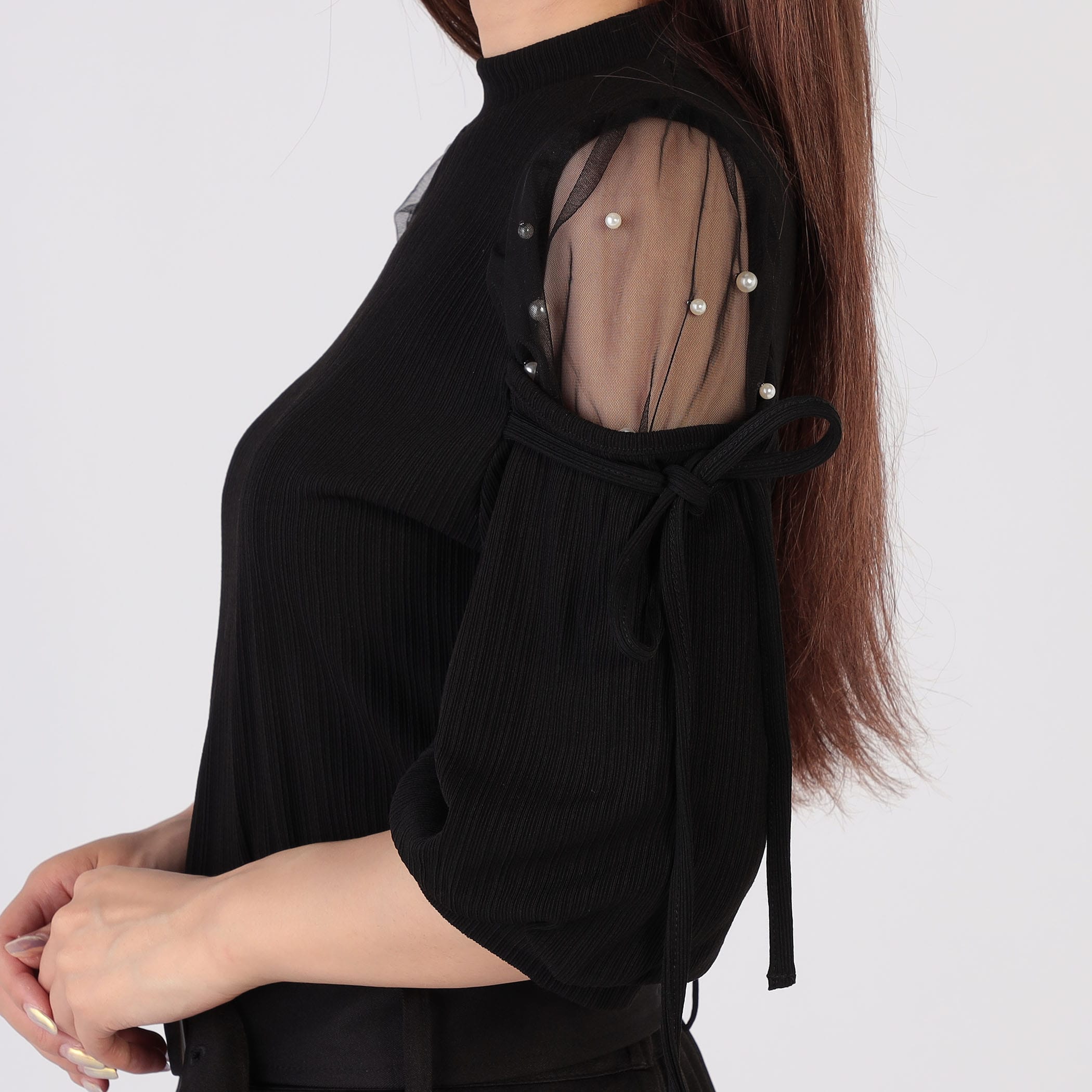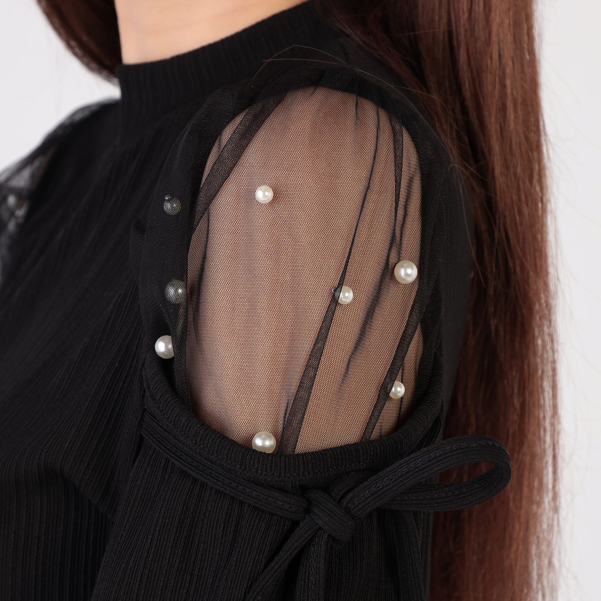 シアーパールで切り替えられたショルダー部分が抜け感を演出するプルオーバー。スリーブにはリボンを施し、フェミニンな印象をプラスします。凹凸感のあるテレコ生地が肌触りの良い着心地◎ボトムスにタックインしたメリハリのあるコーディネートがおすすめです。
