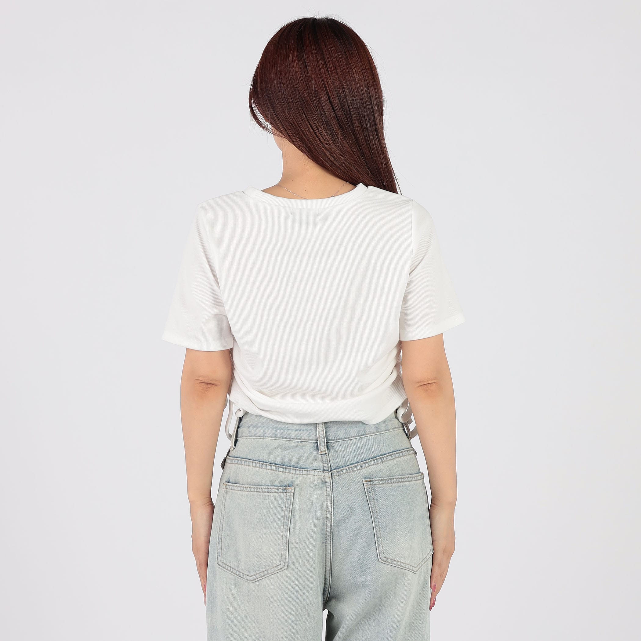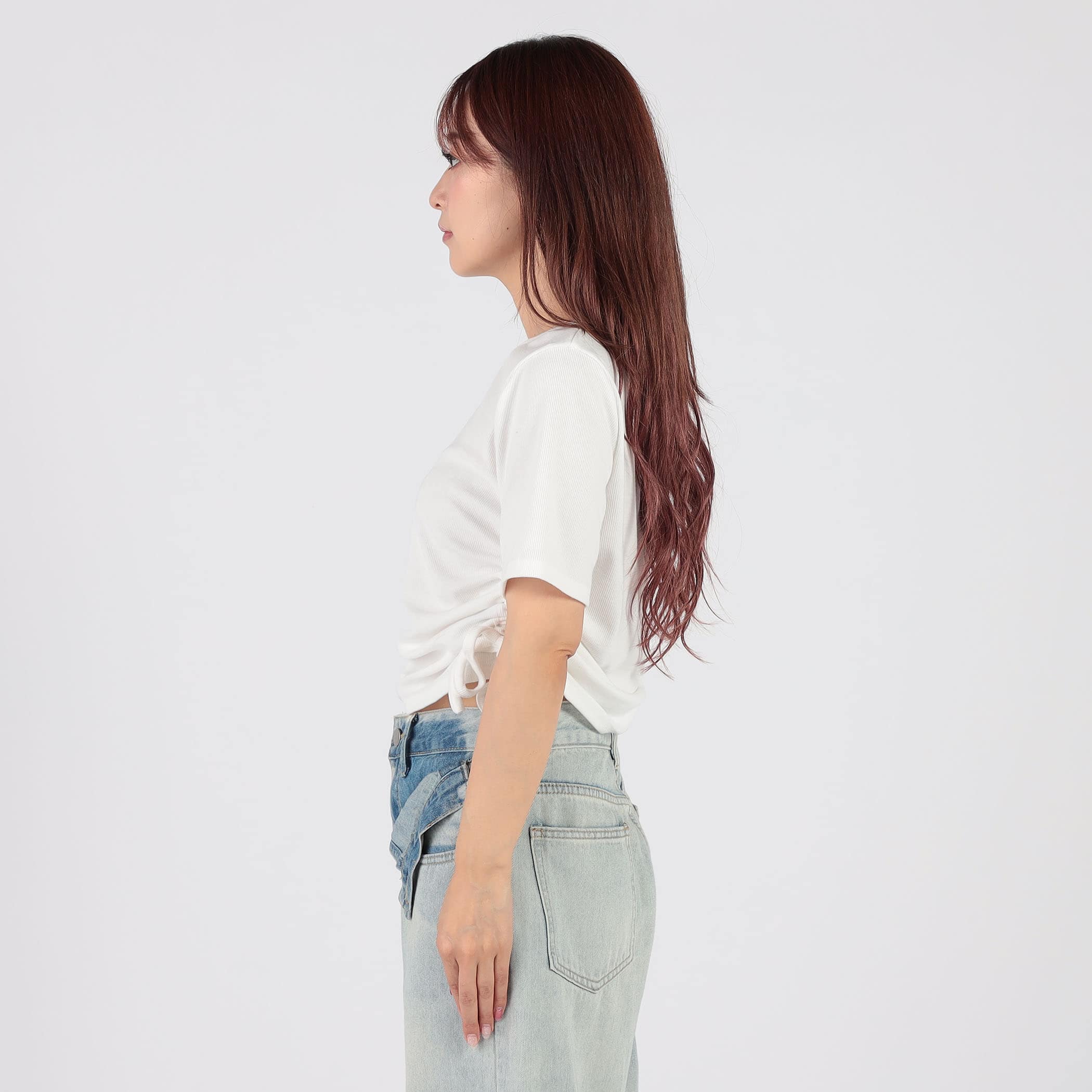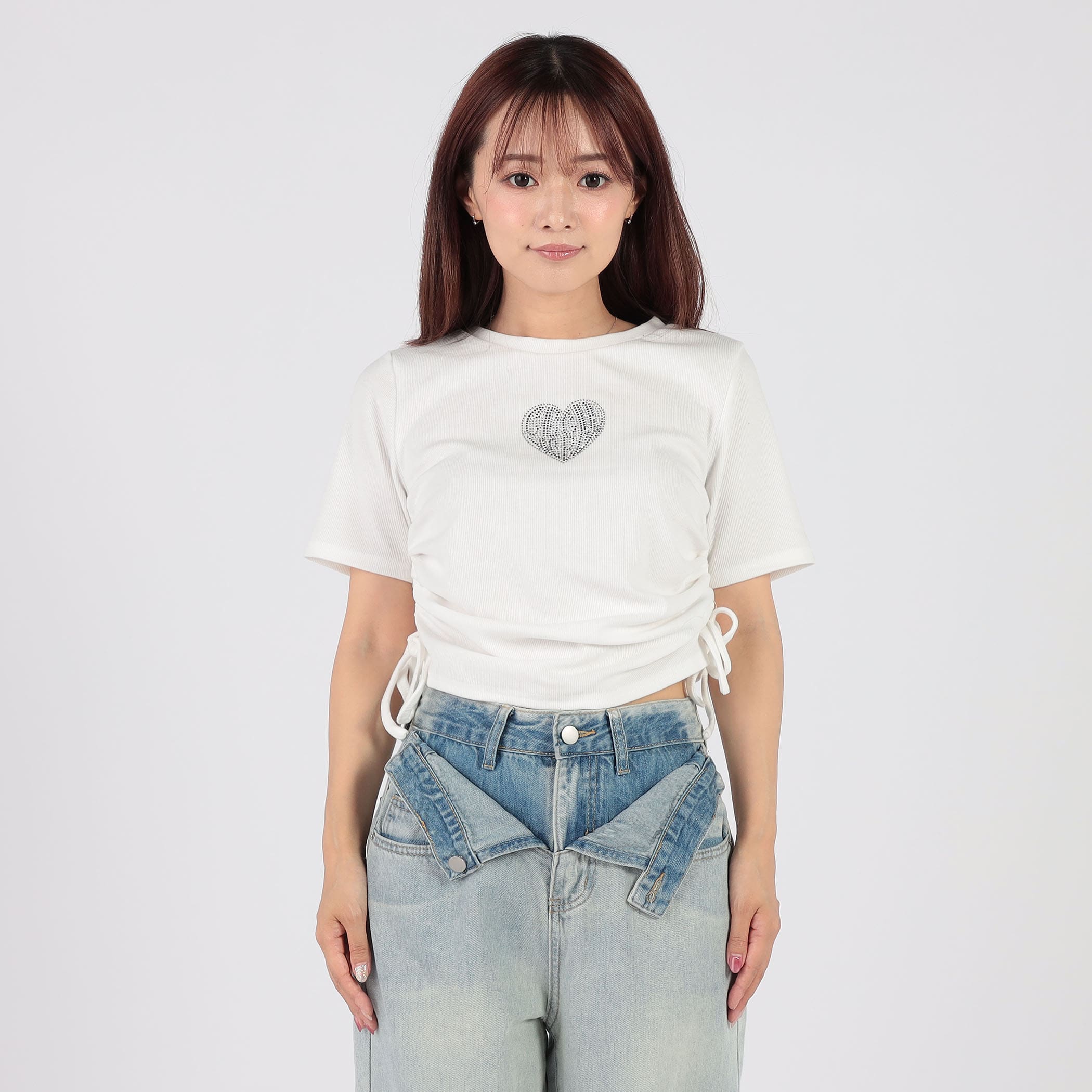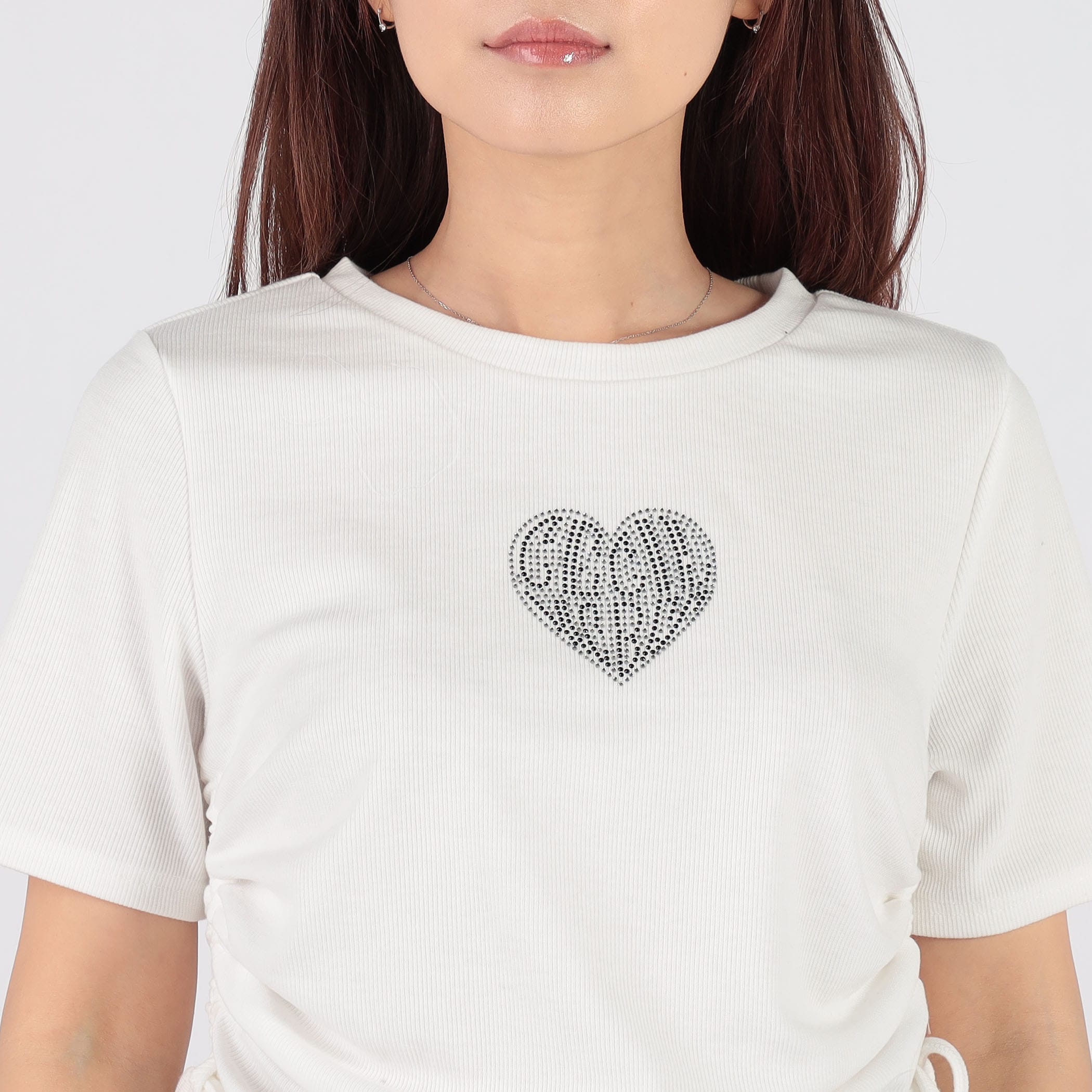 ラインストーンロゴが可愛いリブTシャツ。今期トレンドの脇のドロスト仕様で好きな丈感にアレンジできるのが嬉しいポイント★様々なボトムに合うので、着回しできる万能アイテムです!!