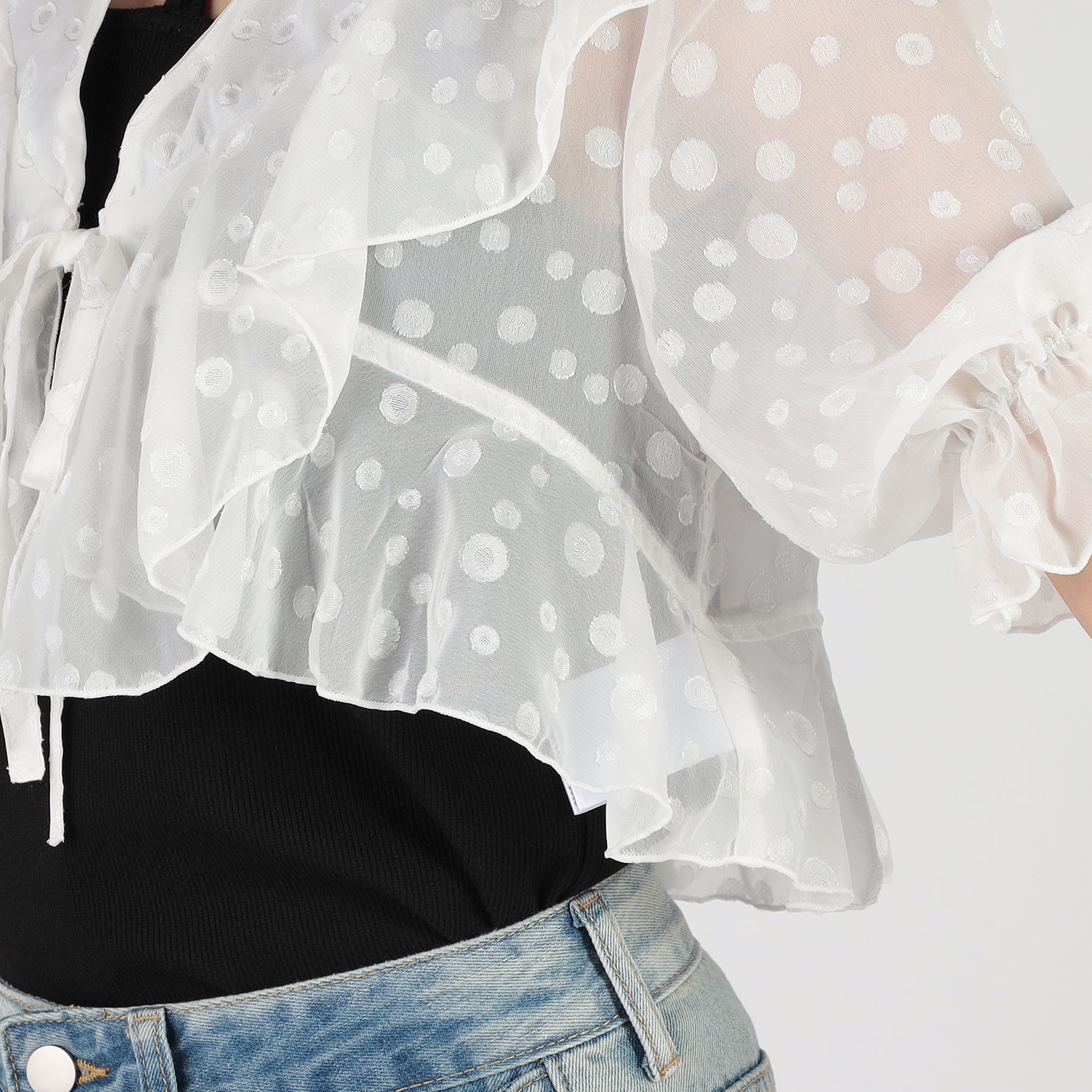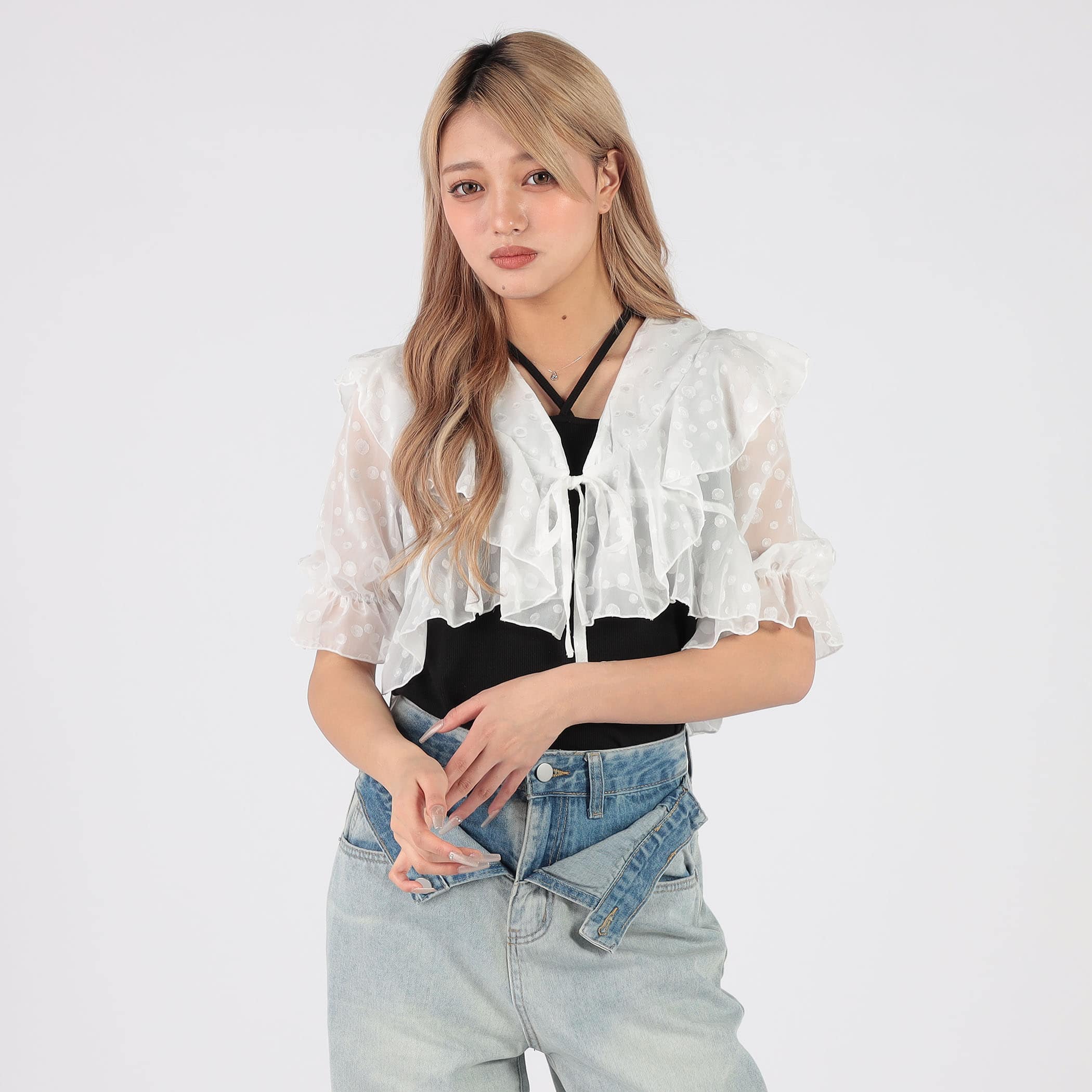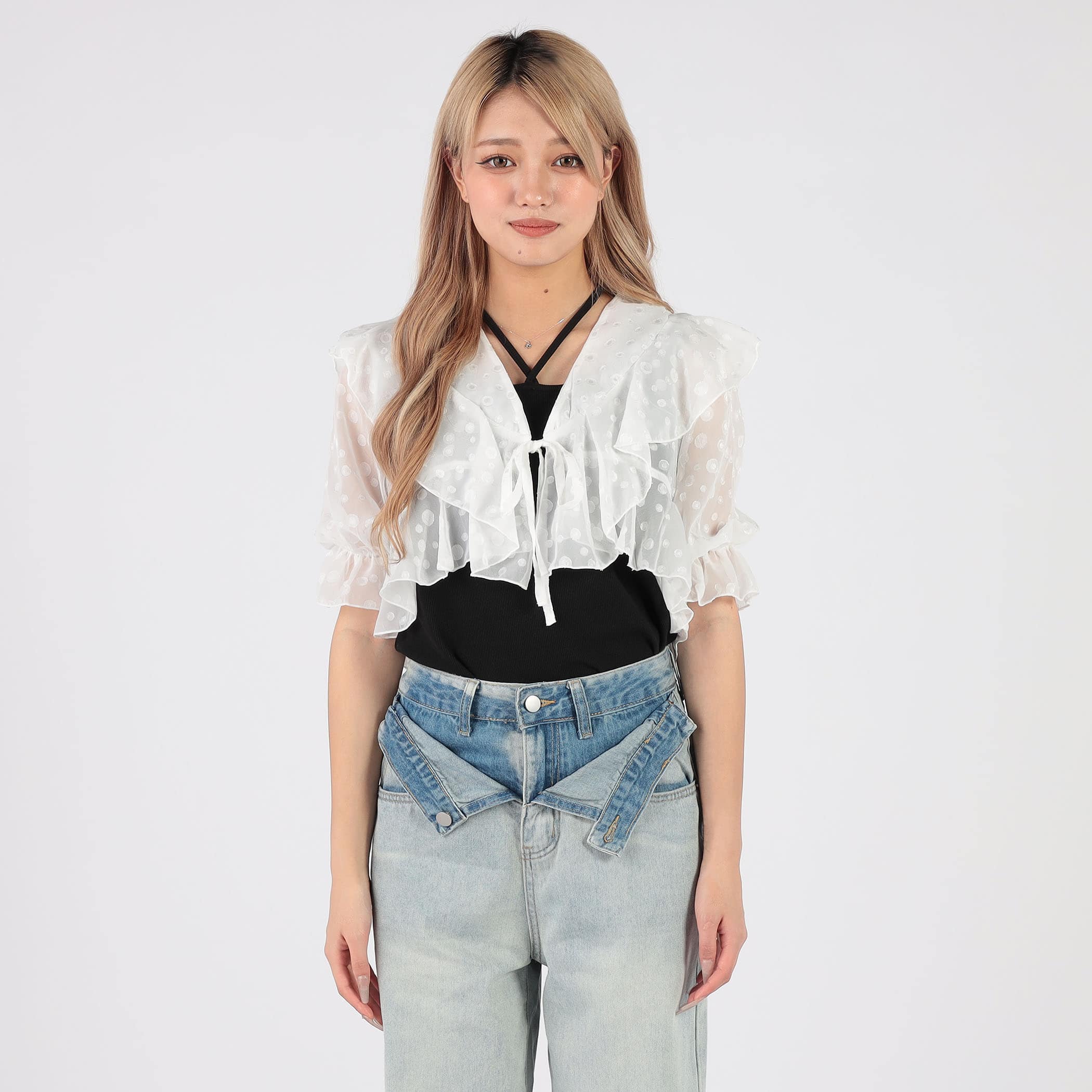 ラッフルデザインが可愛いフリルブラウス。シフォン素材のさりげない透け感が今年らしいコーディネートを演出。袖口がキャンディースリーブになっているのも可愛いポイント☆フロントをリボンで結ぶデザインなので、ブラウスとしても、前を開けて軽い羽織りとして着ても使える1着です。