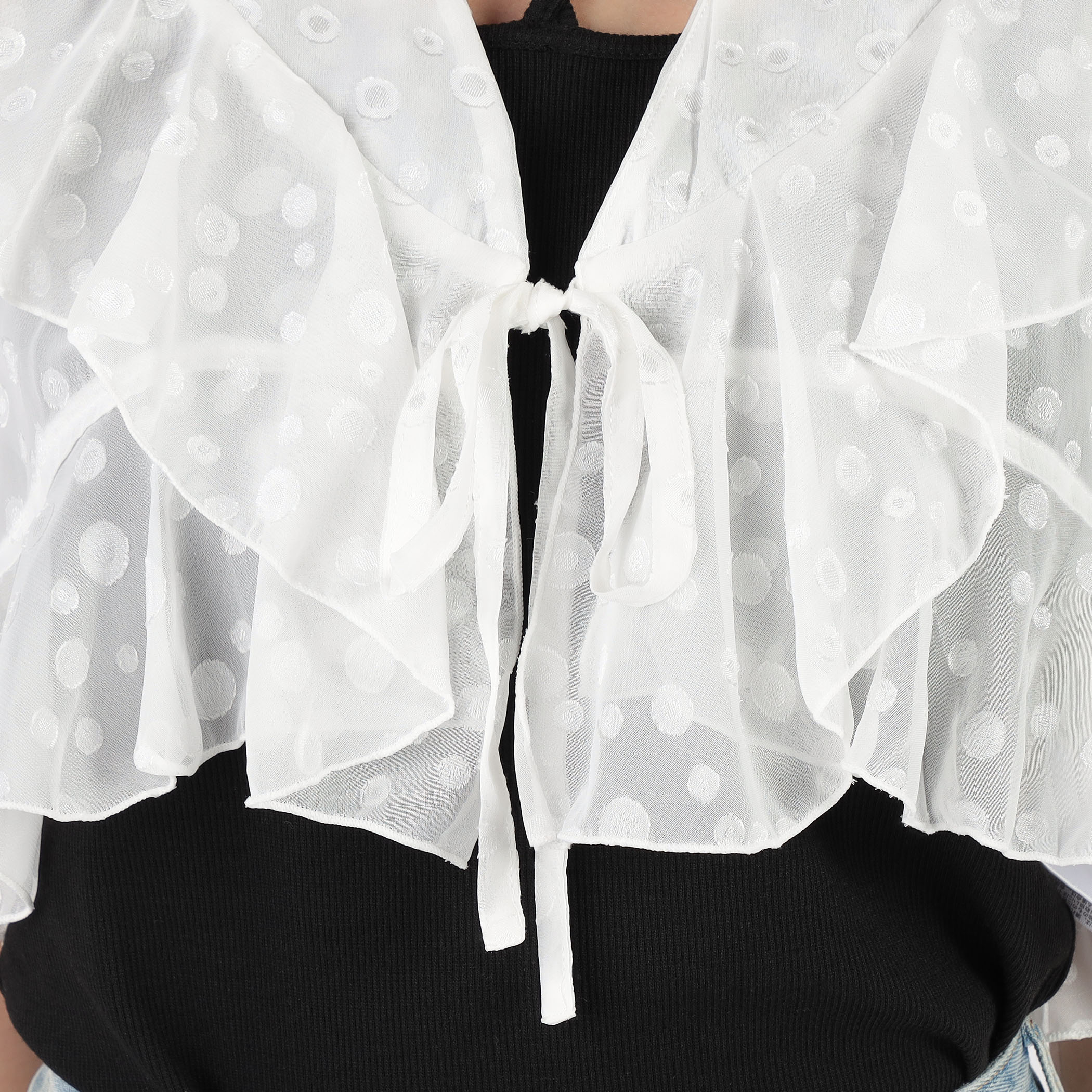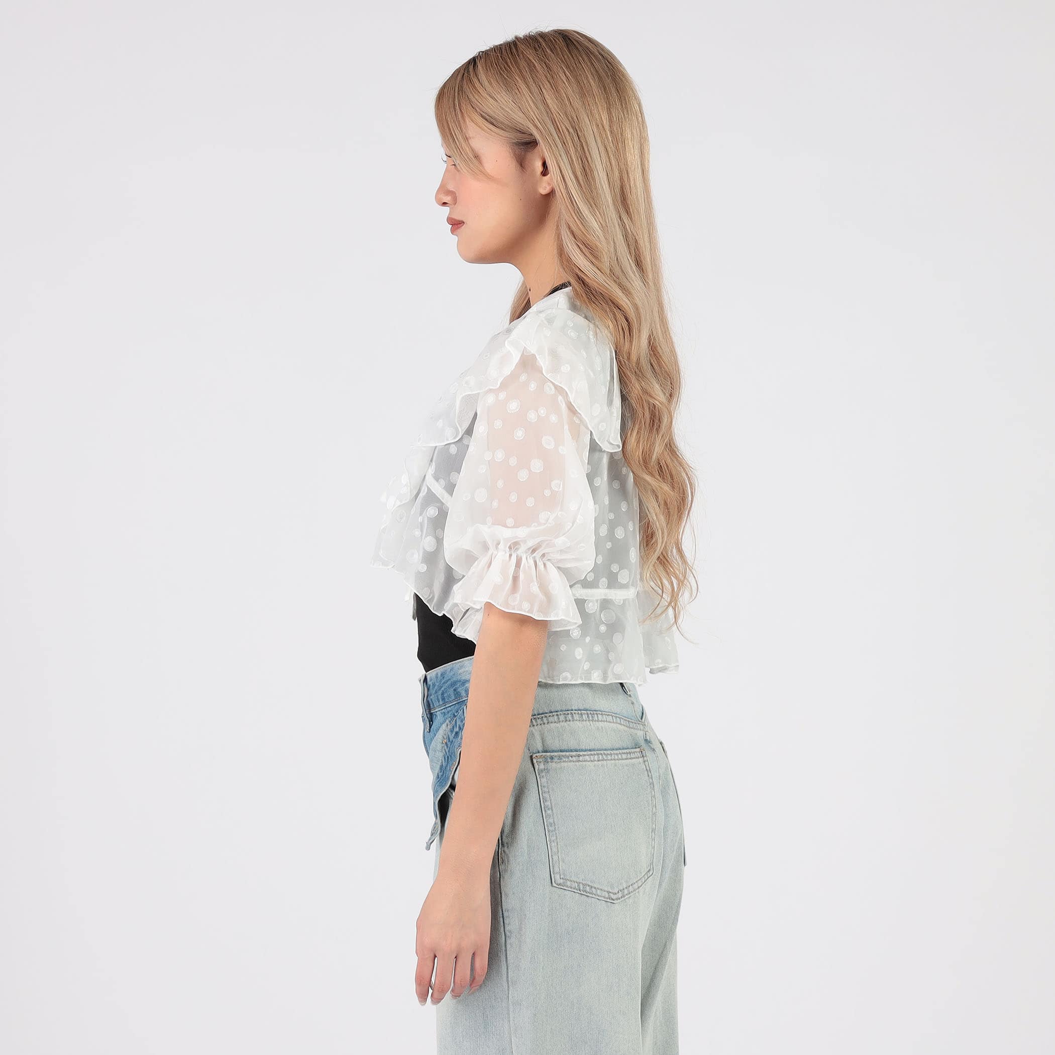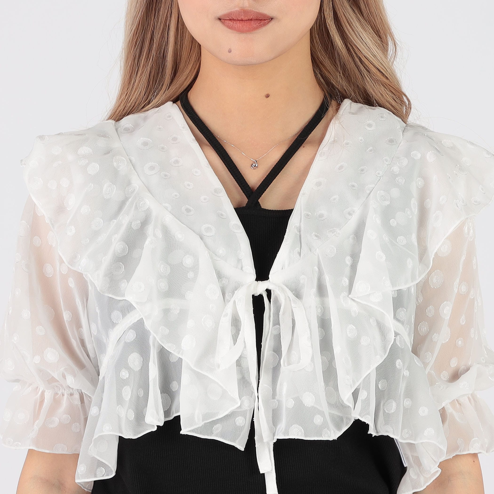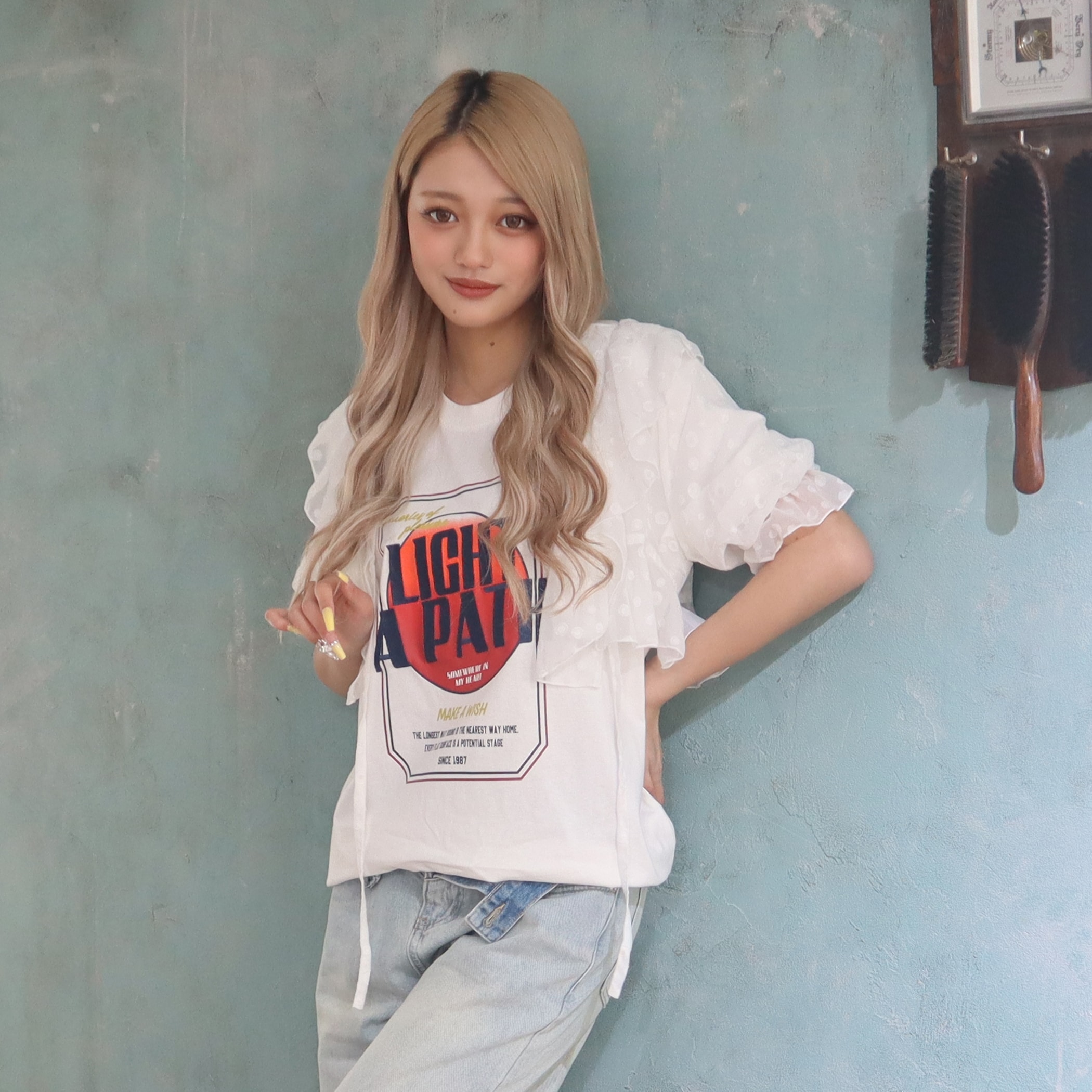 ラッフルデザインが可愛いフリルブラウス。シフォン素材のさりげない透け感が今年らしいコーディネートを演出。袖口がキャンディースリーブになっているのも可愛いポイント☆フロントをリボンで結ぶデザインなので、ブラウスとしても、前を開けて軽い羽織りとして着ても使える1着です。