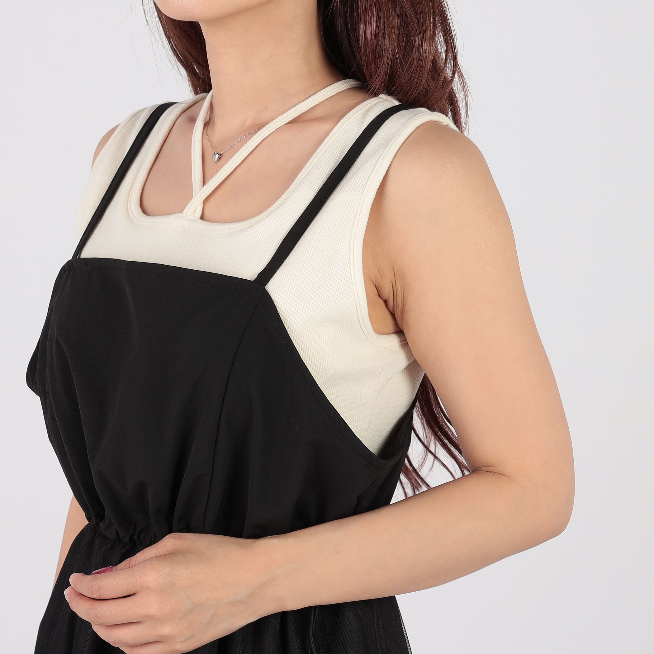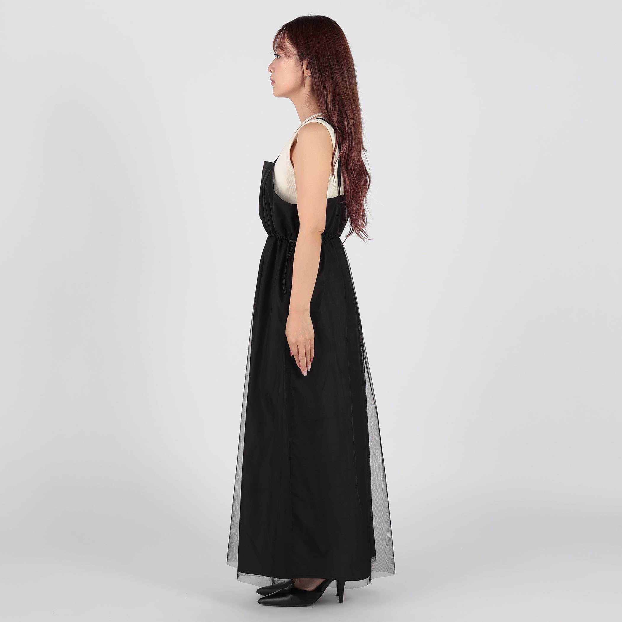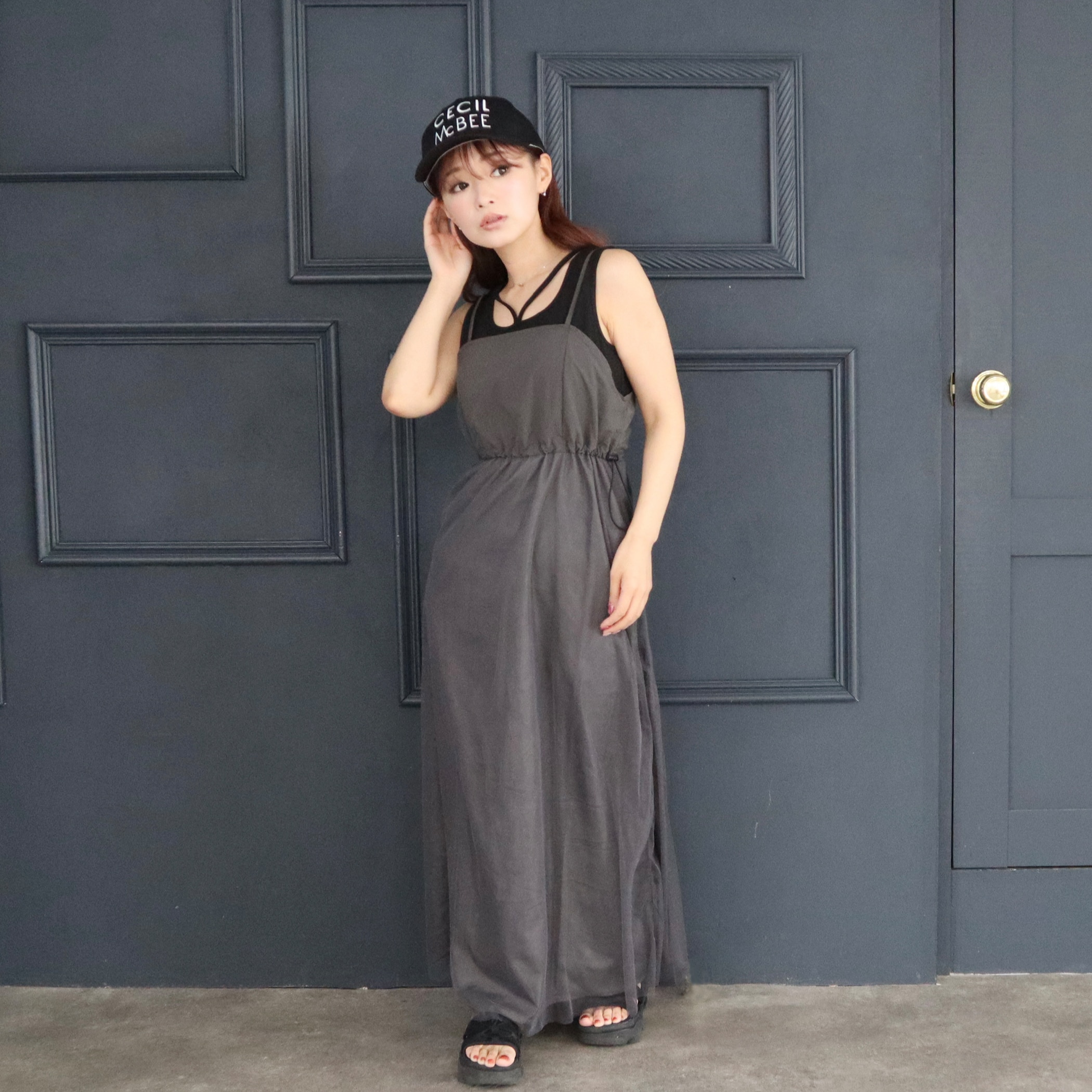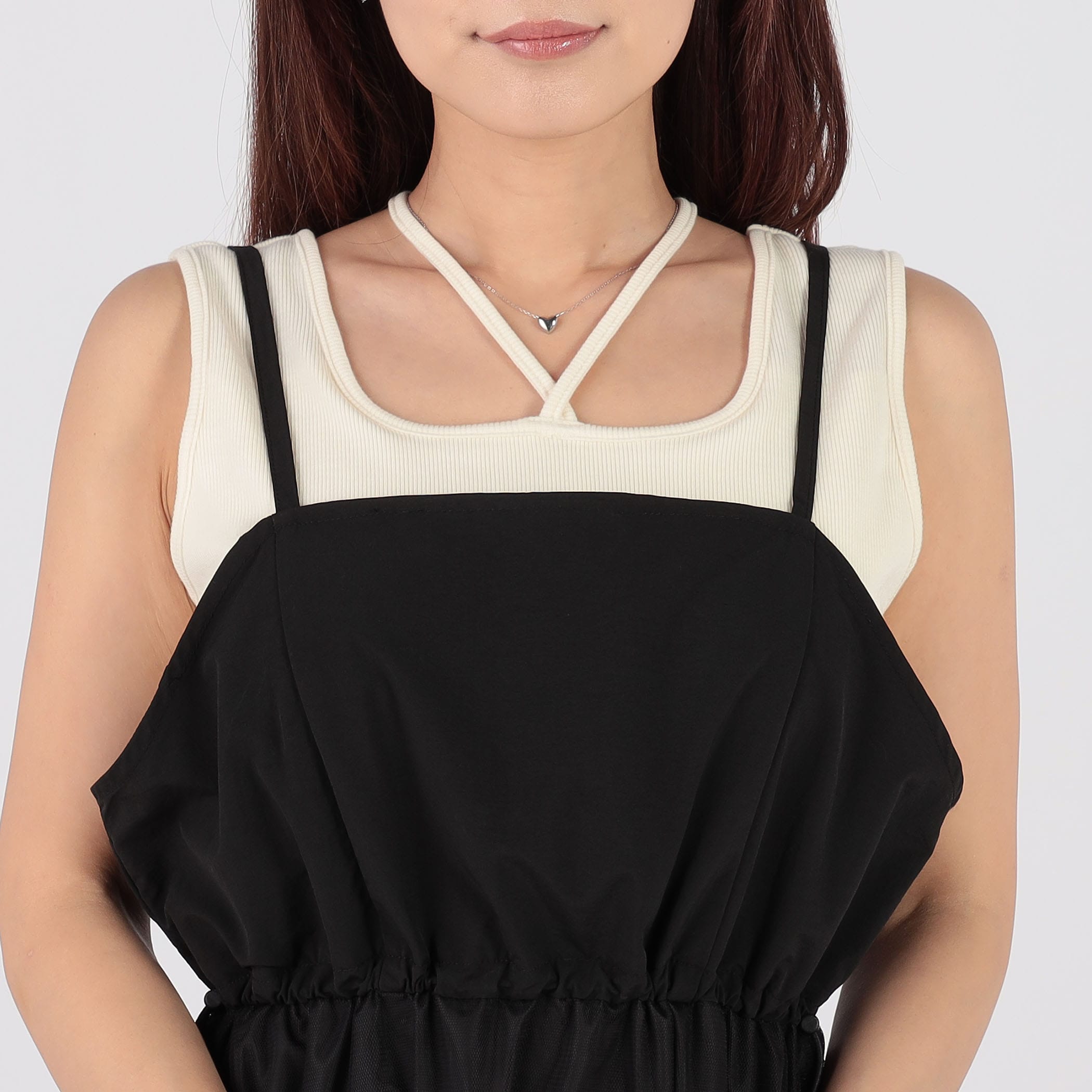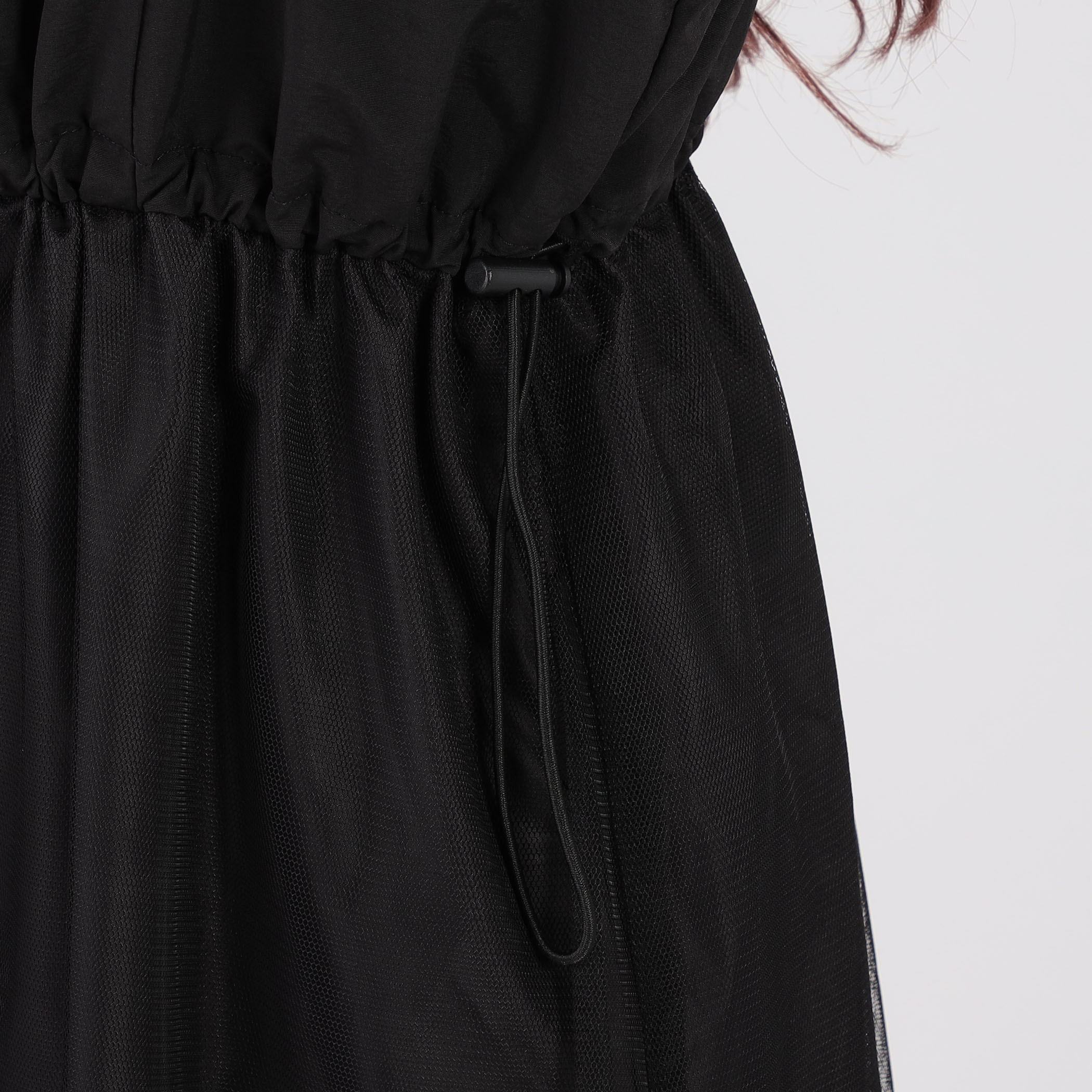 ナイロン素材のワークテイストなジャンパースカート。スカート部分にチュールを重ねたデザインでカジュアルになり過ぎず今年っぽさを演出。ウエスト部分のドロストで調節出来るのも嬉しいポイントです☆インナーに色々なインナーを合わせてその日の気分でコーディネートを楽しめる1着。
