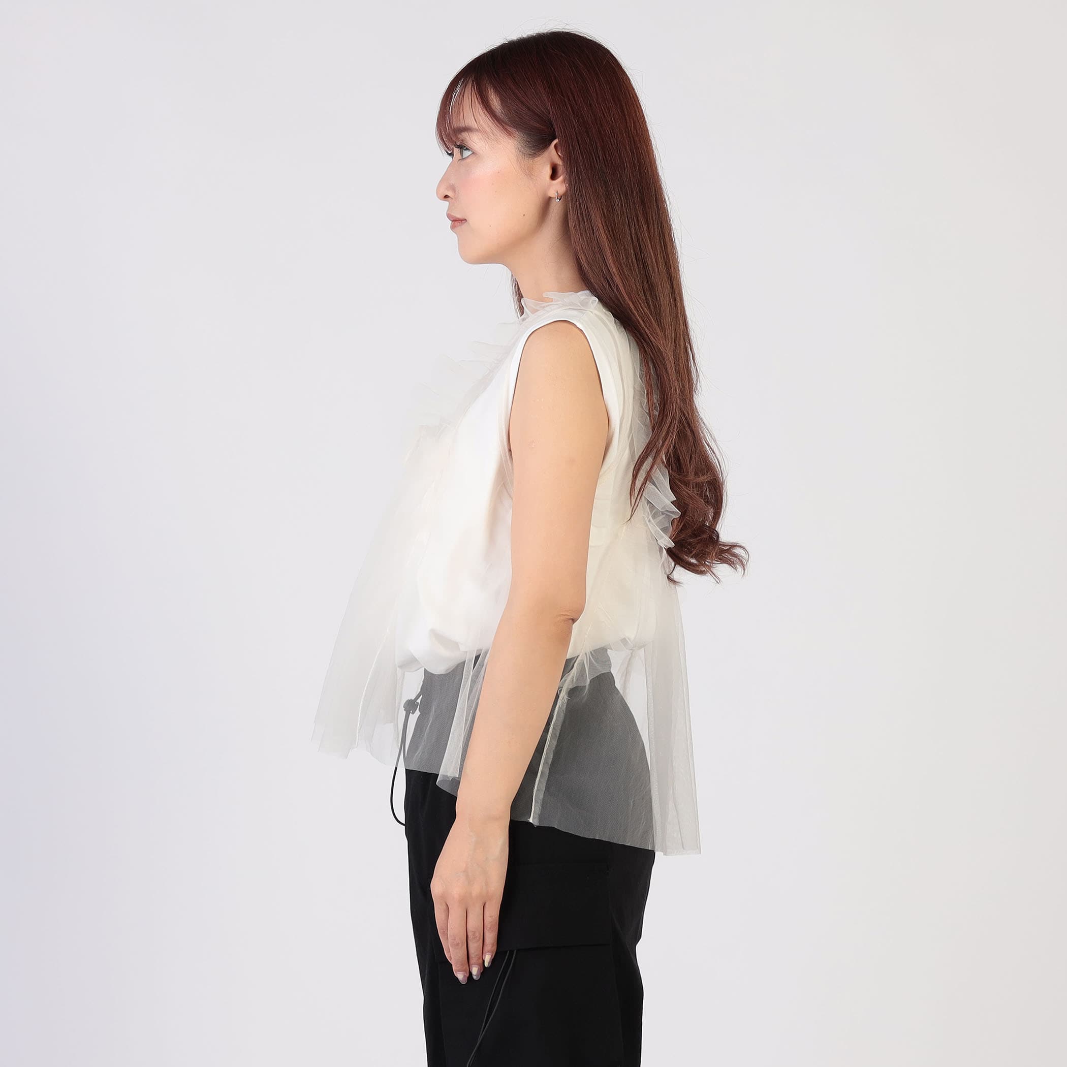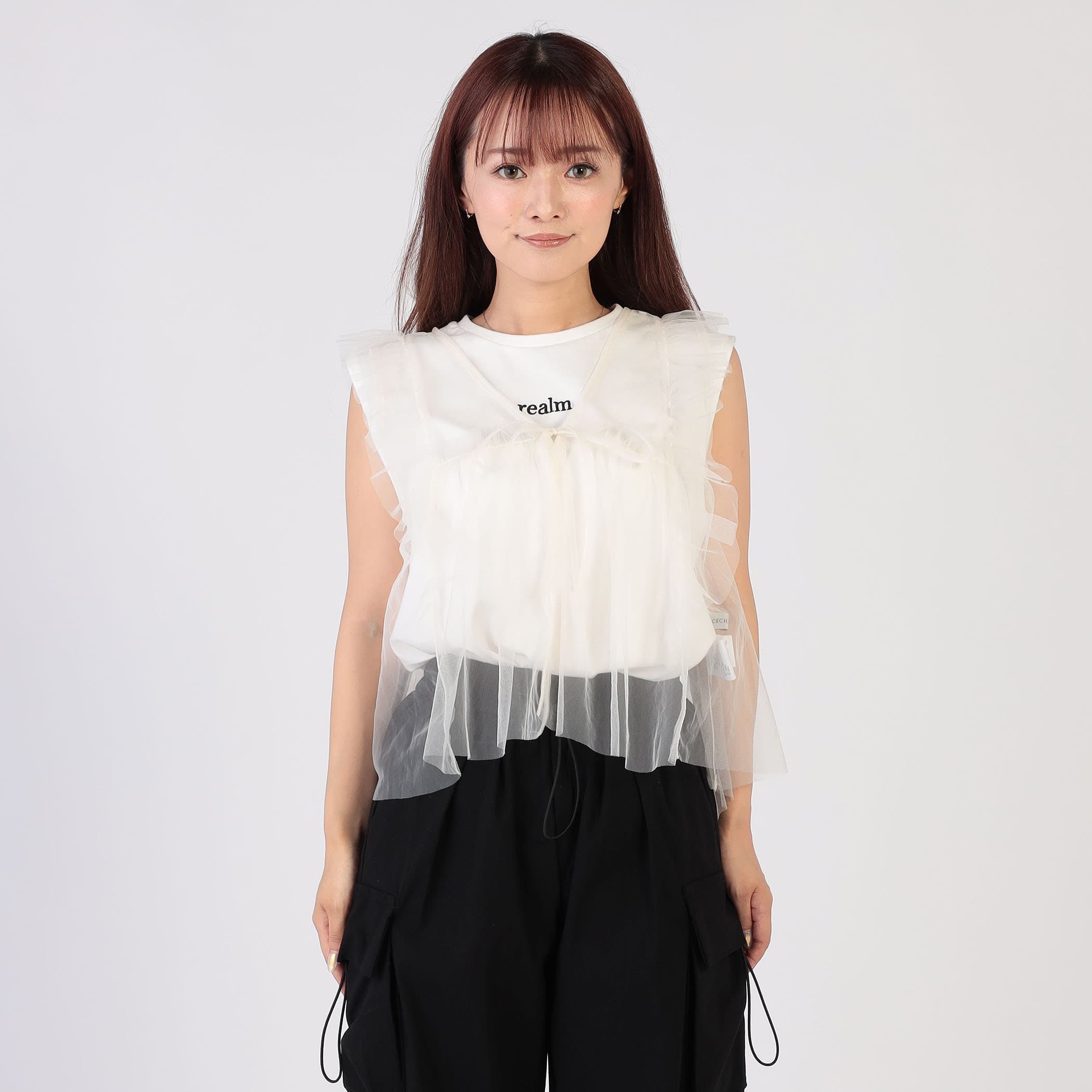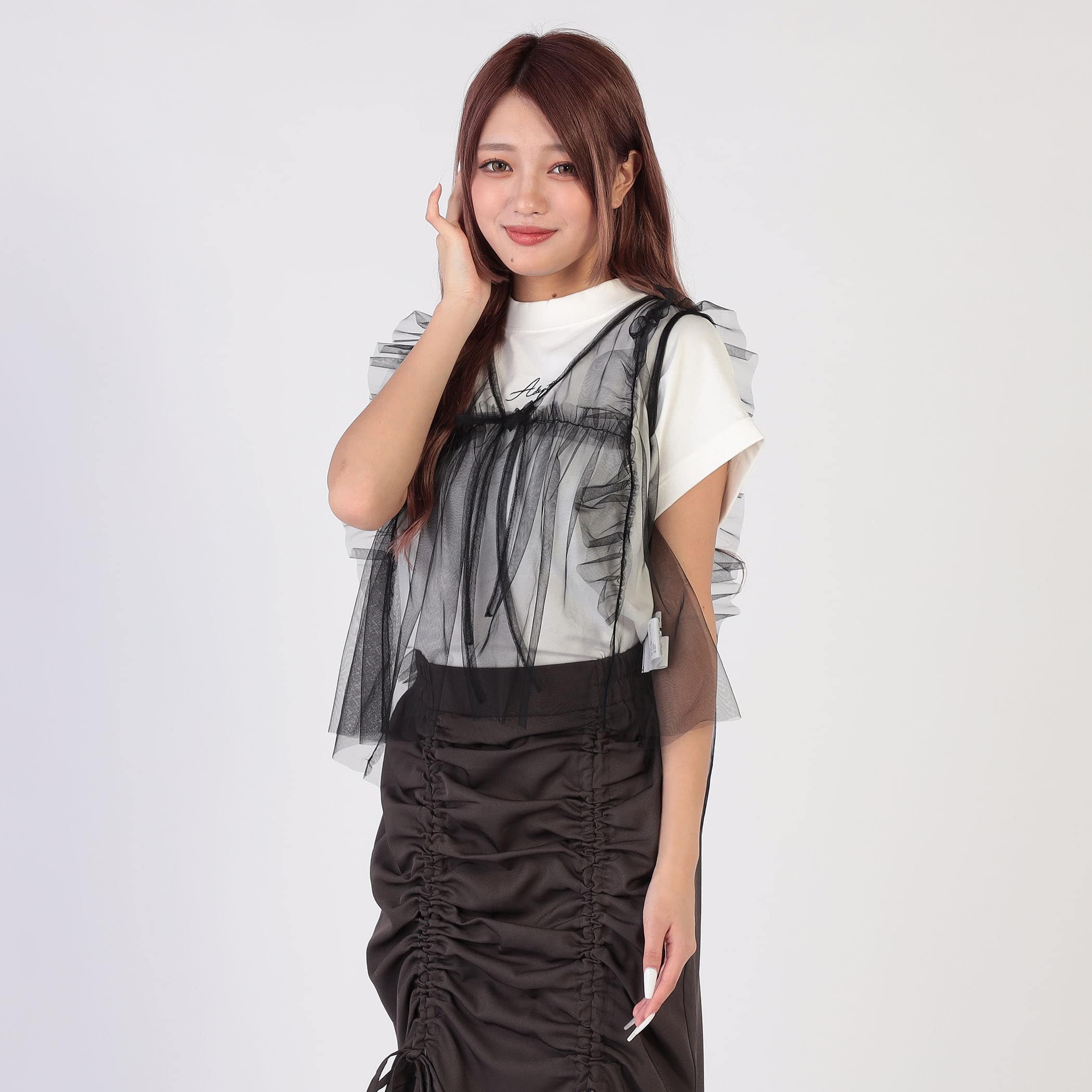 今期トレンドアイテムのチュールフリルベスト☆肩先から縦のラインについたフリルですっきりした印象に。インナーにプリントTを重ねて透け感を楽しんだり、スカートを合わせてキレイめコーデにしたり、様々なアイテムと相性抜群の1着です。