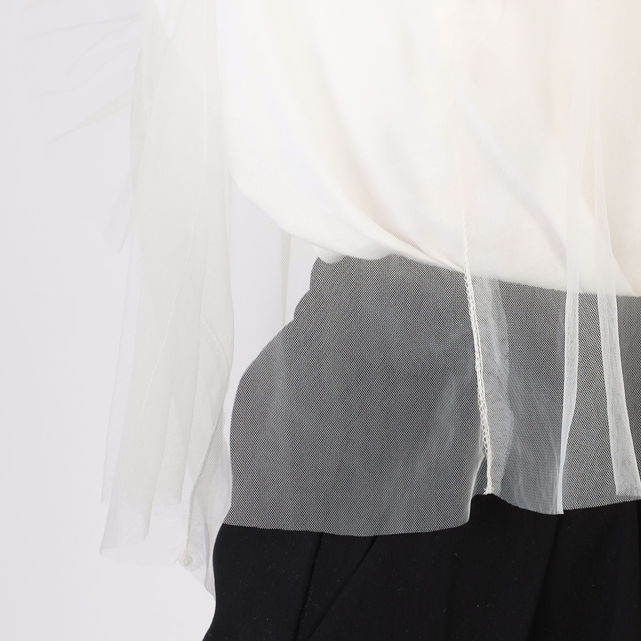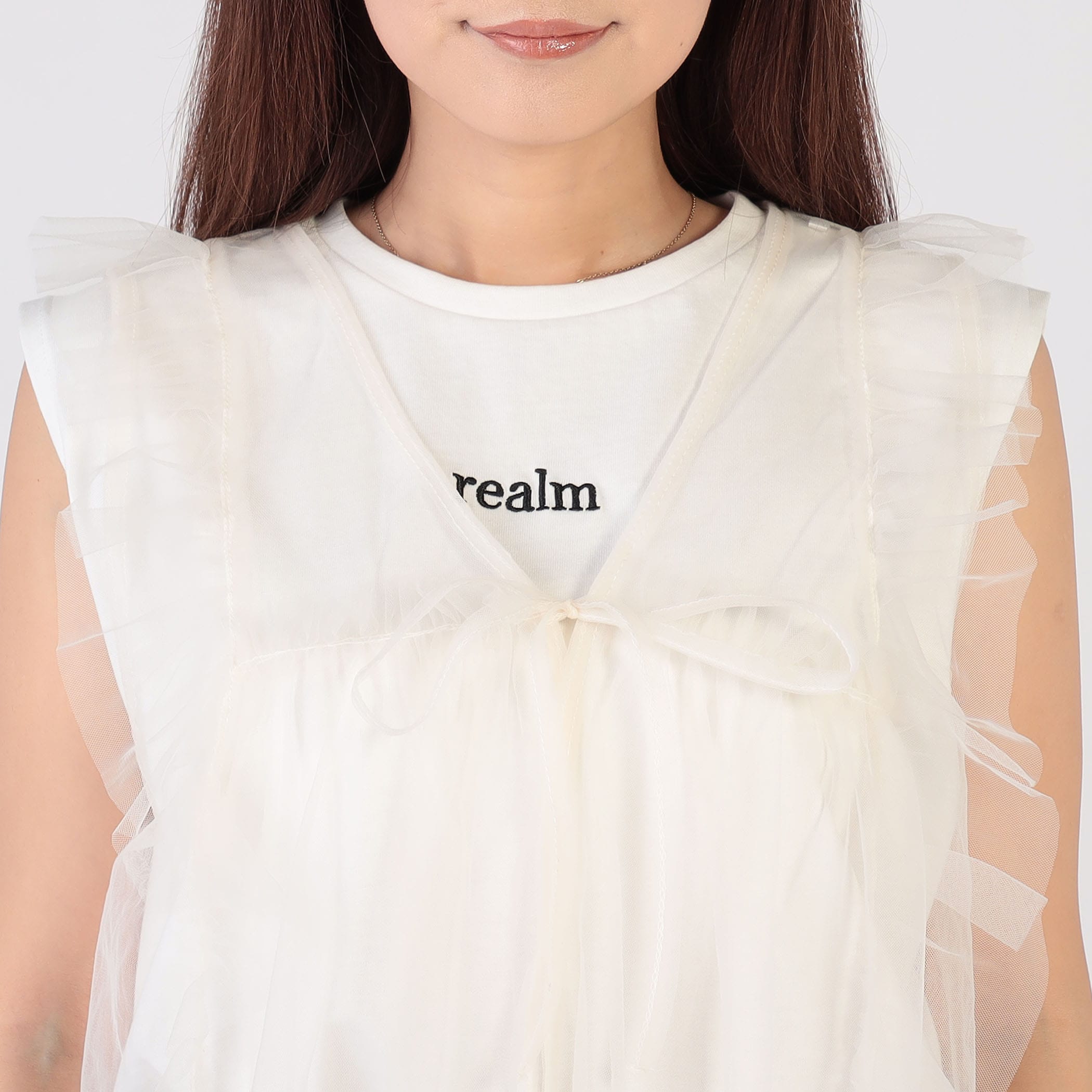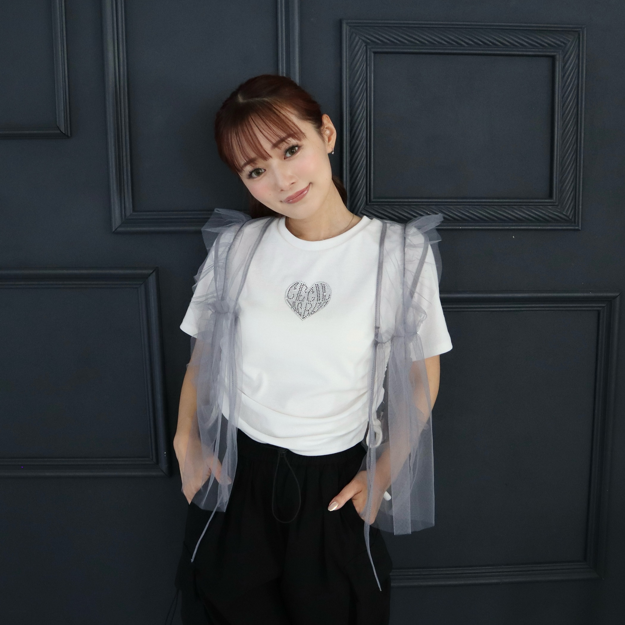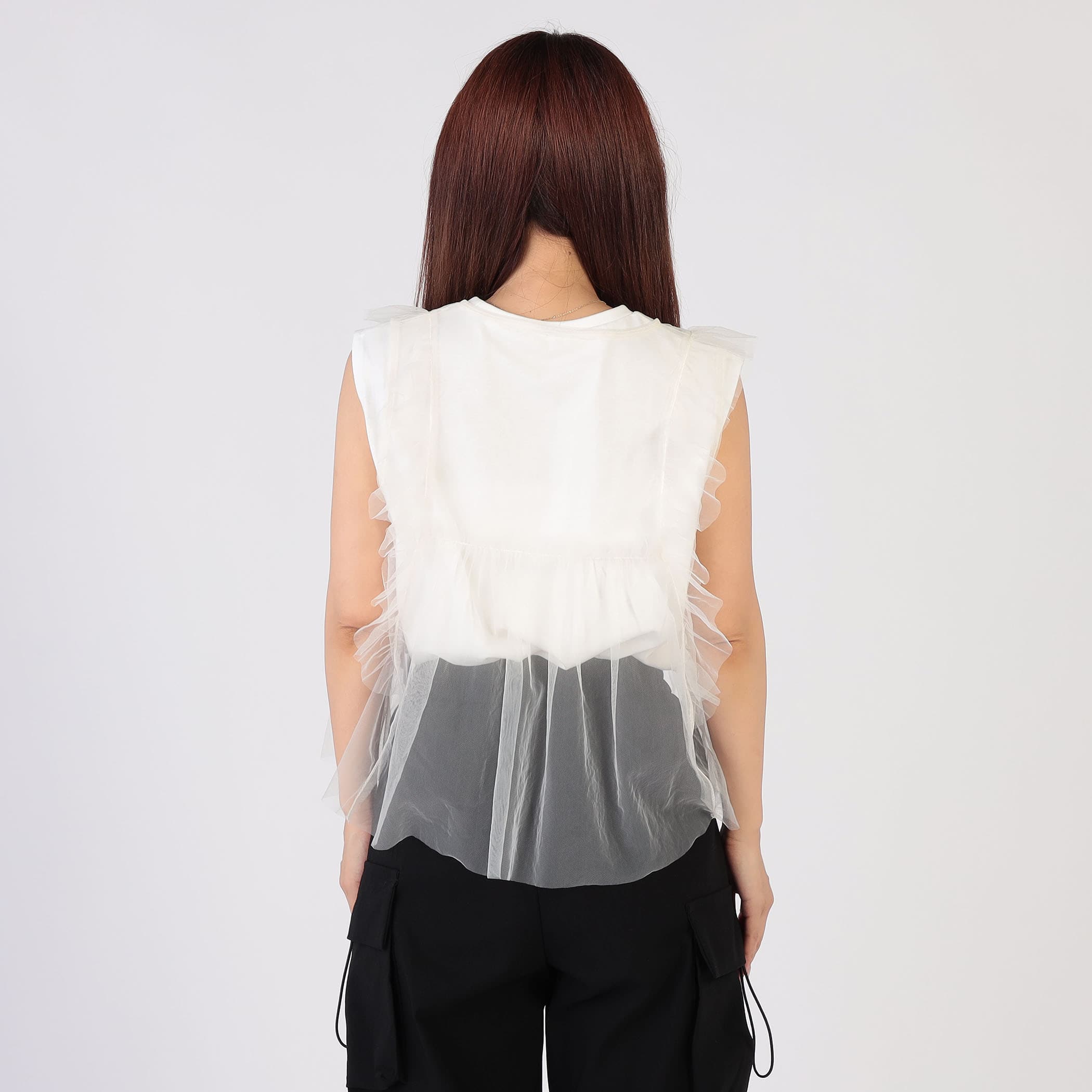 今期トレンドアイテムのチュールフリルベスト☆肩先から縦のラインについたフリルですっきりした印象に。インナーにプリントTを重ねて透け感を楽しんだり、スカートを合わせてキレイめコーデにしたり、様々なアイテムと相性抜群の1着です。
