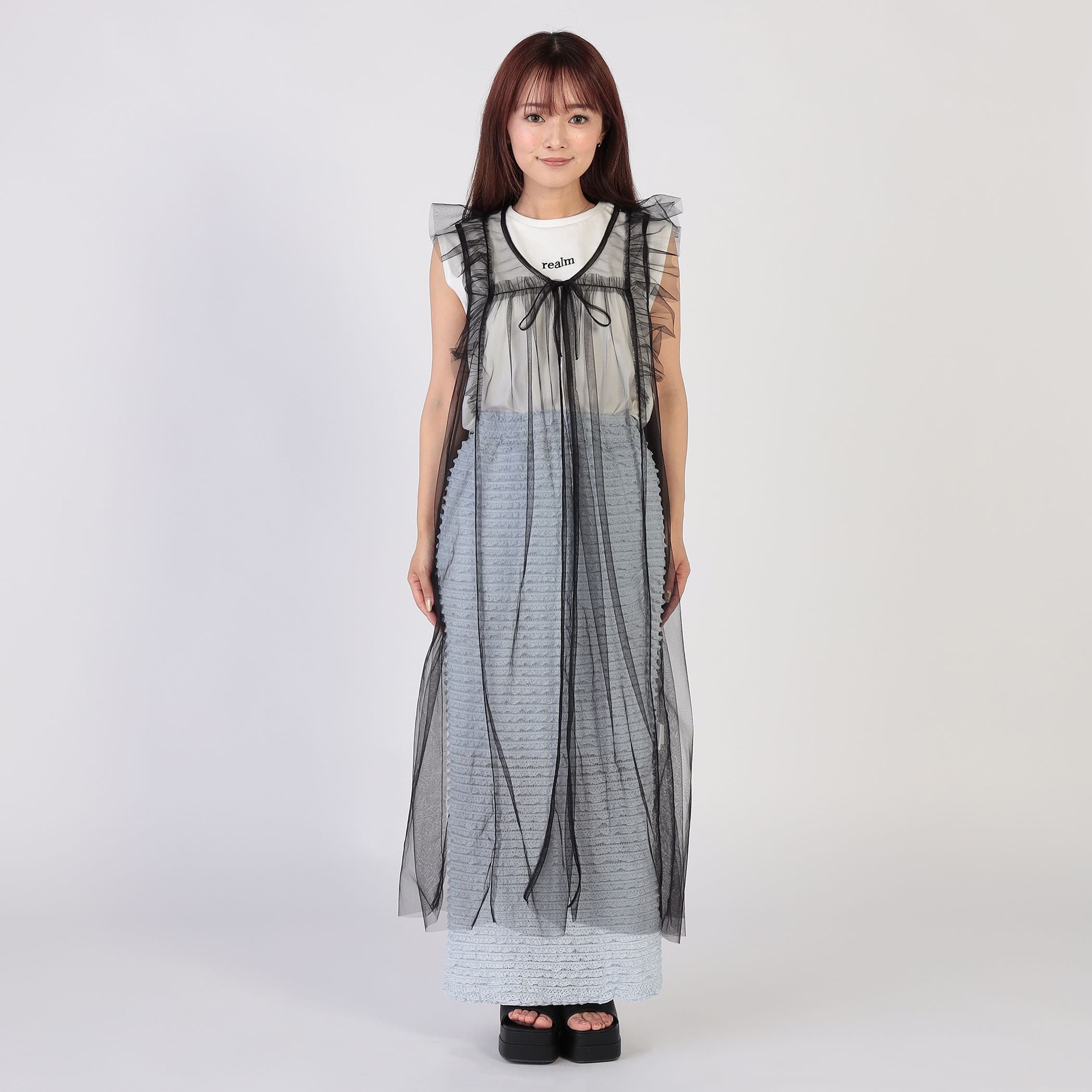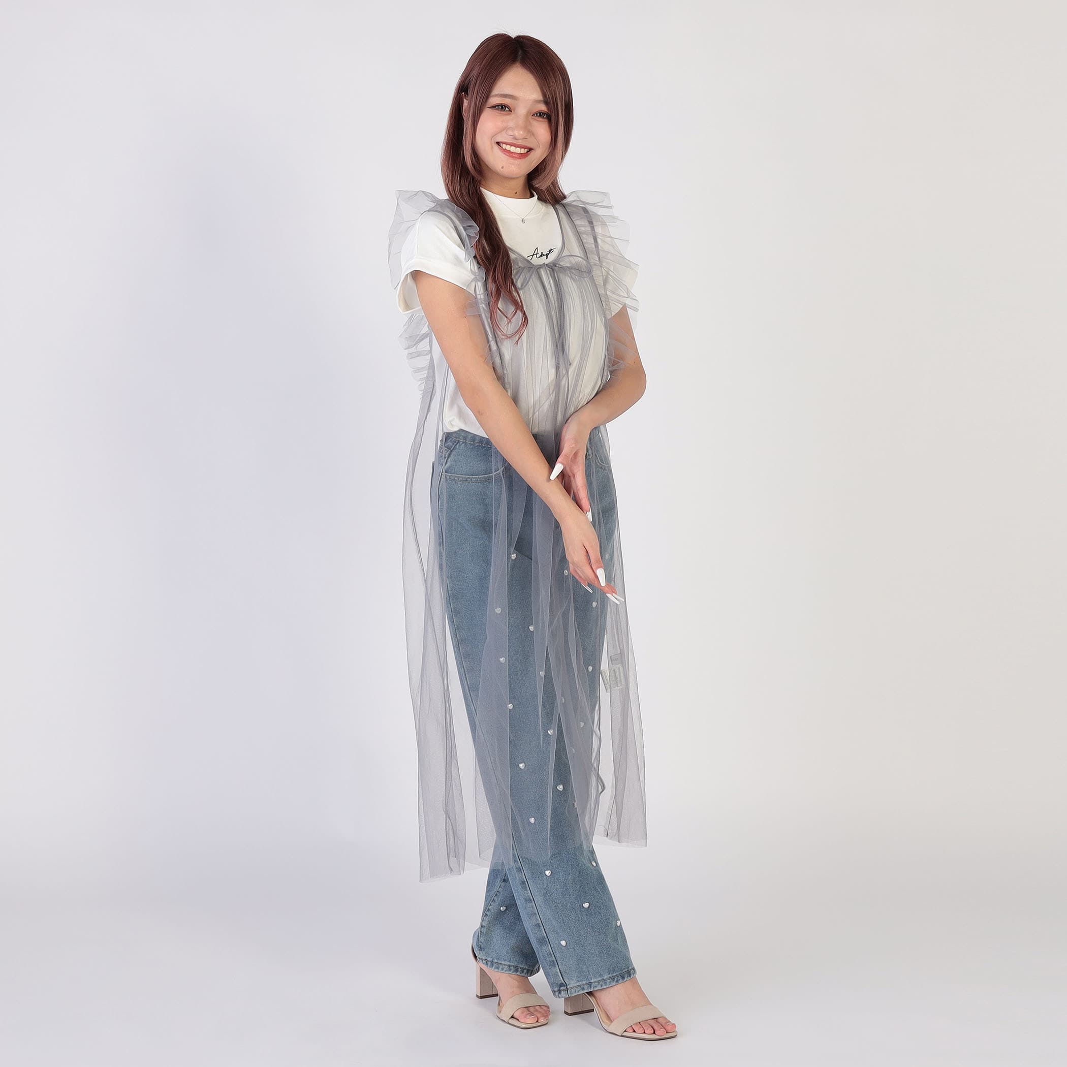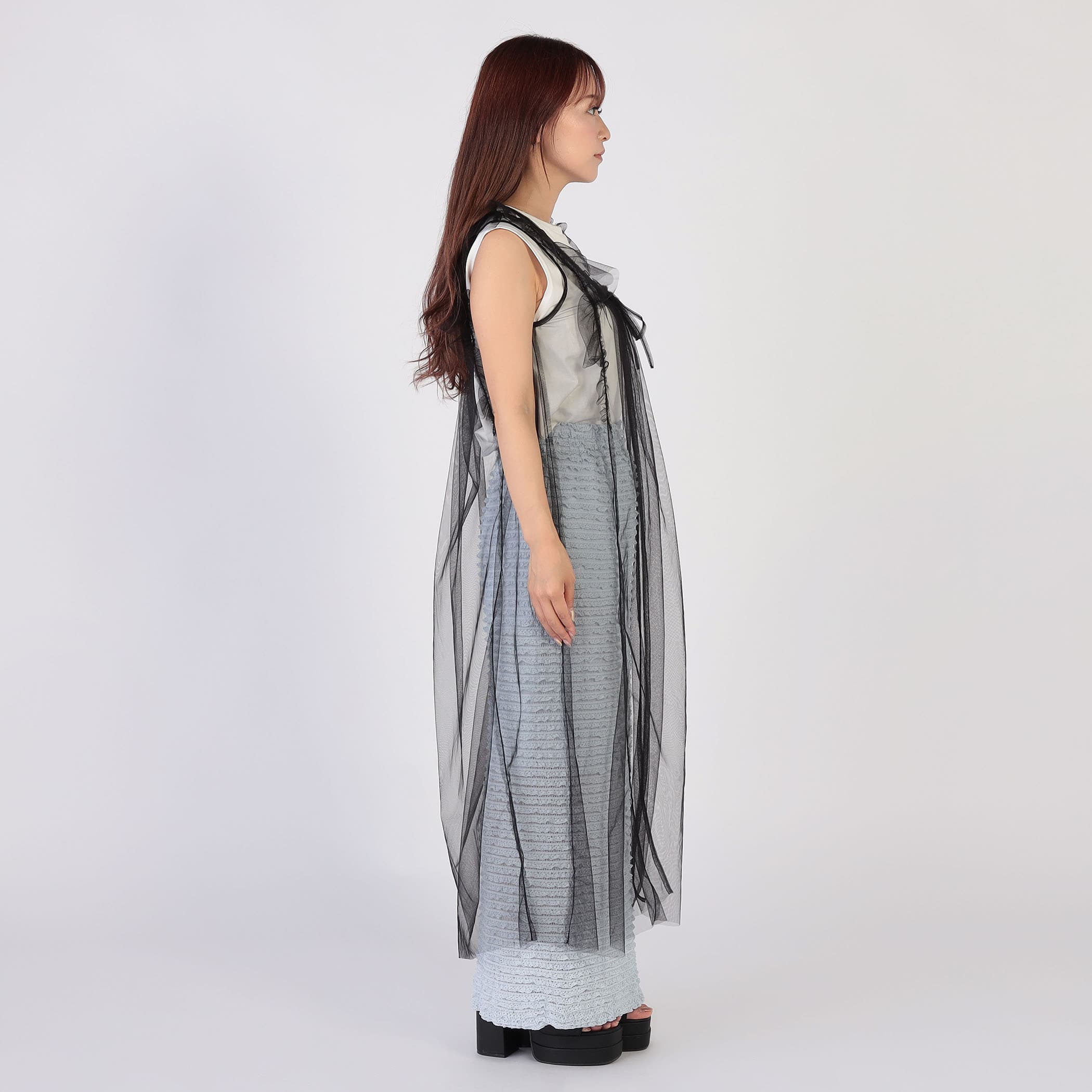 透け感で一気にトレンドコーデになるチュールロングジレ。前明き部分のリボンを開けて着用しても◎スポーティアイテムやデニム等のパンツを合わせるMIXコーデが甘くなり過ぎずお勧めです。