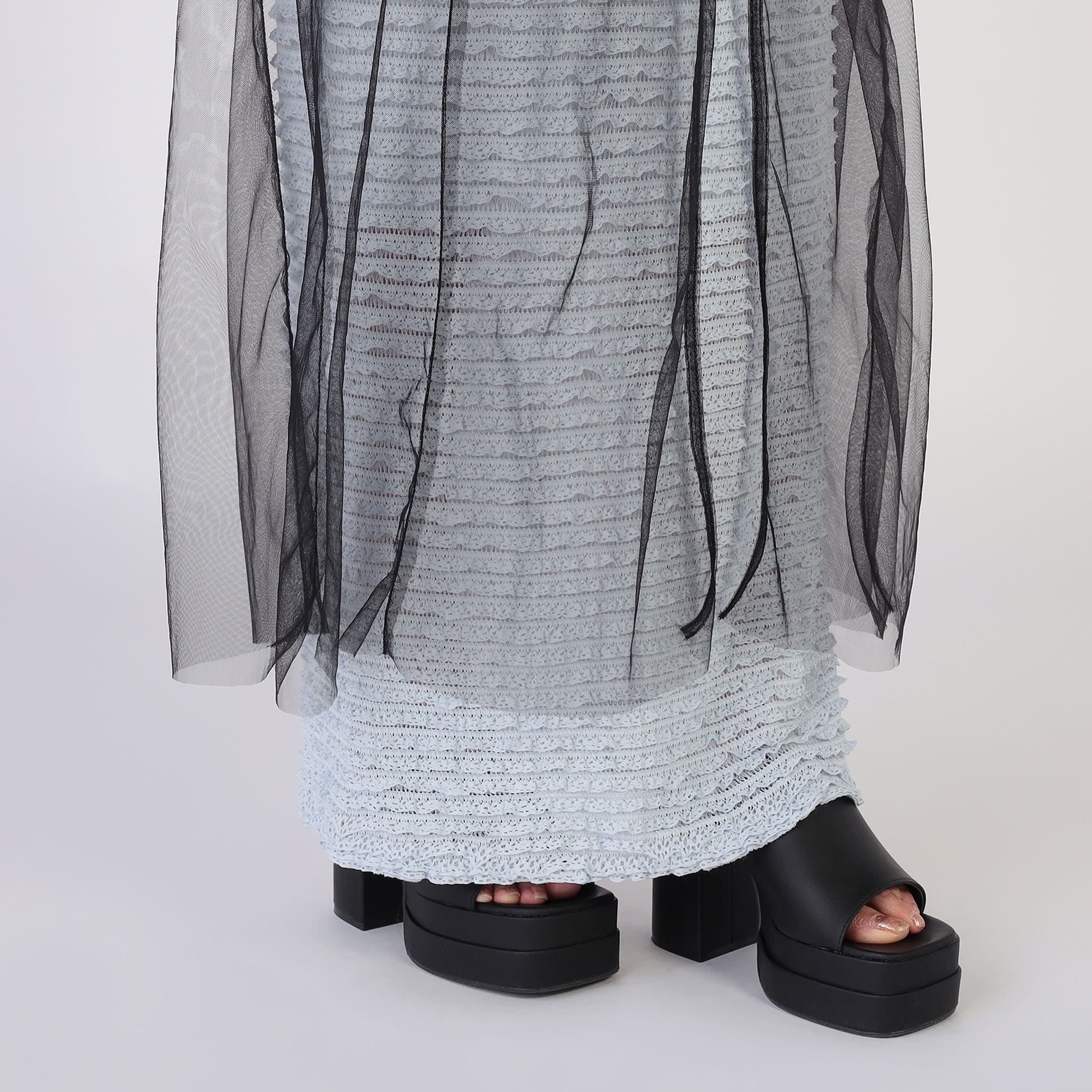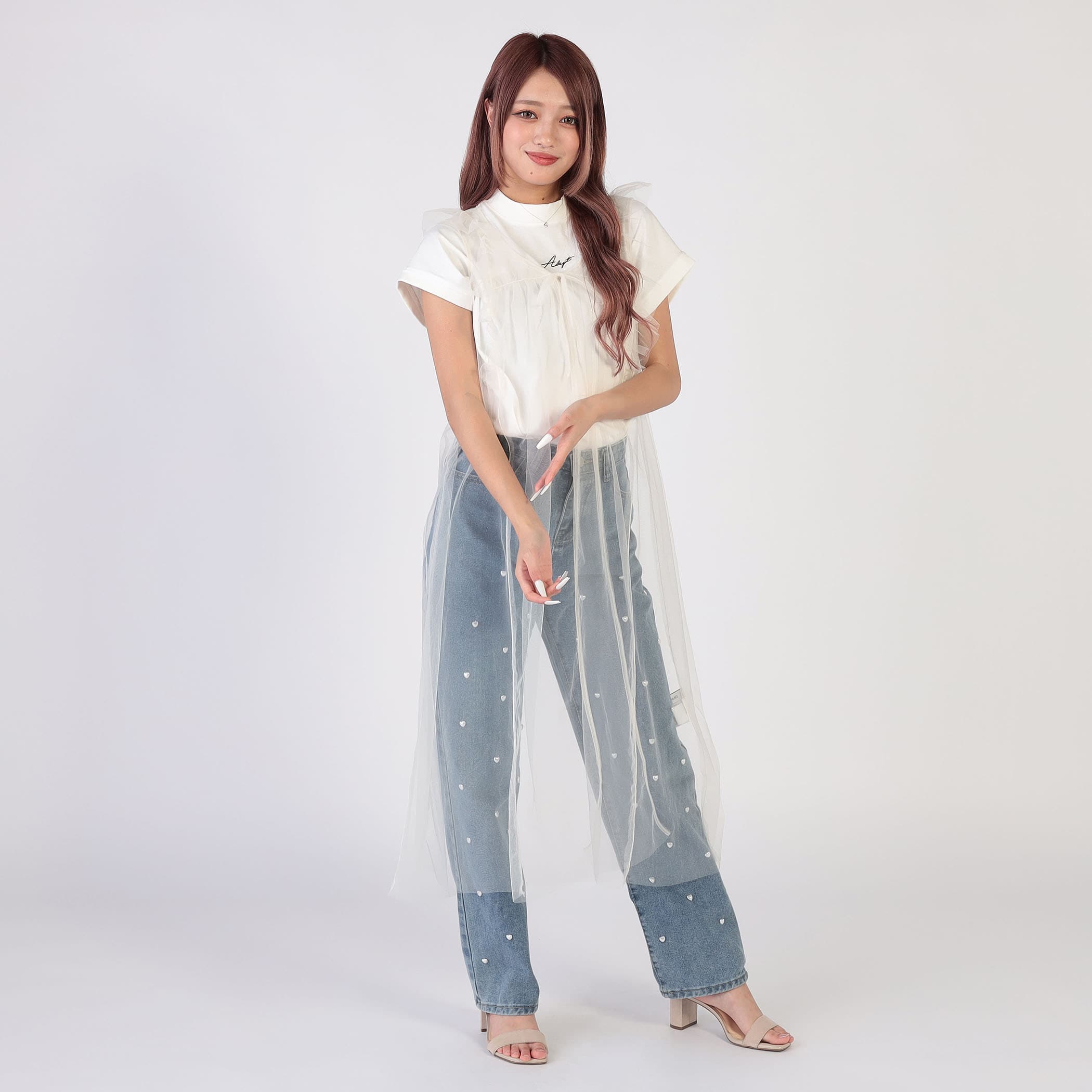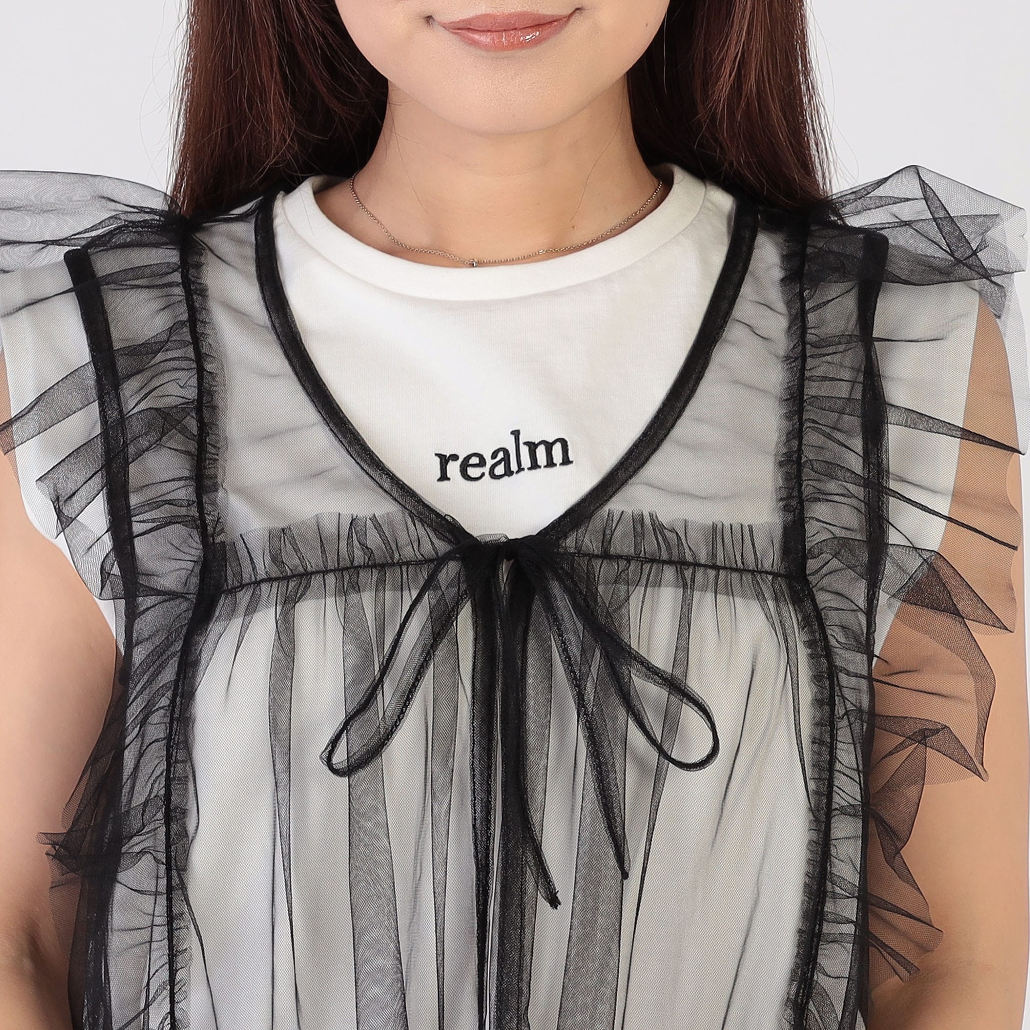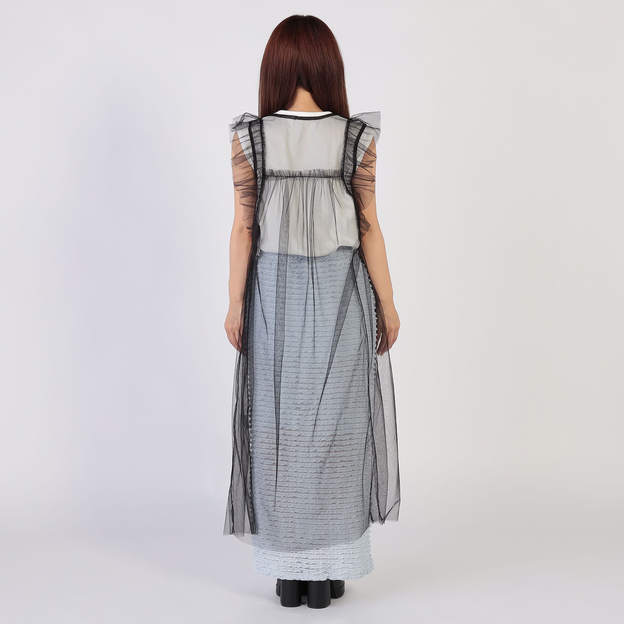 透け感で一気にトレンドコーデになるチュールロングジレ。前明き部分のリボンを開けて着用しても◎スポーティアイテムやデニム等のパンツを合わせるMIXコーデが甘くなり過ぎずお勧めです。