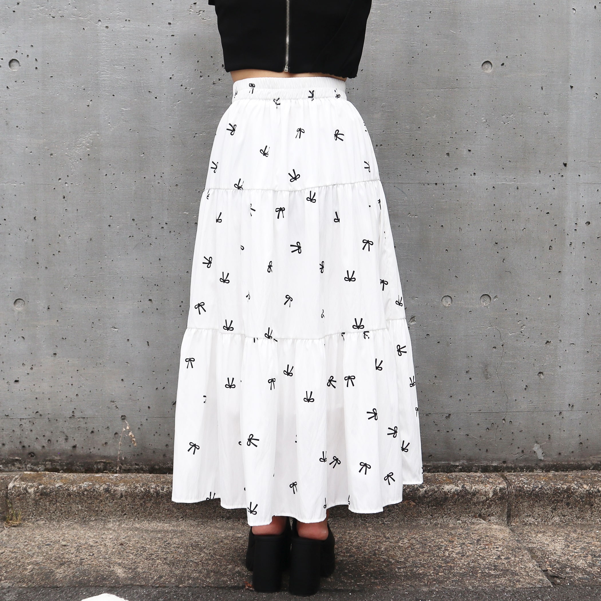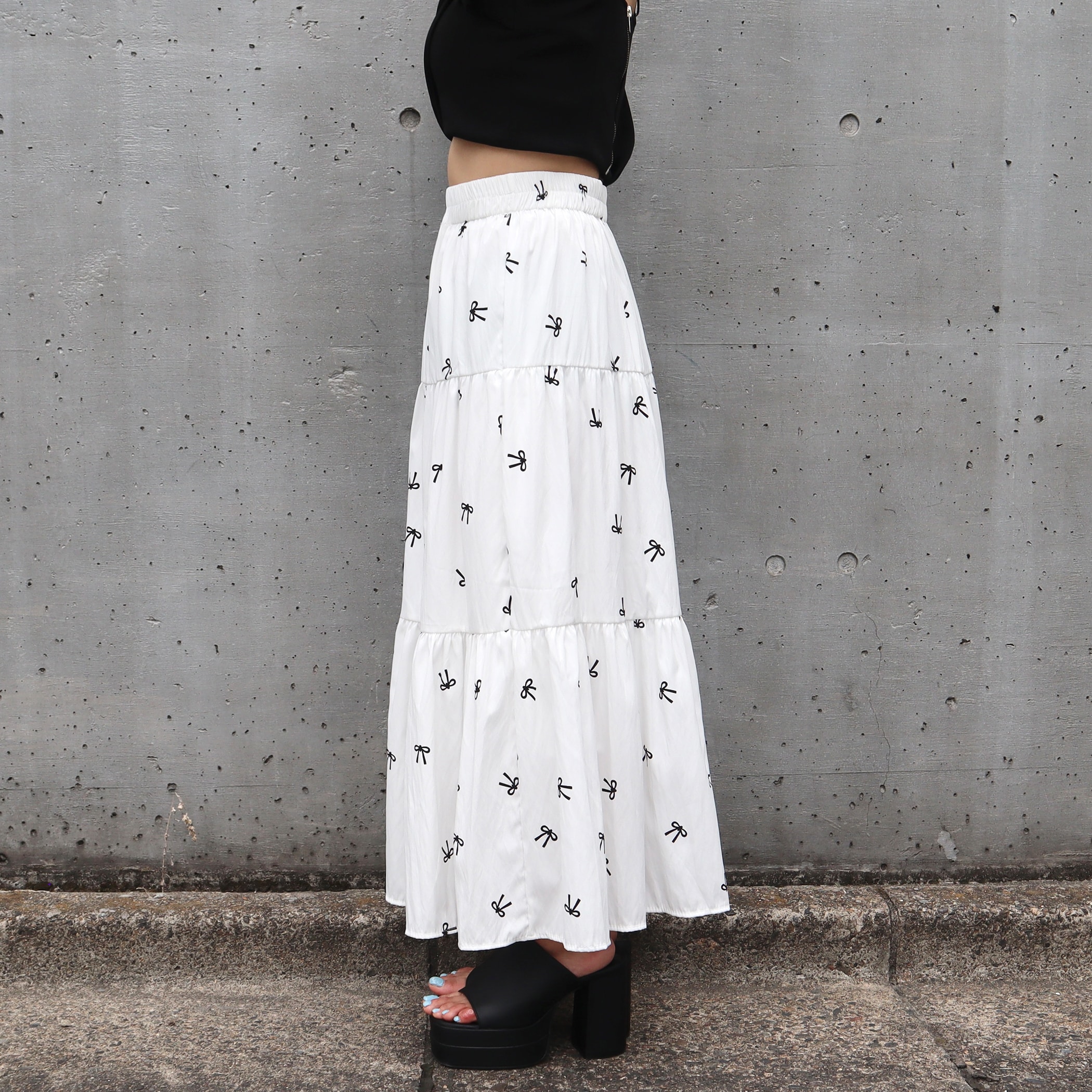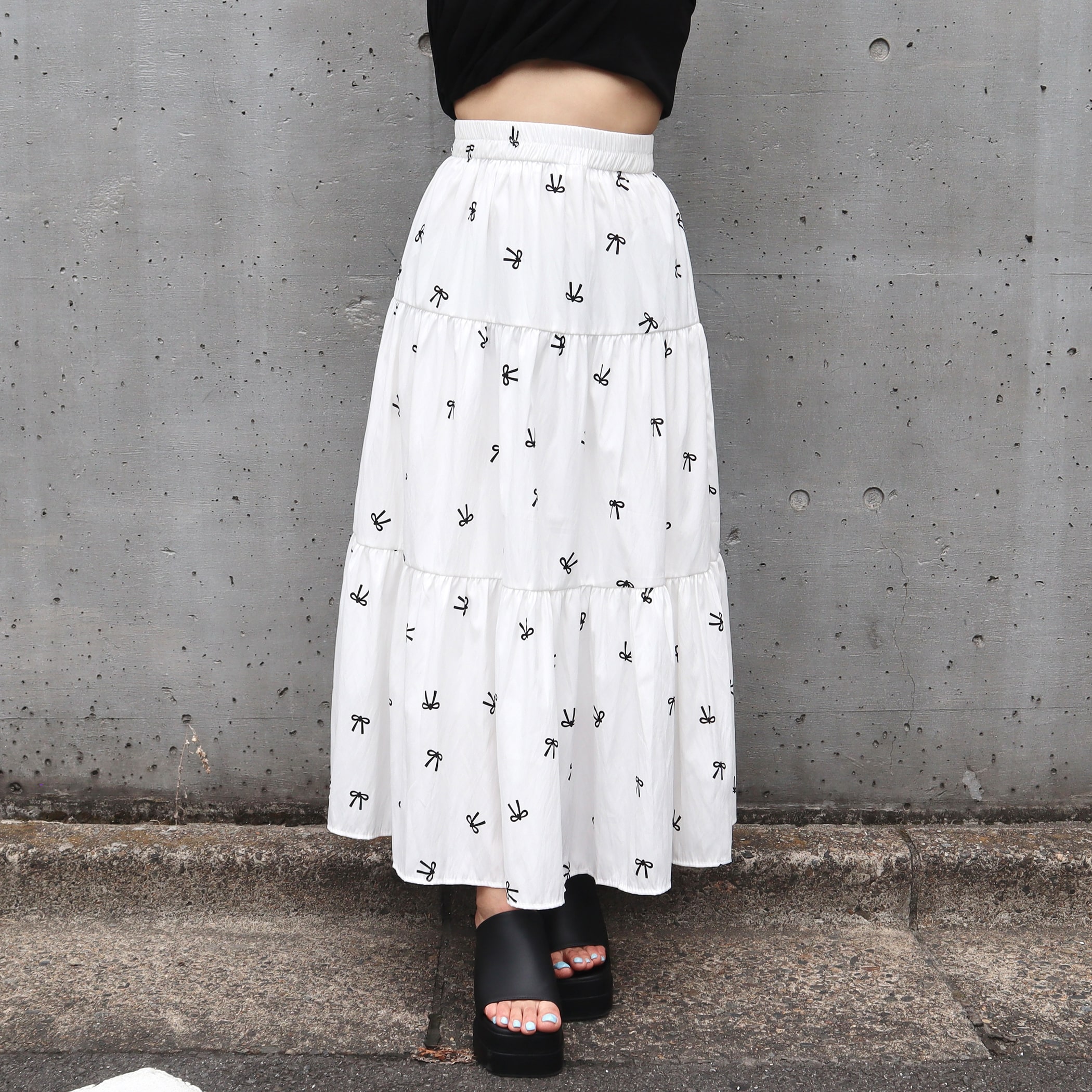 リボン柄が大人可愛いロングスカート。ふんわりとした素材感が女性らしいロング丈のティアードスカート。ティアードデザインながら適度なボリュームにまとめたので、すっきりと着ていただけるのが魅力です。Tシャツやタイトなカットソー、スウェットやニットなど、合わせるアイテムによって3シーズン着まわせるおすすめスカートです。