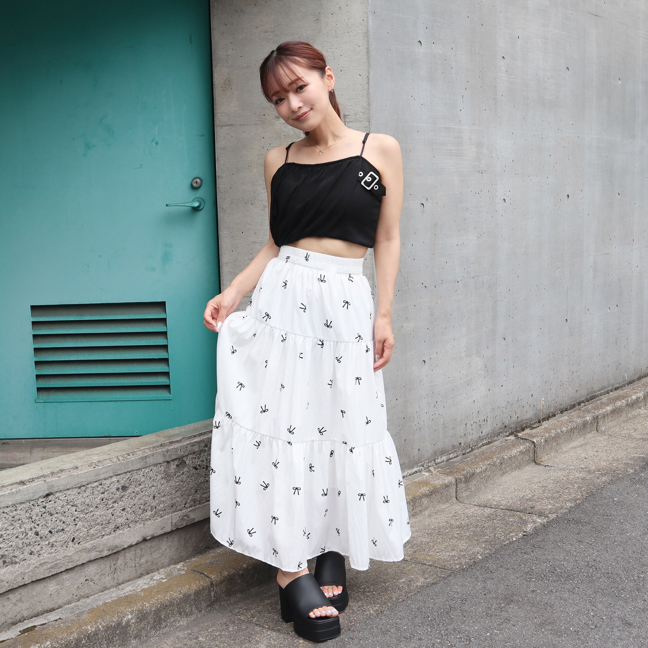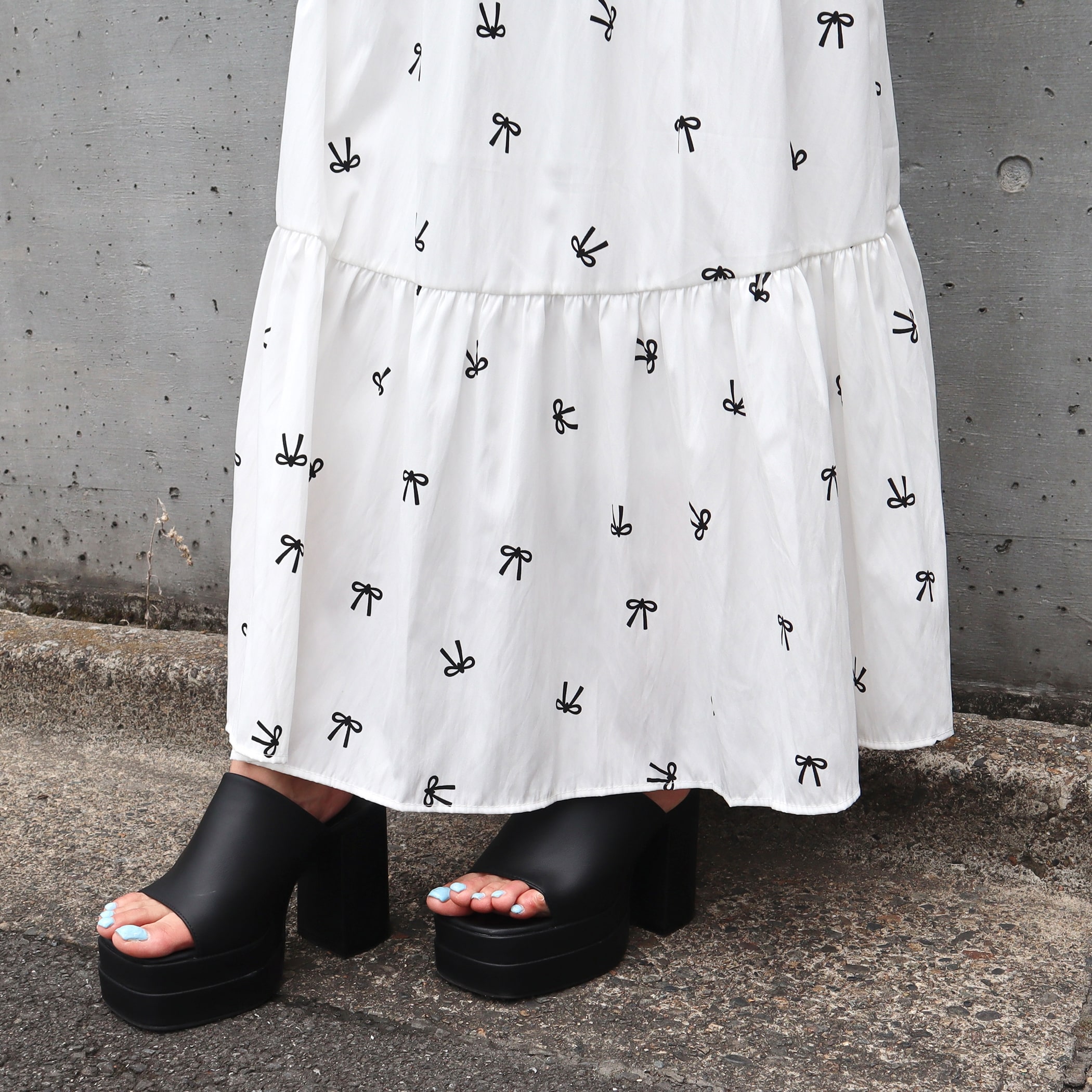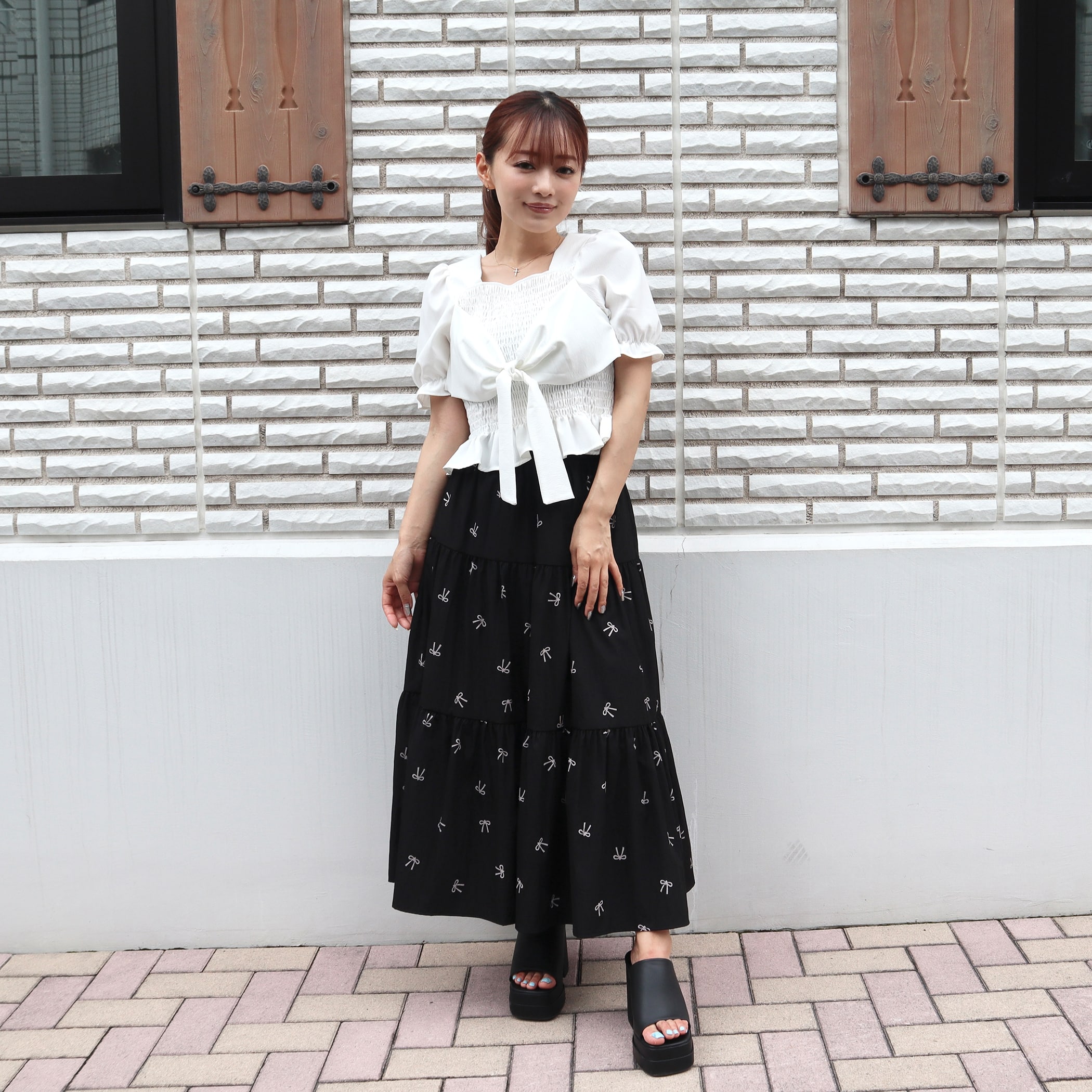 リボン柄が大人可愛いロングスカート。ふんわりとした素材感が女性らしいロング丈のティアードスカート。ティアードデザインながら適度なボリュームにまとめたので、すっきりと着ていただけるのが魅力です。Tシャツやタイトなカットソー、スウェットやニットなど、合わせるアイテムによって3シーズン着まわせるおすすめスカートです。