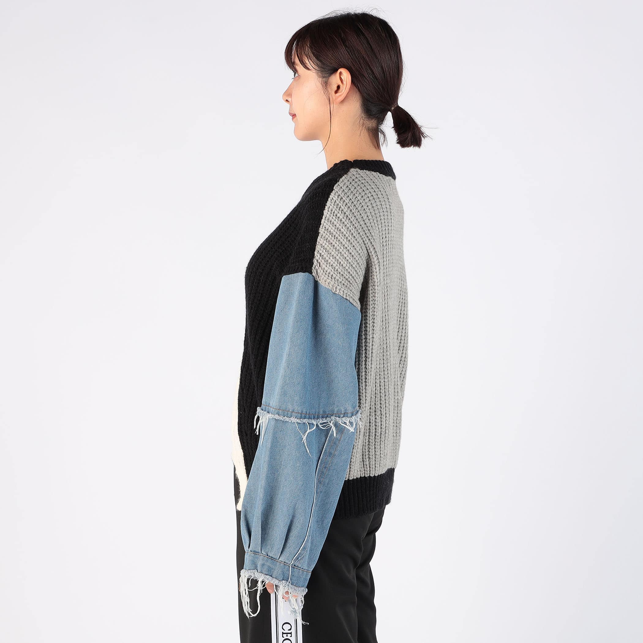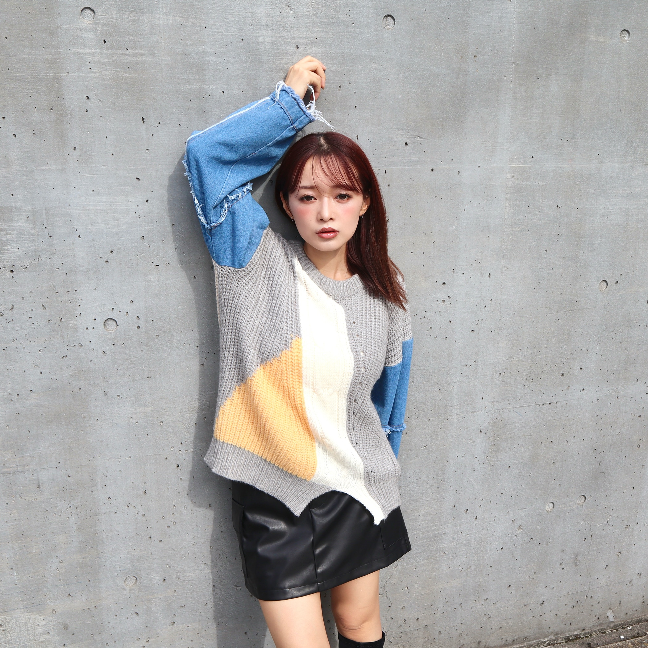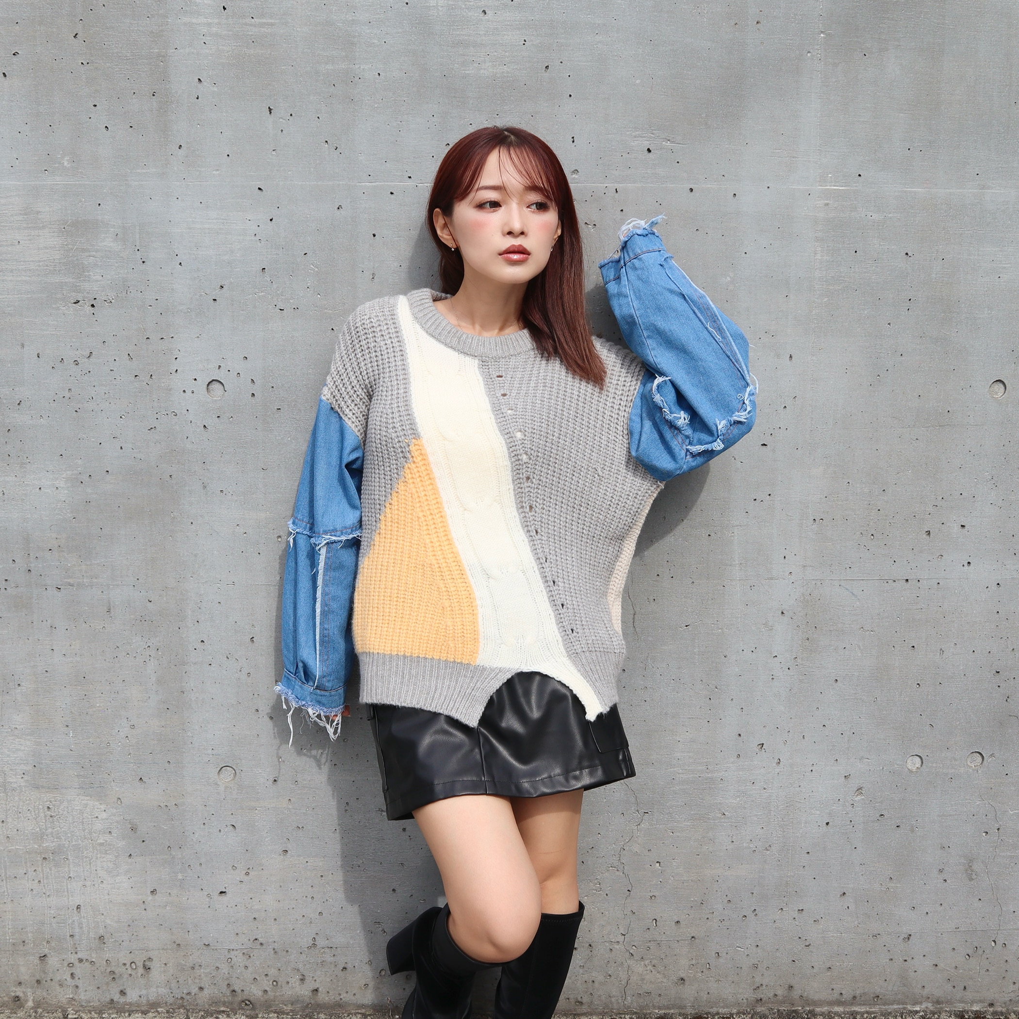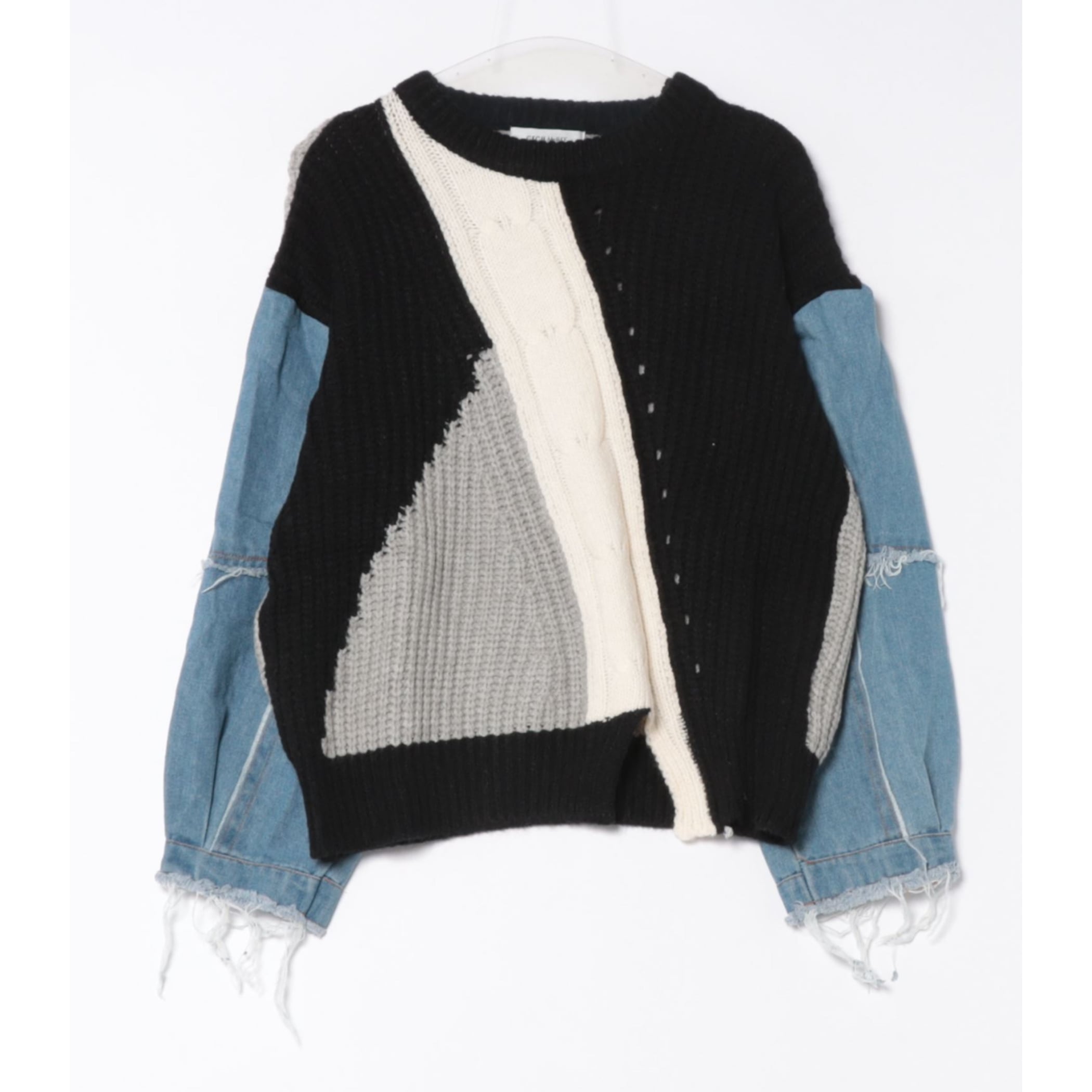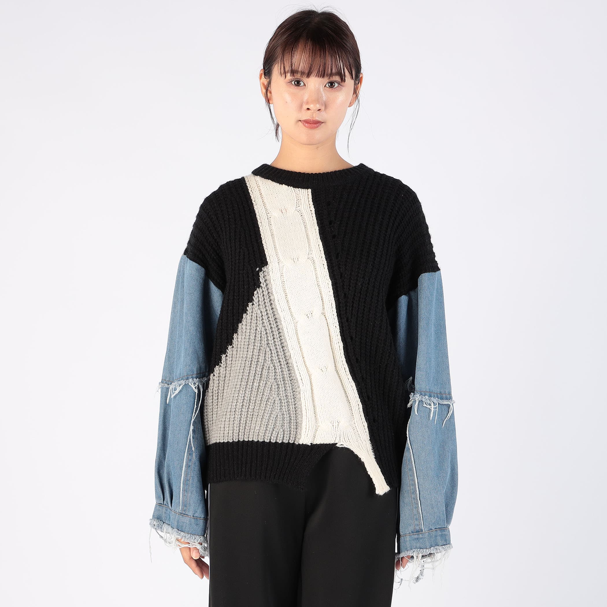 ニットとデニム素材の切替が特徴的なプルオーバー。編地に変化をつけ、パッチワークのようなデザインに。デニム袖の生地が切りっぱなしもポイント。個性的なデザインは人と被らず、印象に残る1枚です◎程よくゆとりのあるサイズ感で、パンツはもちろんスカート合わせでもバランスよく着こなせます!