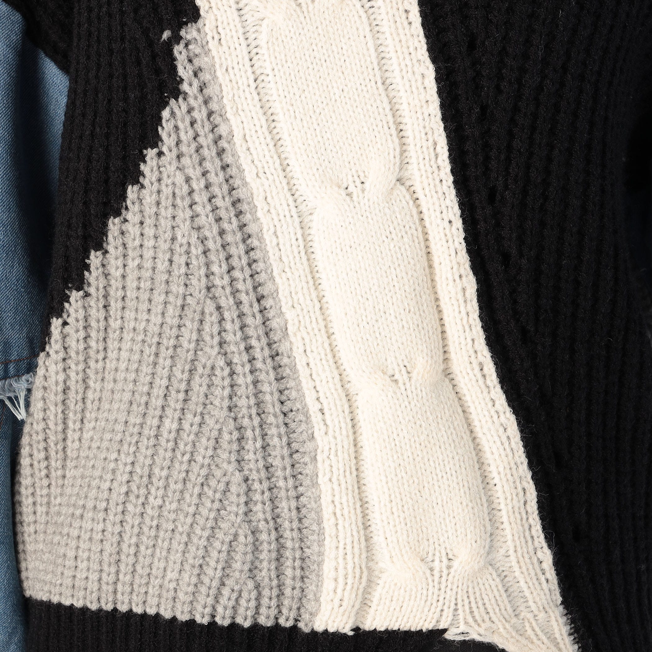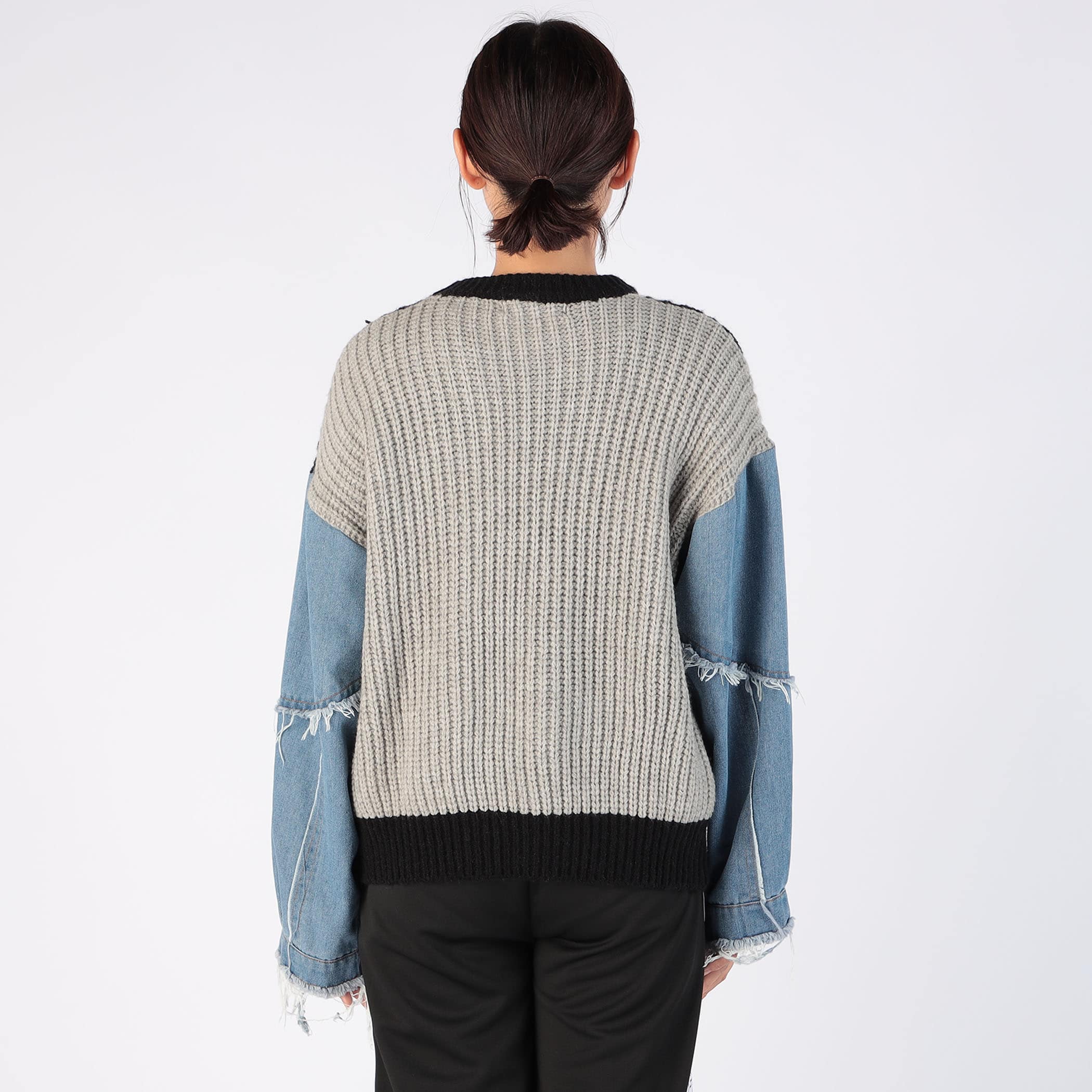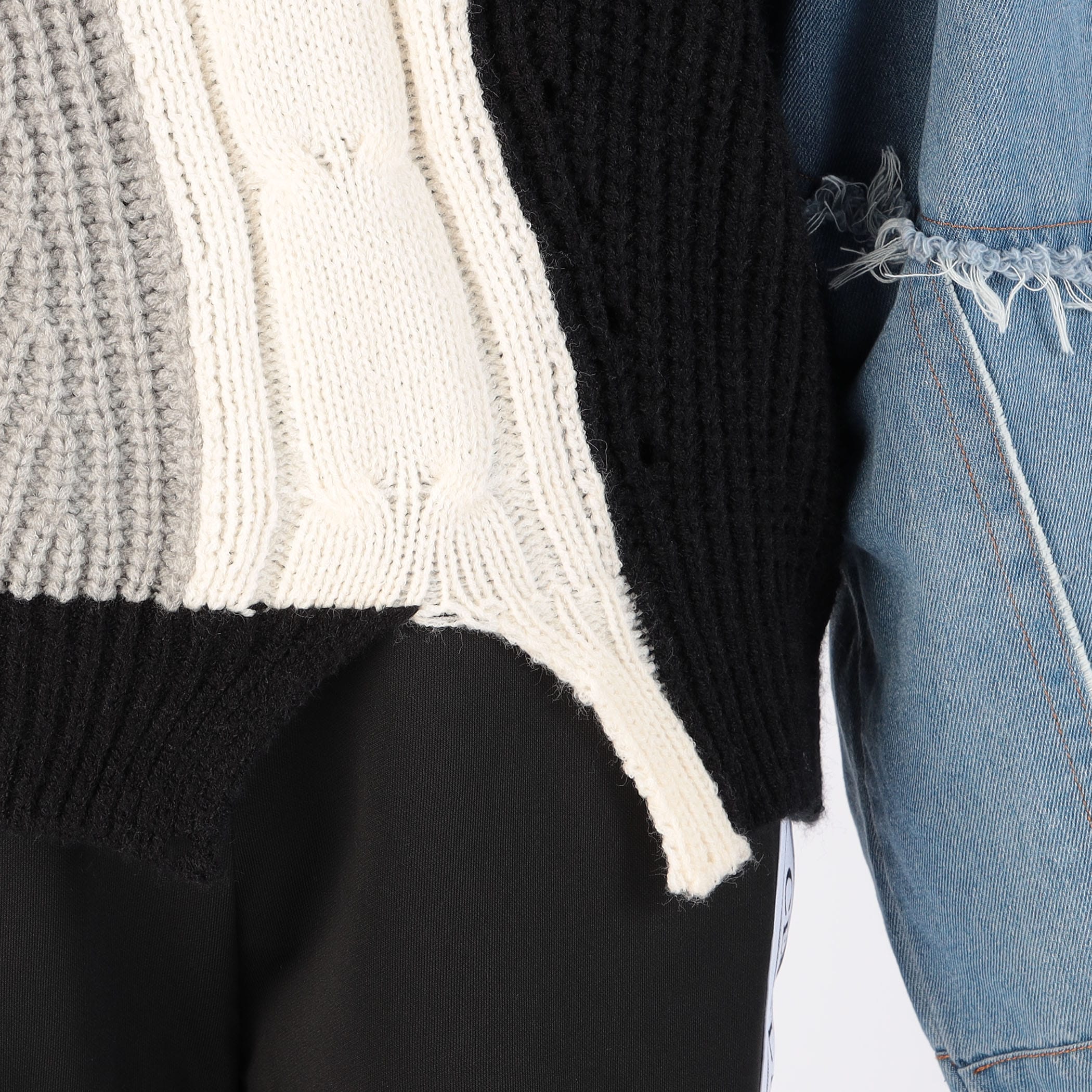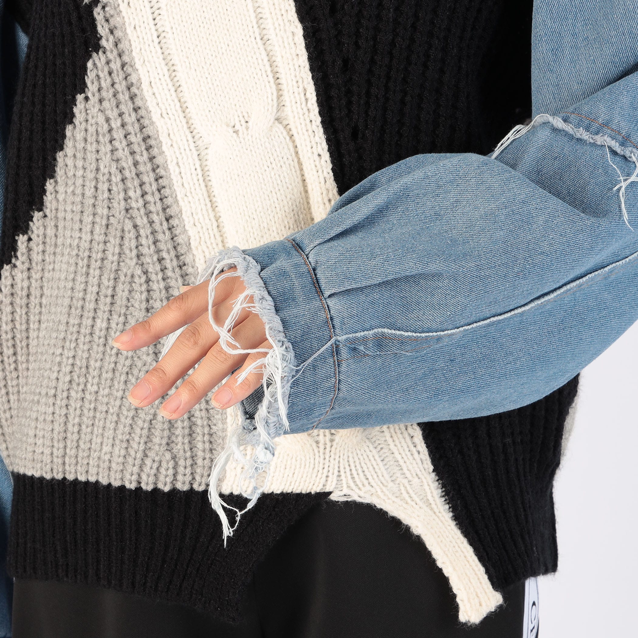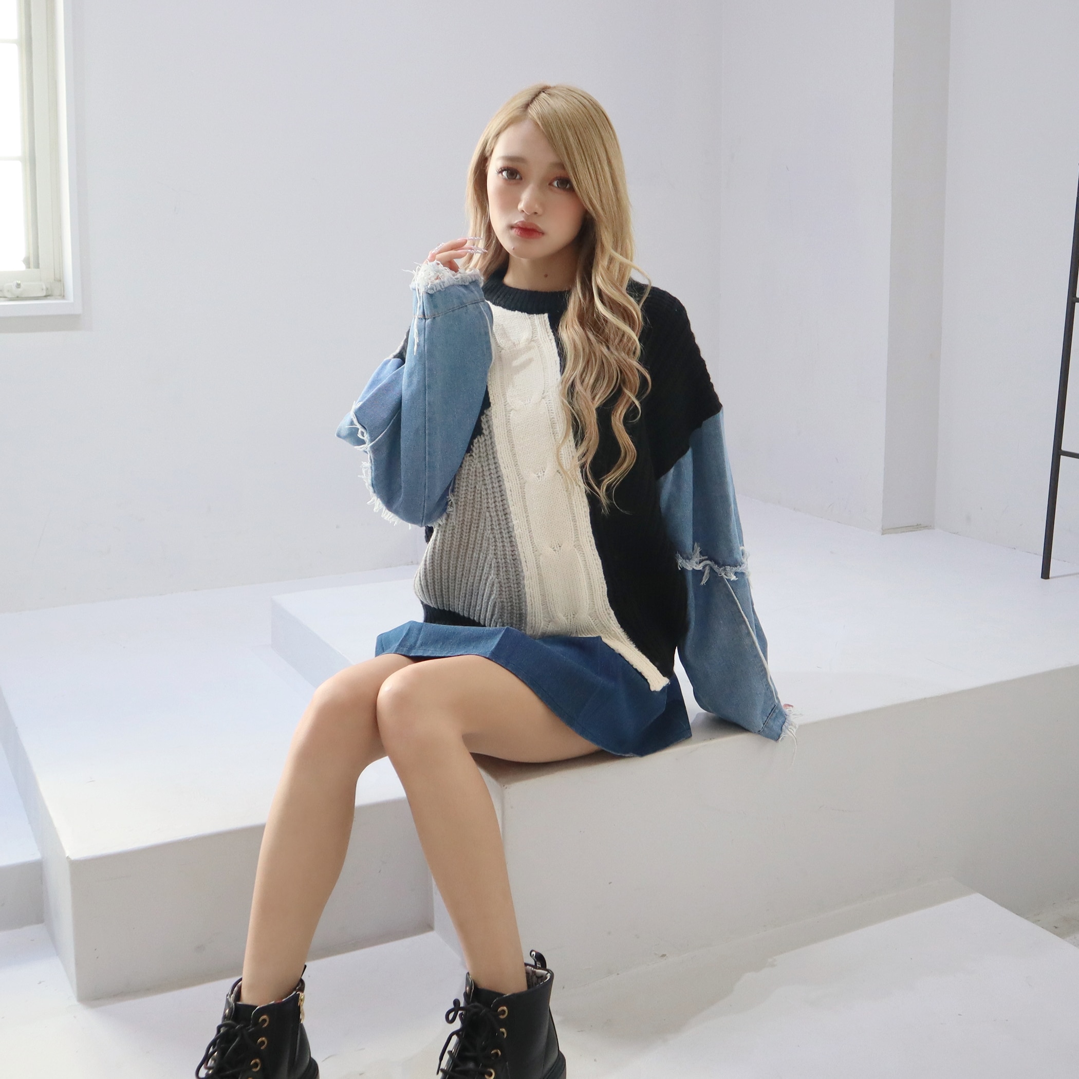 ニットとデニム素材の切替が特徴的なプルオーバー。編地に変化をつけ、パッチワークのようなデザインに。デニム袖の生地が切りっぱなしもポイント。個性的なデザインは人と被らず、印象に残る1枚です◎程よくゆとりのあるサイズ感で、パンツはもちろんスカート合わせでもバランスよく着こなせます!